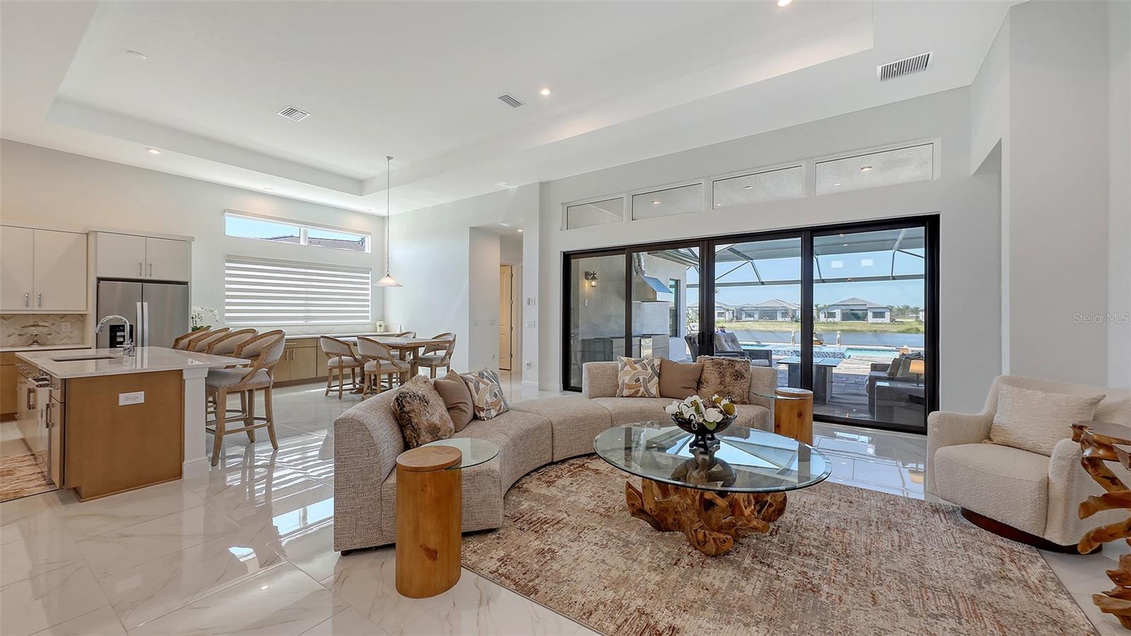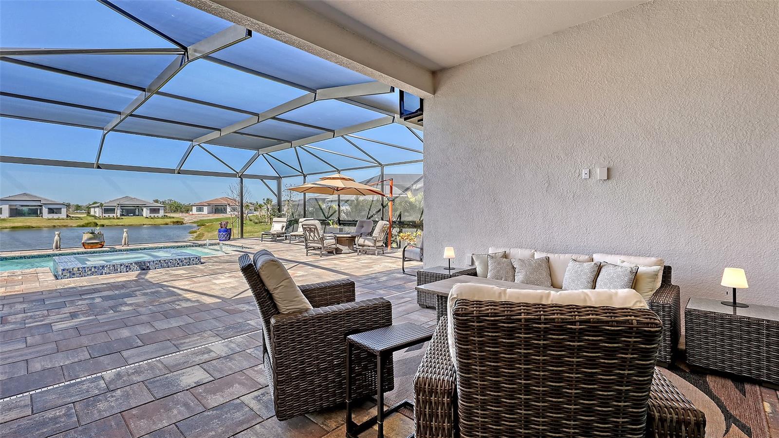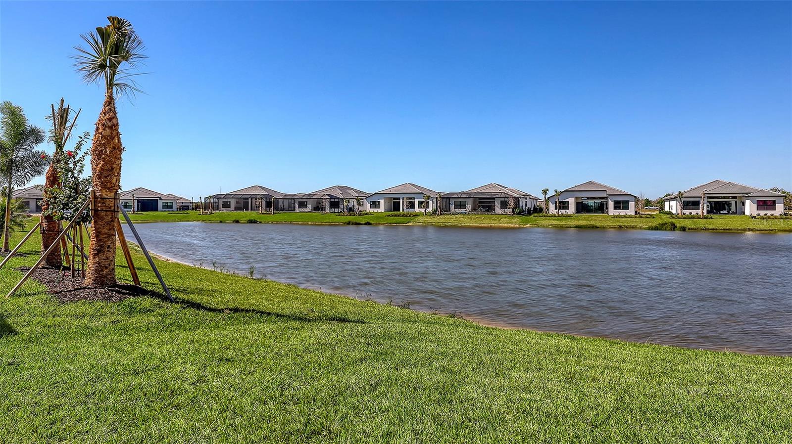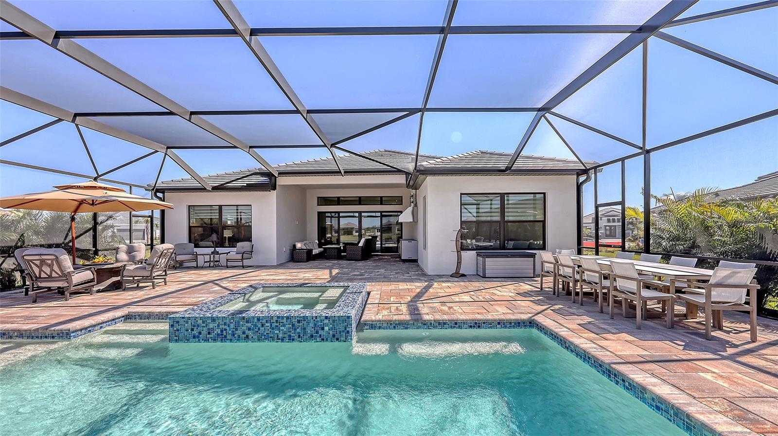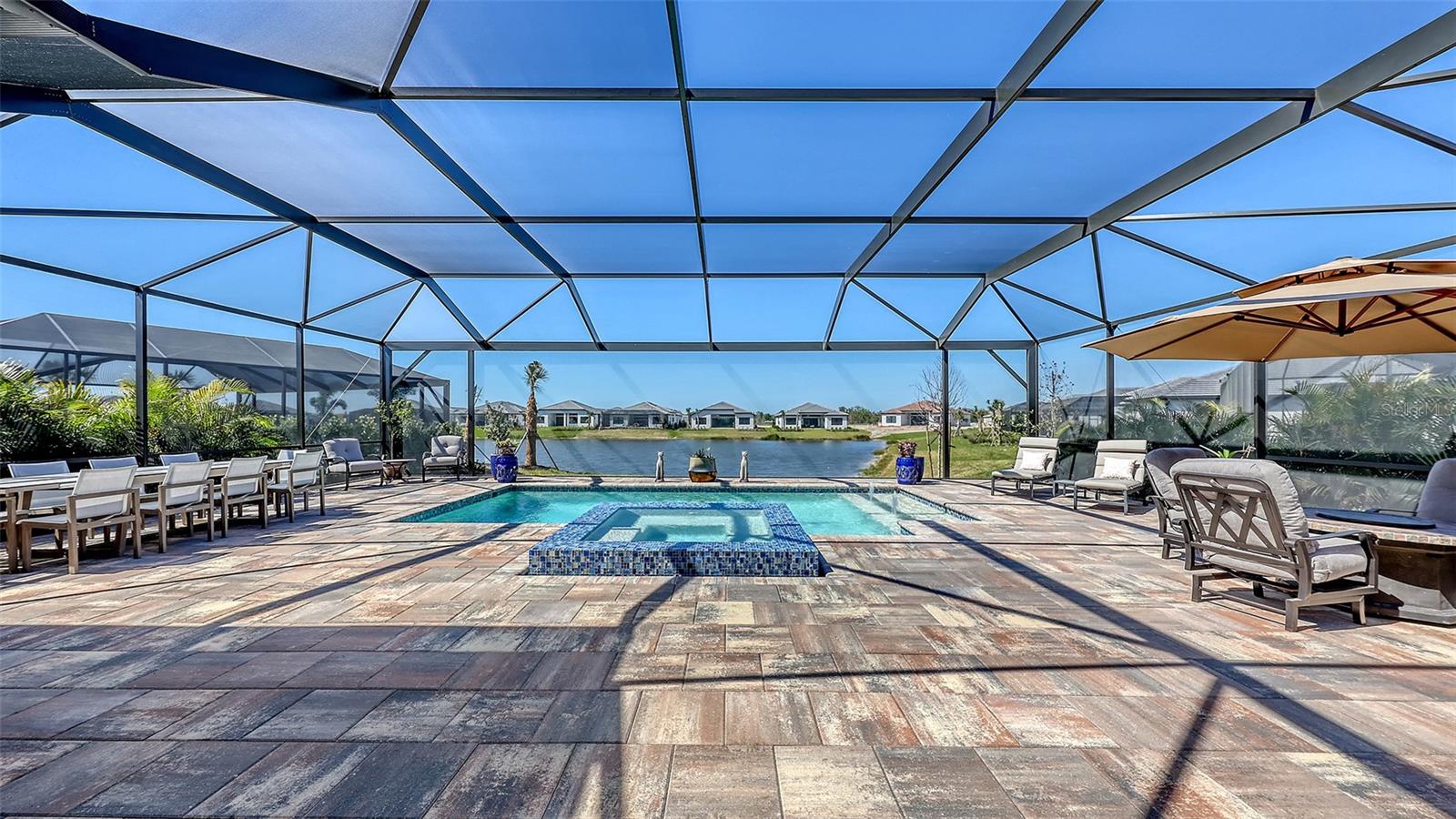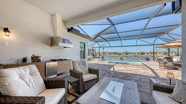 Welcome to Artistry, an exclusive, resort-style community, where luxury meets tranquility. Nestled behind the gates, you'll discover this stunning Picasso model home, newly completed by Cardel Homes. This exceptional residence is set on a premium 0.44-acre lot, offering breathtaking water views and ample space between neighboring homes. As you step inside, you are greeted by soaring cathedral tray ceilings, exquisite 24 inch porcelain tile, and an expansive, open-concept floor plan that is both bright and inviting. The neutral color palette throughout the home enhances the sense of space and light. Designed for the discerning buyer, the gourmet kitchen is a true showstopper. Featuring top-of-the line appliances, a vast island, quartz countertops, and an additional large buffet with cabinetry, it's the perfect setting for culinary enthusiasts. A built-in bar with a large wine fridge adds a touch of elegance and functionality. The kitchen seamlessly flows into the spacious Great Room, ideal for entertaining guests. High-impact windows throughout the residence with sleek motorized window shades on each window enhance the modern aesthetic. The generously sized primary suite offers a serene retreat with a tray ceiling and picturesque water views. The en-suite bathroom is designed for relaxation, featuring an oversized shower with an upgraded glass enclosure, listellos design touches, dual vanities, additional linen cabinetry, and two large walk-in closets. Each of the additional bedrooms comes with a private bathroom and custom wood shelving in the closets, ensuring both luxury and practicality. Step outside to the extra large expansive lanai, where you'll be captivated by the spa and infinity view of pool and stunning water views. The space is perfect for both relaxation and entertaining, featuring elegant oversized brick pavers and a custom outdoor kitchen area includes faucet sink, grill, Refrigerator, vented hood, creating your own personal paradise. Additional features include a tankless water heater, radiant barrier roofing, upgraded Polymaster foam insulation in the attic, a garage plumbed for a sink, ceiling pre wired for speakers, and for a security system-demonstrating that no detail has been overlooked. Artistry's community amenities are equally impressive, offering a clubhouse, pool, fitness center, playground, Pickleball, and more. Located just minutes from fine dining, shopping, and a short drive to UTC Mall and downtown, you're never far from everything you need. Whether you're enjoying a sunset cocktail on your lanai or playing a round of golf at one of the nearby courses, this home truly has it all. Welcome home to Artistry, where elegance and comfort meet.