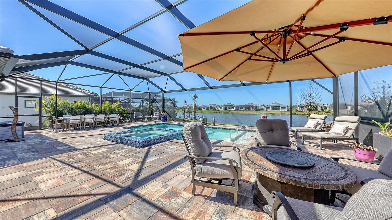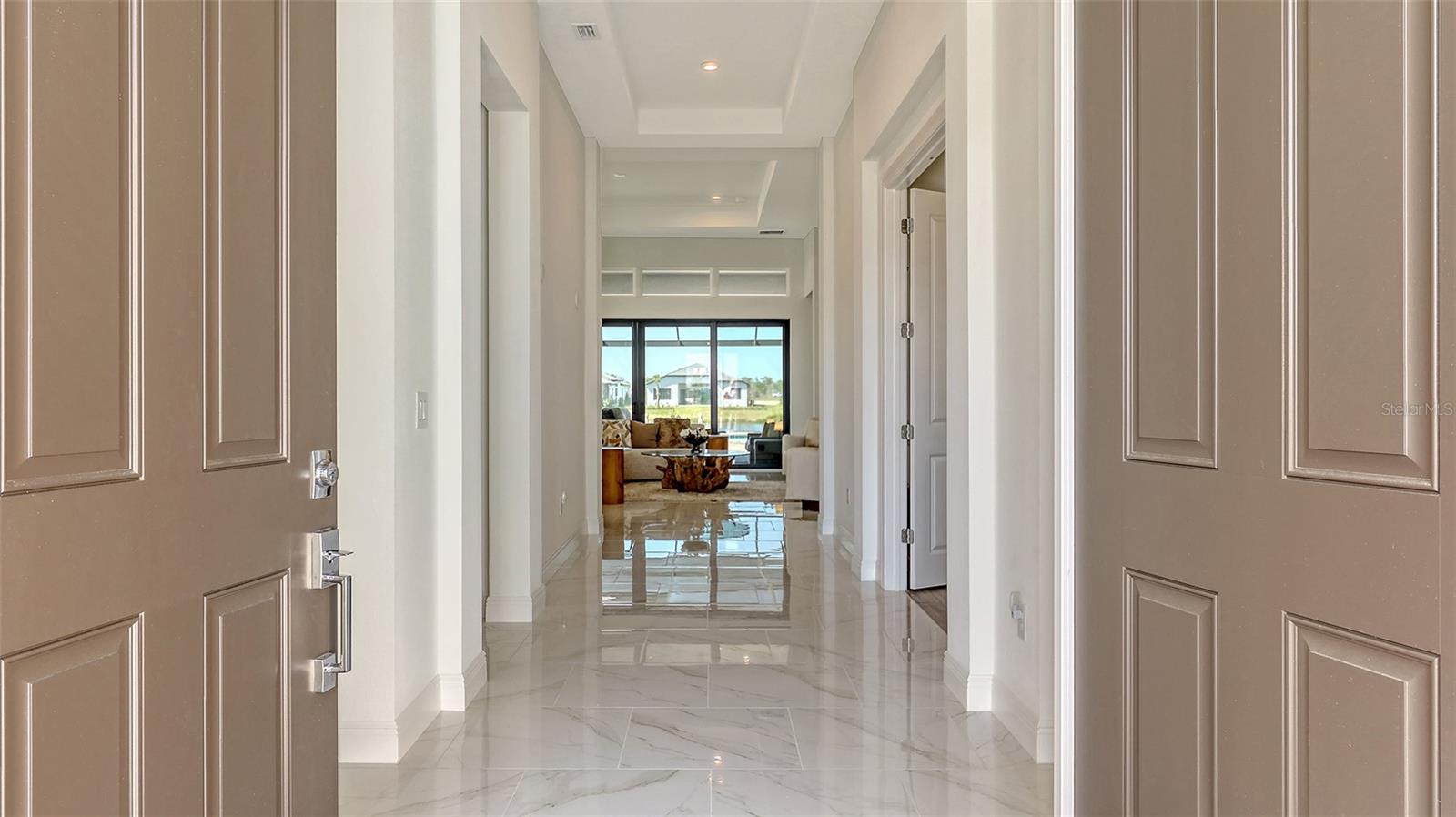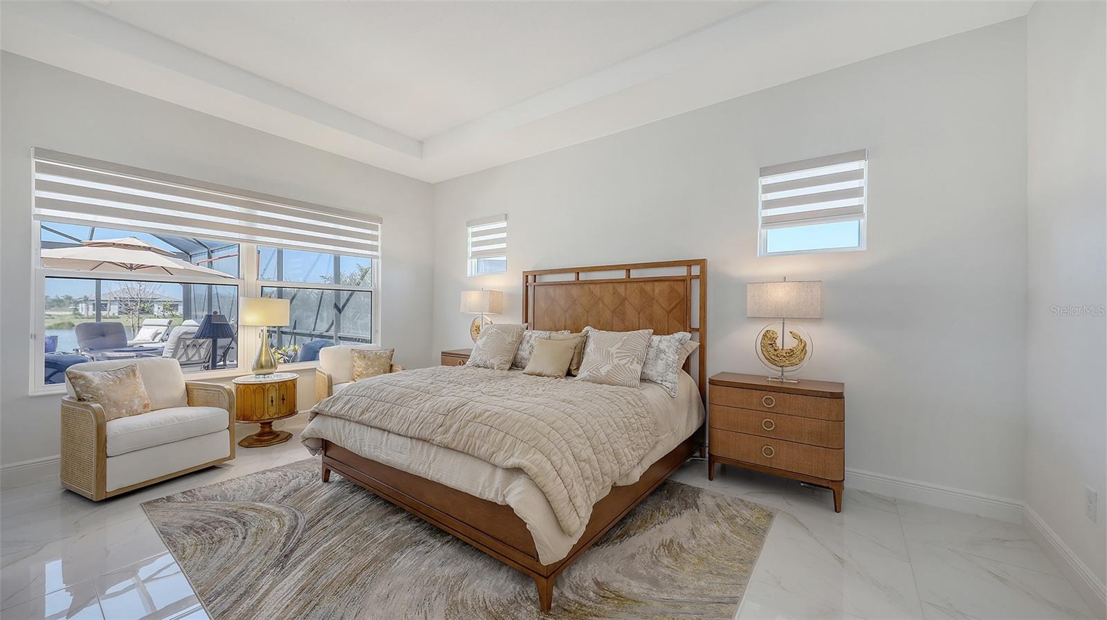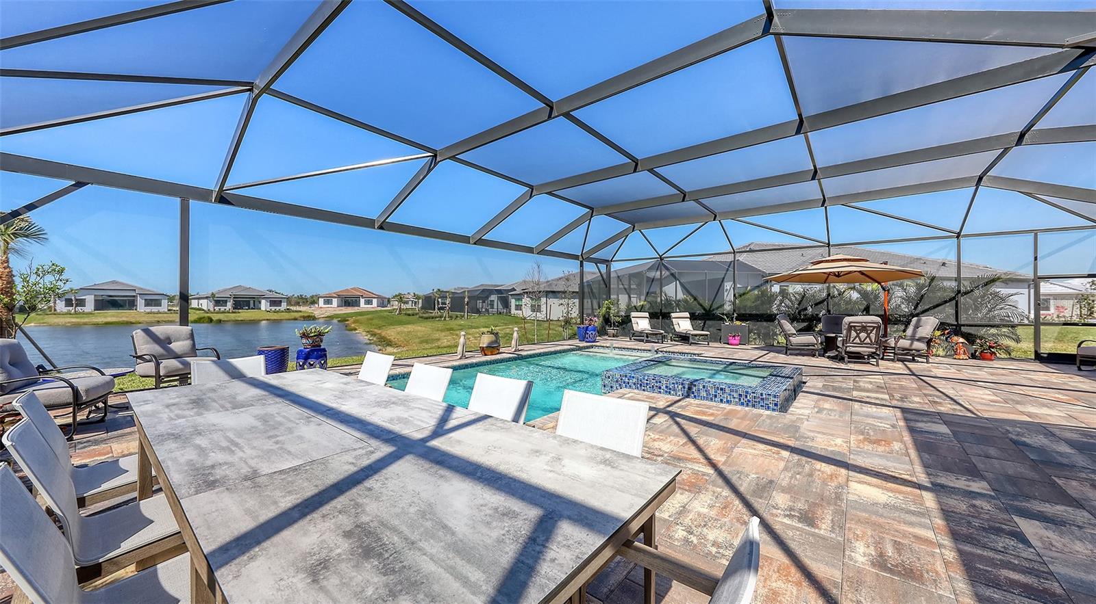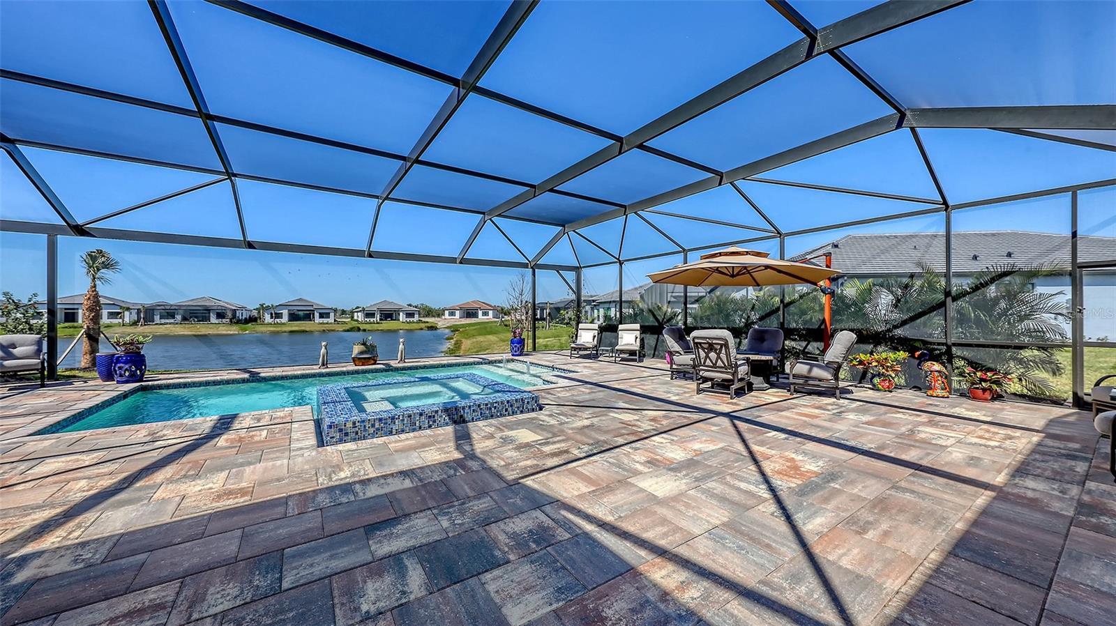 Welcome to Artistry, an exclusive, resort-style community, where luxury meets tranquility. Nestled behind the gates, you'll discover this stunning Picasso model home, newly completed by Cardel Homes. This exceptional residence is set on a premium 0.44-acre lot, offering breathtaking water views and ample space between neighboring homes. As you step inside, you are greeted by soaring cathedral tray ceilings, exquisite 24 inch porcelain tile, and an expansive, open-concept floor plan that is both bright and inviting. The neutral color palette throughout the home enhances the sense of space and light. Designed for the discerning buyer, the gourmet kitchen is a true showstopper. Featuring top-of-the line appliances, a vast island, quartz countertops, and an additional large buffet with cabinetry, it's the perfect setting for culinary enthusiasts. A built-in bar with a large wine fridge adds a touch of elegance and functionality. The kitchen seamlessly flows into the spacious Great Room, ideal for entertaining guests. High-impact windows throughout the residence with sleek motorized window shades on each window enhance the modern aesthetic. The generously sized primary suite offers a serene retreat with a tray ceiling and picturesque water views. The en-suite bathroom is designed for relaxation, featuring an oversized shower with an upgraded glass enclosure, listellos design touches, dual vanities, additional linen cabinetry, and two large walk-in closets. Each of the additional bedrooms comes with a private bathroom and custom wood shelving in the closets, ensuring both luxury and practicality. Step outside to the extra large expansive lanai, where you'll be captivated by the spa and infinity view of pool and stunning water views. The space is perfect for both relaxation and entertaining, featuring elegant oversized brick pavers and a custom outdoor kitchen area includes faucet sink, grill, Refrigerator, vented hood, creating your own personal paradise. Additional features include a tankless water heater, radiant barrier roofing, upgraded Polymaster foam insulation in the attic, a garage plumbed for a sink, ceiling pre wired for speakers, and for a security system-demonstrating that no detail has been overlooked. Artistry's community amenities are equally impressive, offering a clubhouse, pool, fitness center, playground, Pickleball, and more. Located just minutes from fine dining, shopping, and a short drive to UTC Mall and downtown, you're never far from everything you need. Whether you're enjoying a sunset cocktail on your lanai or playing a round of golf at one of the nearby courses, this home truly has it all. Welcome home to Artistry, where elegance and comfort meet.