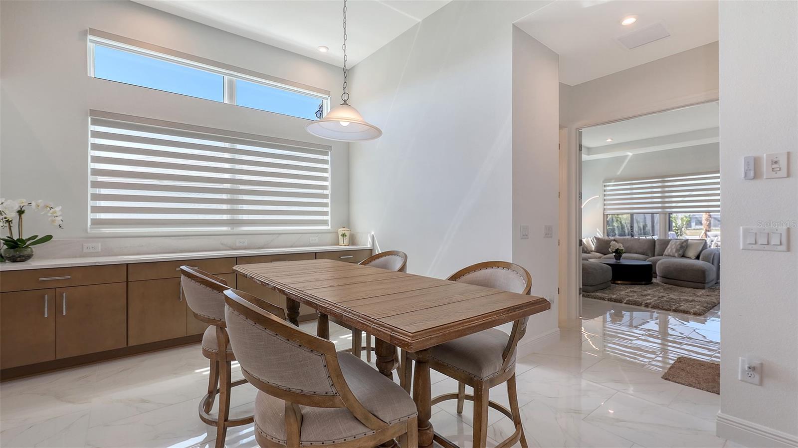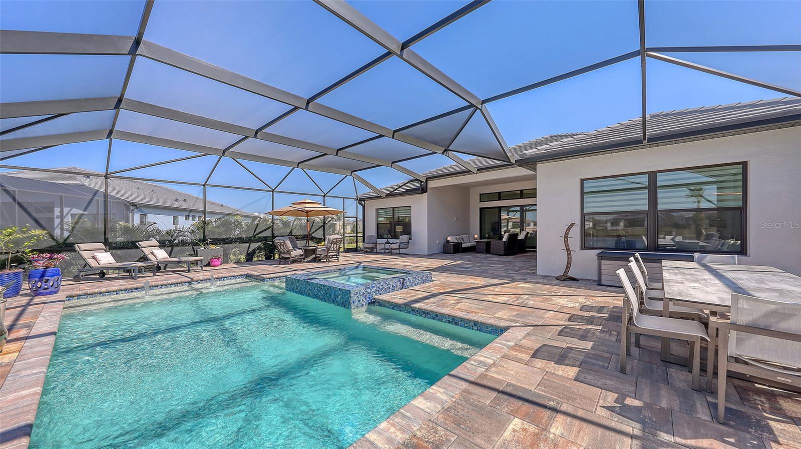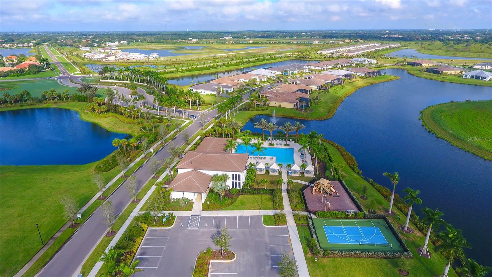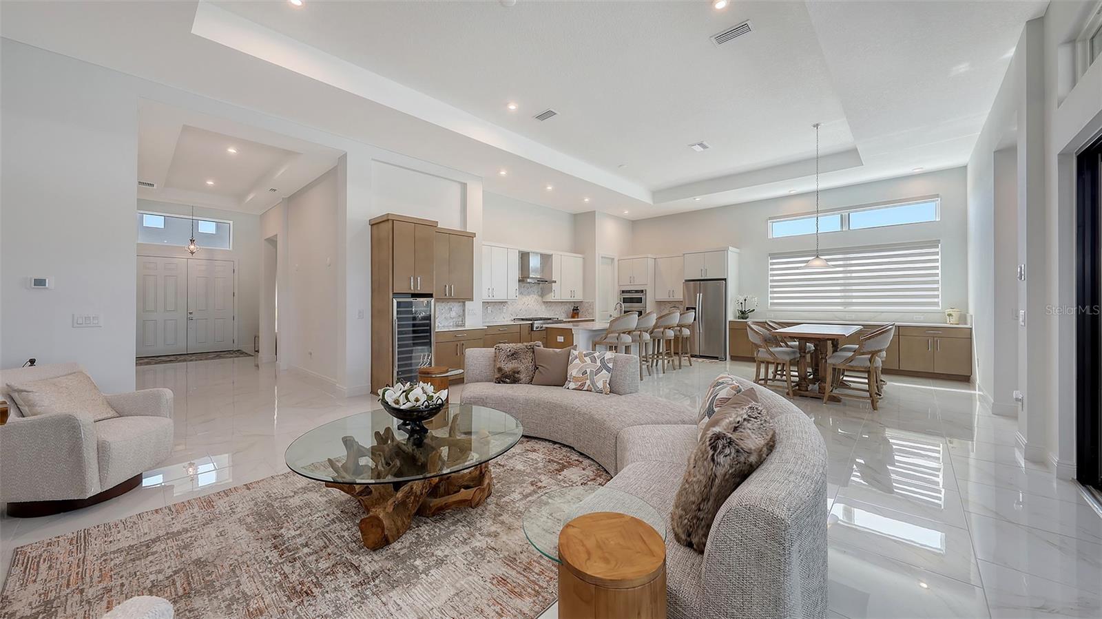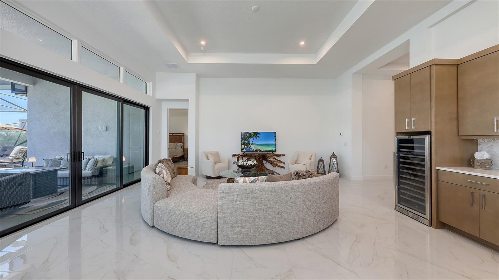 Welcome to Artistry, an exclusive, resort-style community, where luxury meets tranquility. Nestled behind the gates, you'll discover this stunning Picasso model home, newly completed by Cardel Homes. This exceptional residence is set on a premium 0.44-acre lot, offering breathtaking water views and ample space between neighboring homes. As you step inside, you are greeted by soaring cathedral tray ceilings, exquisite 24 inch porcelain tile, and an expansive, open-concept floor plan that is both bright and inviting. The neutral color palette throughout the home enhances the sense of space and light. Designed for the discerning buyer, the gourmet kitchen is a true showstopper. Featuring top-of-the line appliances, a vast island, quartz countertops, and an additional large buffet with cabinetry, it's the perfect setting for culinary enthusiasts. A built-in bar with a large wine fridge adds a touch of elegance and functionality. The kitchen seamlessly flows into the spacious Great Room, ideal for entertaining guests. High-impact windows throughout the residence with sleek motorized window shades on each window enhance the modern aesthetic. The generously sized primary suite offers a serene retreat with a tray ceiling and picturesque water views. The en-suite bathroom is designed for relaxation, featuring an oversized shower with an upgraded glass enclosure, listellos design touches, dual vanities, additional linen cabinetry, and two large walk-in closets. Each of the additional bedrooms comes with a private bathroom and custom wood shelving in the closets, ensuring both luxury and practicality. Step outside to the extra large expansive lanai, where you'll be captivated by the spa and infinity view of pool and stunning water views. The space is perfect for both relaxation and entertaining, featuring elegant oversized brick pavers and a custom outdoor kitchen area includes faucet sink, grill, Refrigerator, vented hood, creating your own personal paradise. Additional features include a tankless water heater, radiant barrier roofing, upgraded Polymaster foam insulation in the attic, a garage plumbed for a sink, ceiling pre wired for speakers, and for a security system-demonstrating that no detail has been overlooked. Artistry's community amenities are equally impressive, offering a clubhouse, pool, fitness center, playground, Pickleball, and more. Located just minutes from fine dining, shopping, and a short drive to UTC Mall and downtown, you're never far from everything you need. Whether you're enjoying a sunset cocktail on your lanai or playing a round of golf at one of the nearby courses, this home truly has it all. Welcome home to Artistry, where elegance and comfort meet.