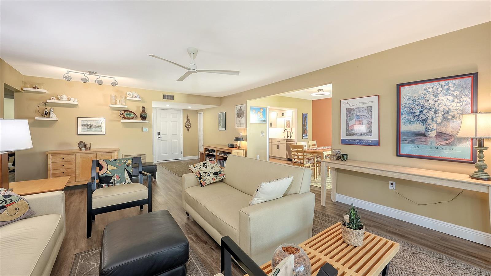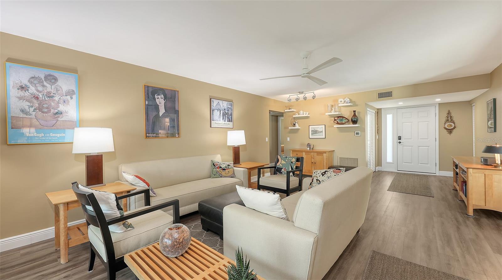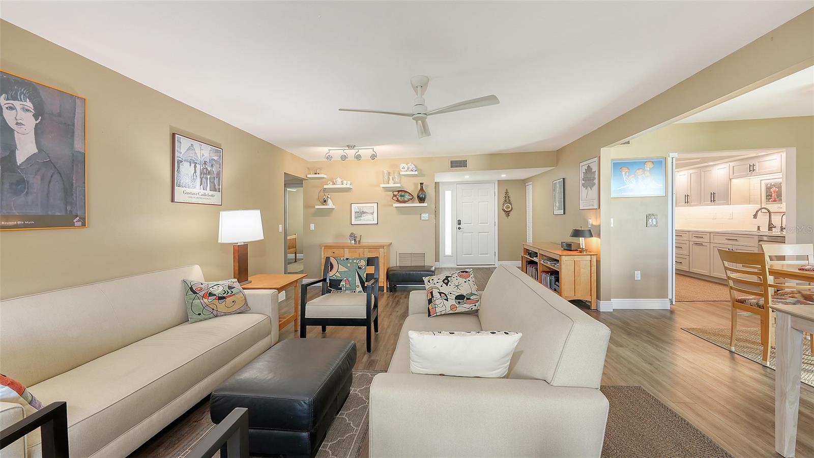 Do not miss this beautifully remodeled 2 bedroom, 2 bath home in The Meadows, a premier resort-style community. Showcasing stunning mid-century modern architecture, this residence is a 10, featuring a full renovation with a wow-factor kitchen – wood cabinetry, stainless steel appliances, Cambria quartz countertops, and a raised ceiling for added elegance. All-new impact windows and sliders, gorgeous hardwood flooring throughout (no carpet), and electronic shades elevate the home’s modern appeal. Additional updates include a 2023 water heater, 2022 roof and A/C system, impact windows/sliders, brand-new fire front door and recently painted inside. Reverse Osmosis for the kitchen and a Pro H20 water softener system for the entire condo. Enjoy breathtaking water views from your private all season enclosed lanai, perfect for relaxation. The owner’s suite offers custom-designed closets and an updated bath, while the second bedroom includes a spa-like walk-in tub. A full-size washer and dryer, interior laundry room, and a one car carport add convenience. The Meadows span 1,600 park-like acres with 14 miles of scenic biking and hiking trails, a Junior Olympic pool, fitness center, top notch tennis complex, pickleball courts, dining venues and three pay -to-play 18-hole golf courses. Optional club membership offers even more social, sports, and golf amenities. Located just 15 minutes from downtown, you are close to award winning beaches, vibrant arts and culture, Nathan Benderson Park, Mote SEA Aquarium, Whole Foods, Trader Joe’s, and The Mall at University Town Center, a world class shopping, entertainment and dining destination. Best of all, there are no assessments and situated above flood plain Zone X. A fabulous Florida lifestyle awaits – schedule your showing today!