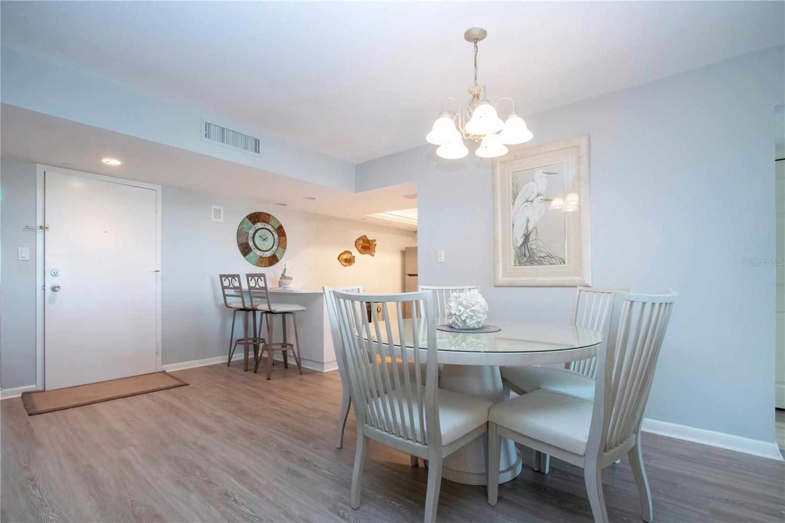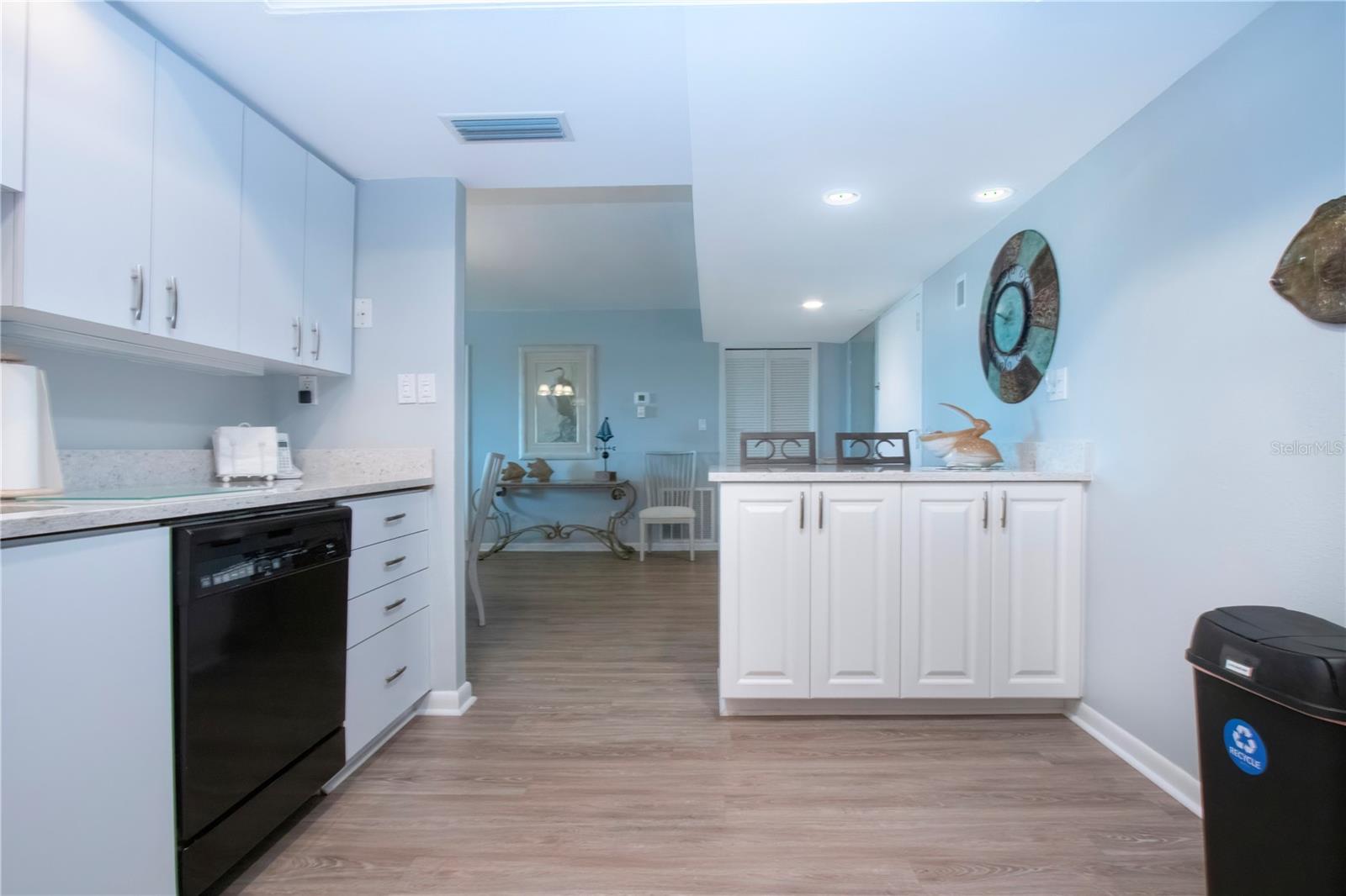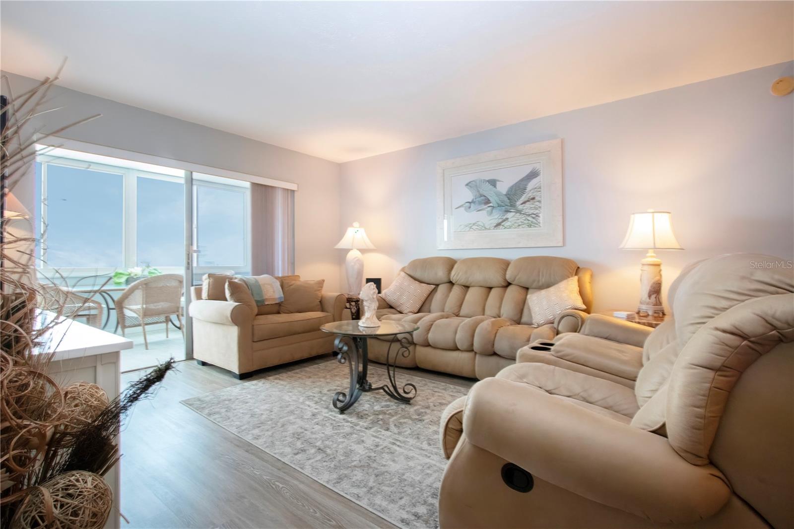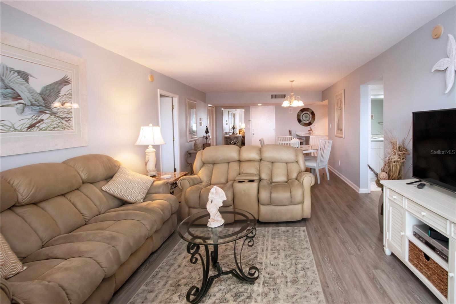 6th floor Gulfside Highrise facing East overlooking the peppertree grounds--High and Dry! Beautifully appointed with detail to owners care of the unit. Spacious open kitchen with extra storage, wood lament flooring throughout the living areas; tile in the baths and lanai. Lanai enclosed with hurricane windows and new murphy bed on lanai. Supersized utility room with washer and dryer. Underground parking space. Turnkey Furnished and Move in Ready!