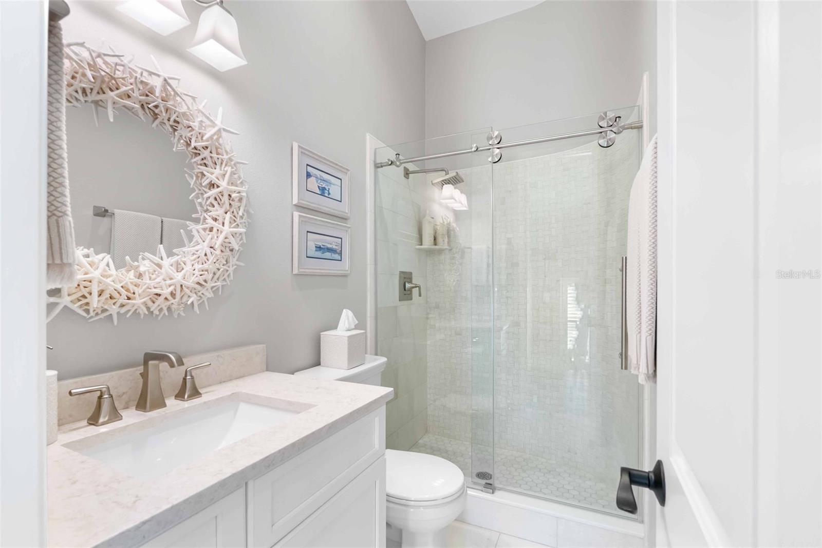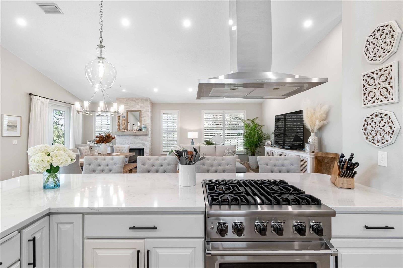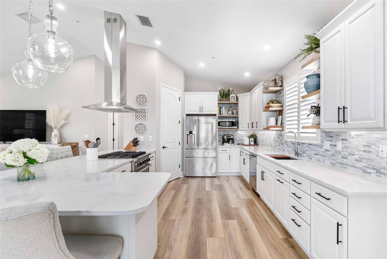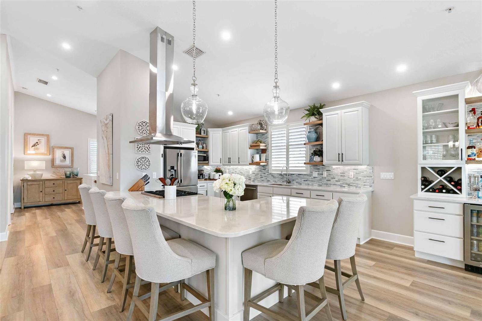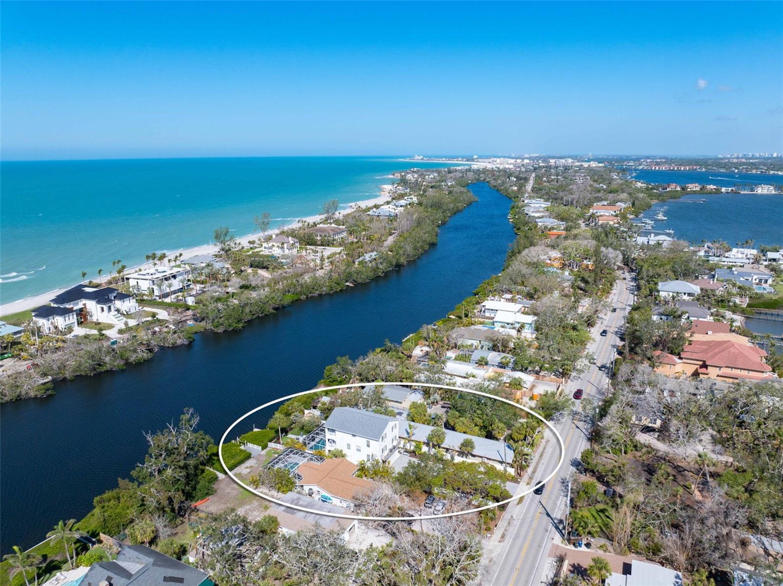 Exceptional waterfront living can be yours at this durable, block construction three-story single-family home set alongside the picturesque Heron Lagoon on Siesta Key. This home is completely move in ready after an extensive, luxury renovation. An attractive, paver drive flanked with lush landscaping offers ample parking while the four-car tandem garage is outfitted for the car enthusiast with a small non-conforming space and access to the backyard pool and spa. The first floor over parking features two en-suite bedrooms with large closets and the smart placement of the laundry closet. Stretching across the entire width of the home with a private office and relaxing, private terrace is the primary en-suite. The perfect place to rest, recharge and pamper with stunning views and a unique primary bath featuring dual vanities, soaking tub, walk-in shower and state of the art design. Ascend to the top floor by stairs or elevator to find an additional bedroom and full bath as well as the open concept living space offering three sets of hurricane rated French doors, allowing loads of natural light and panoramic views of the lagoon. The chef-inspired kitchen is equipped with a Viking stove & Frigidaire refrigerator (2021), custom cabinetry, glimmering quartz counters with an ocean inspired backsplash, and an additional built-in area for your private collection of spirits or prized glass ware. The gas fireplace in the dining area provides warmth and intimacy as you host your family and friends to enjoy your creative cuisine and offer a nightcap on the third-floor terrace overlooking the backyard designed for entertainment. A spiral staircase is your invitation to soak up the warm Florida sunshine in the refreshing pool (new mechanics 2024), challenge your guests to a putting contest on the integrated putting green, float peacefully alongside the mangroves from the kayak or paddleboard launch (new 2022) or drop a fishing line in the lagoon for the fresh catch of the day. On mild evenings, star gaze from the cozy hot tub (new 2024) or share stories of your Siesta Key adventures around the gas fire pit. Take a short stroll and find yourself at Turtle Beach Park, where beach access, grills, pavilions, a playground and much more can be your destination for hosting a gathering or a quiet day on the beach to yourself. With western views and exquisite attention to detail, this exceptional Siesta Key family retreat offers a rare opportunity to own a piece of paradise. A list of additional upgrades and details of renovation dates available upon request.