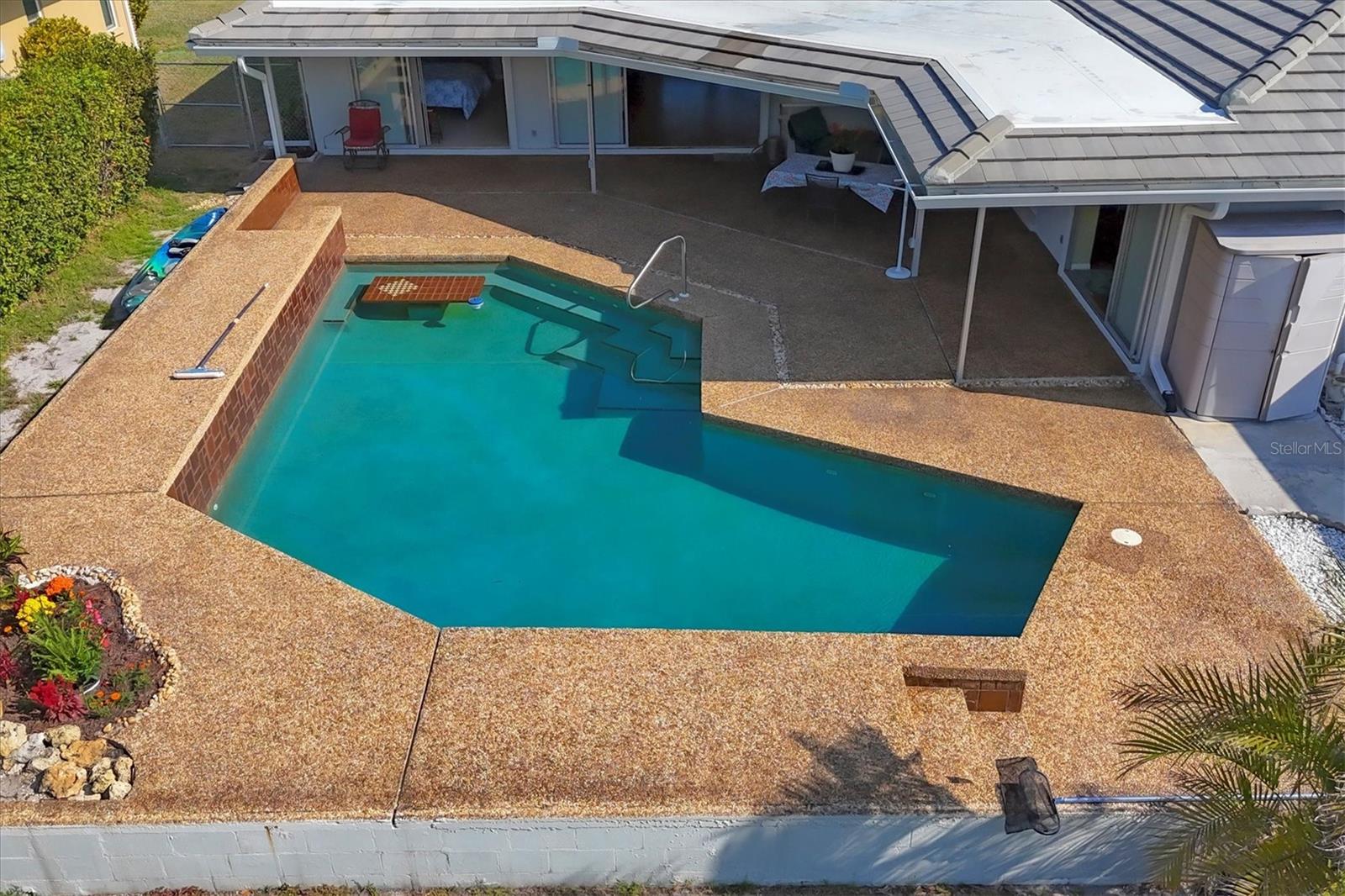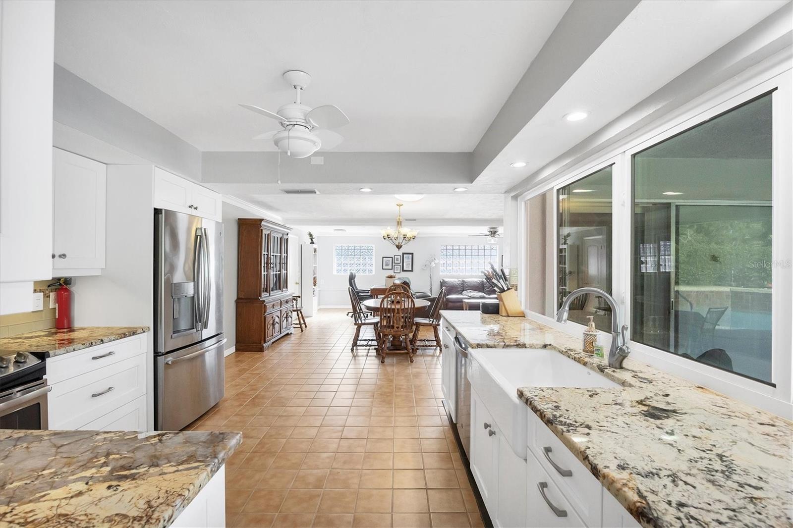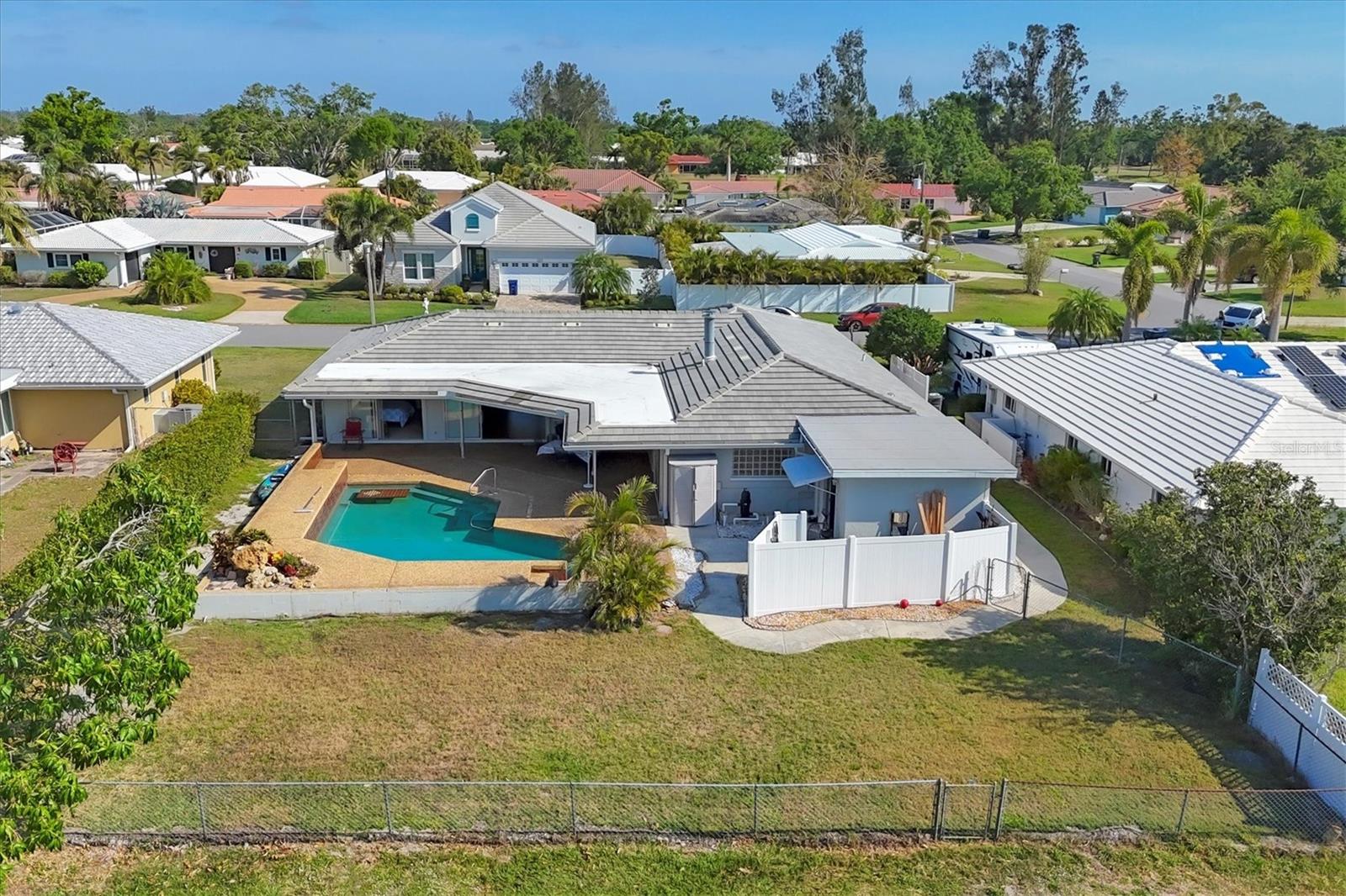 A lovely golf course view from one of the largest pool homes in the heart of Village Green Club Estates at Southgate..... Enter through the front door into over 2240 sq ft of Florida living. The interior has been freshly painted and there is crown molding throughout. As you move into the kitchen, you are greeted by granite counter tops and a wall of windows that allows you to look upon the lanai, pool, yard and golf course..... The open concept floorplan has the kitchen flowing into a dining area, which is really a breakfast nook, and then transitions into the family room, whose prominent feature is a flagstone fireplace with a mantle..... All of this area is spacious yet surprisingly cozy..... On the other side of the kitchen, the traditional living room - dining room space connects to the kitchen and has an expansive sliding glass door allowing entrance to the pool..... The master bedroom and ensuite bathroom is on this side of the house, seperated from the noise and bustle of the guests and or grandchildren on the other side.....The grout in the two bathrooms as well as all of the tiled floors has recently been professionally cleaned..... All of the bedrooms have access to the outdoor lanai - pool space via slider doors and the second bathroom is also the dedicated pool bathroom......The lanai is where you will be spending a great deal of your time, and even though it is large and open, it is a remarkably private area.....Enjoy cage free swimming in the 15,000 gallon pool. The pump and filter are new and the deck has a no slip pebble surface called Chattahoochie Stone that has just been resealed.....The roof was vigorously inspected recently and is free of cracks. New gutters in back......Finally, this house has an authentic two car garage with room for two cars, a golf cart and an optional snow blower.....Village Green Club Estates has a very minimal HOA Fee and NO CDD Fees.....Flood Zone X (An area that is Determined to be Outside The 100 and 500 Year Floodplains)...... Central location is just a few miles from Downtown Sarasota, the wonderful beaches, the airport and I-75.....See the pictures for more information on the features of this wonderful home.......
