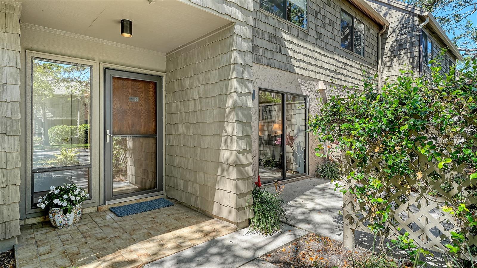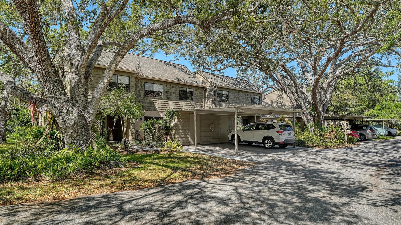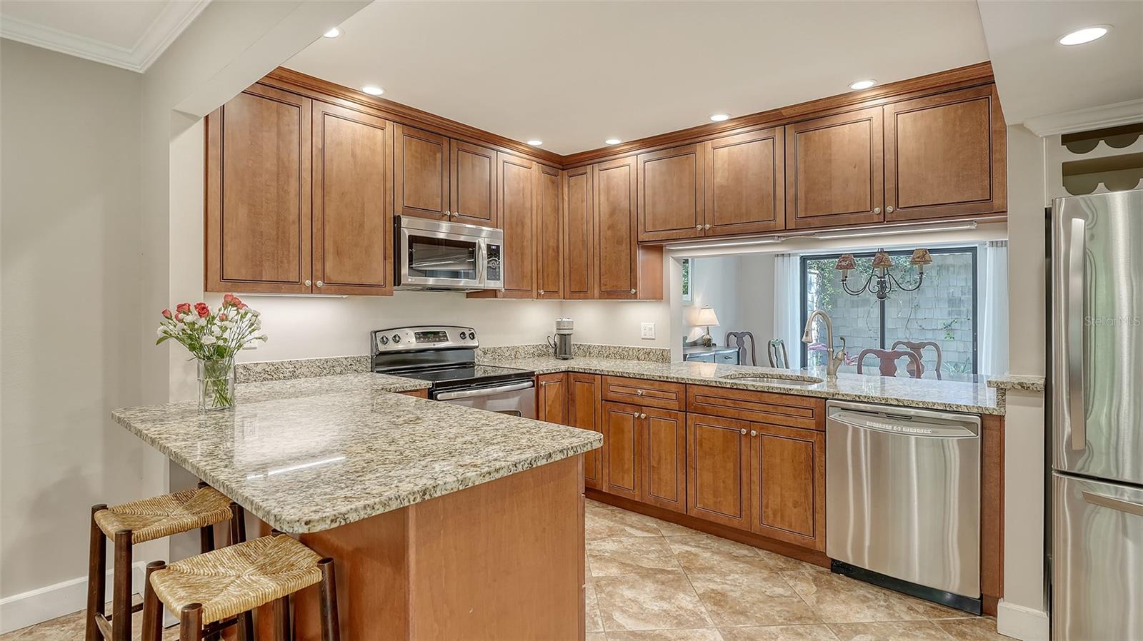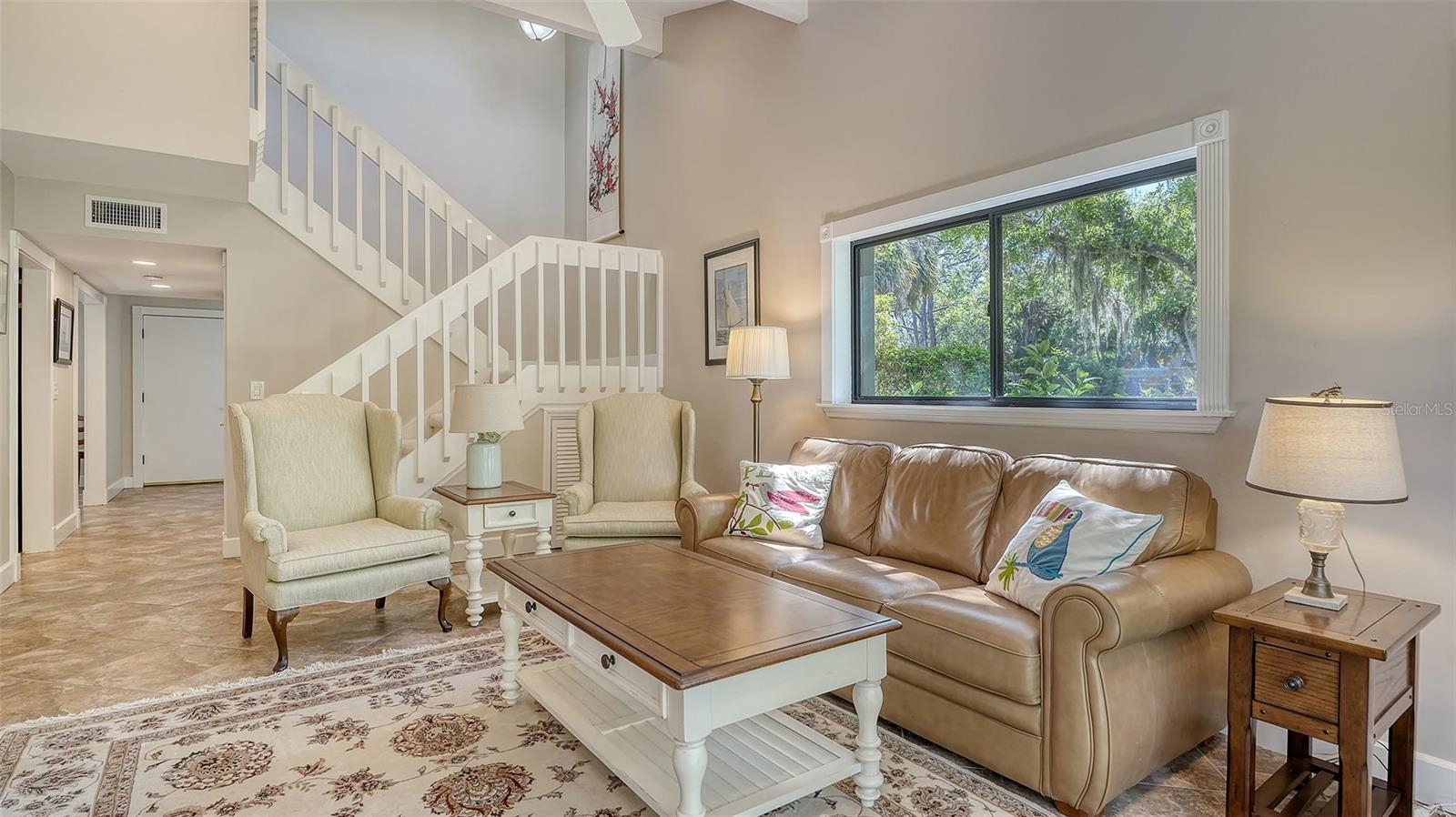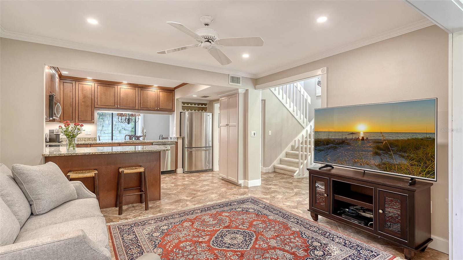 Blending into the natural setting of the gardens and trees within Pelican Cove in Sarasota, this lovely three-bedroom and three-bath home has been stylishly renovated and designed for relaxed Florida living. As an end unit with an abundance of windows, light streams into the condominium and sliding doors open up to a private fenced outdoor patio in the front and also to an open back patio, bringing the outside in. The downstairs interior living space of the two-story condominium was enhanced by raising the former lanai and combining it into the open living area of the family room and kitchen, adding to the seamless flow between all rooms. The impressive vaulted ceiling in the large living room adds to the exceptionally spacious, bright and breezy feel of the home. Upstairs and down, designer touches and accents are found everywhere. All three baths have been totally updated with wood vanities, granite countertops and full glass shower and bath remodeling, upgraded interior doors and hardware were installed in every room, crown molding was skillfully built around ceilings, and all doors and windows reframed with classic wood molding. On the first floor, a major renovation was completed. The kitchen was opened up to the family room and beautifully remodeled with KraftMaid quality cabinets, granite countertops, stainless appliances and undercounter lighting, while the popcorn ceilings were removed and then replaced, and recessed lighting added. The entire downstairs flooring was replaced with neutral-colored large ceramic tiles throughout at that same time, designer drapes installed and, most recently in 2023, all walls and woodwork were freshly painted and one of two air-conditioning systems replaced in 2024. The second floor is accessed by an architecturally pleasing stairway, with a landing overlooking the living room and leading to a comfortable layout of the bedrooms upstairs. The two guest rooms have large windows with Hunter Douglas blinds, ample wall closets and they share a bath. The private primary bedroom suite is conveniently separated from guests, with a walk-in closet with built-ins, the redone en-suite bath and, through a wall of sliders, a cozy balcony overlooking the backyard. The Pelican Cove community is somewhat hidden from the hubbub, but is centrally near lots of shopping, dining, beaches and all cultural events downtown Sarasota has to offer! There is something for everyone in this waterfront and pet-friendly place, aquatic sports in one of the six outdoor pools, tennis and pickleball, yoga, bird watching, exploring along the boardwalks some of its 78 acres, kayaking, taking classes at Pelican Cove University or joining one of 37 clubs offered. There is also an 86-slip boat harbor for boating enthusiasts with low-cost rates, call HOA for availability. This condominium and its community are special so call for a private showing.