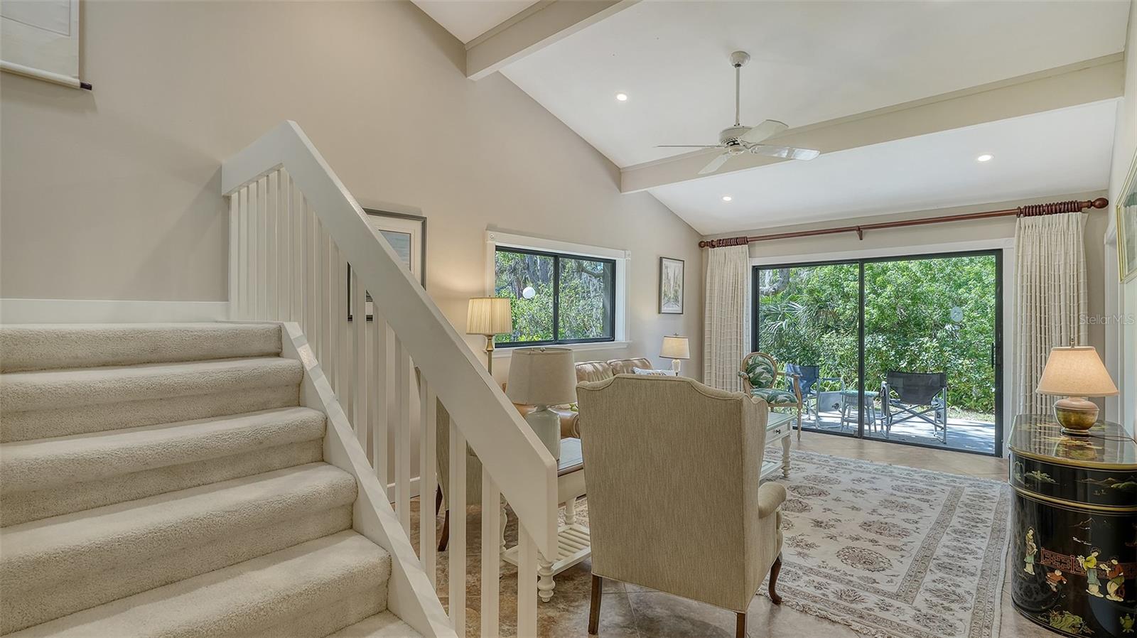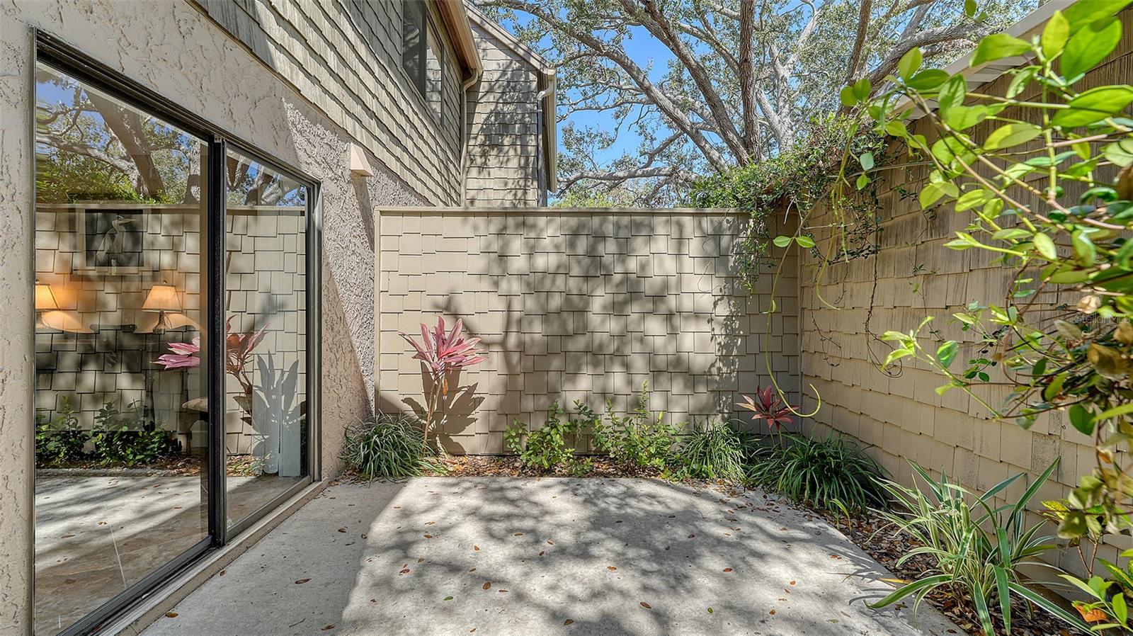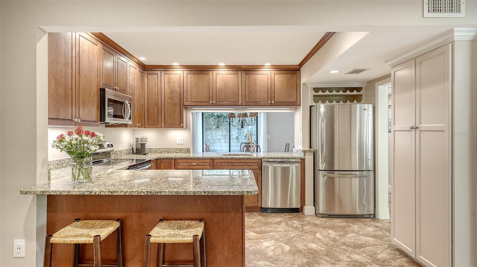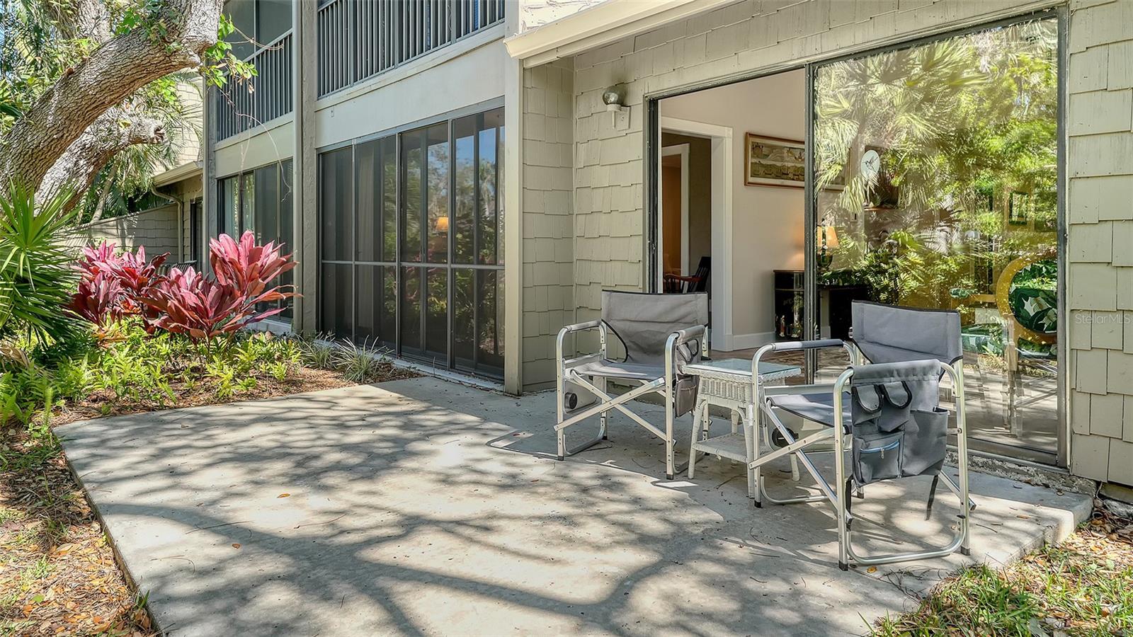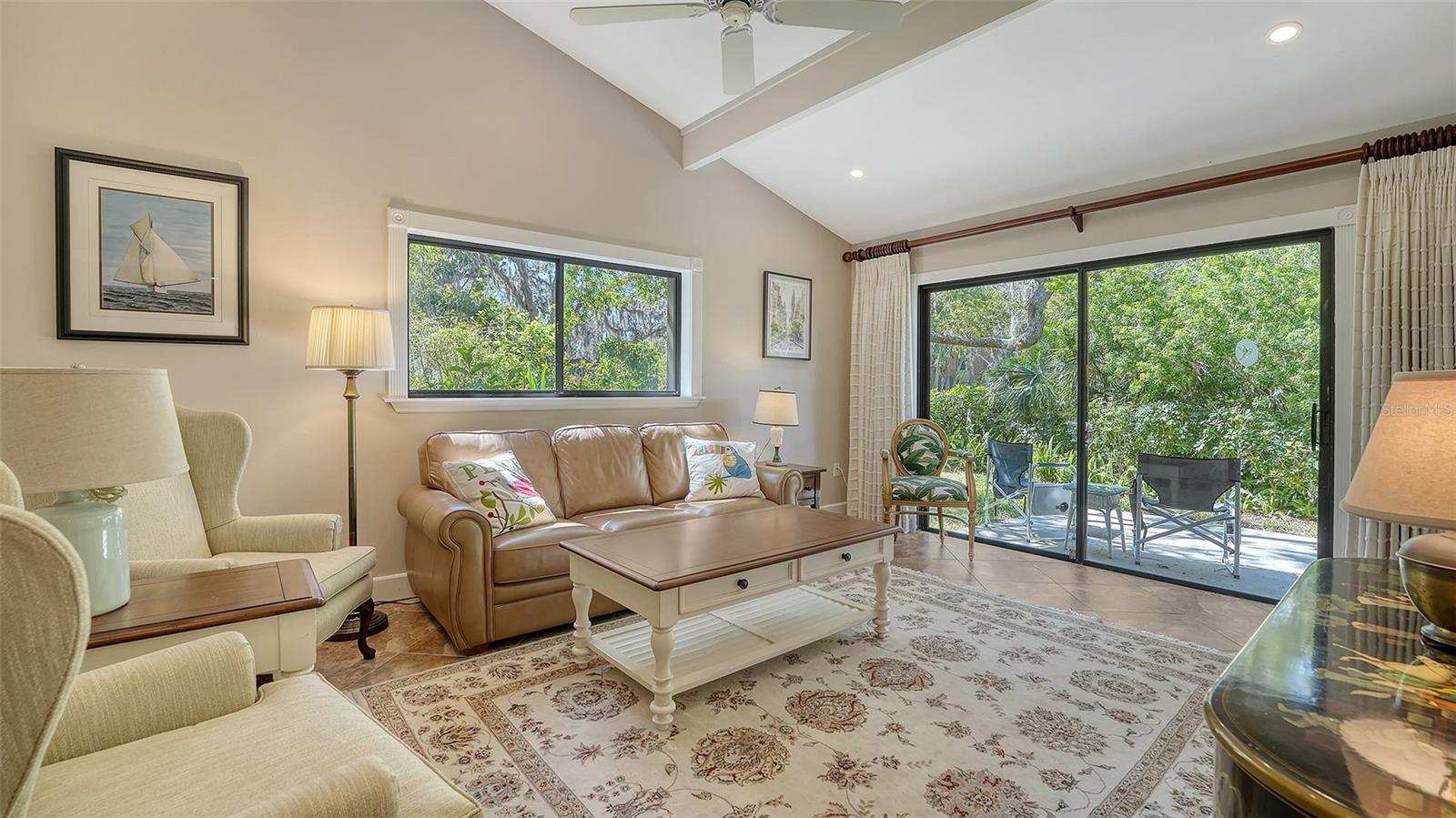 Blending into the natural setting of the gardens and trees within Pelican Cove in Sarasota, this lovely three-bedroom and three-bath home has been stylishly renovated and designed for relaxed Florida living. As an end unit with an abundance of windows, light streams into the condominium and sliding doors open up to a private fenced outdoor patio in the front and also to an open back patio, bringing the outside in. The downstairs interior living space of the two-story condominium was enhanced by raising the former lanai and combining it into the open living area of the family room and kitchen, adding to the seamless flow between all rooms. The impressive vaulted ceiling in the large living room adds to the exceptionally spacious, bright and breezy feel of the home. Upstairs and down, designer touches and accents are found everywhere. All three baths have been totally updated with wood vanities, granite countertops and full glass shower and bath remodeling, upgraded interior doors and hardware were installed in every room, crown molding was skillfully built around ceilings, and all doors and windows reframed with classic wood molding. On the first floor, a major renovation was completed. The kitchen was opened up to the family room and beautifully remodeled with KraftMaid quality cabinets, granite countertops, stainless appliances and undercounter lighting, while the popcorn ceilings were removed and then replaced, and recessed lighting added. The entire downstairs flooring was replaced with neutral-colored large ceramic tiles throughout at that same time, designer drapes installed and, most recently in 2023, all walls and woodwork were freshly painted and one of two air-conditioning systems replaced in 2024. The second floor is accessed by an architecturally pleasing stairway, with a landing overlooking the living room and leading to a comfortable layout of the bedrooms upstairs. The two guest rooms have large windows with Hunter Douglas blinds, ample wall closets and they share a bath. The private primary bedroom suite is conveniently separated from guests, with a walk-in closet with built-ins, the redone en-suite bath and, through a wall of sliders, a cozy balcony overlooking the backyard. The Pelican Cove community is somewhat hidden from the hubbub, but is centrally near lots of shopping, dining, beaches and all cultural events downtown Sarasota has to offer! There is something for everyone in this waterfront and pet-friendly place, aquatic sports in one of the six outdoor pools, tennis and pickleball, yoga, bird watching, exploring along the boardwalks some of its 78 acres, kayaking, taking classes at Pelican Cove University or joining one of 37 clubs offered. There is also an 86-slip boat harbor for boating enthusiasts with low-cost rates, call HOA for availability. This condominium and its community are special so call for a private showing.