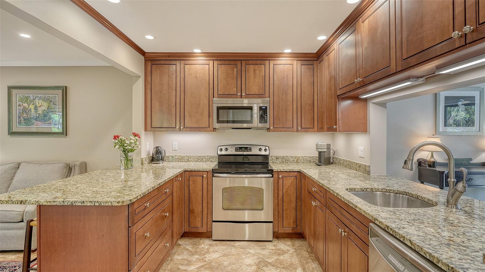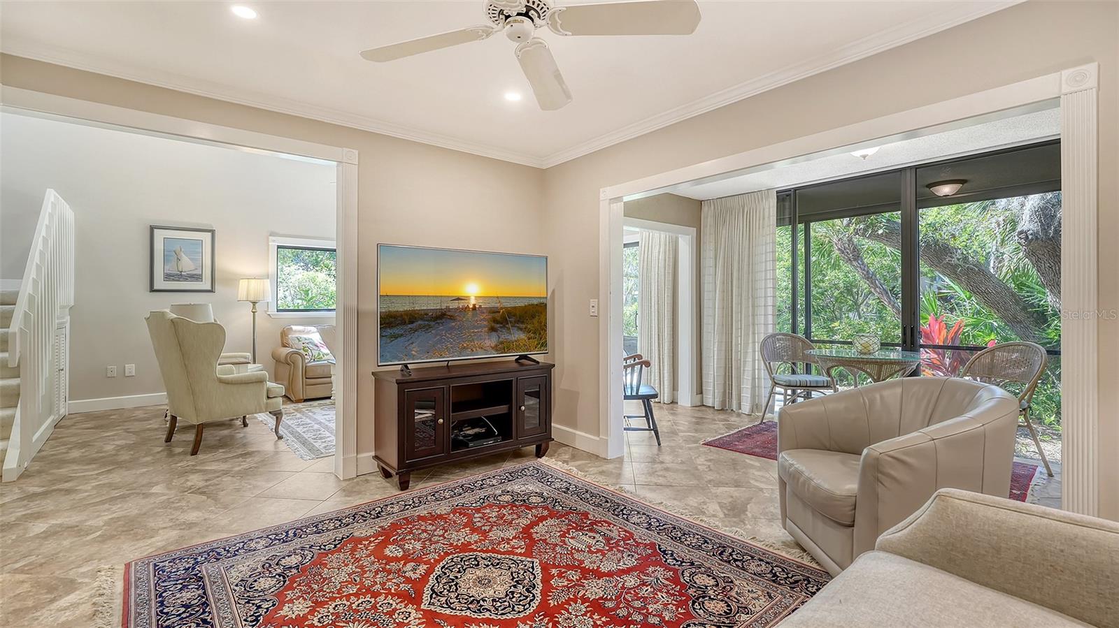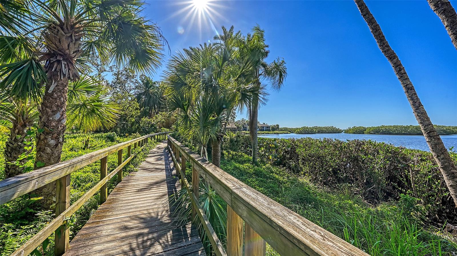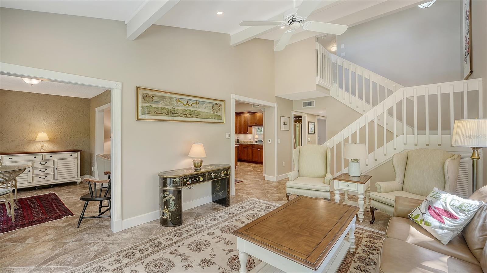 Blending into the natural setting of the gardens and trees within Pelican Cove in Sarasota, this lovely three-bedroom and three-bath home has been stylishly renovated and designed for relaxed Florida living. As an end unit with an abundance of windows, light streams into the condominium and sliding doors open up to a private fenced outdoor patio in the front and also to an open back patio, bringing the outside in. The downstairs interior living space of the two-story condominium was enhanced by raising the former lanai and combining it into the open living area of the family room and kitchen, adding to the seamless flow between all rooms. The impressive vaulted ceiling in the large living room adds to the exceptionally spacious, bright and breezy feel of the home. Upstairs and down, designer touches and accents are found everywhere. All three baths have been totally updated with wood vanities, granite countertops and full glass shower and bath remodeling, upgraded interior doors and hardware were installed in every room, crown molding was skillfully built around ceilings, and all doors and windows reframed with classic wood molding. On the first floor, a major renovation was completed. The kitchen was opened up to the family room and beautifully remodeled with KraftMaid quality cabinets, granite countertops, stainless appliances and undercounter lighting, while the popcorn ceilings were removed and then replaced, and recessed lighting added. The entire downstairs flooring was replaced with neutral-colored large ceramic tiles throughout at that same time, designer drapes installed and, most recently in 2023, all walls and woodwork were freshly painted and one of two air-conditioning systems replaced in 2024. The second floor is accessed by an architecturally pleasing stairway, with a landing overlooking the living room and leading to a comfortable layout of the bedrooms upstairs. The two guest rooms have large windows with Hunter Douglas blinds, ample wall closets and they share a bath. The private primary bedroom suite is conveniently separated from guests, with a walk-in closet with built-ins, the redone en-suite bath and, through a wall of sliders, a cozy balcony overlooking the backyard. The Pelican Cove community is somewhat hidden from the hubbub, but is centrally near lots of shopping, dining, beaches and all cultural events downtown Sarasota has to offer! There is something for everyone in this waterfront and pet-friendly place, aquatic sports in one of the six outdoor pools, tennis and pickleball, yoga, bird watching, exploring along the boardwalks some of its 78 acres, kayaking, taking classes at Pelican Cove University or joining one of 37 clubs offered. There is also an 86-slip boat harbor for boating enthusiasts with low-cost rates, call HOA for availability. This condominium and its community are special so call for a private showing.