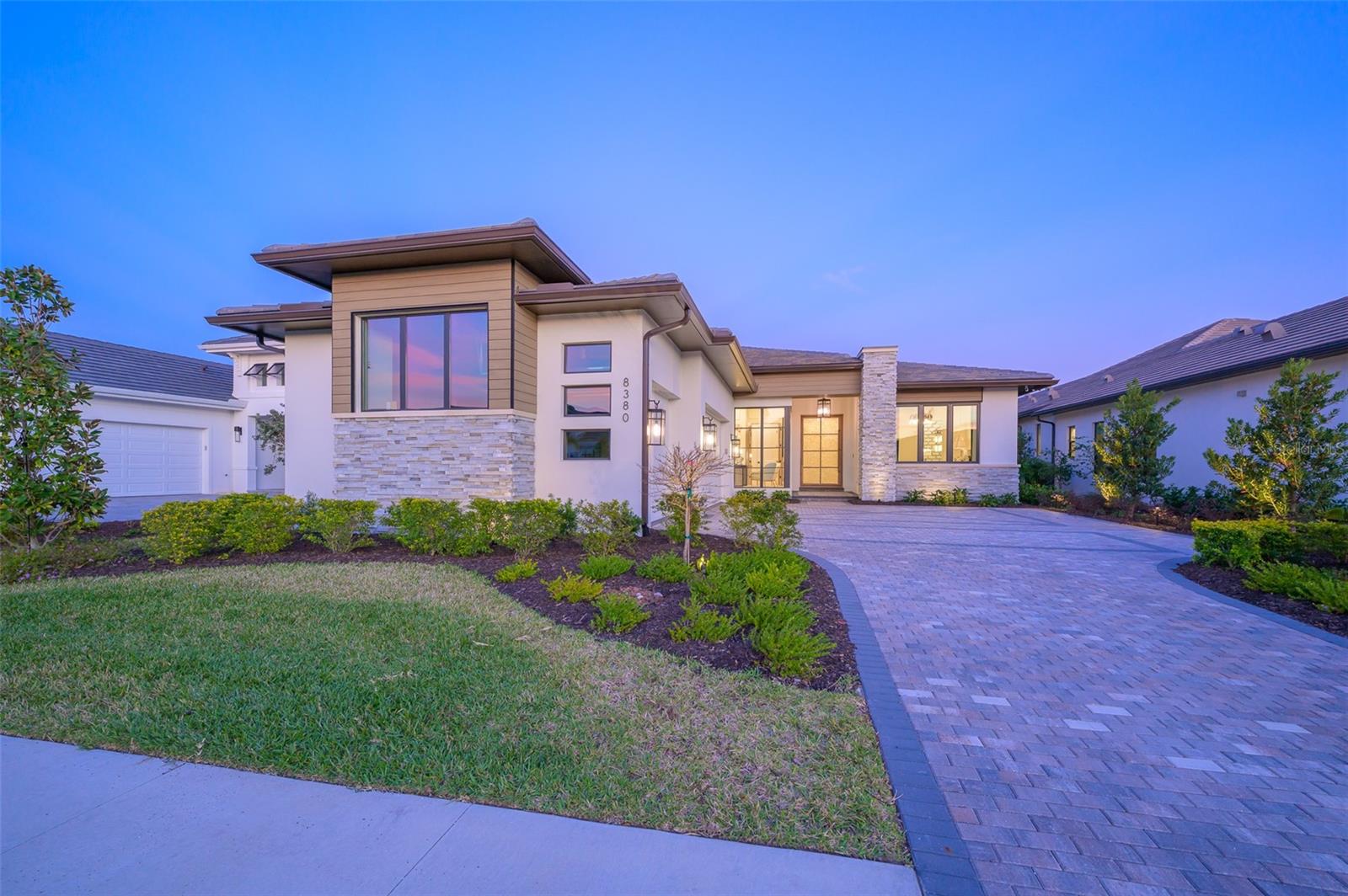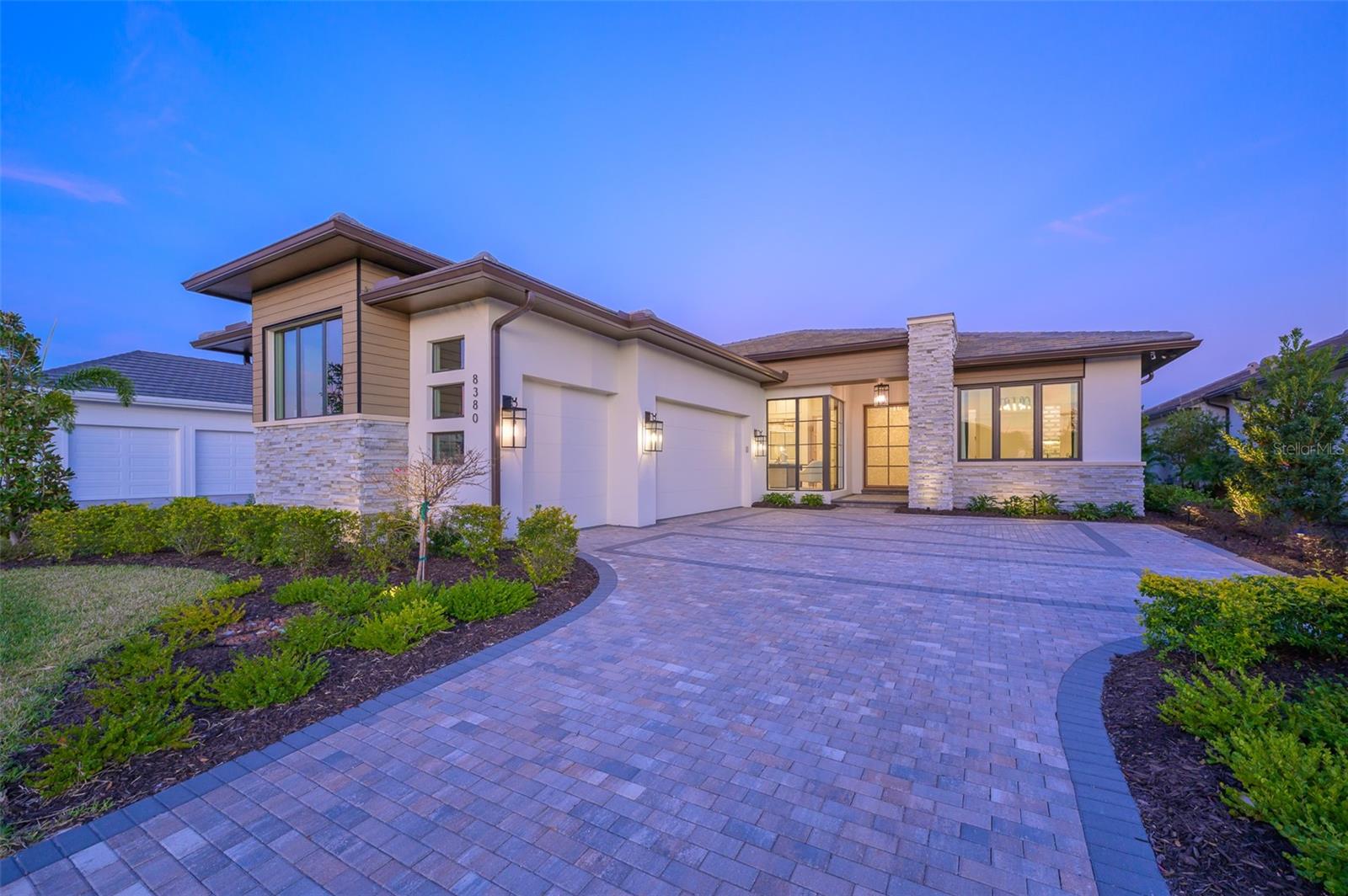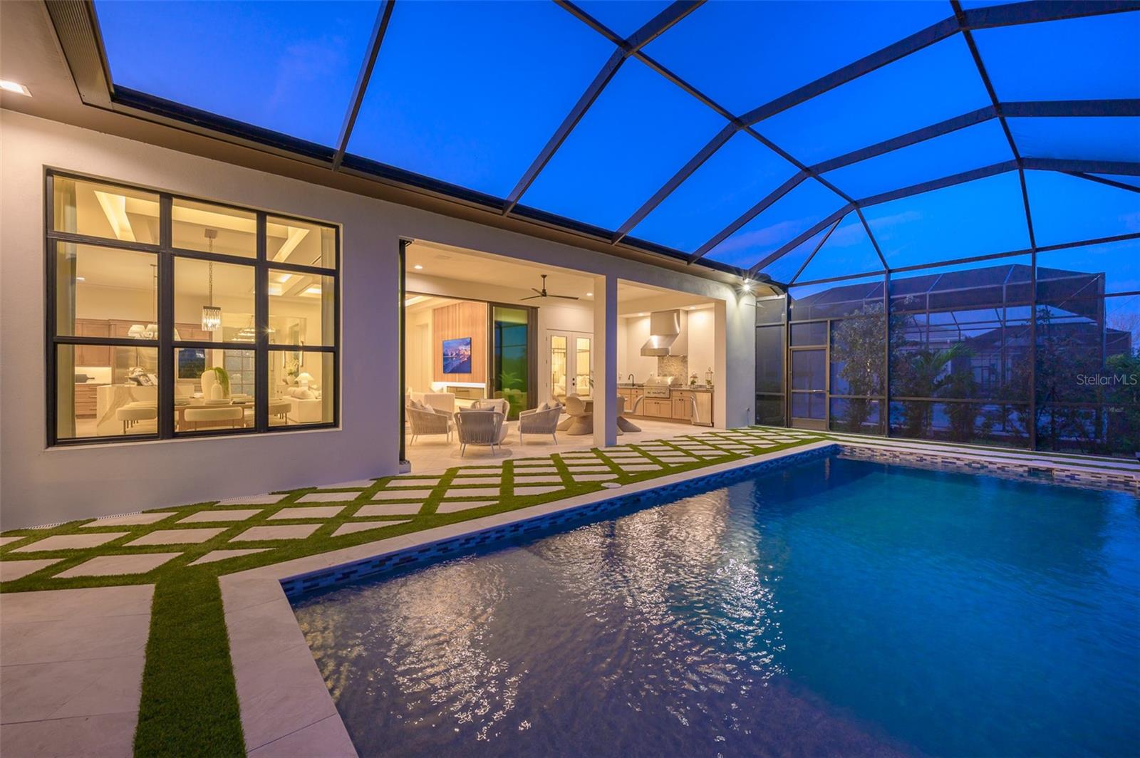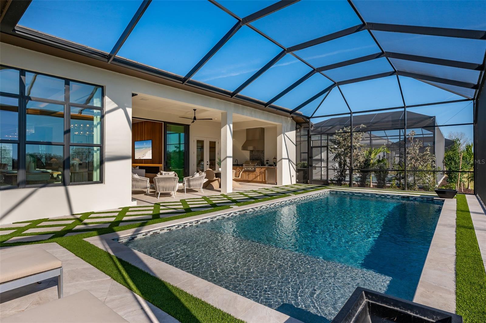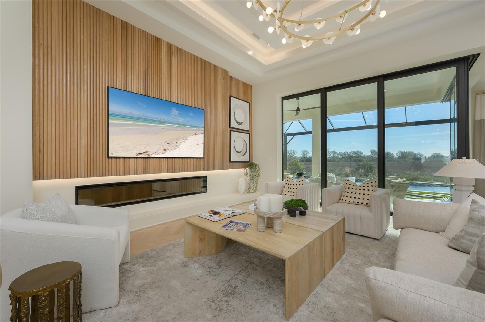 Step into the pinnacle of modern luxury with the Sapphire, an award-winning Lee Wetherington model home, now available for purchase in Wild Blue at Waterside. Recognized as the Best Overall Winner at the 2024 Parade of Homes, this fully furnished showpiece masterfully blends architectural drama, elegant materials and thoughtful functionality throughout its layout. With three bedrooms, an office and a spacious bonus room, every corner of this home has been intentionally designed. The gourmet kitchen features a hidden walk-in pantry, while the breakfast nook is anchored by upgraded corner sliding glass doors that open to the outdoors, bringing in abundant natural light and connecting seamlessly to the outdoor kitchen and travertine pool patio, detailed with a striking crisscross astroturf design. Inside, herringbone wood flooring provides a timeless, elegant foundation throughout the home. The coffered ceilings feature upgraded LED accent lighting, and the built-in gas fireplace adds warmth and ambiance. The office showcases a full-length upgraded corner window, and the laundry room is conveniently connected to the owner’s suite closet, which has been custom built out with boutique-style lighting and cabinetry. Each bedroom offers its en-suite bath and walk-in closet, providing privacy and comfort for residents and guests alike. Additional highlights include an eastern-facing preserve view, ideal for peaceful mornings and wildlife watching, upgraded paver driveway detailing, and designer front elevation accents that elevate the home’s curb appeal. In the sought-after Waterside Village of Lakewood Ranch, Wild Blue offers residents exclusive access to a world-class, resort-style clubhouse with concierge service, a theater, fitness studio, workout classrooms, golf simulator and billiards. The outdoor amenities are equally impressive with a restaurant and patio bar, two resort-style pools, a yoga lawn, putting green, miles of scenic walking trails, and the midway sports complex with eight pickleball courts, six tennis courts, a pro shop, dog park and playground. The list price includes over $200,000 in custom furnishings, electronics, and artwork, as well as more than $300,000 in interior and structural design upgrades, making this a rare turnkey opportunity for those who want a refined, move-in-ready home without the time and effort of building or personalizing from scratch. Schedule your private showing today to experience this exceptional home firsthand. Ready for Immediate Occupancy!