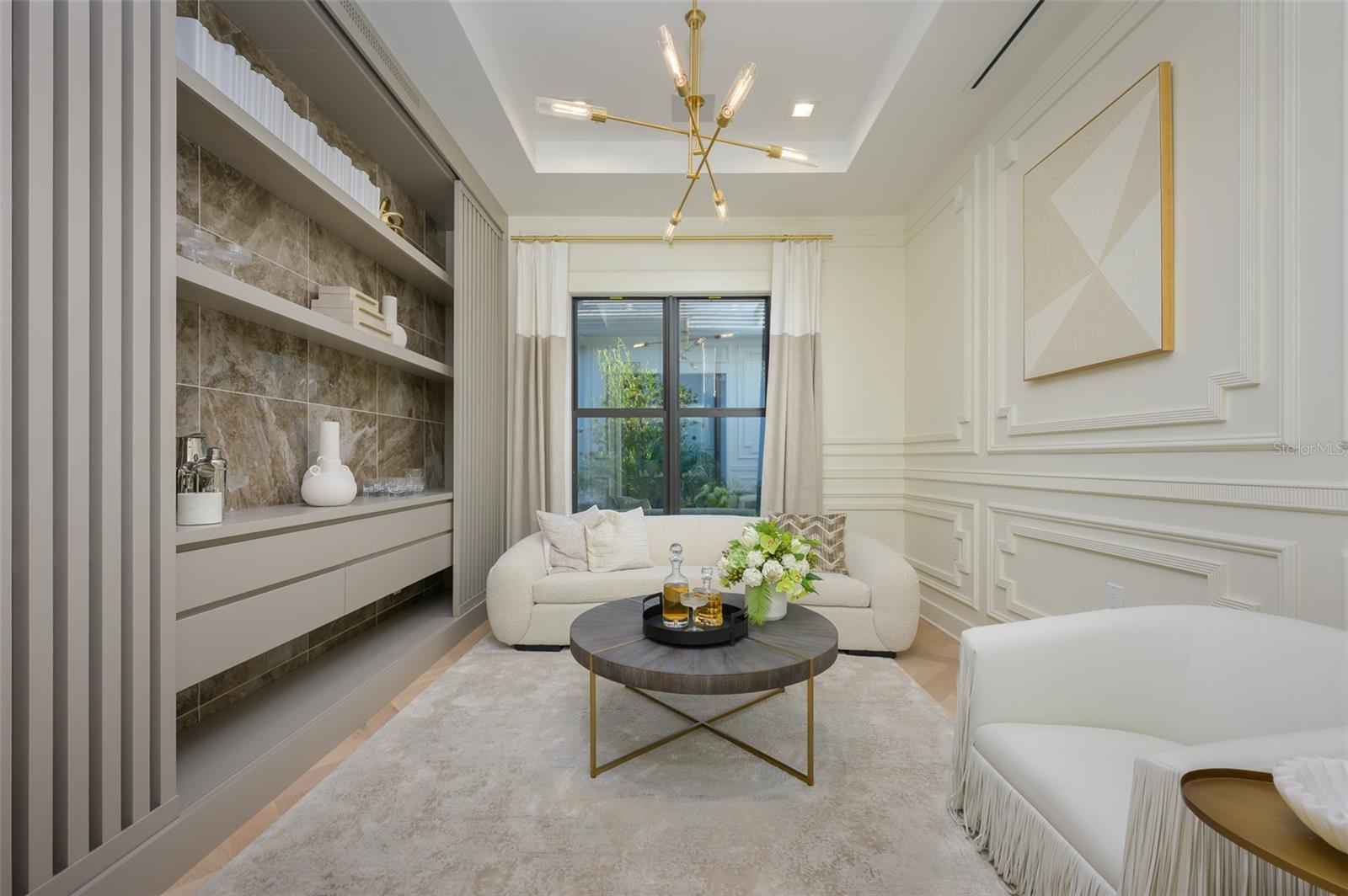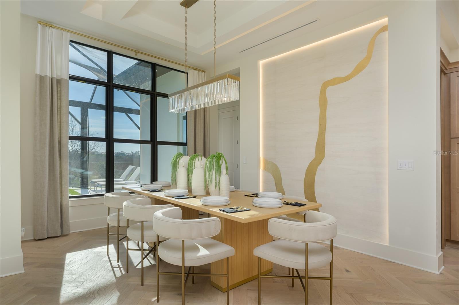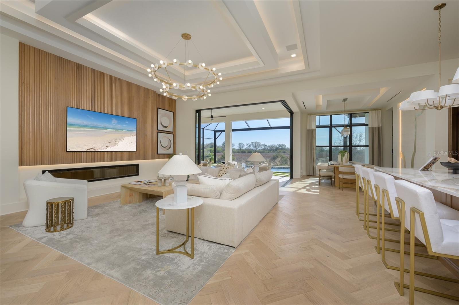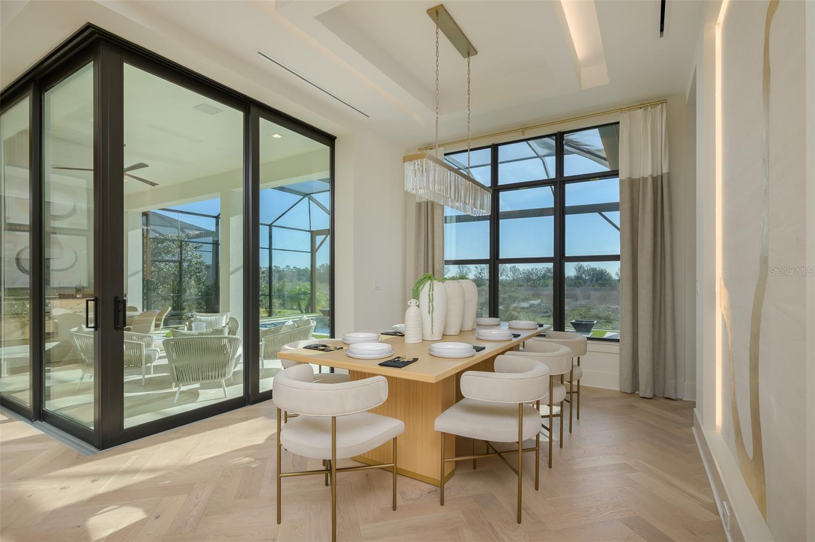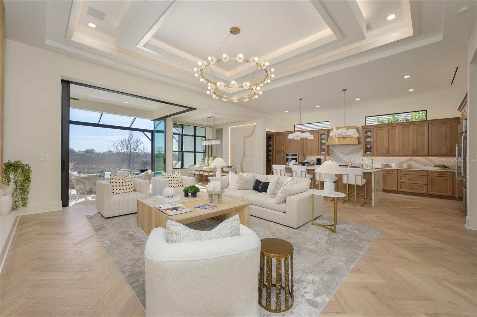 Step into the pinnacle of modern luxury with the Sapphire, an award-winning Lee Wetherington model home, now available for purchase in Wild Blue at Waterside. Recognized as the Best Overall Winner at the 2024 Parade of Homes, this fully furnished showpiece masterfully blends architectural drama, elegant materials and thoughtful functionality throughout its layout. With three bedrooms, an office and a spacious bonus room, every corner of this home has been intentionally designed. The gourmet kitchen features a hidden walk-in pantry, while the breakfast nook is anchored by upgraded corner sliding glass doors that open to the outdoors, bringing in abundant natural light and connecting seamlessly to the outdoor kitchen and travertine pool patio, detailed with a striking crisscross astroturf design. Inside, herringbone wood flooring provides a timeless, elegant foundation throughout the home. The coffered ceilings feature upgraded LED accent lighting, and the built-in gas fireplace adds warmth and ambiance. The office showcases a full-length upgraded corner window, and the laundry room is conveniently connected to the owner’s suite closet, which has been custom built out with boutique-style lighting and cabinetry. Each bedroom offers its en-suite bath and walk-in closet, providing privacy and comfort for residents and guests alike. Additional highlights include an eastern-facing preserve view, ideal for peaceful mornings and wildlife watching, upgraded paver driveway detailing, and designer front elevation accents that elevate the home’s curb appeal. In the sought-after Waterside Village of Lakewood Ranch, Wild Blue offers residents exclusive access to a world-class, resort-style clubhouse with concierge service, a theater, fitness studio, workout classrooms, golf simulator and billiards. The outdoor amenities are equally impressive with a restaurant and patio bar, two resort-style pools, a yoga lawn, putting green, miles of scenic walking trails, and the midway sports complex with eight pickleball courts, six tennis courts, a pro shop, dog park and playground. The list price includes over $200,000 in custom furnishings, electronics, and artwork, as well as more than $300,000 in interior and structural design upgrades, making this a rare turnkey opportunity for those who want a refined, move-in-ready home without the time and effort of building or personalizing from scratch. Schedule your private showing today to experience this exceptional home firsthand. Ready for Immediate Occupancy!