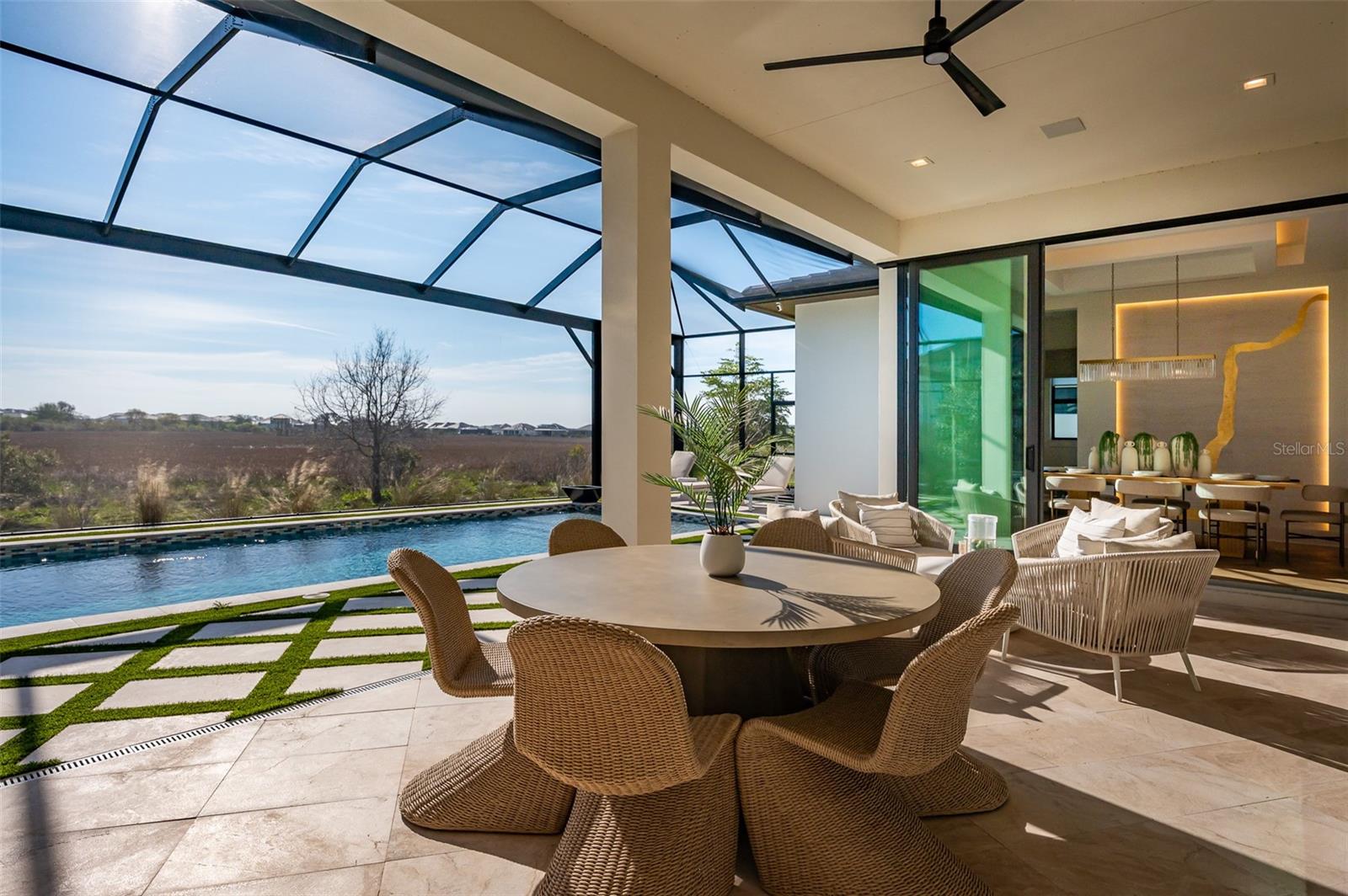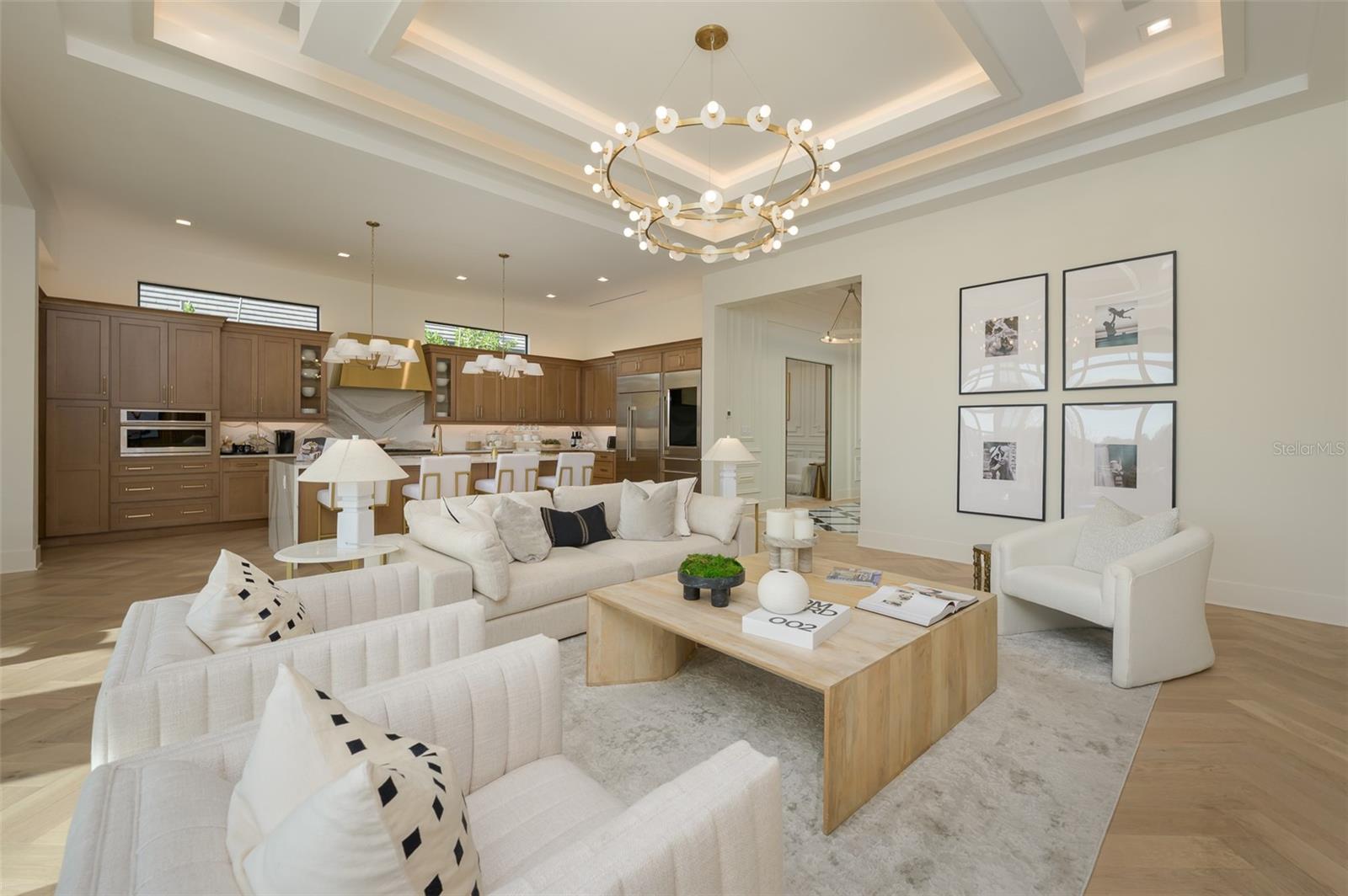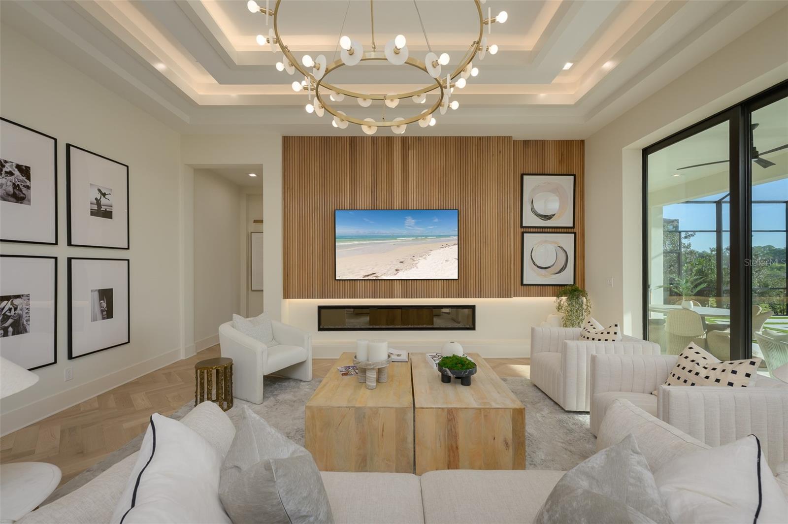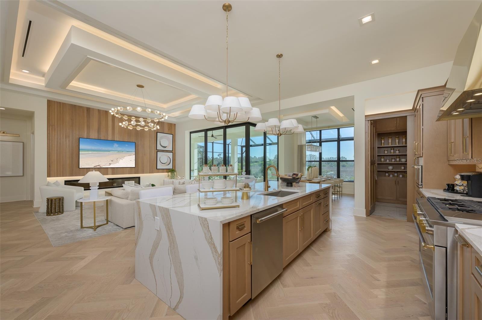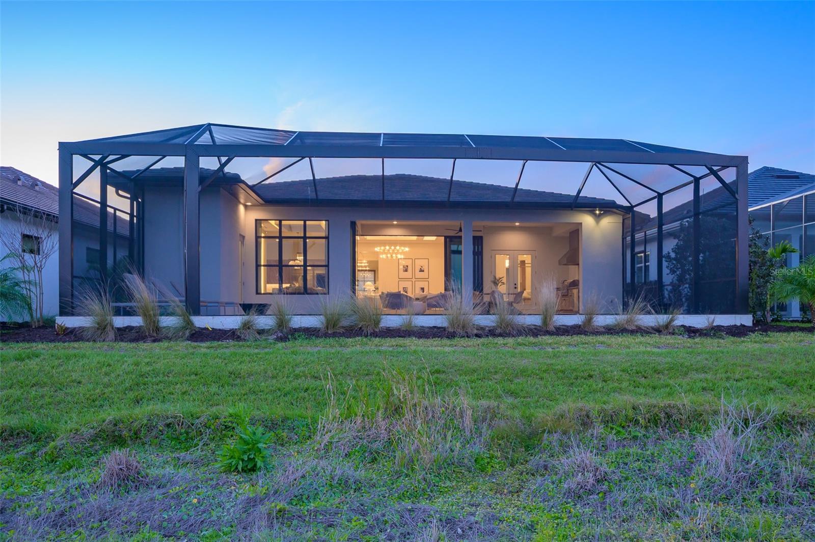 Step into the pinnacle of modern luxury with the Sapphire, an award-winning Lee Wetherington model home, now available for purchase in Wild Blue at Waterside. Recognized as the Best Overall Winner at the 2024 Parade of Homes, this fully furnished showpiece masterfully blends architectural drama, elegant materials and thoughtful functionality throughout its layout. With three bedrooms, an office and a spacious bonus room, every corner of this home has been intentionally designed. The gourmet kitchen features a hidden walk-in pantry, while the breakfast nook is anchored by upgraded corner sliding glass doors that open to the outdoors, bringing in abundant natural light and connecting seamlessly to the outdoor kitchen and travertine pool patio, detailed with a striking crisscross astroturf design. Inside, herringbone wood flooring provides a timeless, elegant foundation throughout the home. The coffered ceilings feature upgraded LED accent lighting, and the built-in gas fireplace adds warmth and ambiance. The office showcases a full-length upgraded corner window, and the laundry room is conveniently connected to the owner’s suite closet, which has been custom built out with boutique-style lighting and cabinetry. Each bedroom offers its en-suite bath and walk-in closet, providing privacy and comfort for residents and guests alike. Additional highlights include an eastern-facing preserve view, ideal for peaceful mornings and wildlife watching, upgraded paver driveway detailing, and designer front elevation accents that elevate the home’s curb appeal. In the sought-after Waterside Village of Lakewood Ranch, Wild Blue offers residents exclusive access to a world-class, resort-style clubhouse with concierge service, a theater, fitness studio, workout classrooms, golf simulator and billiards. The outdoor amenities are equally impressive with a restaurant and patio bar, two resort-style pools, a yoga lawn, putting green, miles of scenic walking trails, and the midway sports complex with eight pickleball courts, six tennis courts, a pro shop, dog park and playground. The list price includes over $200,000 in custom furnishings, electronics, and artwork, as well as more than $300,000 in interior and structural design upgrades, making this a rare turnkey opportunity for those who want a refined, move-in-ready home without the time and effort of building or personalizing from scratch. Schedule your private showing today to experience this exceptional home firsthand. Ready for Immediate Occupancy!