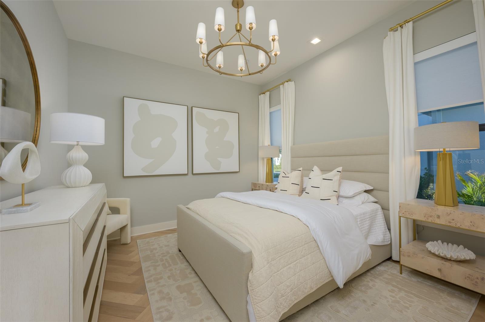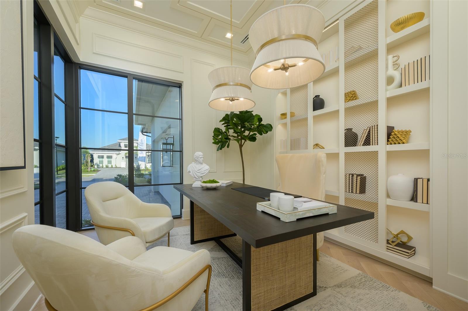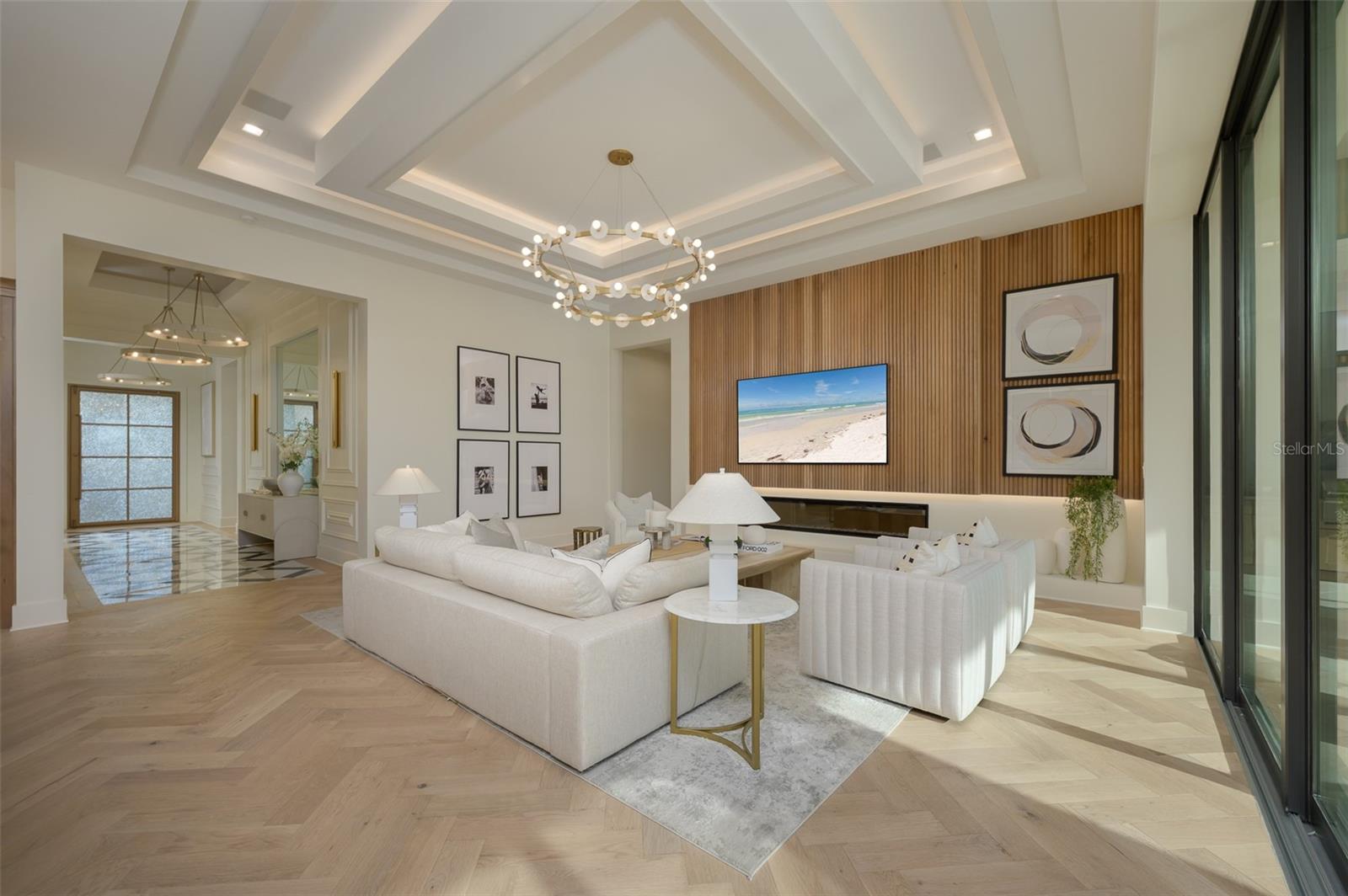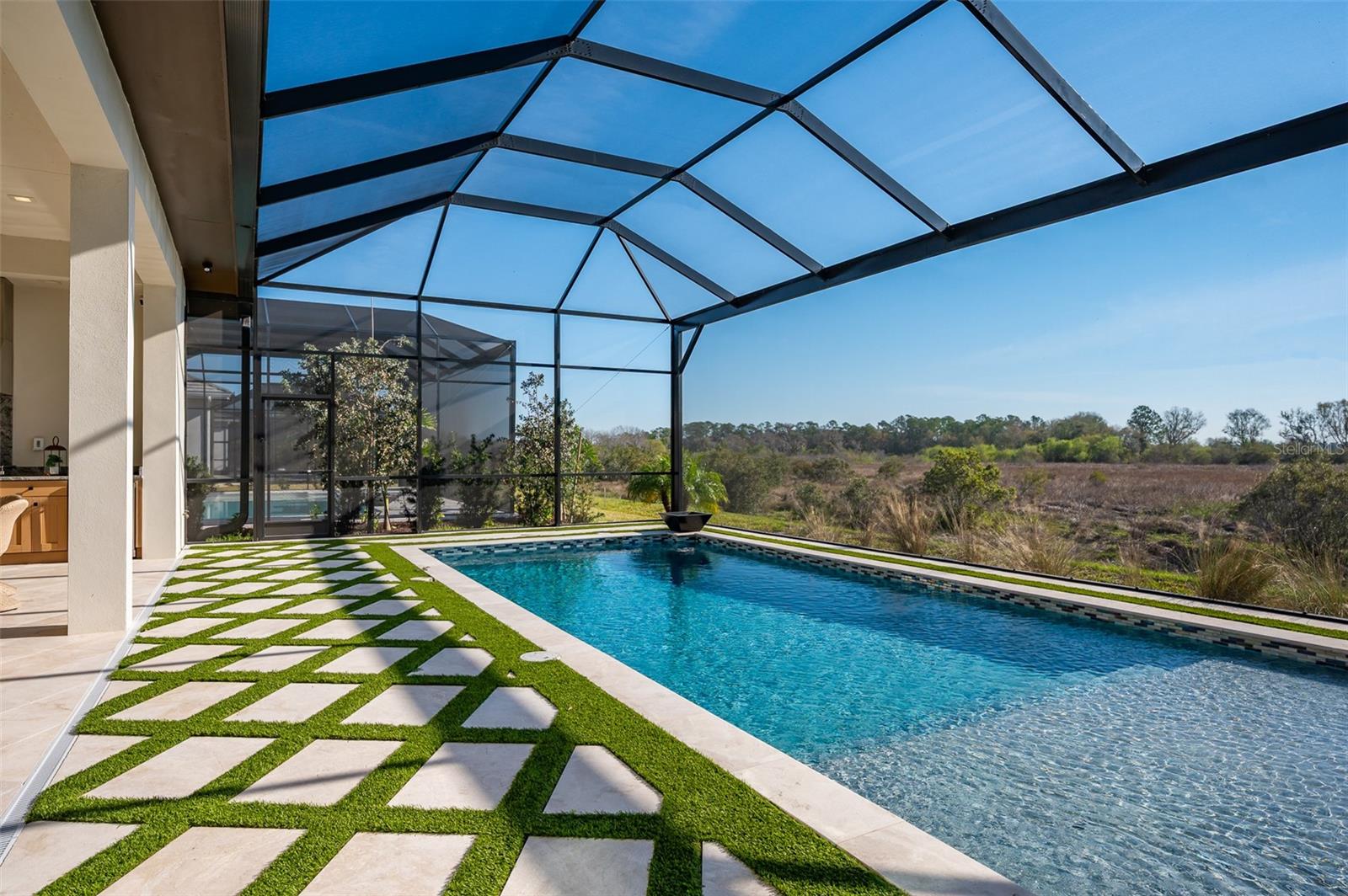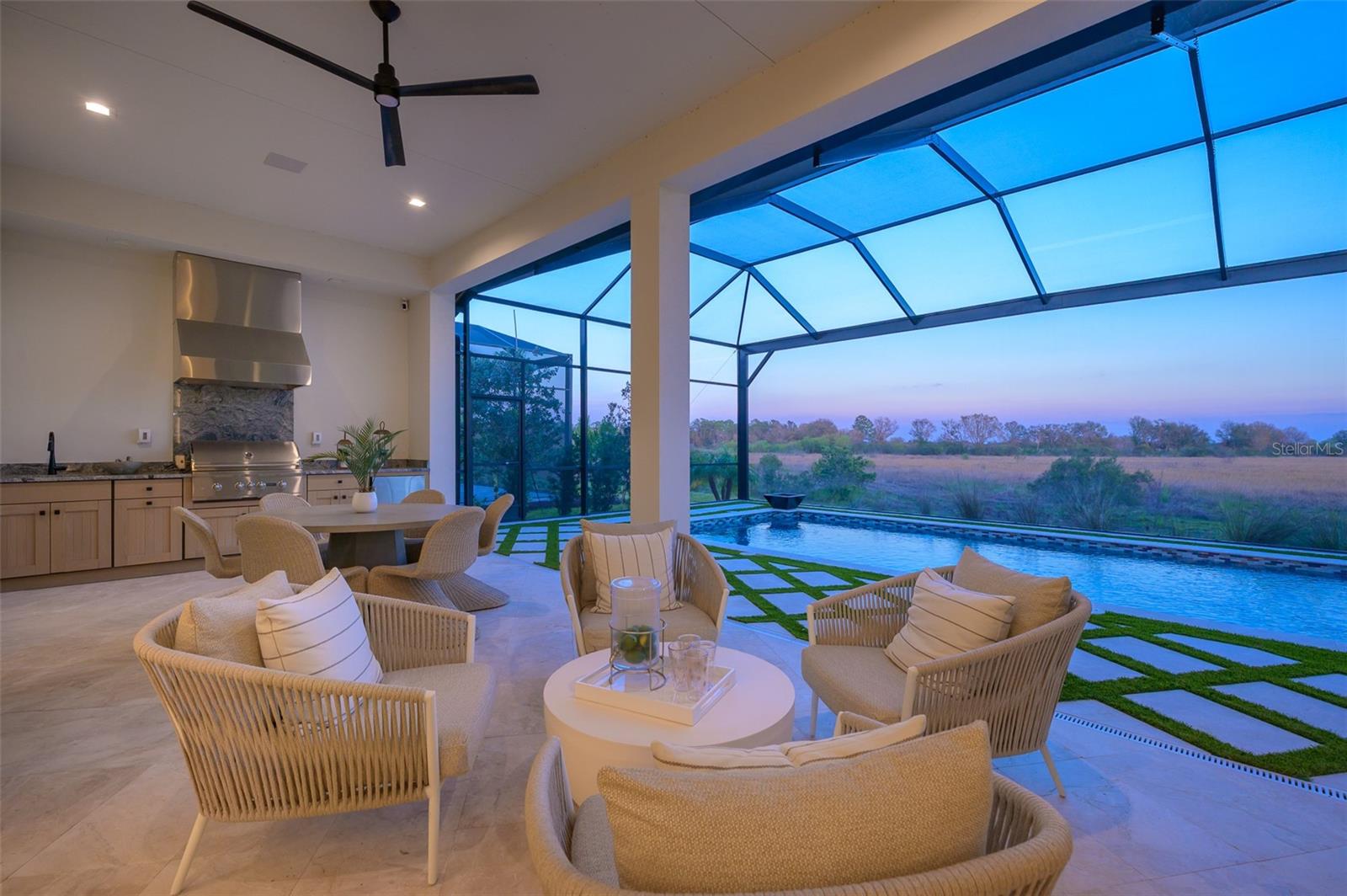 Step into the pinnacle of modern luxury with the Sapphire, an award-winning Lee Wetherington model home, now available for purchase in Wild Blue at Waterside. Recognized as the Best Overall Winner at the 2024 Parade of Homes, this fully furnished showpiece masterfully blends architectural drama, elegant materials and thoughtful functionality throughout its layout. With three bedrooms, an office and a spacious bonus room, every corner of this home has been intentionally designed. The gourmet kitchen features a hidden walk-in pantry, while the breakfast nook is anchored by upgraded corner sliding glass doors that open to the outdoors, bringing in abundant natural light and connecting seamlessly to the outdoor kitchen and travertine pool patio, detailed with a striking crisscross astroturf design. Inside, herringbone wood flooring provides a timeless, elegant foundation throughout the home. The coffered ceilings feature upgraded LED accent lighting, and the built-in gas fireplace adds warmth and ambiance. The office showcases a full-length upgraded corner window, and the laundry room is conveniently connected to the owner’s suite closet, which has been custom built out with boutique-style lighting and cabinetry. Each bedroom offers its en-suite bath and walk-in closet, providing privacy and comfort for residents and guests alike. Additional highlights include an eastern-facing preserve view, ideal for peaceful mornings and wildlife watching, upgraded paver driveway detailing, and designer front elevation accents that elevate the home’s curb appeal. In the sought-after Waterside Village of Lakewood Ranch, Wild Blue offers residents exclusive access to a world-class, resort-style clubhouse with concierge service, a theater, fitness studio, workout classrooms, golf simulator and billiards. The outdoor amenities are equally impressive with a restaurant and patio bar, two resort-style pools, a yoga lawn, putting green, miles of scenic walking trails, and the midway sports complex with eight pickleball courts, six tennis courts, a pro shop, dog park and playground. The list price includes over $200,000 in custom furnishings, electronics, and artwork, as well as more than $300,000 in interior and structural design upgrades, making this a rare turnkey opportunity for those who want a refined, move-in-ready home without the time and effort of building or personalizing from scratch. Schedule your private showing today to experience this exceptional home firsthand. Ready for Immediate Occupancy!