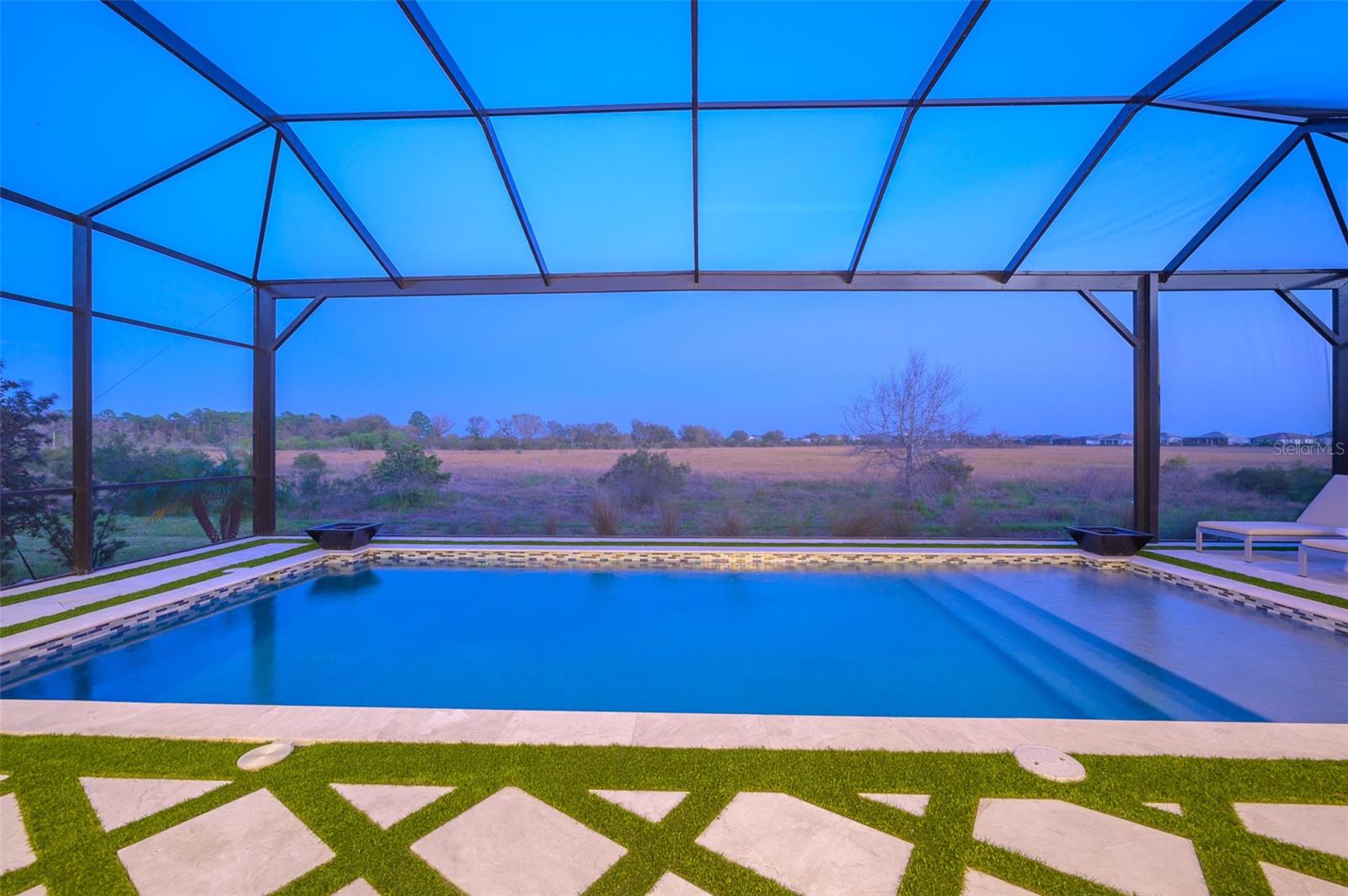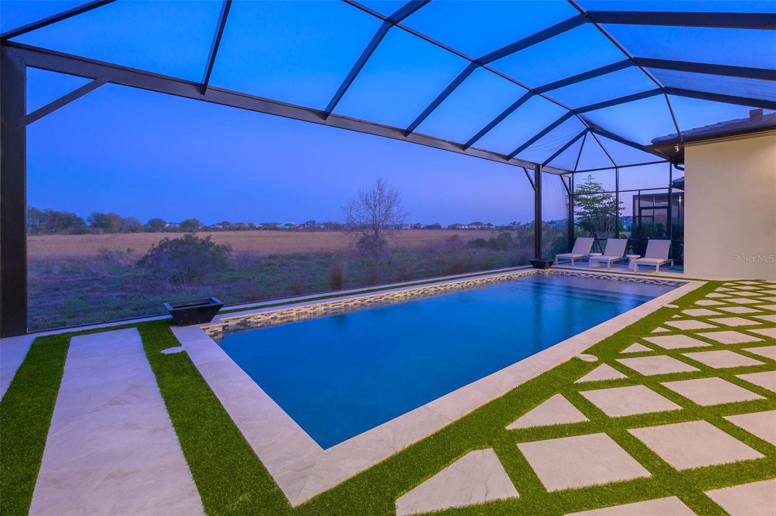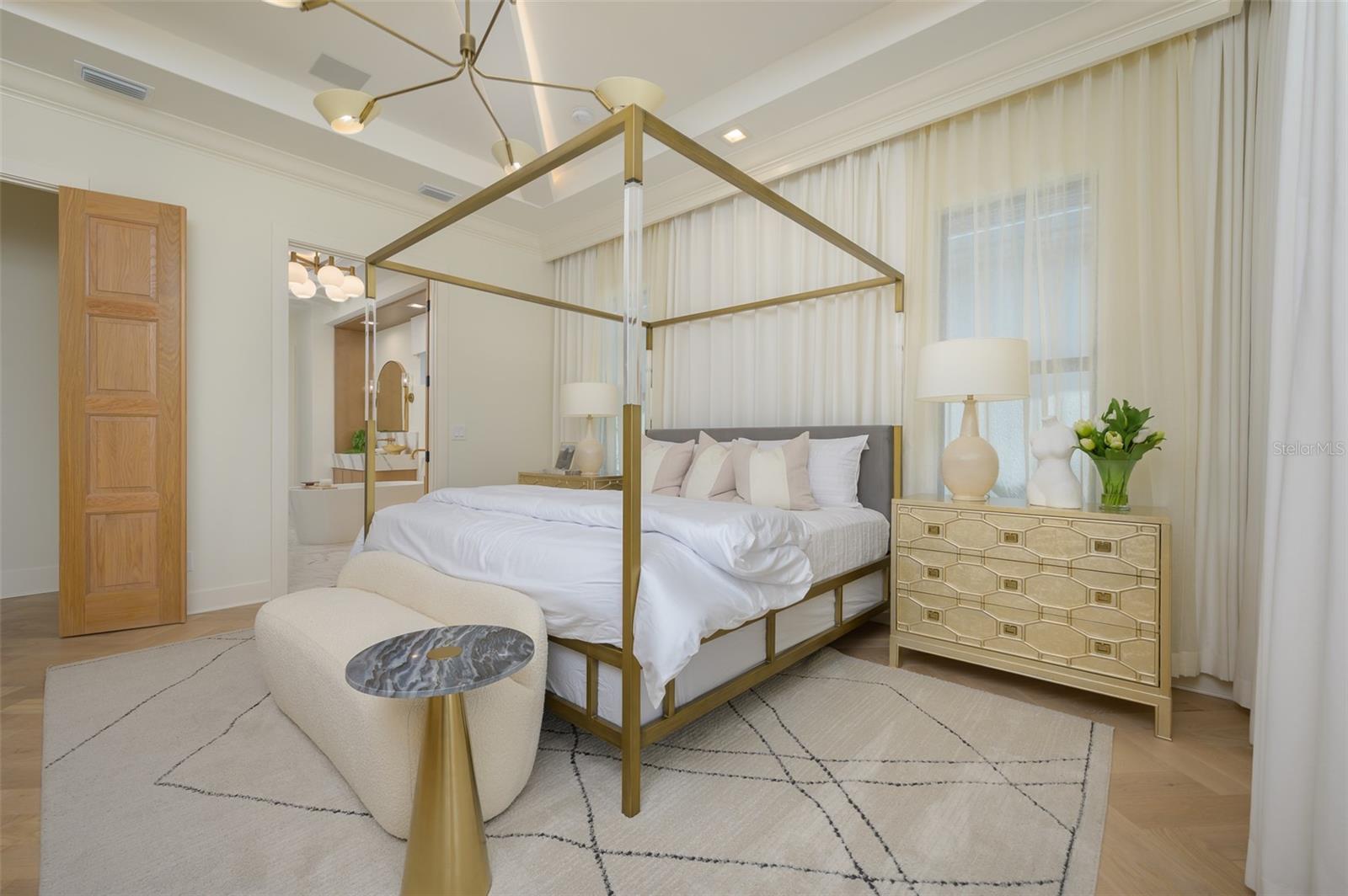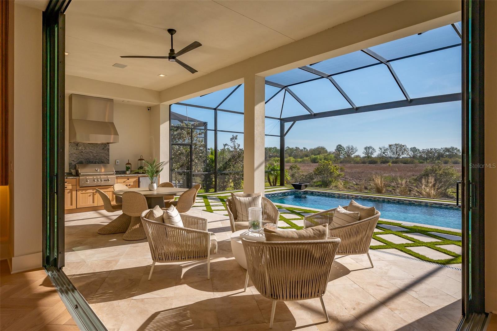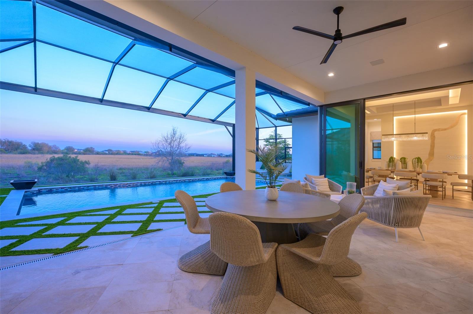 Step into the pinnacle of modern luxury with the Sapphire, an award-winning Lee Wetherington model home, now available for purchase in Wild Blue at Waterside. Recognized as the Best Overall Winner at the 2024 Parade of Homes, this fully furnished showpiece masterfully blends architectural drama, elegant materials and thoughtful functionality throughout its layout. With three bedrooms, an office and a spacious bonus room, every corner of this home has been intentionally designed. The gourmet kitchen features a hidden walk-in pantry, while the breakfast nook is anchored by upgraded corner sliding glass doors that open to the outdoors, bringing in abundant natural light and connecting seamlessly to the outdoor kitchen and travertine pool patio, detailed with a striking crisscross astroturf design. Inside, herringbone wood flooring provides a timeless, elegant foundation throughout the home. The coffered ceilings feature upgraded LED accent lighting, and the built-in gas fireplace adds warmth and ambiance. The office showcases a full-length upgraded corner window, and the laundry room is conveniently connected to the owner’s suite closet, which has been custom built out with boutique-style lighting and cabinetry. Each bedroom offers its en-suite bath and walk-in closet, providing privacy and comfort for residents and guests alike. Additional highlights include an eastern-facing preserve view, ideal for peaceful mornings and wildlife watching, upgraded paver driveway detailing, and designer front elevation accents that elevate the home’s curb appeal. In the sought-after Waterside Village of Lakewood Ranch, Wild Blue offers residents exclusive access to a world-class, resort-style clubhouse with concierge service, a theater, fitness studio, workout classrooms, golf simulator and billiards. The outdoor amenities are equally impressive with a restaurant and patio bar, two resort-style pools, a yoga lawn, putting green, miles of scenic walking trails, and the midway sports complex with eight pickleball courts, six tennis courts, a pro shop, dog park and playground. The list price includes over $200,000 in custom furnishings, electronics, and artwork, as well as more than $300,000 in interior and structural design upgrades, making this a rare turnkey opportunity for those who want a refined, move-in-ready home without the time and effort of building or personalizing from scratch. Schedule your private showing today to experience this exceptional home firsthand. Ready for Immediate Occupancy!
