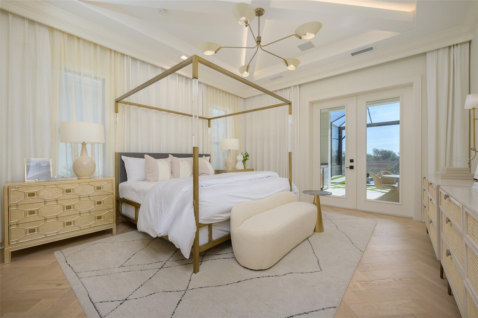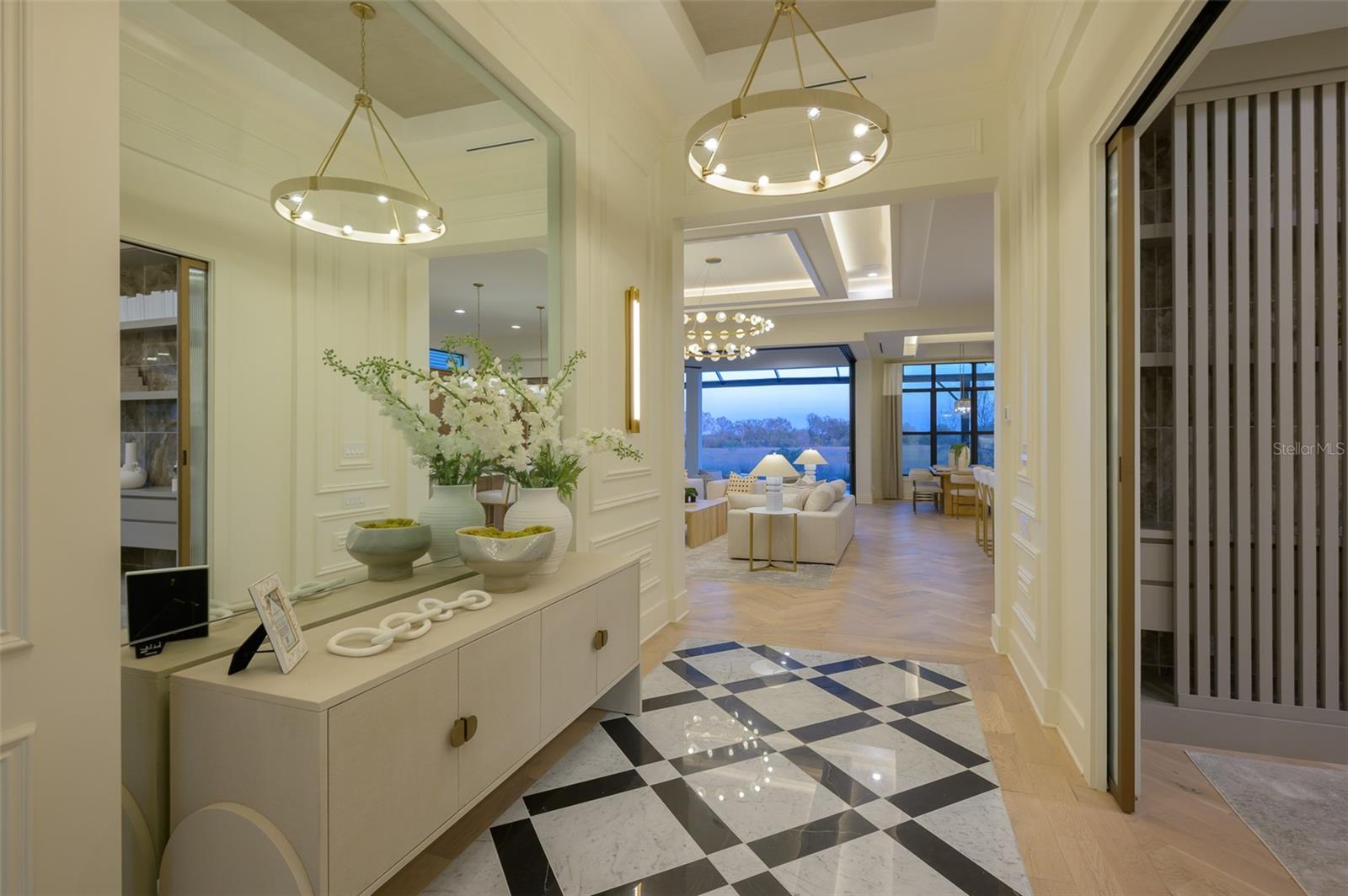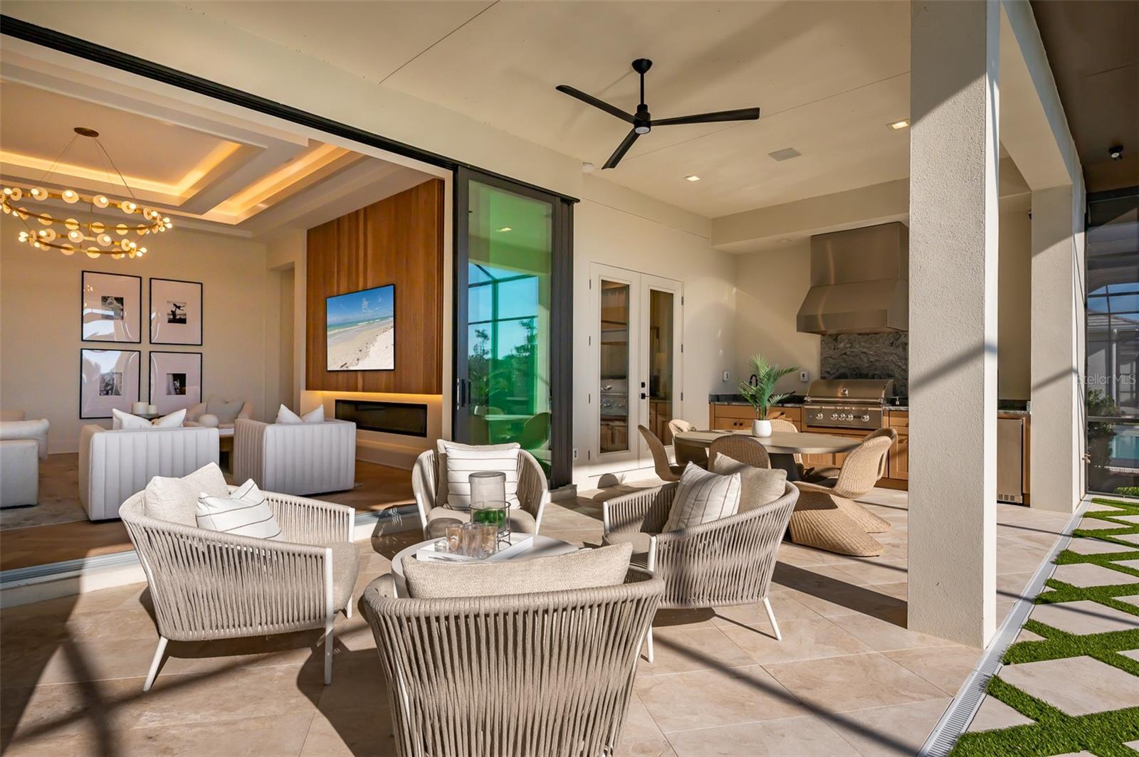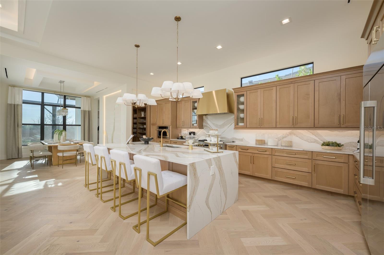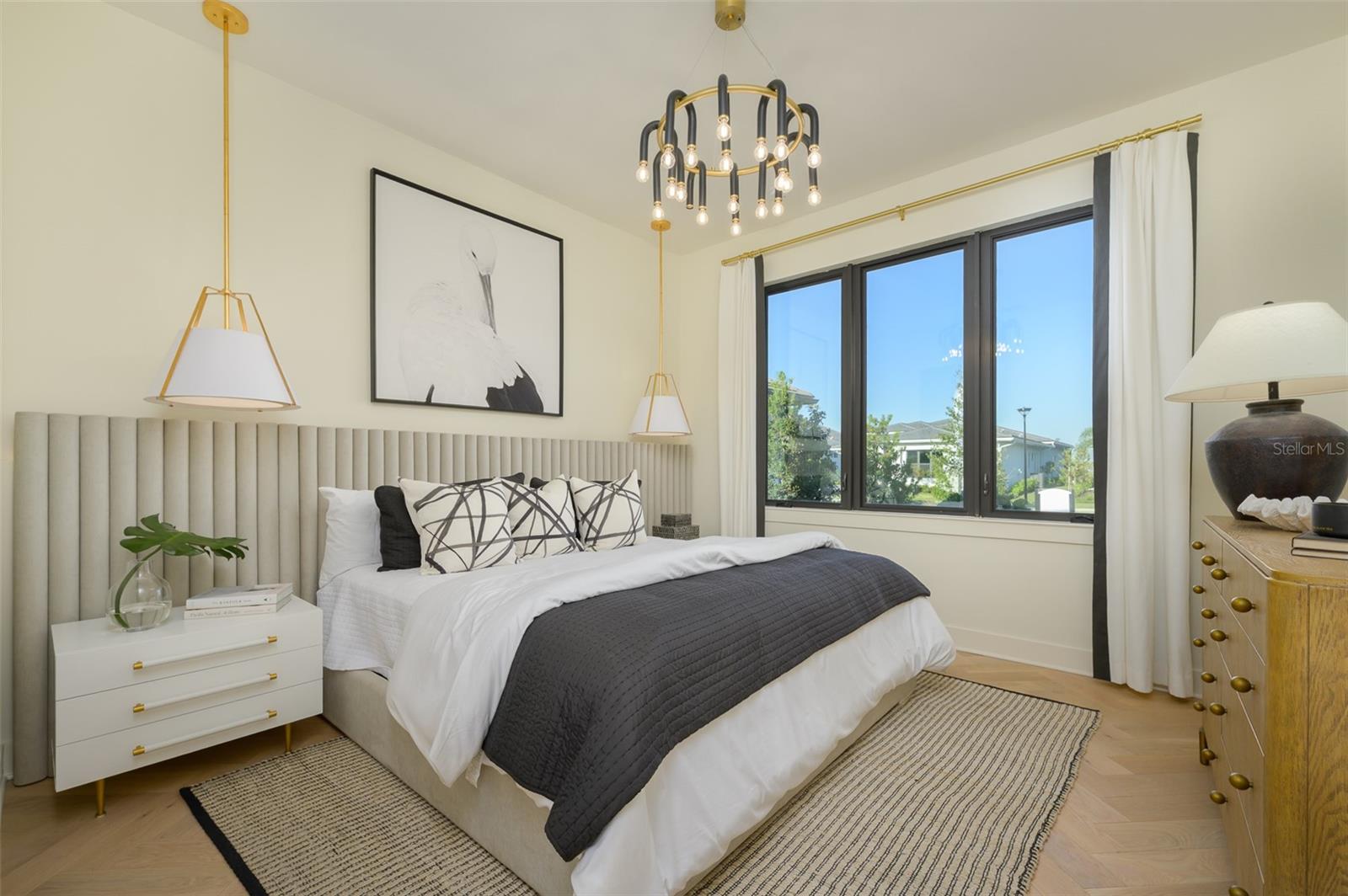 Step into the pinnacle of modern luxury with the Sapphire, an award-winning Lee Wetherington model home, now available for purchase in Wild Blue at Waterside. Recognized as the Best Overall Winner at the 2024 Parade of Homes, this fully furnished showpiece masterfully blends architectural drama, elegant materials and thoughtful functionality throughout its layout. With three bedrooms, an office and a spacious bonus room, every corner of this home has been intentionally designed. The gourmet kitchen features a hidden walk-in pantry, while the breakfast nook is anchored by upgraded corner sliding glass doors that open to the outdoors, bringing in abundant natural light and connecting seamlessly to the outdoor kitchen and travertine pool patio, detailed with a striking crisscross astroturf design. Inside, herringbone wood flooring provides a timeless, elegant foundation throughout the home. The coffered ceilings feature upgraded LED accent lighting, and the built-in gas fireplace adds warmth and ambiance. The office showcases a full-length upgraded corner window, and the laundry room is conveniently connected to the owner’s suite closet, which has been custom built out with boutique-style lighting and cabinetry. Each bedroom offers its en-suite bath and walk-in closet, providing privacy and comfort for residents and guests alike. Additional highlights include an eastern-facing preserve view, ideal for peaceful mornings and wildlife watching, upgraded paver driveway detailing, and designer front elevation accents that elevate the home’s curb appeal. In the sought-after Waterside Village of Lakewood Ranch, Wild Blue offers residents exclusive access to a world-class, resort-style clubhouse with concierge service, a theater, fitness studio, workout classrooms, golf simulator and billiards. The outdoor amenities are equally impressive with a restaurant and patio bar, two resort-style pools, a yoga lawn, putting green, miles of scenic walking trails, and the midway sports complex with eight pickleball courts, six tennis courts, a pro shop, dog park and playground. The list price includes over $200,000 in custom furnishings, electronics, and artwork, as well as more than $300,000 in interior and structural design upgrades, making this a rare turnkey opportunity for those who want a refined, move-in-ready home without the time and effort of building or personalizing from scratch. Schedule your private showing today to experience this exceptional home firsthand. Ready for Immediate Occupancy!