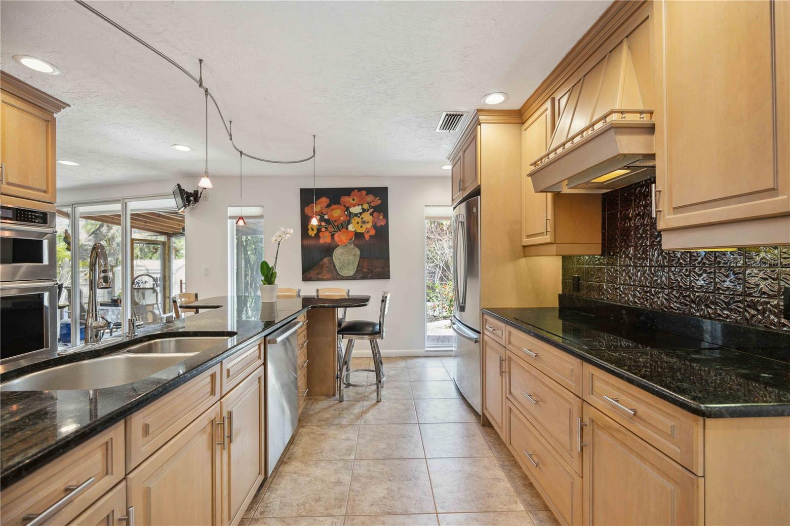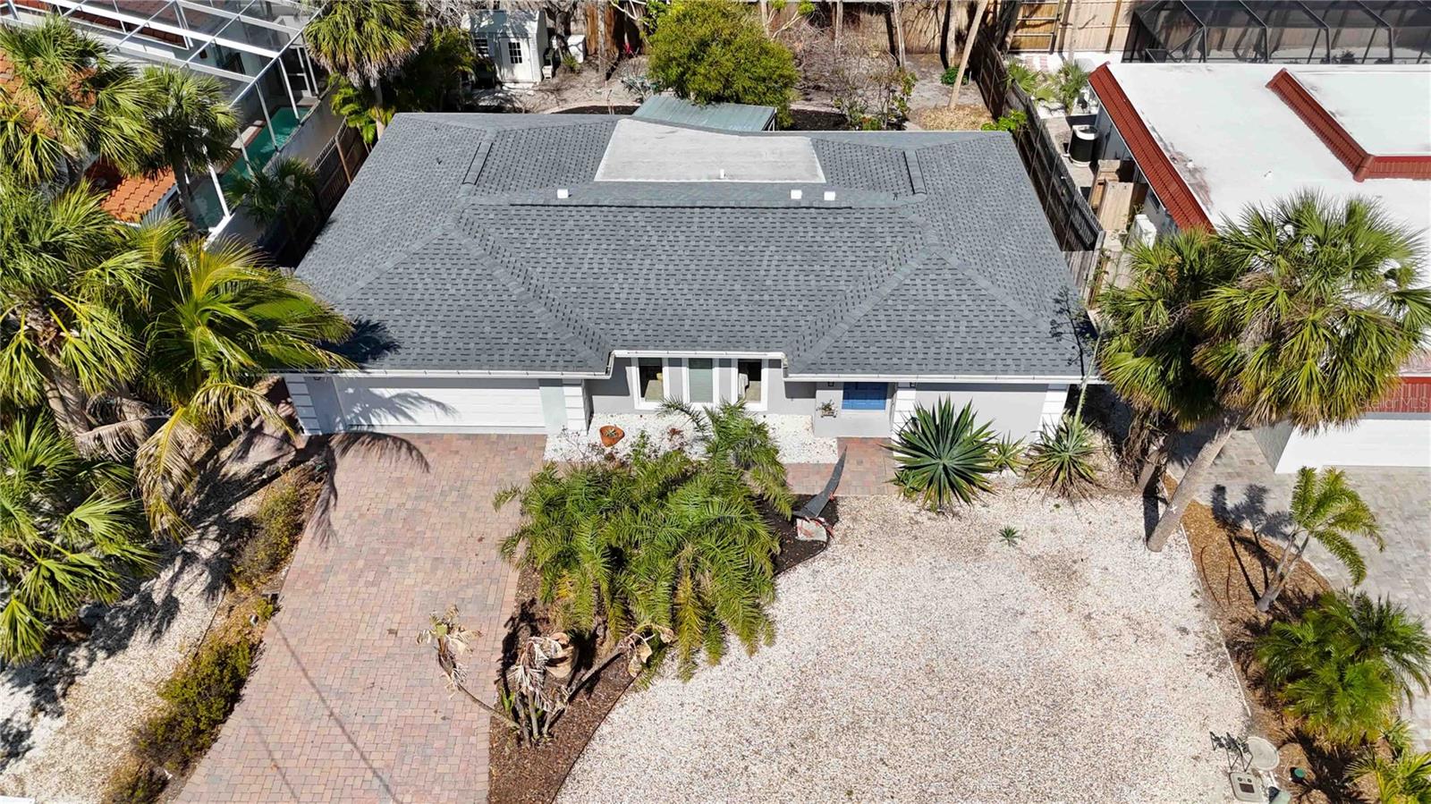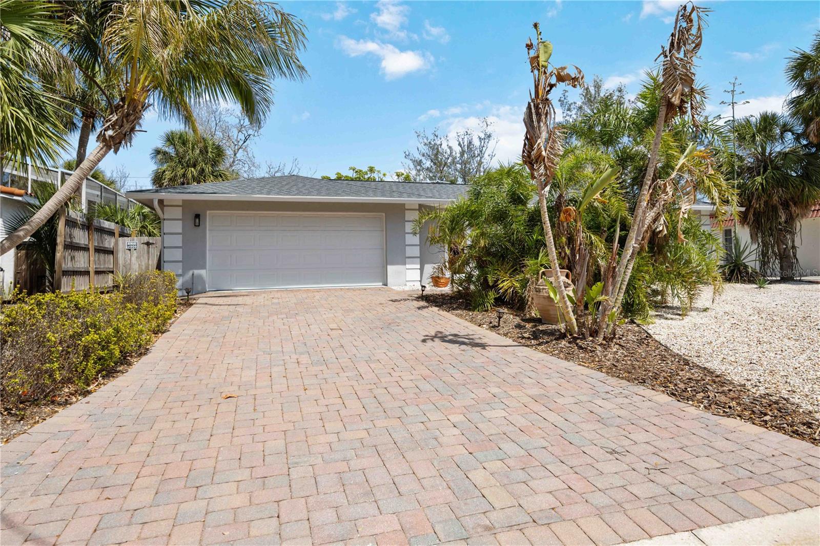 Located in the heart of Siesta Key, this three-bedroom, two-bath home with a two-car garage offers a rare opportunity to experience island living just one mile from Siesta Key Beach—consistently ranked the #1 beach in the United States for its white quartz sand, turquoise waters, and year-round appeal. This property is perched on an elevated lot that has never experienced flooding. Recent updates in 2025 include a new roof, fresh landscaping, exterior lighting, and updated exterior paint, enhancing both aesthetics and durability. Inside, the home is designed for comfort and functionality. The living room is bright and open, with large windows to bring in natural light. The kitchen offers a well-planned layout with an oversized island, wood cabinetry, stainless steel appliances, wall oven (2025), and granite countertops—creating a versatile space for cooking, dining, and entertaining. The dining room overlooks a screened-in lanai and a landscaped backyard, through three large sliding glass doors creating a seamless indoor-outdoor flow. The primary suite includes tall windows overlooking the serene backyard, a spacious walk-in closet, an en-suite bath with dual sinks, and backyard views. A split floor plan provides privacy, with two additional bedrooms connected by a Jack-and-Jill bathroom. Additional features include a spacious dedicated laundry room, a two-car garage, a reverse osmosis filtration system(2018), water heater(2023), A/C system (2019), perma-lined pipes(2020), gutters, a shed, and fenced yard. The backyard is a peaceful retreat, with a winding paver path through the garden, multiple seating areas, fountains, and an outdoor shower—an ideal space for relaxation after a day at the beach. Siesta Key offers an active and vibrant lifestyle, with several public beach accesses, nearby pickleball and tennis courts, parks, playgrounds, and sports fields. Top-rated restaurants, boutique shopping, entertainment, and luxury spas are just minutes away. This move-in-ready home is an invitation to embrace the best of Siesta Key. Schedule your private showing and receive additional information today.
