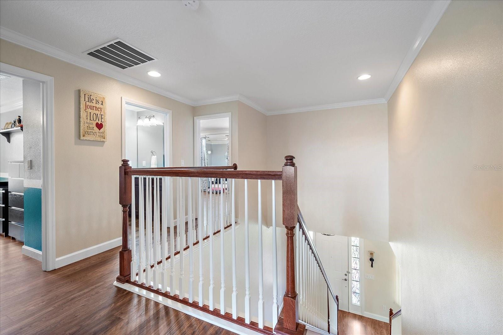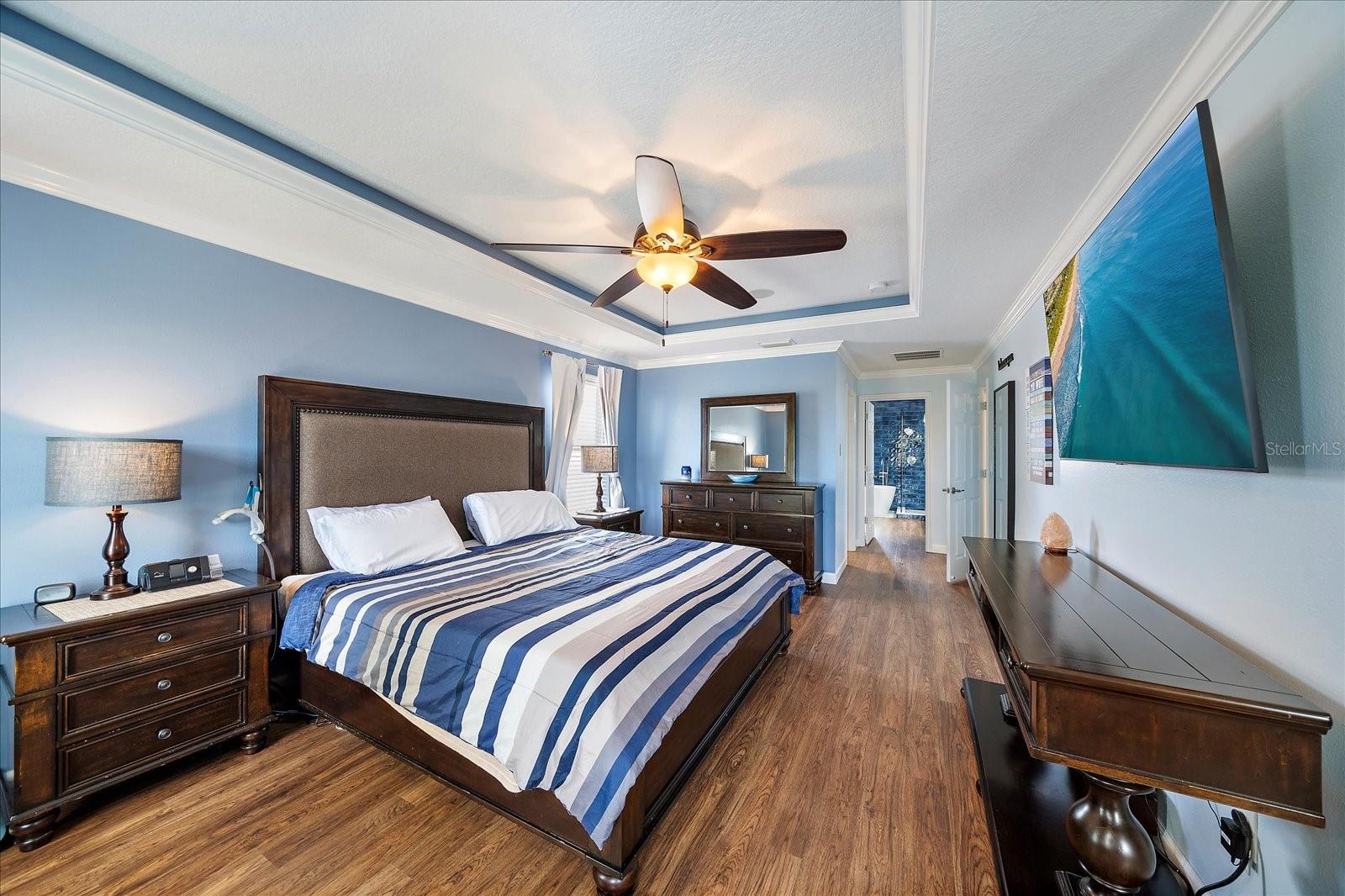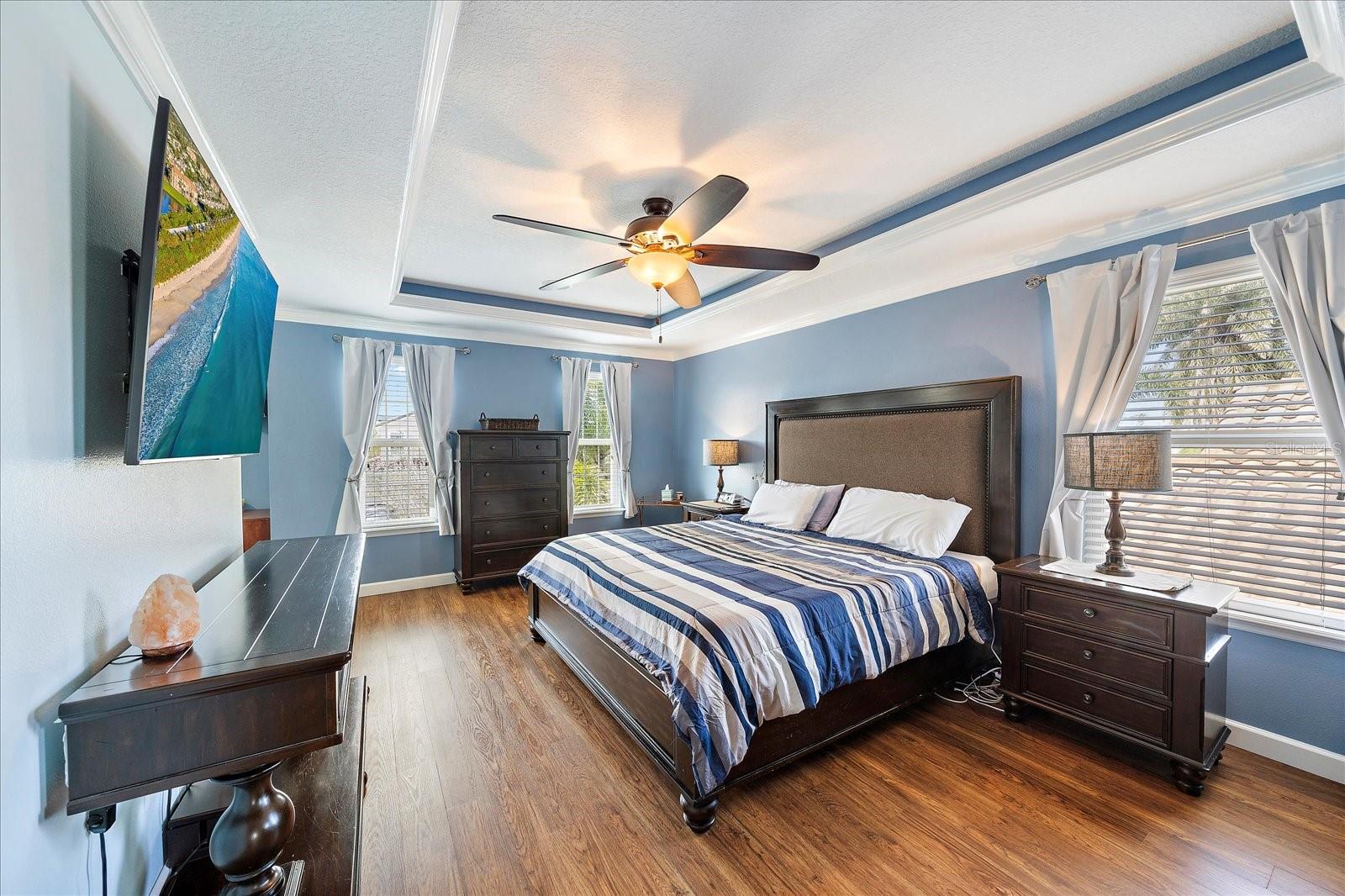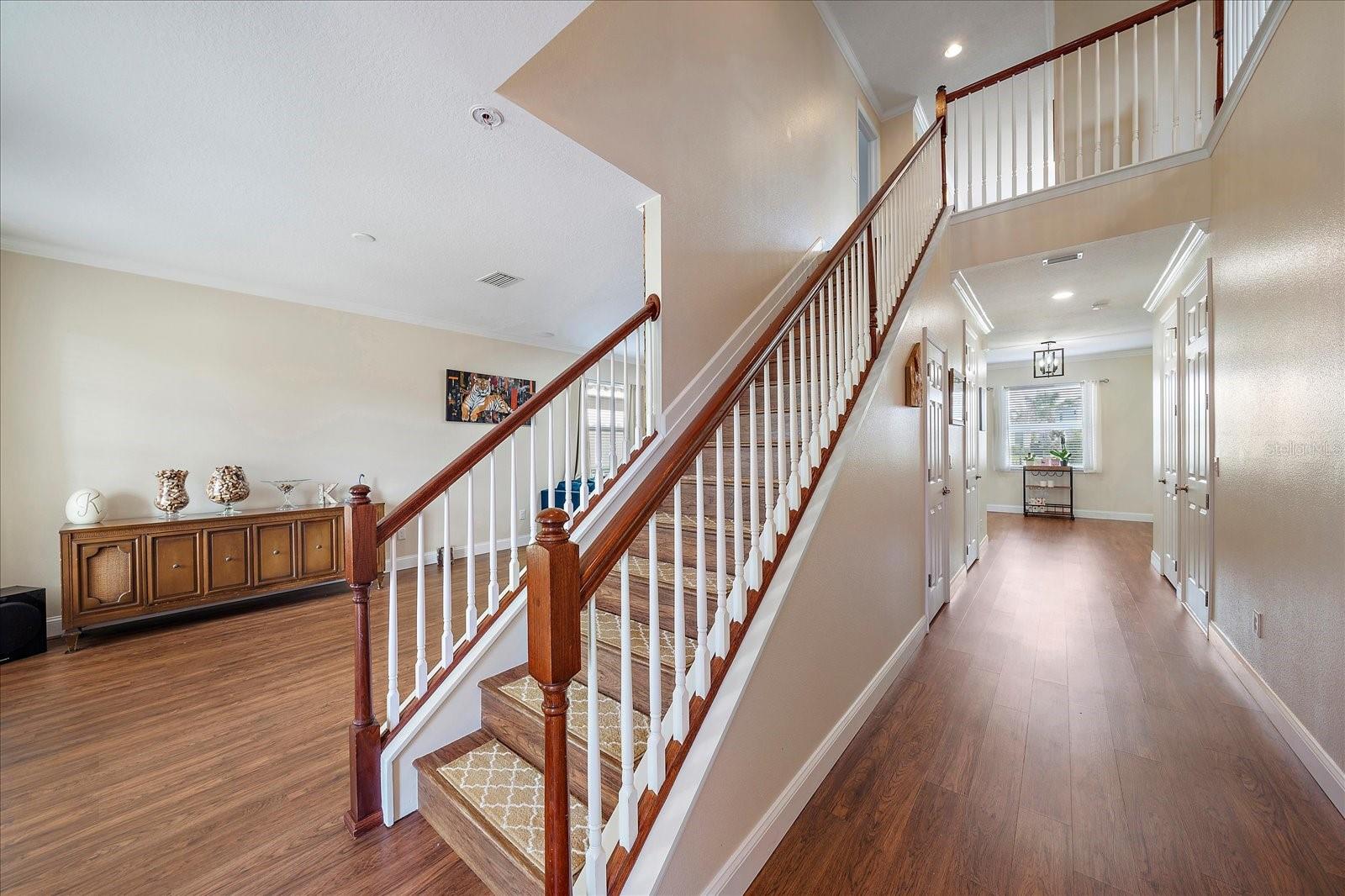 *IMPRESSIVE MOVE-IN READY LAKEVIEW HOME* Meticulously maintained 2 story home, 4 bedrooms, 2.5 bathrooms with tons of upgrades throughout the home. The High Ceilings open staircase gives a very open feeling. Luxury Vinyl floors throughout, crown molding accents most rooms, large baseboards, custom closets with built-in speaker system, and custom lighting are just a few of the upgrades. New AC installed August 2025. As you enter the home you will notice the Gorgeous hand crafted wood feature wall in your family gathering area. The chef’s kitchen is sure to impress with designer tile up to the ceiling. Stainless steel appliances. Granite countertops. Also has a R/O system and water softener. The dining area will accommodate a large table. The primary bedroom has a large walk in closet and a sitting area to unwind at the end of the day. Or step into your spa-like bathroom and soak away in your soaking tub. The beautiful tile and vibe will surely relax you. Along with the primary bedroom, you will find 3 more bedrooms with a full bath. And a bonus flex room! Laundry is also located on the second floor. Step outside in the fully fenced in back yard to enjoy an afternoon cocktail on the covered lanai or the extended paver area that is equipped with a relaxing spa. The garage has tons of storage that the seller can leave as well as 6 of the TVs in the home. The portable generator is included in the purchase. The kitchen table can be sold on a separate contract. This home is located close to shopping, hospitals and schools.