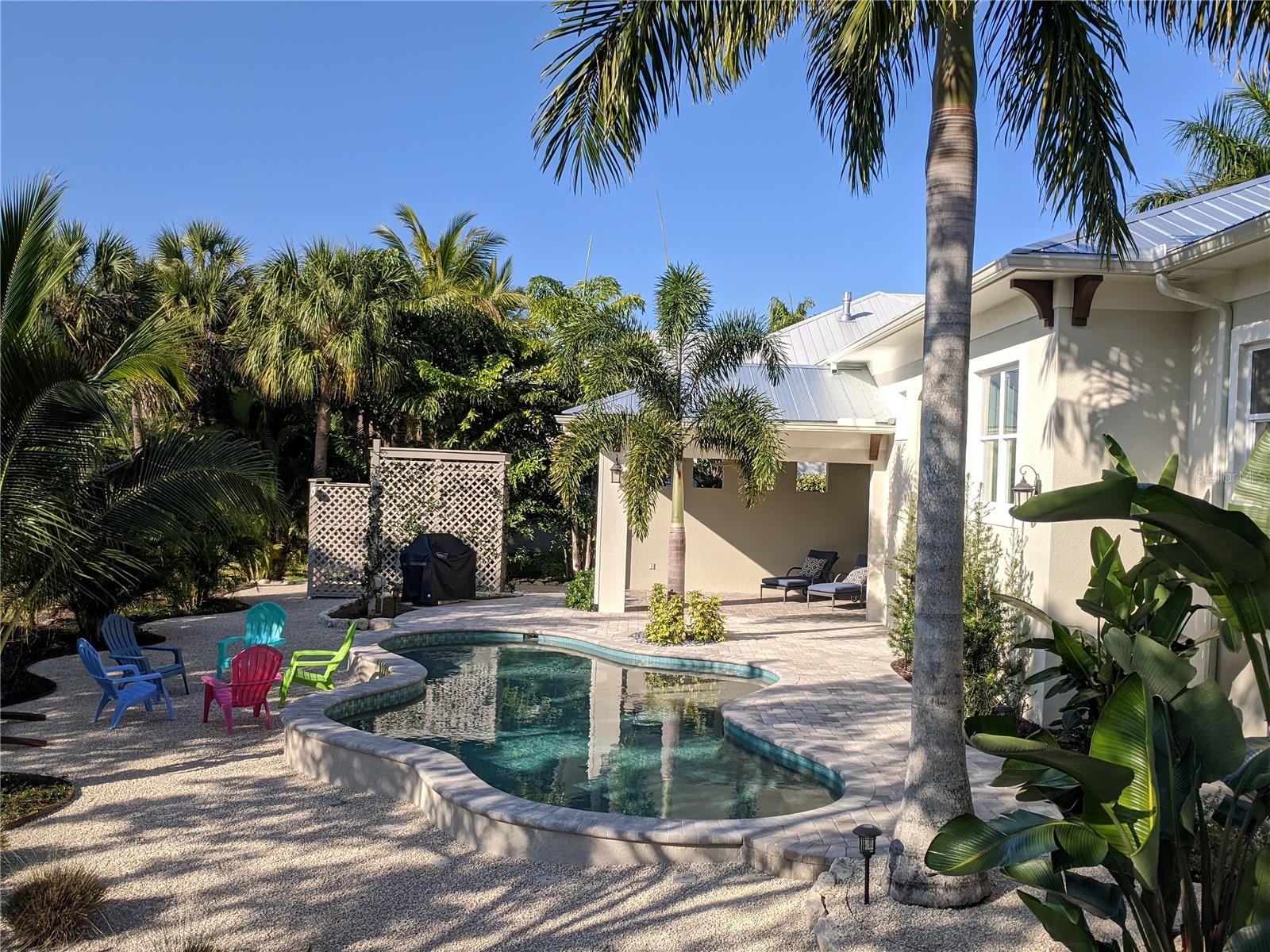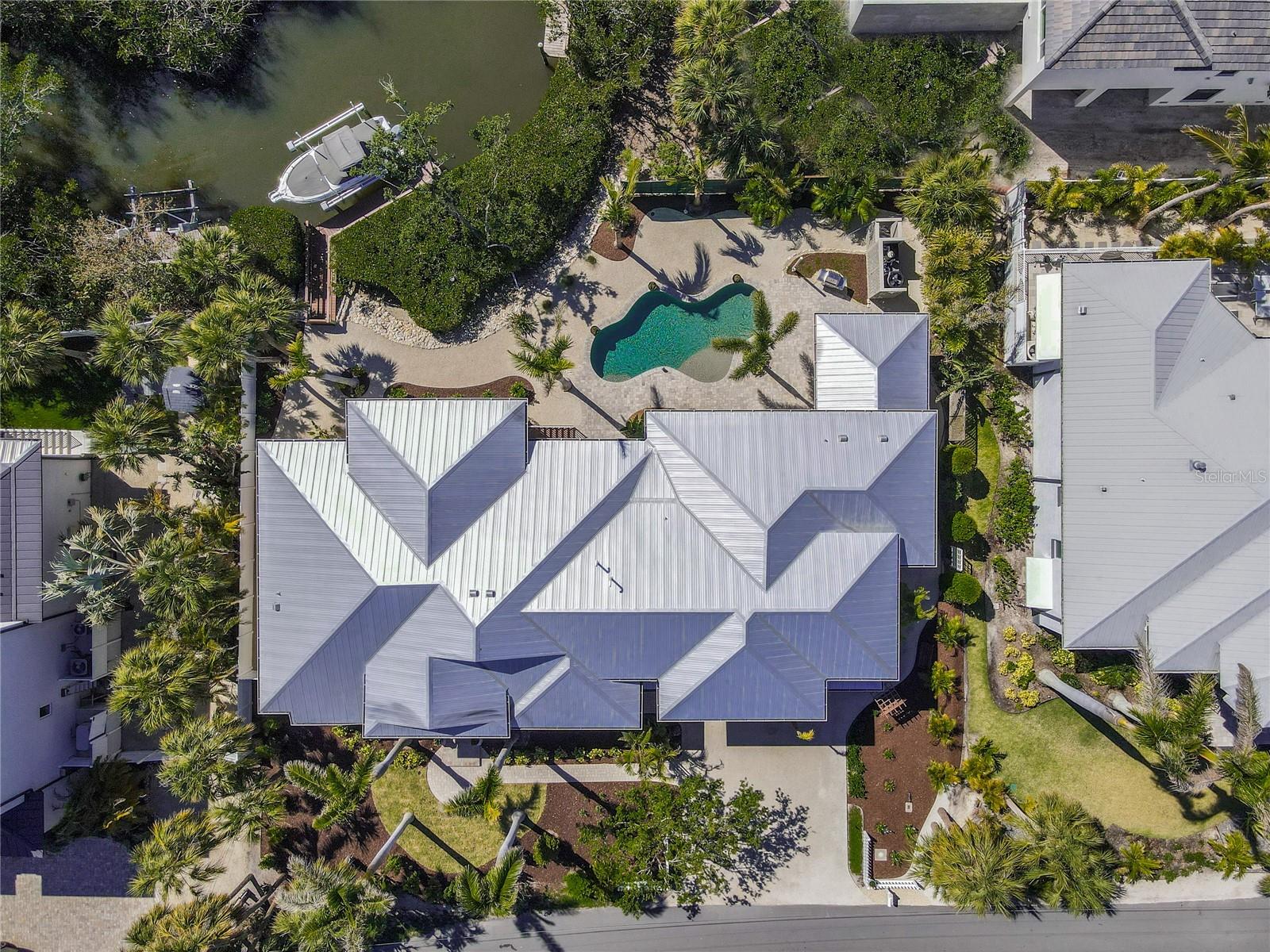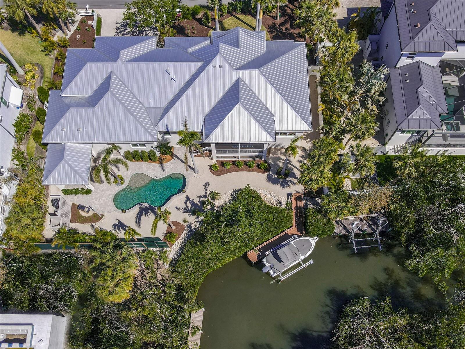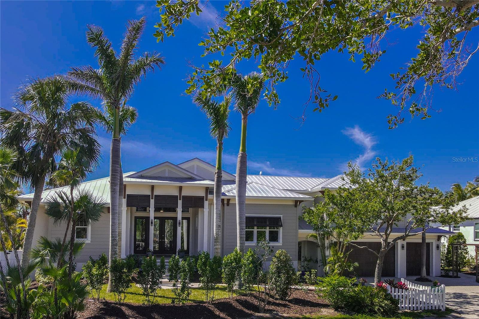You have found it! Welcome to this impressive custom-built West Indies inspired home that has it all. Nestled in an ideal location and a quick walk to the vibrant Siesta Village and world famous crystal sand beach, this property provides quiet privacy with nature views and is surrounded by multiple newer homes. Built within the last 10 years, this home is elevated above 10 feet and constructed to the latest building codes, featuring a metal roof, impact windows and doors and natural gas appliances. This meticulously maintained 2-story waterfront pool home boasts 4 bedrooms, 3.5 bathrooms, an oversized 3-car garage and sits on a generous lot. The stunning open concept main living area invites in natural light and features a 15-foot cathedral ceiling lined with elegant cypress beams and matching engineered hickory wood flooring. Be mesmerized by the enormous 10-foot sliding glass doors while viewing your private dock and serene canal basin. These doors open to a beautiful screened Lanai with tongue and groove natural cypress ceiling and wood deck flooring. The gorgeous kitchen features marble countertops, a spacious 5' x 9' island, turquoise glass backsplash, built-in stainless steel appliances, and a professional Wolf gas gourmet stove. The oversized master suite is a true sanctuary offering private canal views. A tray ceiling with custom trim adds an extra touch of elegance. The first floor includes two additional large bedrooms and a spacious home office. The second floor features a private living quarters fully equipped with a versatile great room, wet bar, bedroom, walk-in closet, washer and dryer, full bathroom, and flex room. This retreat offers endless possibilities. The southwest-facing backyard makes lounging by the heated pool a delight throughout the day. If you prefer shade, relax under the poolside veranda. Outdoor enthusiasts will fall in love with the 40-foot private dock, lined with groomed mangroves that naturally protect the shoreline and support local marine life. Boating enthusiasts will appreciate the easy access to Sarasota Bay and the Gulf, with no low bridges interrupting your journey through the grand canal system. The grounds are beautifully landscaped with numerous Florida native low-maintenance plants, combining aesthetic appeal with practicality. Don't let this exceptional opportunity slip away – book your viewing now and prepare to be amazed by this extraordinary waterfront property!