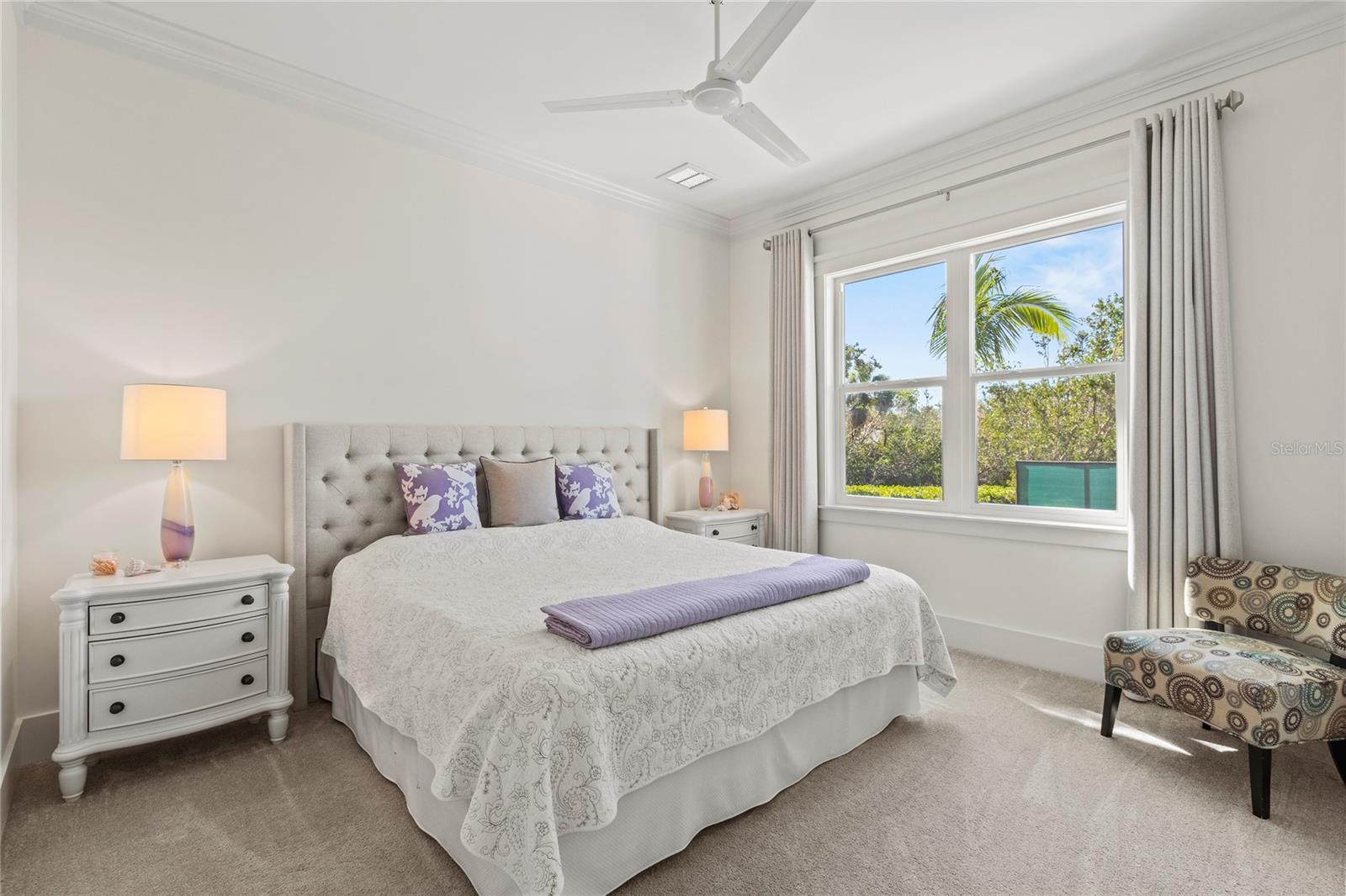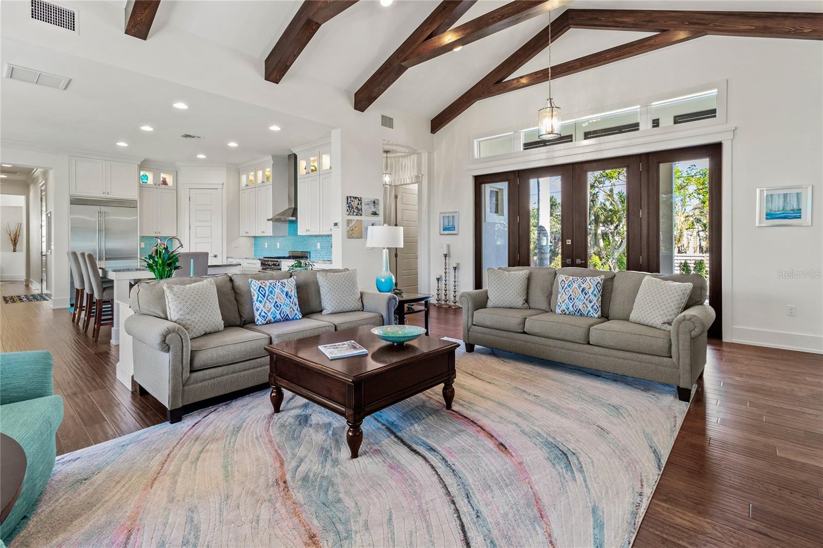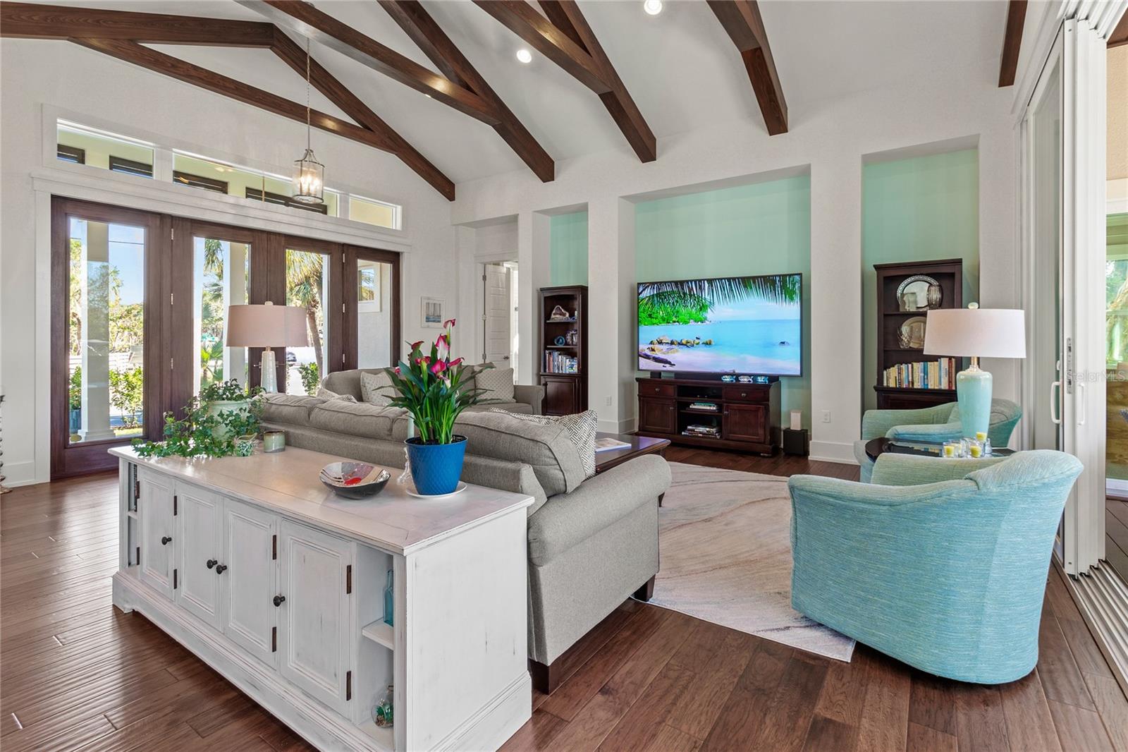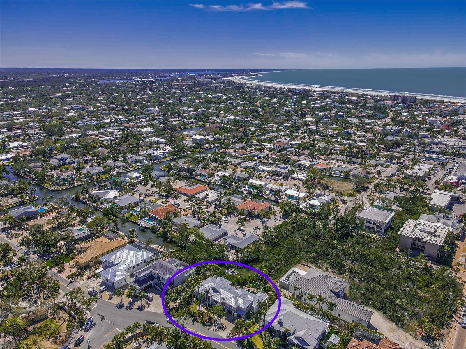 You have found it! Welcome to this impressive custom-built West Indies inspired home that has it all. Nestled in an ideal location and a quick walk to the vibrant Siesta Village and world famous crystal sand beach, this property provides quiet privacy with nature views and is surrounded by multiple newer homes. Built within the last 10 years, this home is elevated above 10 feet and constructed to the latest building codes, featuring a metal roof, impact windows and doors and natural gas appliances. This meticulously maintained 2-story waterfront pool home boasts 4 bedrooms, 3.5 bathrooms, an oversized 3-car garage and sits on a generous lot. The stunning open concept main living area invites in natural light and features a 15-foot cathedral ceiling lined with elegant cypress beams and matching engineered hickory wood flooring. Be mesmerized by the enormous 10-foot sliding glass doors while viewing your private dock and serene canal basin. These doors open to a beautiful screened Lanai with tongue and groove natural cypress ceiling and wood deck flooring. The gorgeous kitchen features marble countertops, a spacious 5' x 9' island, turquoise glass backsplash, built-in stainless steel appliances, and a professional Wolf gas gourmet stove. The oversized master suite is a true sanctuary offering private canal views. A tray ceiling with custom trim adds an extra touch of elegance. The first floor includes two additional large bedrooms and a spacious home office. The second floor features a private living quarters fully equipped with a versatile great room, wet bar, bedroom, walk-in closet, washer and dryer, full bathroom, and flex room. This retreat offers endless possibilities. The southwest-facing backyard makes lounging by the heated pool a delight throughout the day. If you prefer shade, relax under the poolside veranda. Outdoor enthusiasts will fall in love with the 40-foot private dock, lined with groomed mangroves that naturally protect the shoreline and support local marine life. Boating enthusiasts will appreciate the easy access to Sarasota Bay and the Gulf, with no low bridges interrupting your journey through the grand canal system. The grounds are beautifully landscaped with numerous Florida native low-maintenance plants, combining aesthetic appeal with practicality. Don't let this exceptional opportunity slip away – book your viewing now and prepare to be amazed by this extraordinary waterfront property!