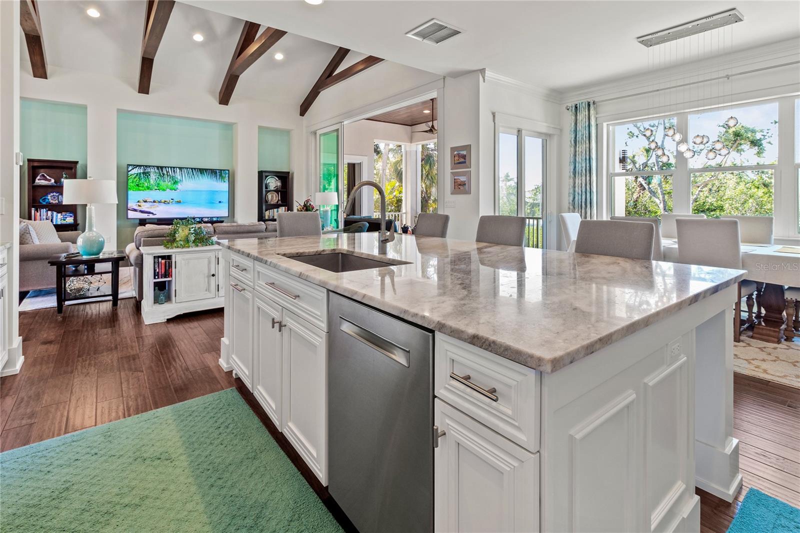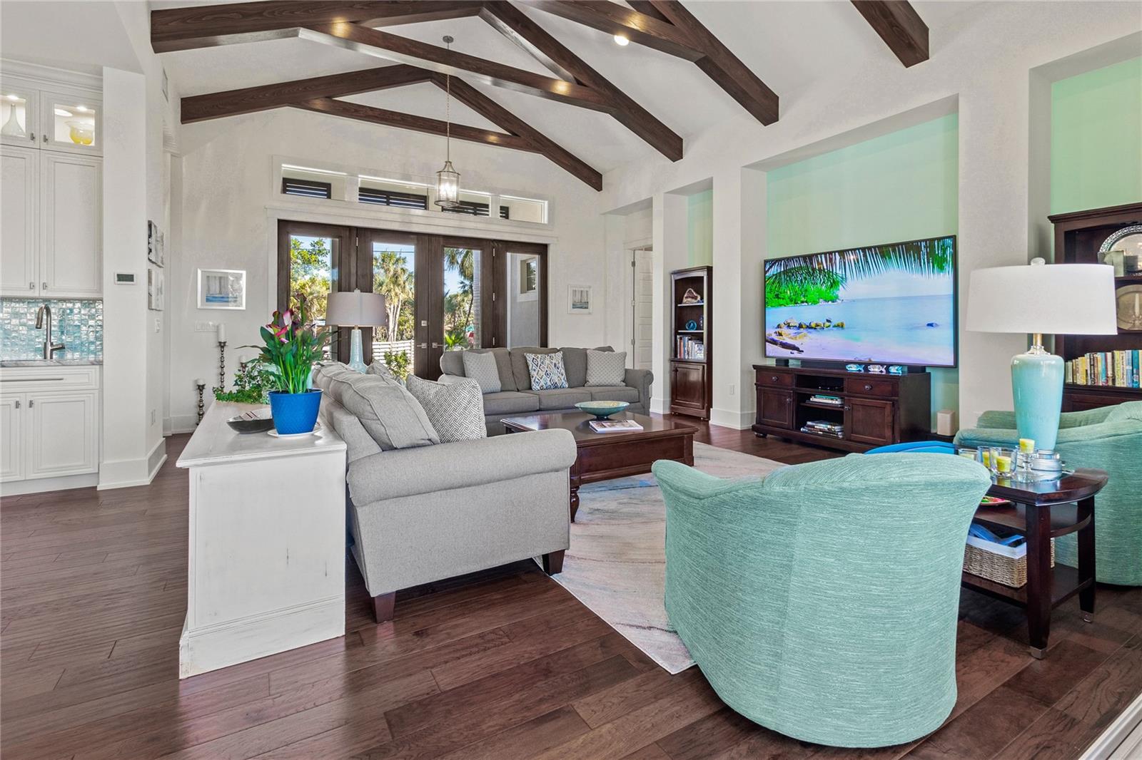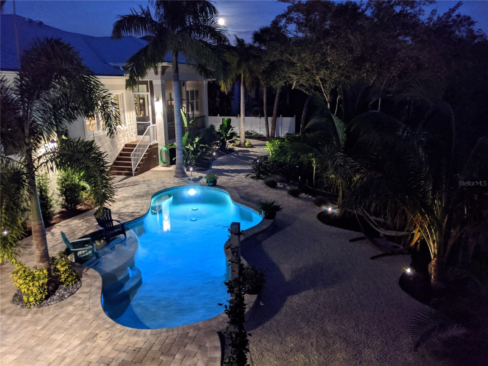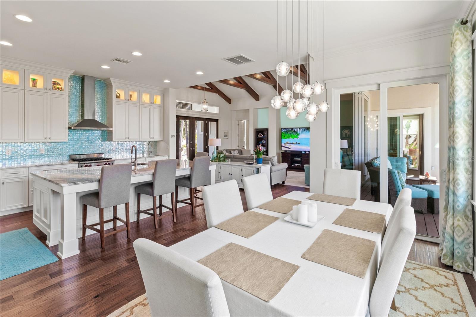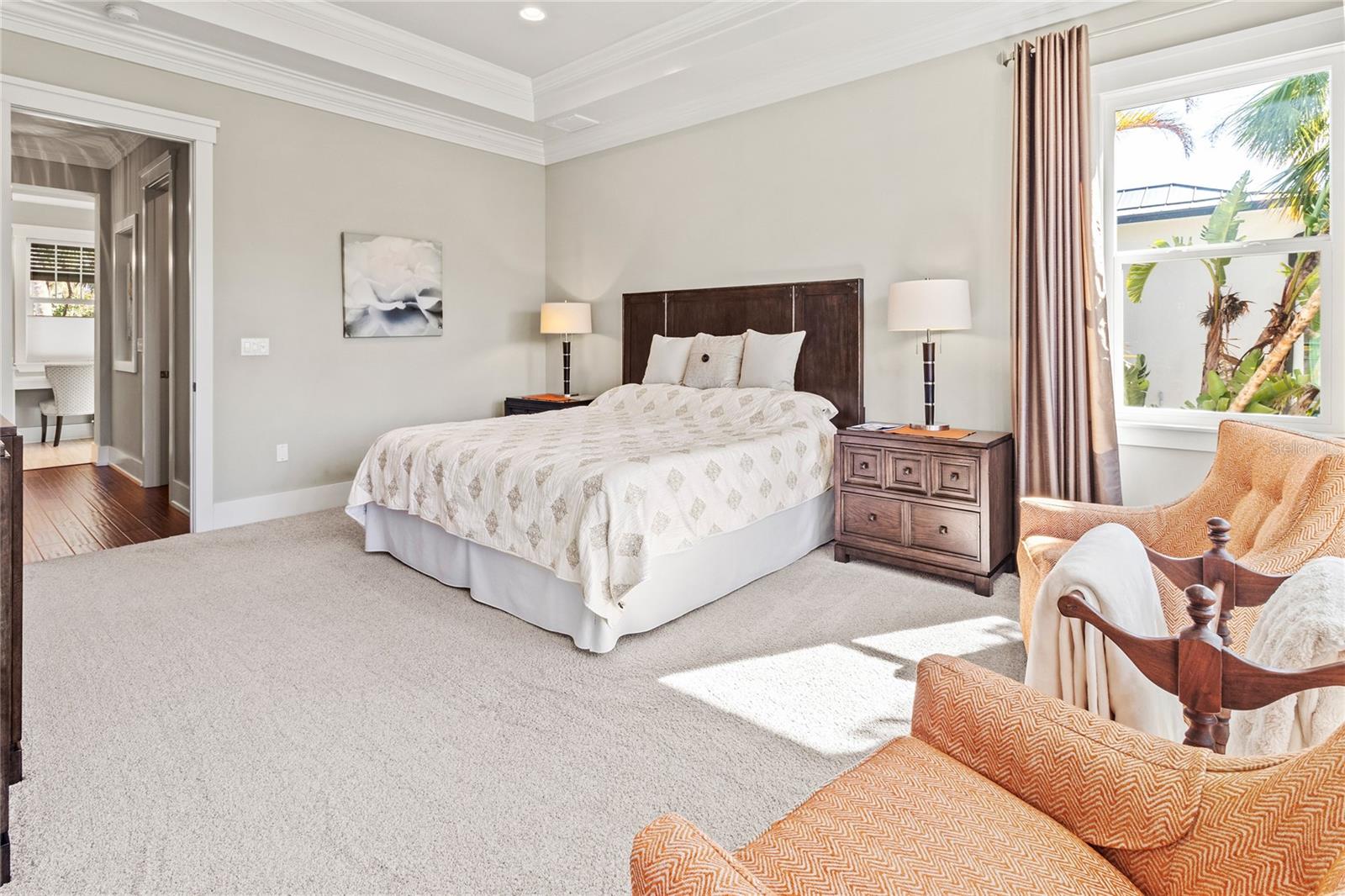 You have found it! Welcome to this impressive custom-built West Indies inspired home that has it all. Nestled in an ideal location and a quick walk to the vibrant Siesta Village and world famous crystal sand beach, this property provides quiet privacy with nature views and is surrounded by multiple newer homes. Built within the last 10 years, this home is elevated above 10 feet and constructed to the latest building codes, featuring a metal roof, impact windows and doors and natural gas appliances. This meticulously maintained 2-story waterfront pool home boasts 4 bedrooms, 3.5 bathrooms, an oversized 3-car garage and sits on a generous lot. The stunning open concept main living area invites in natural light and features a 15-foot cathedral ceiling lined with elegant cypress beams and matching engineered hickory wood flooring. Be mesmerized by the enormous 10-foot sliding glass doors while viewing your private dock and serene canal basin. These doors open to a beautiful screened Lanai with tongue and groove natural cypress ceiling and wood deck flooring. The gorgeous kitchen features marble countertops, a spacious 5' x 9' island, turquoise glass backsplash, built-in stainless steel appliances, and a professional Wolf gas gourmet stove. The oversized master suite is a true sanctuary offering private canal views. A tray ceiling with custom trim adds an extra touch of elegance. The first floor includes two additional large bedrooms and a spacious home office. The second floor features a private living quarters fully equipped with a versatile great room, wet bar, bedroom, walk-in closet, washer and dryer, full bathroom, and flex room. This retreat offers endless possibilities. The southwest-facing backyard makes lounging by the heated pool a delight throughout the day. If you prefer shade, relax under the poolside veranda. Outdoor enthusiasts will fall in love with the 40-foot private dock, lined with groomed mangroves that naturally protect the shoreline and support local marine life. Boating enthusiasts will appreciate the easy access to Sarasota Bay and the Gulf, with no low bridges interrupting your journey through the grand canal system. The grounds are beautifully landscaped with numerous Florida native low-maintenance plants, combining aesthetic appeal with practicality. Don't let this exceptional opportunity slip away – book your viewing now and prepare to be amazed by this extraordinary waterfront property!