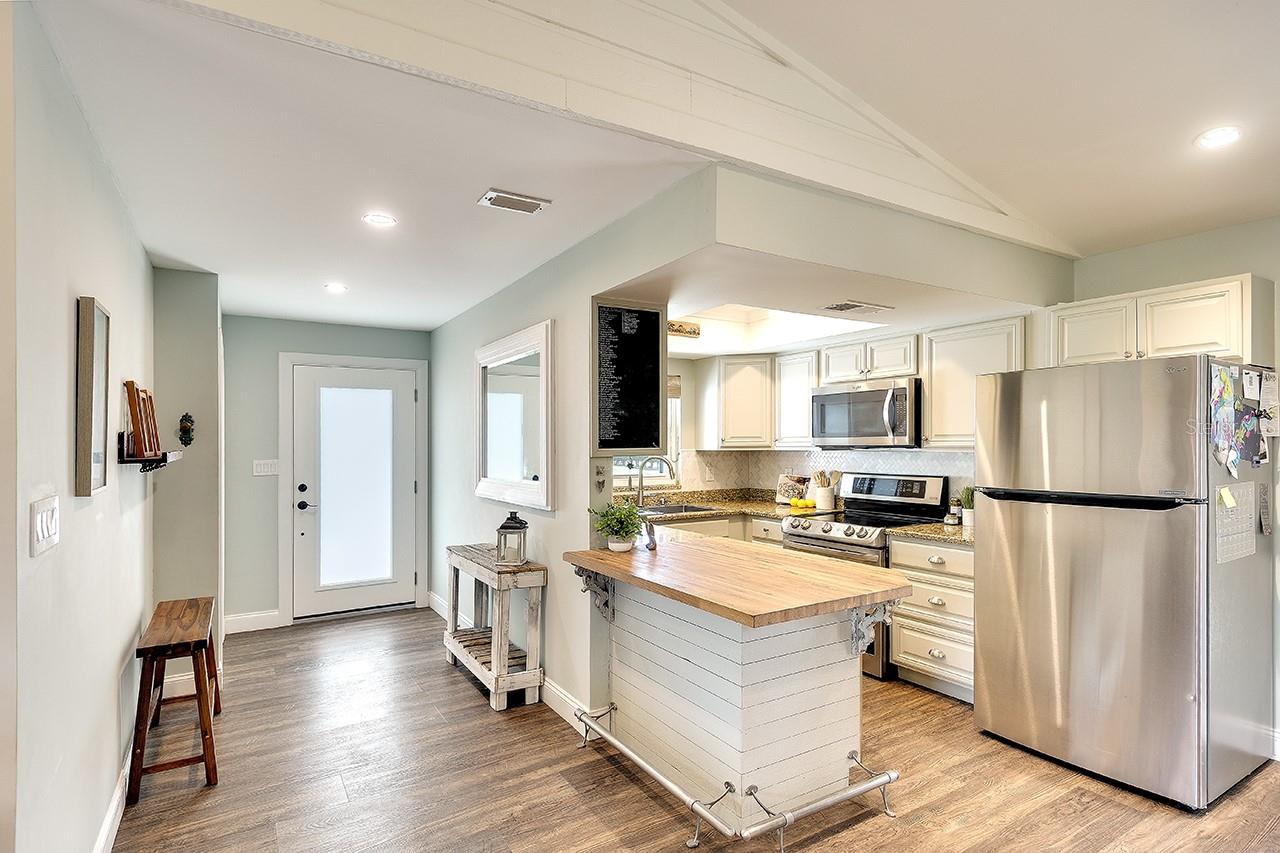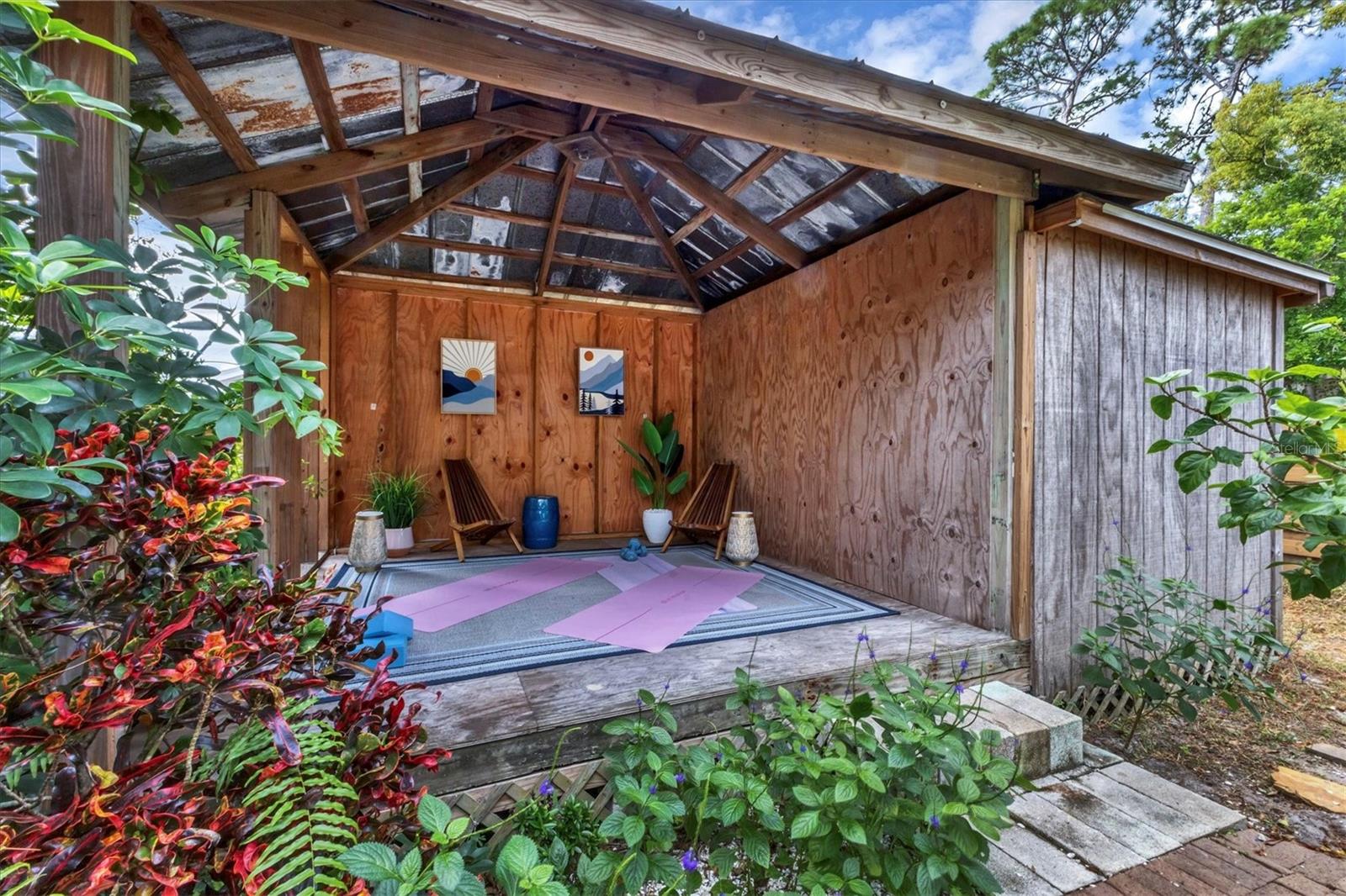 Back on The Market! With New & Upgraded Septic System (Installed Sept 2025) This Nature Lovers Retreat AS SEEN ON THE RECENT HGTV EPISODE OF MY LOTTERY DREAM HOME, Season 18 Episode 5, this beautifully updated craftsman-style home offers 1,048 sq. ft. of living space and a modern, open floor plan with vaulted ceilings creating a bright and spacious feel. Updates include seamless Luxury Vinyl Flooring throughout and Custom room-darkening shades. Entertaining or just making a stay at home dinner is a delight in the gourmet kitchen with granite countertops, herringbone backsplash, large single-basin sink, stainless steel appliances (including double oven) and butcher-block breakfast bar with foot rail, with an added bonus, the hanging spice garden that conveys makes fresh and tasty meals a daily delight. The charming built-in corner dining bench (conveys), Remodeled bathrooms (previous owner), Primary bedroom with vaulted ceiling, Guest bedroom includes custom Murphy bed with built-in desk and shelving—perfect for a home office, Newer A/C (2021) with UV light for improved air quality, High-end hybrid water heater and LED lighting throughout. Private PebbleTec heated saltwater pool (2019), Expansive covered lanai with multiple seating areas, Fenced yard (2024) with attractive woven wood fence and hanging spice garden, Treated wood walkway newly added (2025) leads to private backyard. Stay in shape or enjoy some Zen from your own elevated and covered yoga/meditation platform with attached storage shed, Mature trees maintained by a licensed botanist—home to many bird species, HURRICANE IMPACT WINDOWS & DOORS, Flood Zone X – No Flood Insurance Required, One-car air-conditioned garage (formerly 3rd bedroom – easy to convert back), Newer garage door (2021), Newer washer & dryer (2021), PIPES COMPLETELY LINED WITH PVC (2024), Grading & gutter system (2024) for proper drainage, Roof (2011) with wind mitigation (2022), Public water + brand-new septic system (2025). Conveniently located near shopping, dining, Siesta Key Beach, Oscar Scherer State Park, and The Legacy Trail. This move-in-ready home offers modern comfort, quality updates, and the best of Florida living—all in one exceptional property!