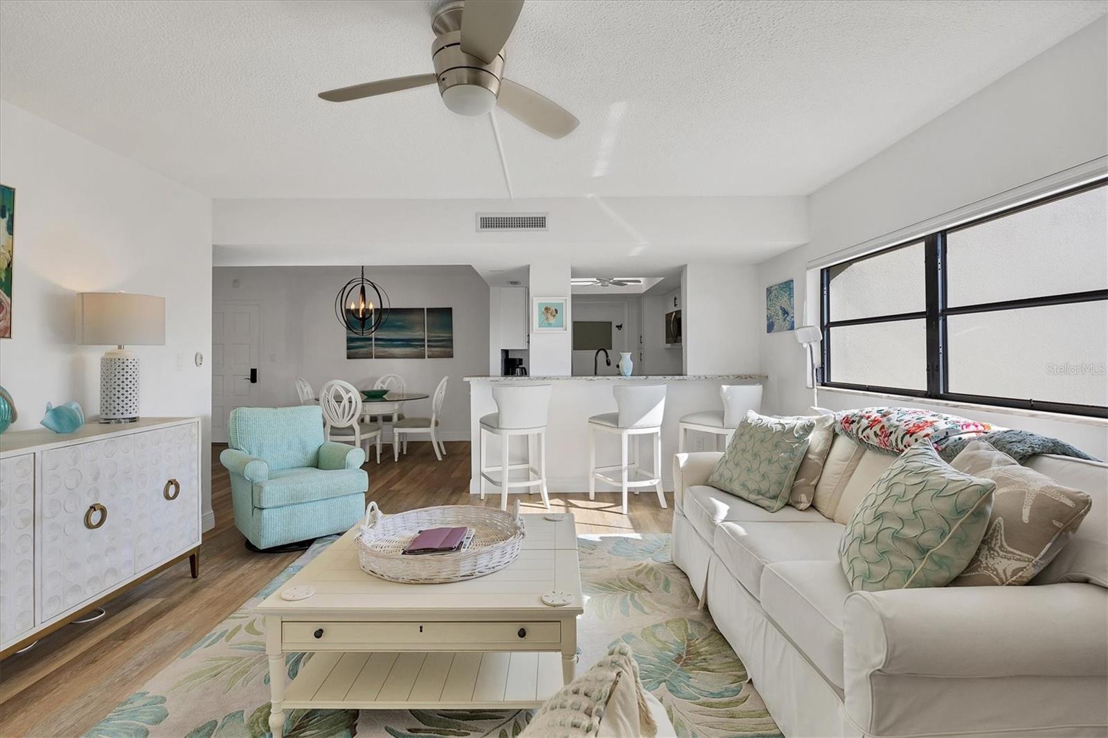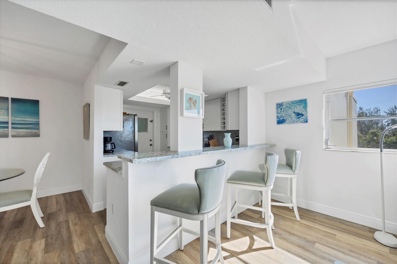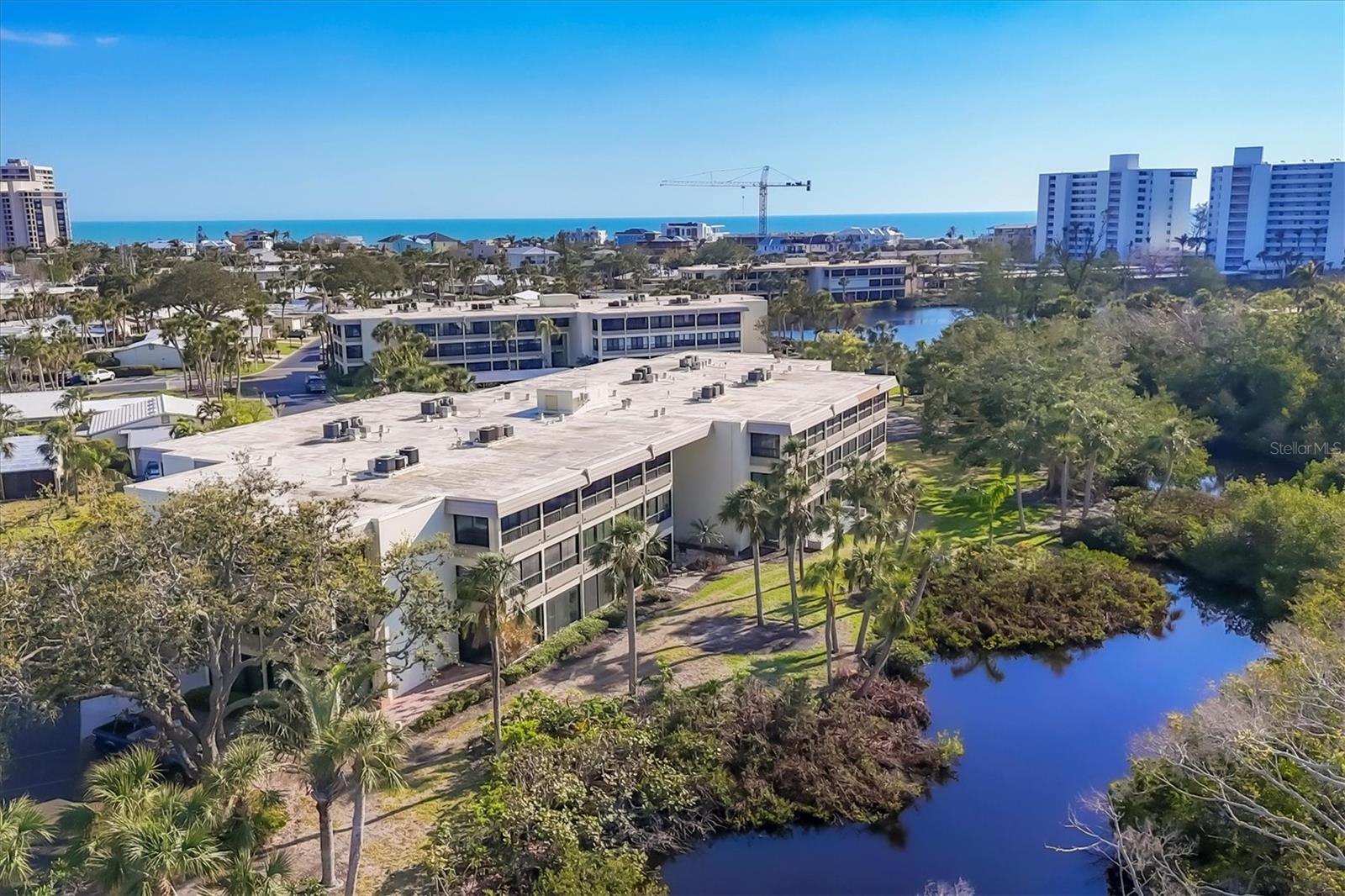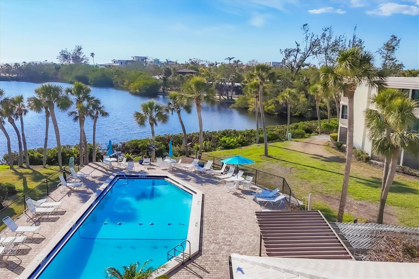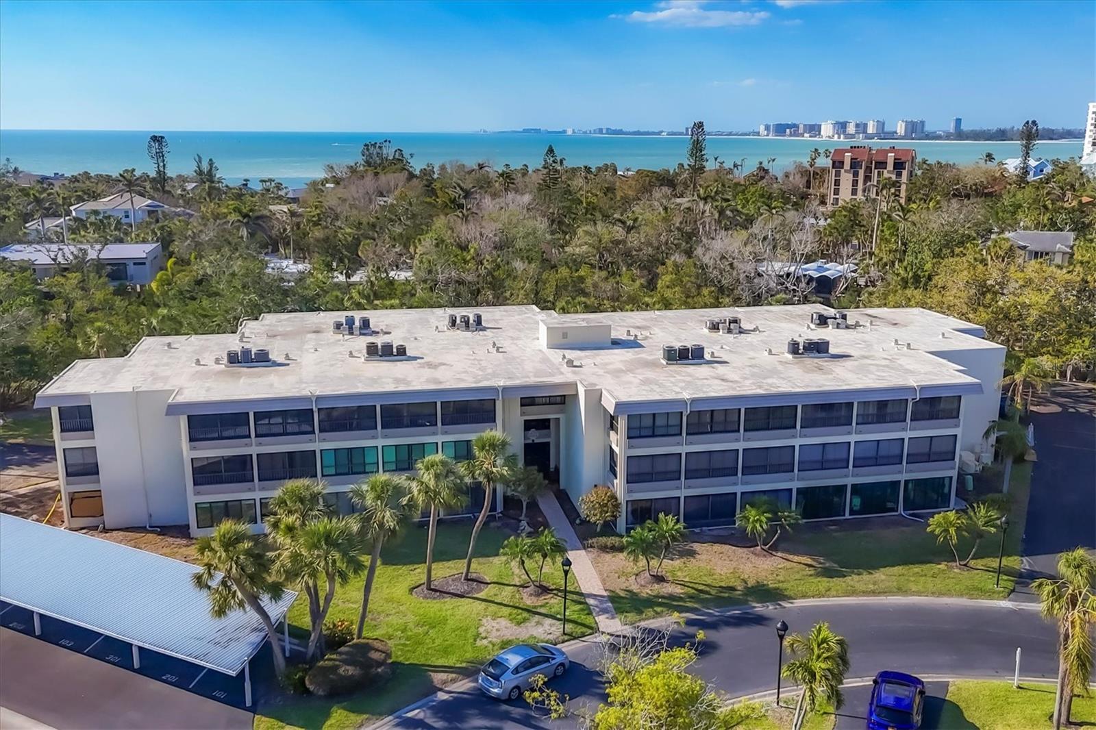 Rarely available top floor end unit in highly desirable Whispering Sands mid rise building. The 1271 Sq ft 2 bedroom 2 bathroom condominium was totally renovated in 2018. The kitchen was re-deigned to be more open and accessible to the dining area and the living room, all kitchen appliances, cabinets and countertops replaced. New wood flooring throughout including in the lanai. All new bathroom cabinetry, toilets and faucets. A double-length, 35 foot screened and glassed-in lanai affords beautiful views of the lagoon. Whispering Sands is an incredibly positioned over - 55 Gulf-front community just steps to Siesta Key Village shops and restaurants. Residents enjoy access to two heated pools, clubhouse, social activities PLUS 800 feet of private beach access. Incredible value in Siesta's premier location, come see for yourself.