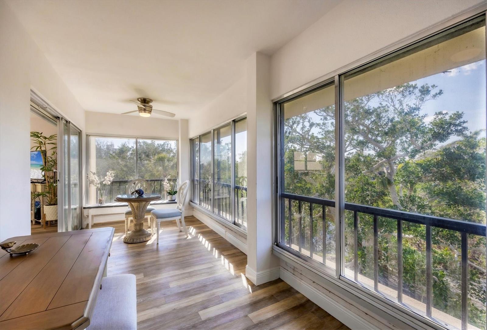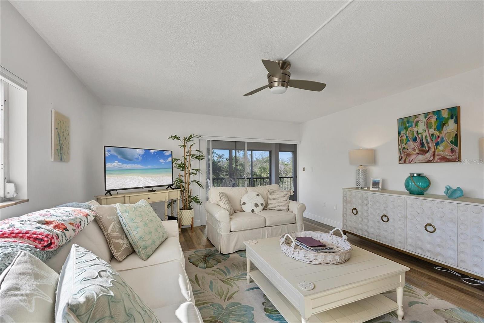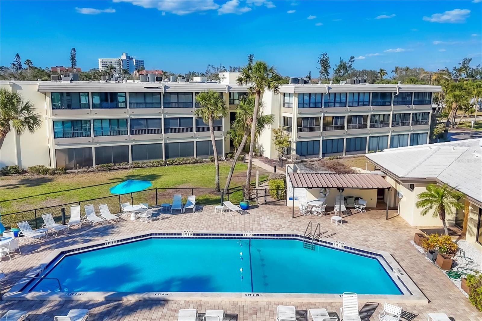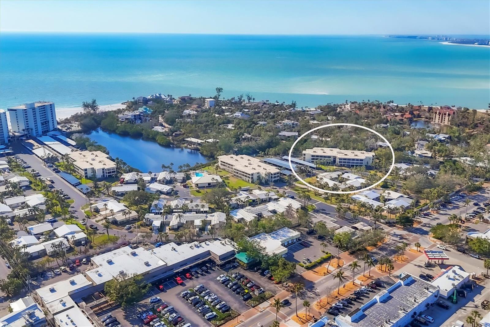 Rarely available top floor end unit in highly desirable Whispering Sands mid rise building. The 1271 Sq ft 2 bedroom 2 bathroom condominium was totally renovated in 2018. The kitchen was re-deigned to be more open and accessible to the dining area and the living room, all kitchen appliances, cabinets and countertops replaced. New wood flooring throughout including in the lanai. All new bathroom cabinetry, toilets and faucets. A double-length, 35 foot screened and glassed-in lanai affords beautiful views of the lagoon. Whispering Sands is an incredibly positioned over - 55 Gulf-front community just steps to Siesta Key Village shops and restaurants. Residents enjoy access to two heated pools, clubhouse, social activities PLUS 800 feet of private beach access. Incredible value in Siesta's premier location, come see for yourself.