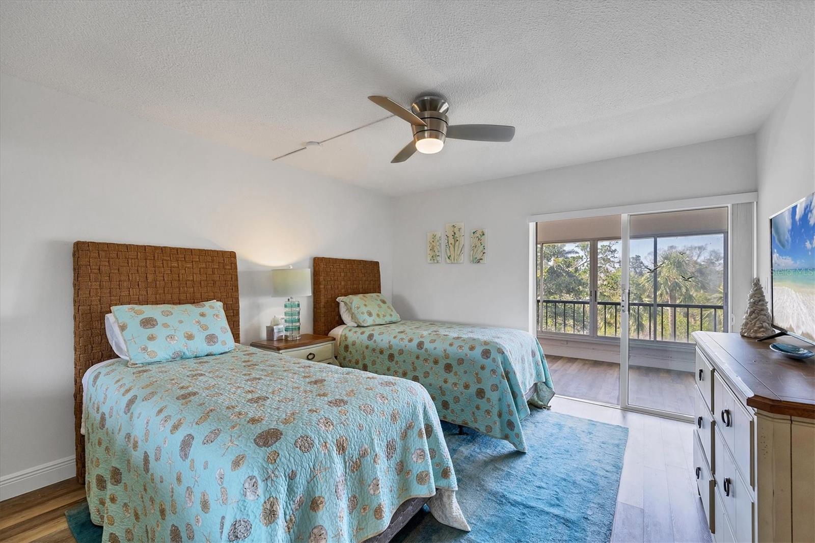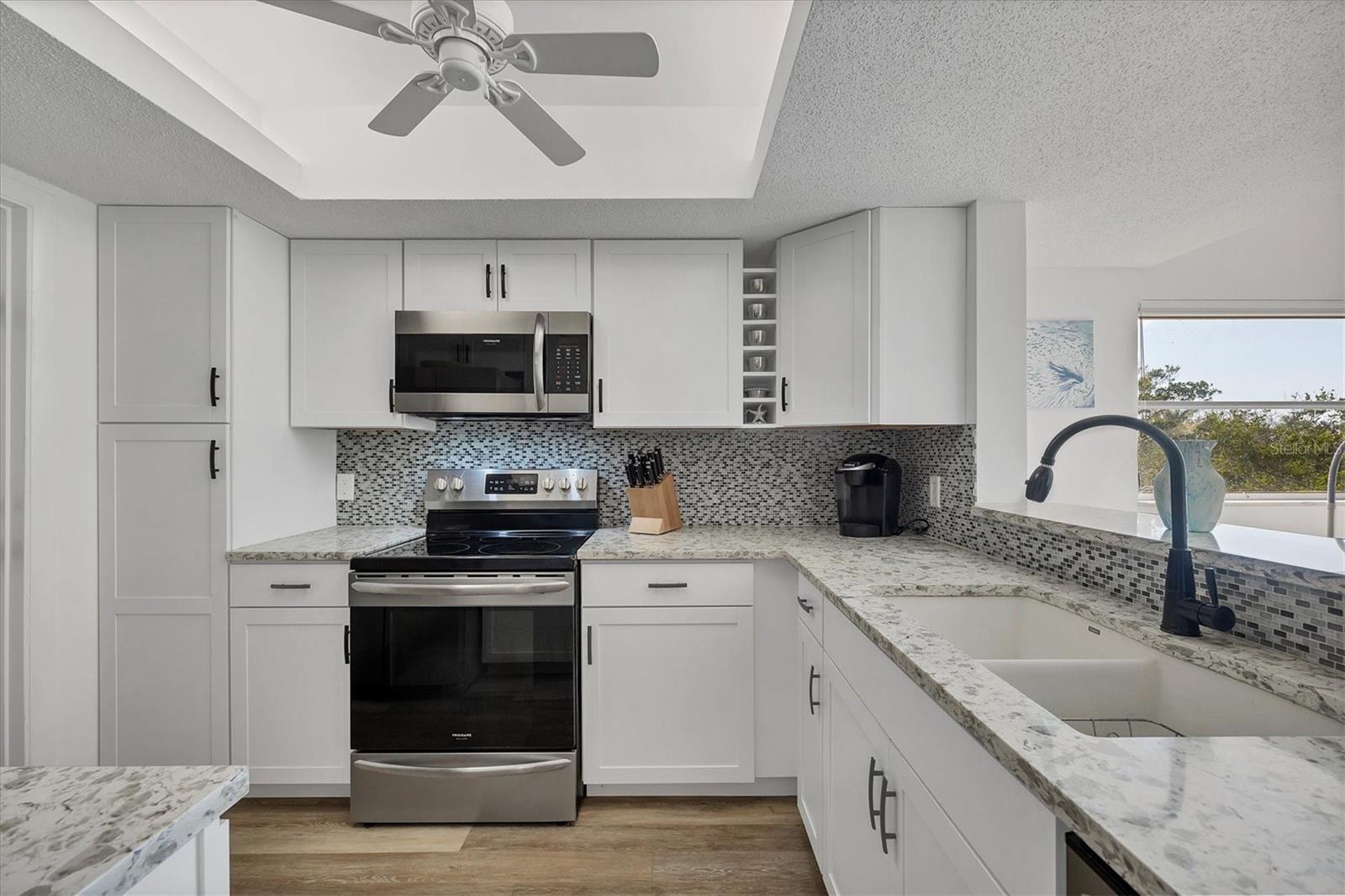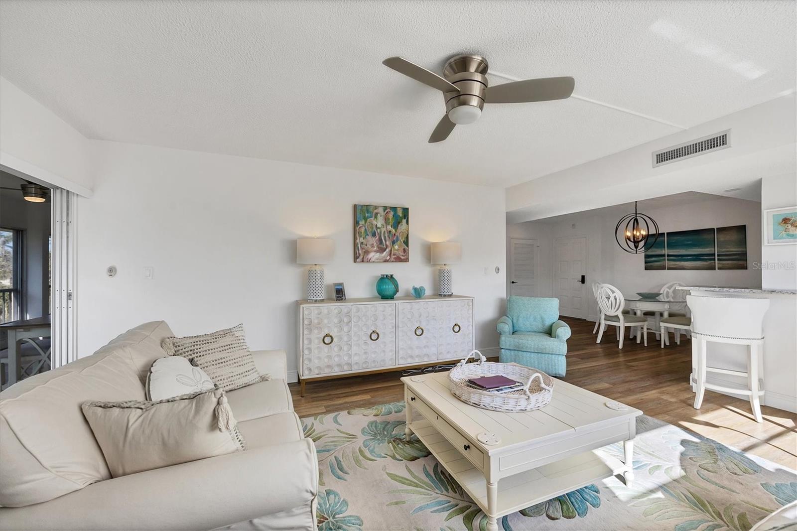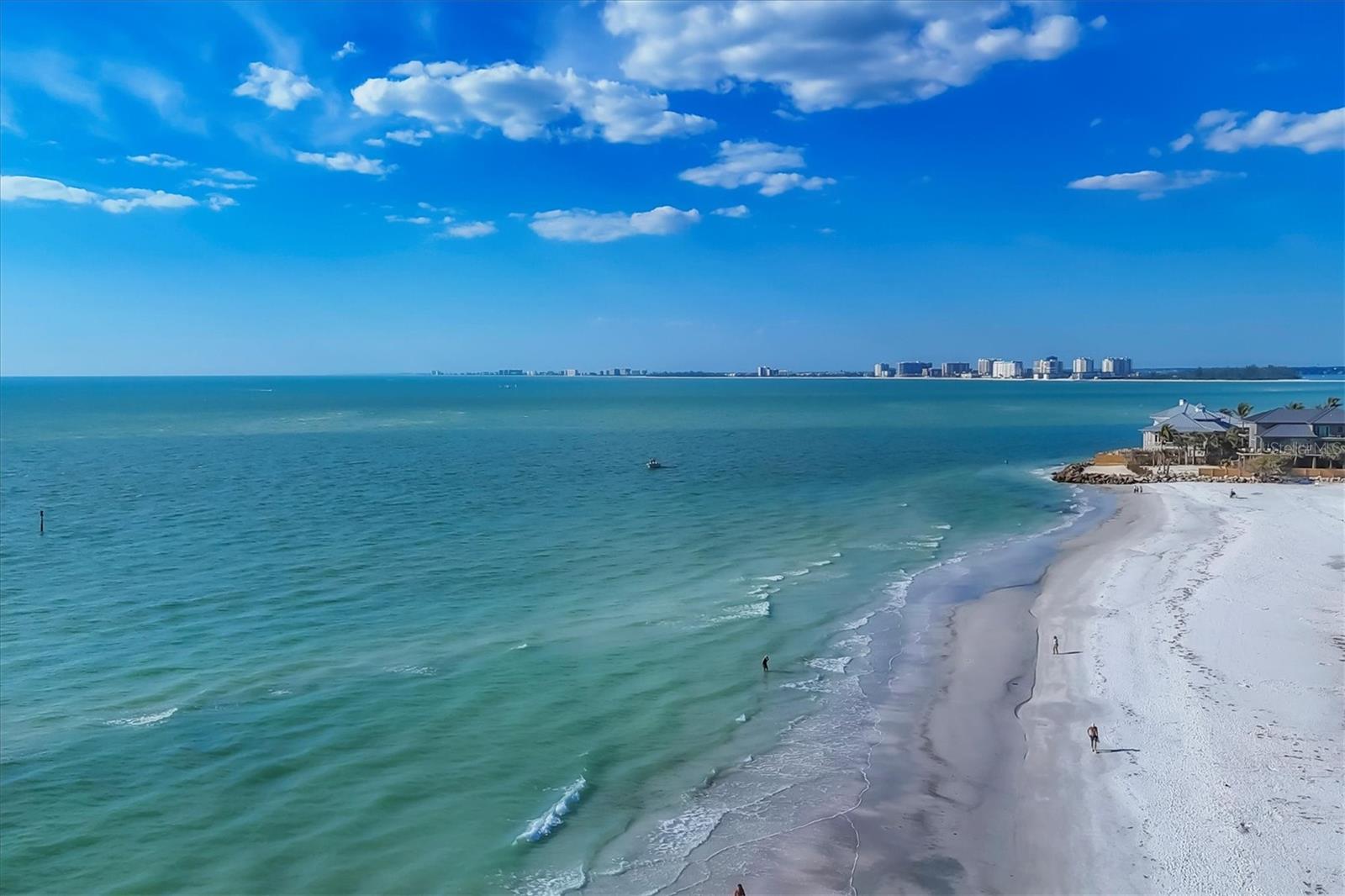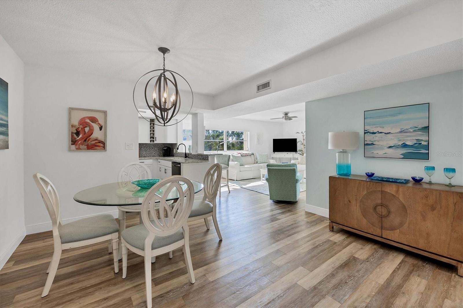 Rarely available top floor end unit in highly desirable Whispering Sands mid rise building. The 1271 Sq ft 2 bedroom 2 bathroom condominium was totally renovated in 2018. The kitchen was re-deigned to be more open and accessible to the dining area and the living room, all kitchen appliances, cabinets and countertops replaced. New wood flooring throughout including in the lanai. All new bathroom cabinetry, toilets and faucets. A double-length, 35 foot screened and glassed-in lanai affords beautiful views of the lagoon. Whispering Sands is an incredibly positioned over - 55 Gulf-front community just steps to Siesta Key Village shops and restaurants. Residents enjoy access to two heated pools, clubhouse, social activities PLUS 800 feet of private beach access. Incredible value in Siesta's premier location, come see for yourself.