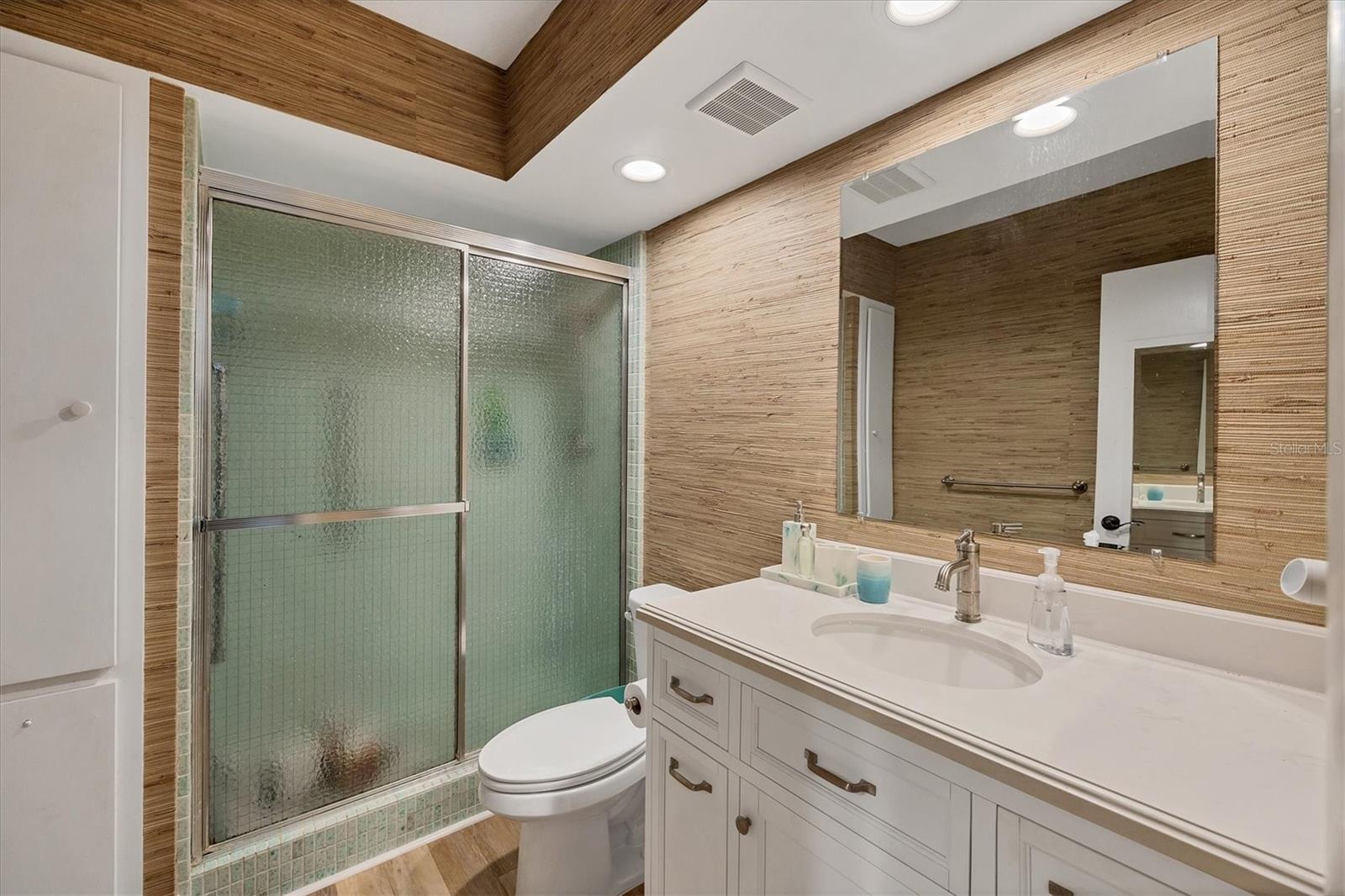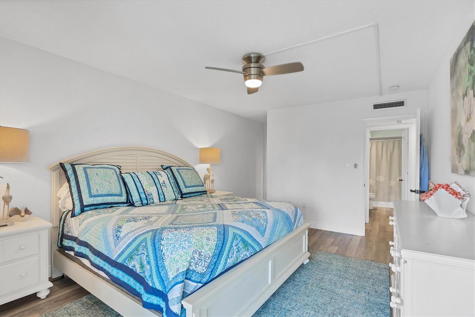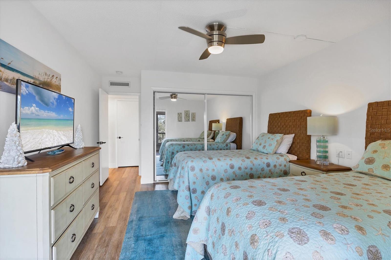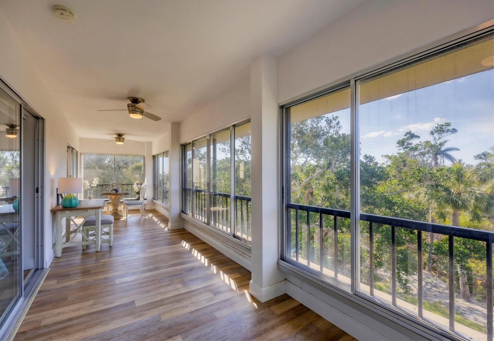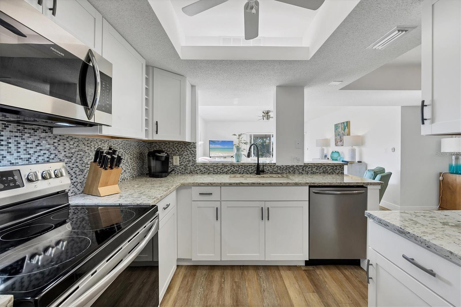Rarely available top floor end unit in highly desirable Whispering Sands mid rise building. The 1271 Sq ft 2 bedroom 2 bathroom condominium was totally renovated in 2018. The kitchen was re-deigned to be more open and accessible to the dining area and the living room, all kitchen appliances, cabinets and countertops replaced. New wood flooring throughout including in the lanai. All new bathroom cabinetry, toilets and faucets. A double-length, 35 foot screened and glassed-in lanai affords beautiful views of the lagoon. Whispering Sands is an incredibly positioned over - 55 Gulf-front community just steps to Siesta Key Village shops and restaurants. Residents enjoy access to two heated pools, clubhouse, social activities PLUS 800 feet of private beach access. Incredible value in Siesta's premier location, come see for yourself.