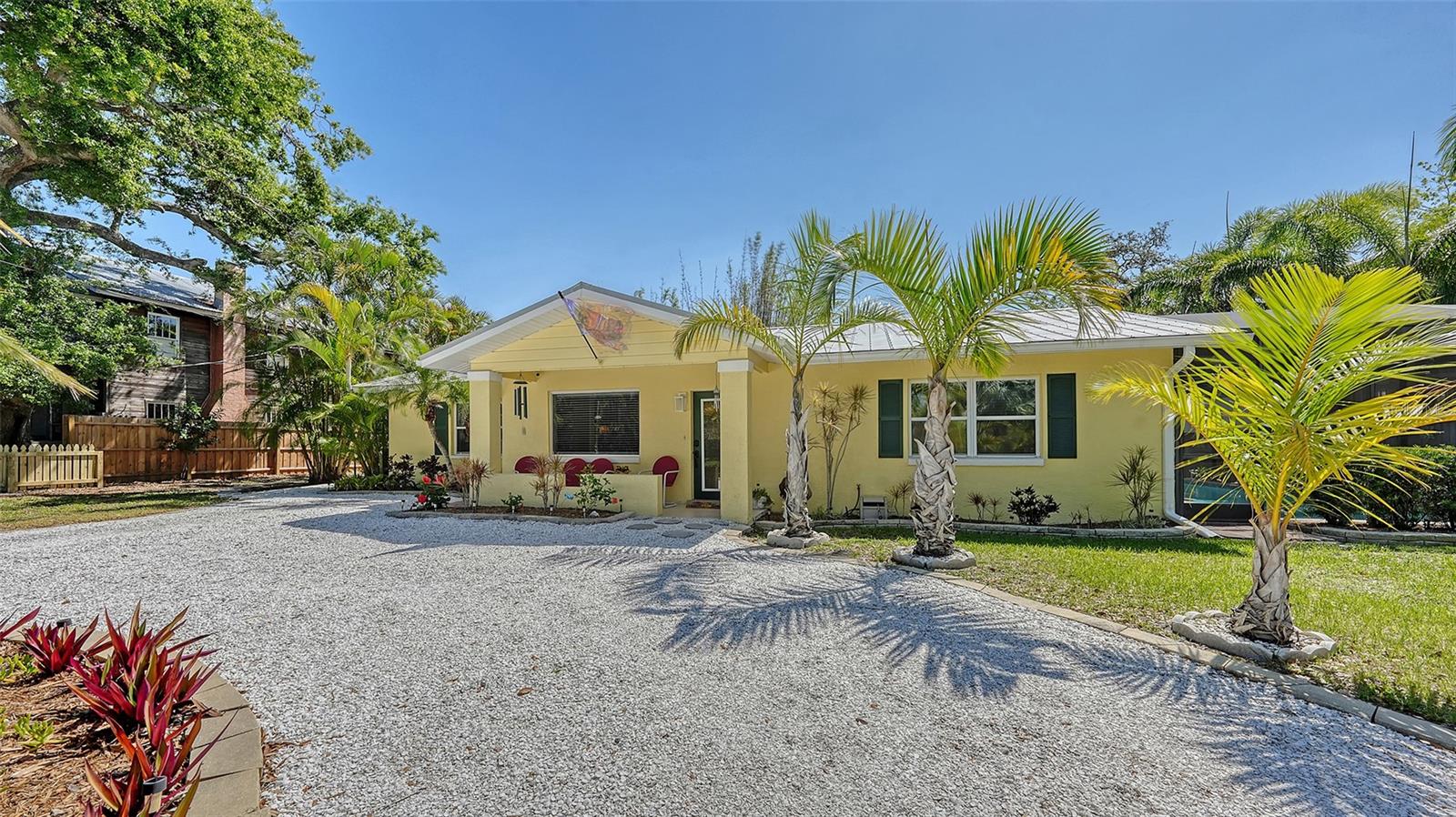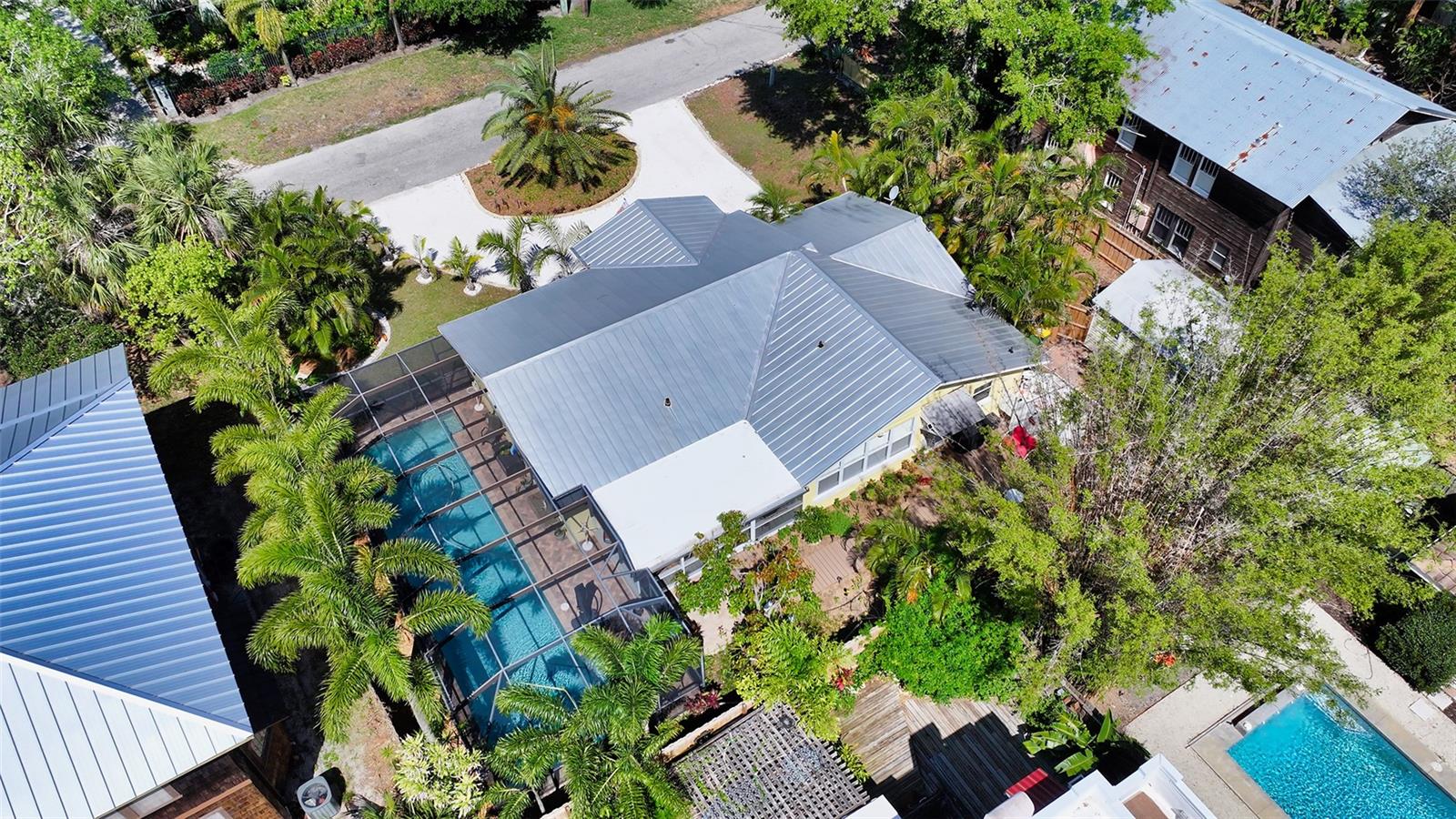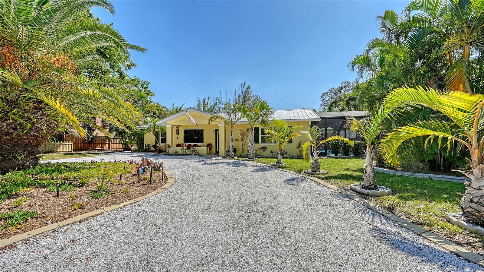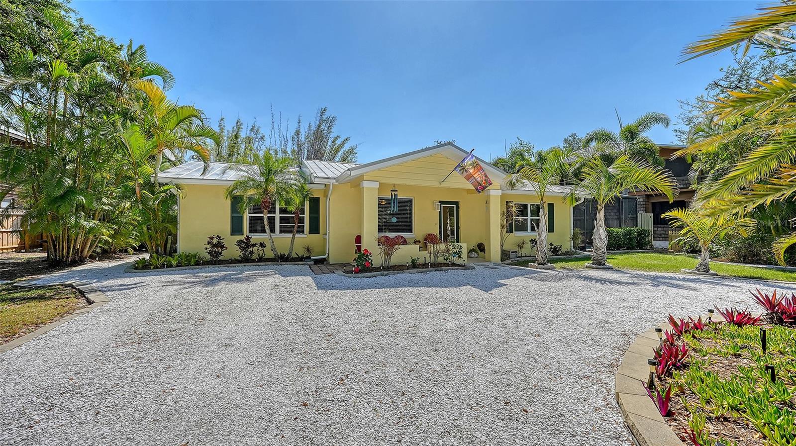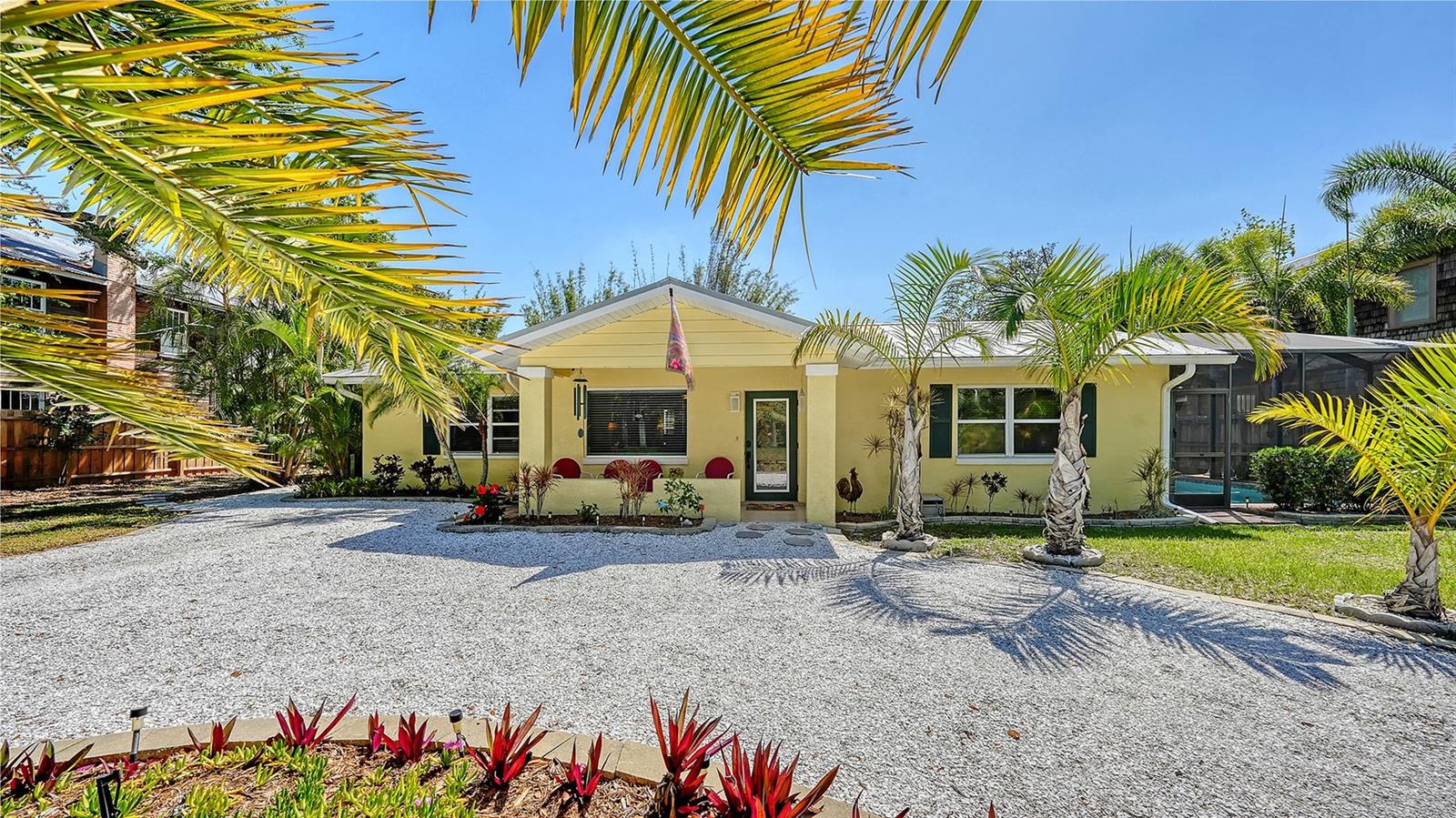 2332 Alameda Description - Broker owned & occupied immaculate pool home fully updated in best area of 'Indian Beach' with high and dry elevation. Large extra wide lot surrounded by trees with room to expand home. Front porch curb appeal, with metal roof and natural shell circular drive, leads into an open floorplan with split bedrooms. Windows and light throughout. Large eat-in kitchen with brand new Samsung Bespoke appliances, stone tile counters and solid wood cabinets. Open plan integrates the wood floor living room with tiled kitchen and a large sunroom dining area boasting wood ceiling where French doors lead to large screen porch and pool. Master suite has wood ceiling, bath with dual sinks/solid wood vanity and large walk-in shower plus French doors open to private outdoor sitting area. Large secondary bedrooms with built-ins, one with sliders opening on porch and pool. Large laundry room with wood ceilings. Back porch integrates with huge 12’x45’ screened party/lap pool that must be seen to appreciate. New pool pump and filtration plumbing. New porch roof 2023. Back yard has extensive decking with grilling/seating area and fully enclosed 4-season outdoor shower. Large 16’x12’ storage shed complete with electricity, lighting, peg board and built-in shelving. New A/C system with York 10-Year Warranty. Irrigation system with eco-friendly separate irrigation meter. New professional exterior paint. Plumbing updated through attic. An absolutely lovely setting in a home surrounded with oaks, palms and fruit-producing avocado tree. Walk to two bayfront parks. Five minutes to Publix, 10th Street Boat Ramp. Easy ride to airport, downtown, St. Armands and more.