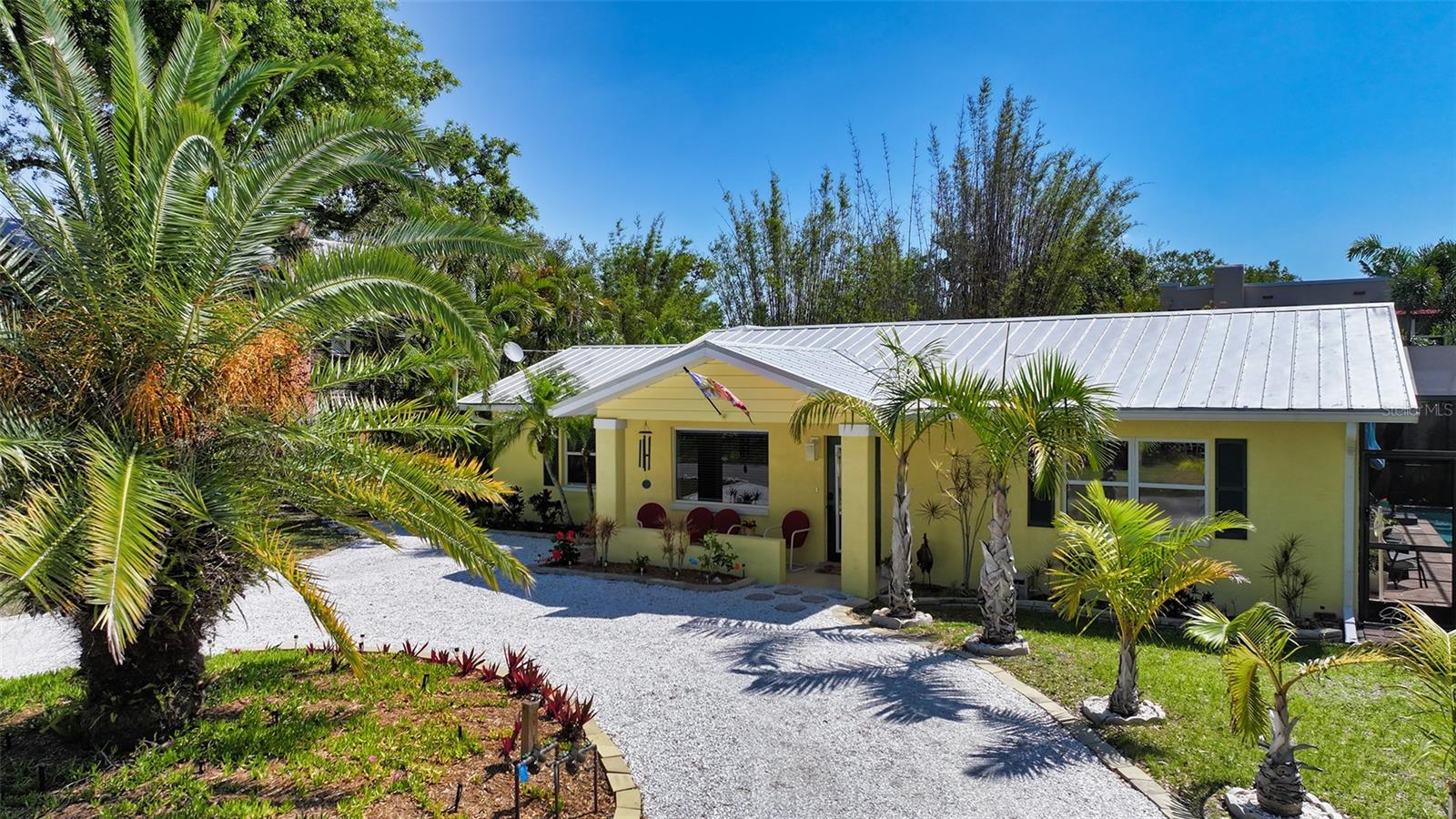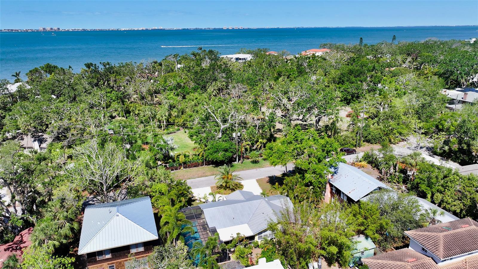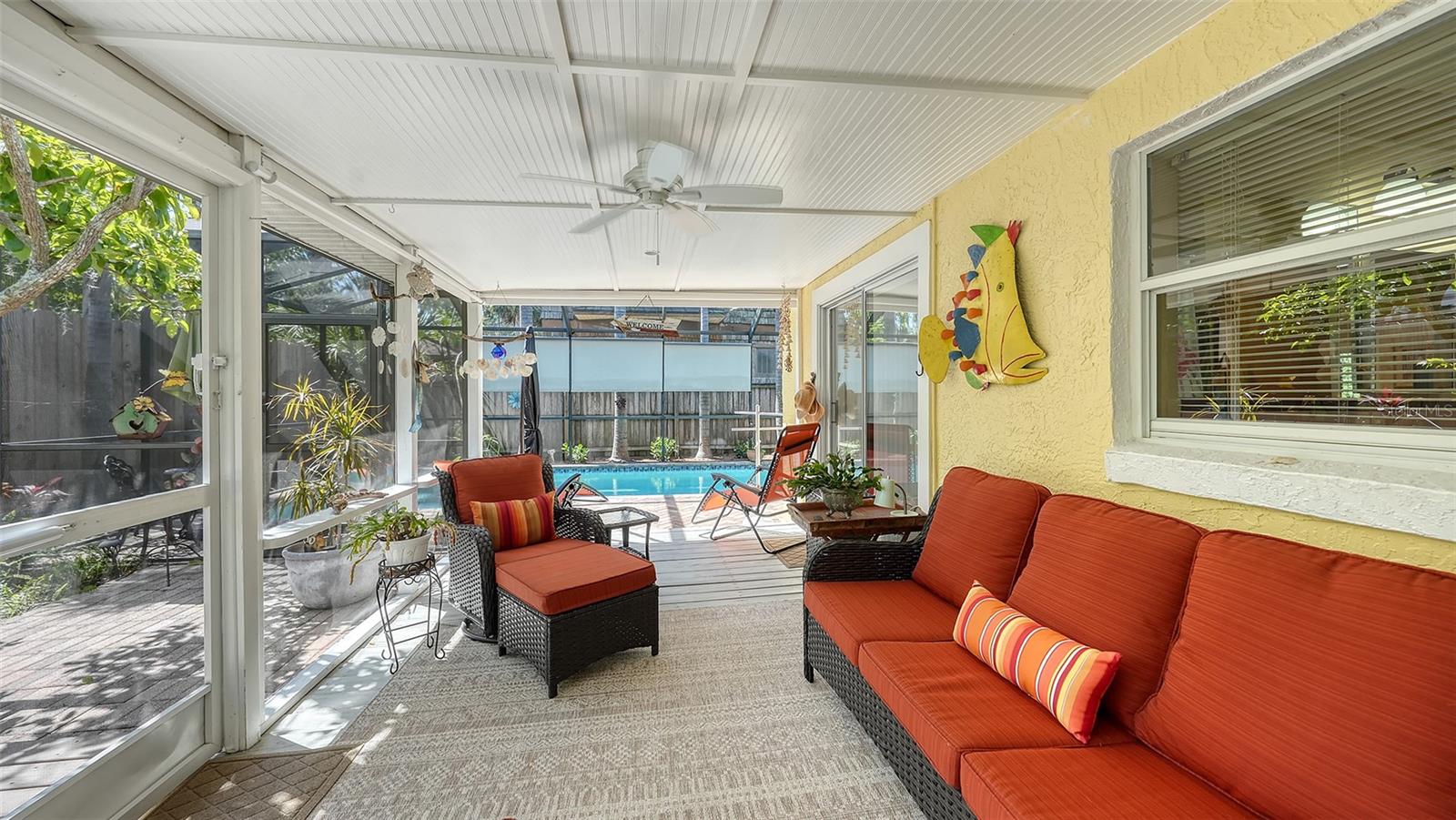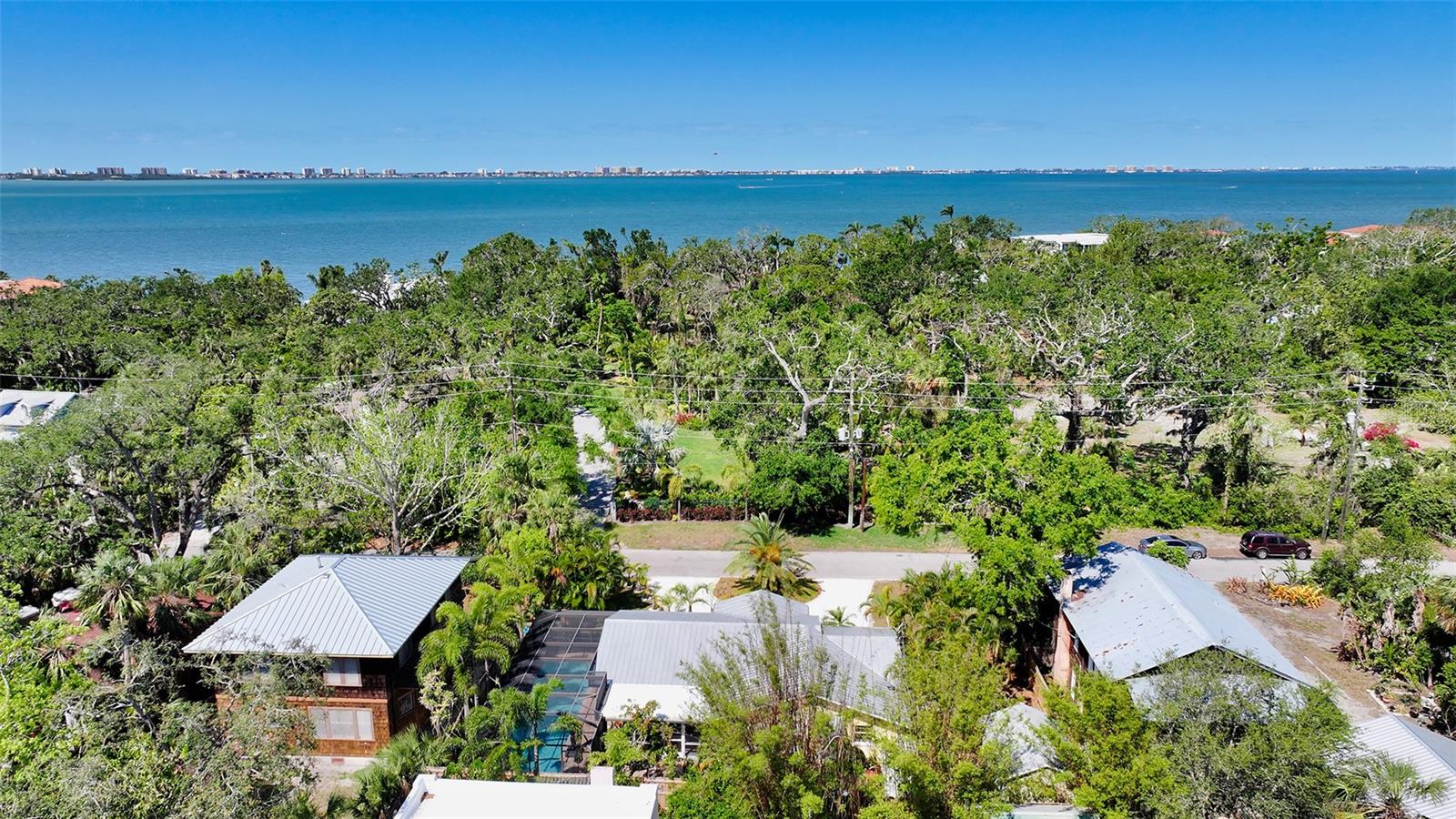 2332 Alameda Description - Broker owned & occupied immaculate pool home fully updated in best area of 'Indian Beach' with high and dry elevation. Large extra wide lot surrounded by trees with room to expand home. Front porch curb appeal, with metal roof and natural shell circular drive, leads into an open floorplan with split bedrooms. Windows and light throughout. Large eat-in kitchen with brand new Samsung Bespoke appliances, stone tile counters and solid wood cabinets. Open plan integrates the wood floor living room with tiled kitchen and a large sunroom dining area boasting wood ceiling where French doors lead to large screen porch and pool. Master suite has wood ceiling, bath with dual sinks/solid wood vanity and large walk-in shower plus French doors open to private outdoor sitting area. Large secondary bedrooms with built-ins, one with sliders opening on porch and pool. Large laundry room with wood ceilings. Back porch integrates with huge 12’x45’ screened party/lap pool that must be seen to appreciate. New pool pump and filtration plumbing. New porch roof 2023. Back yard has extensive decking with grilling/seating area and fully enclosed 4-season outdoor shower. Large 16’x12’ storage shed complete with electricity, lighting, peg board and built-in shelving. New A/C system with York 10-Year Warranty. Irrigation system with eco-friendly separate irrigation meter. New professional exterior paint. Plumbing updated through attic. An absolutely lovely setting in a home surrounded with oaks, palms and fruit-producing avocado tree. Walk to two bayfront parks. Five minutes to Publix, 10th Street Boat Ramp. Easy ride to airport, downtown, St. Armands and more.