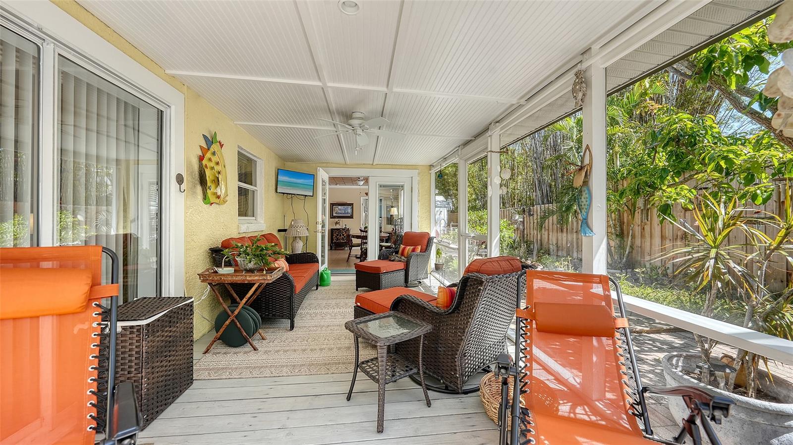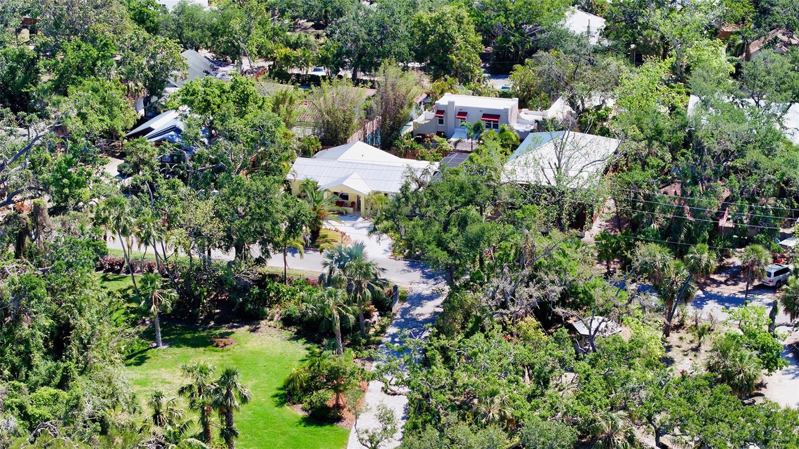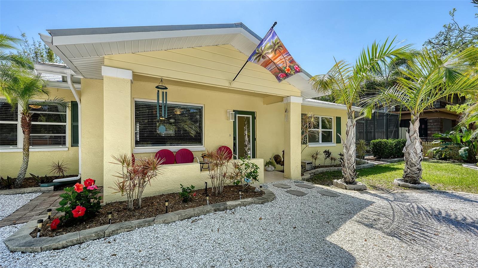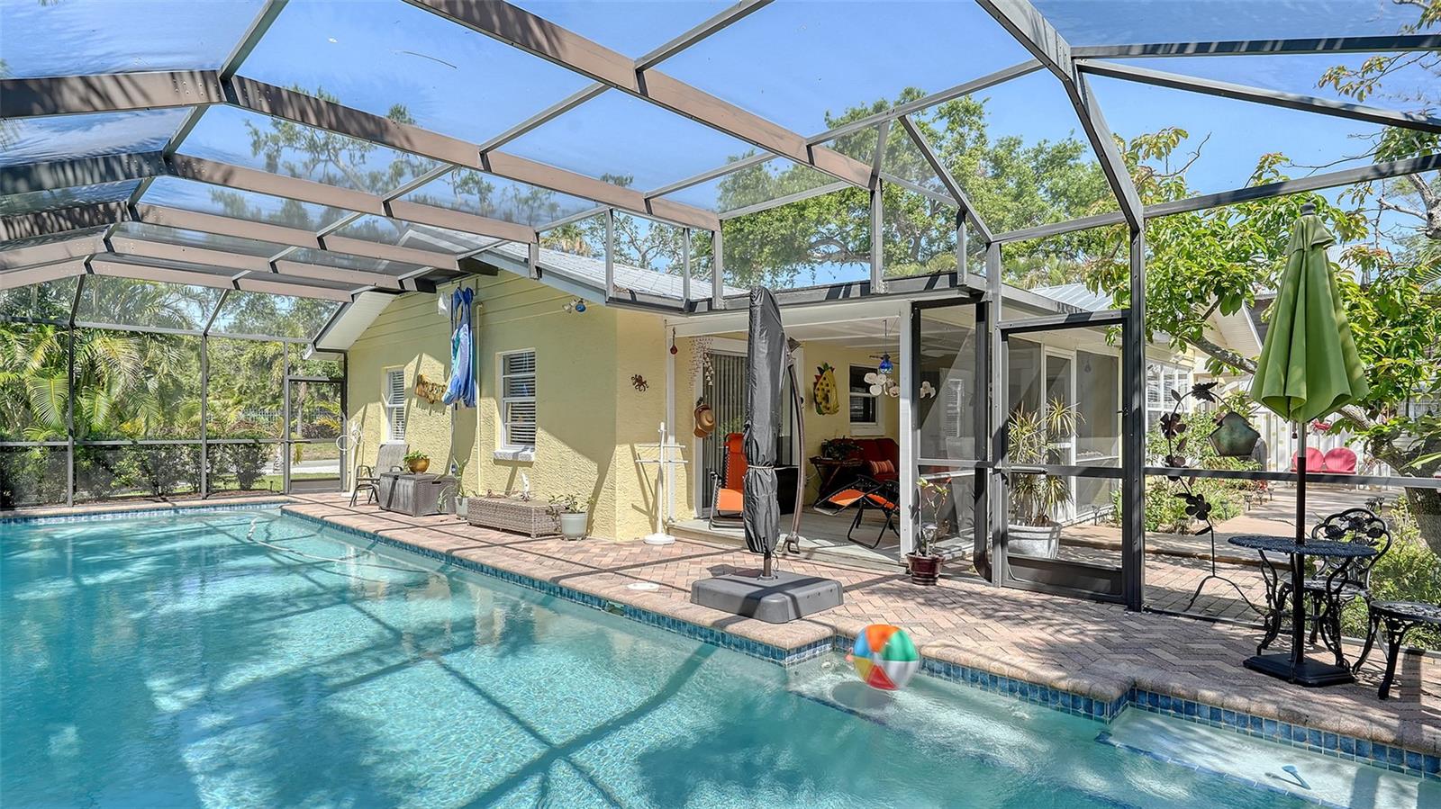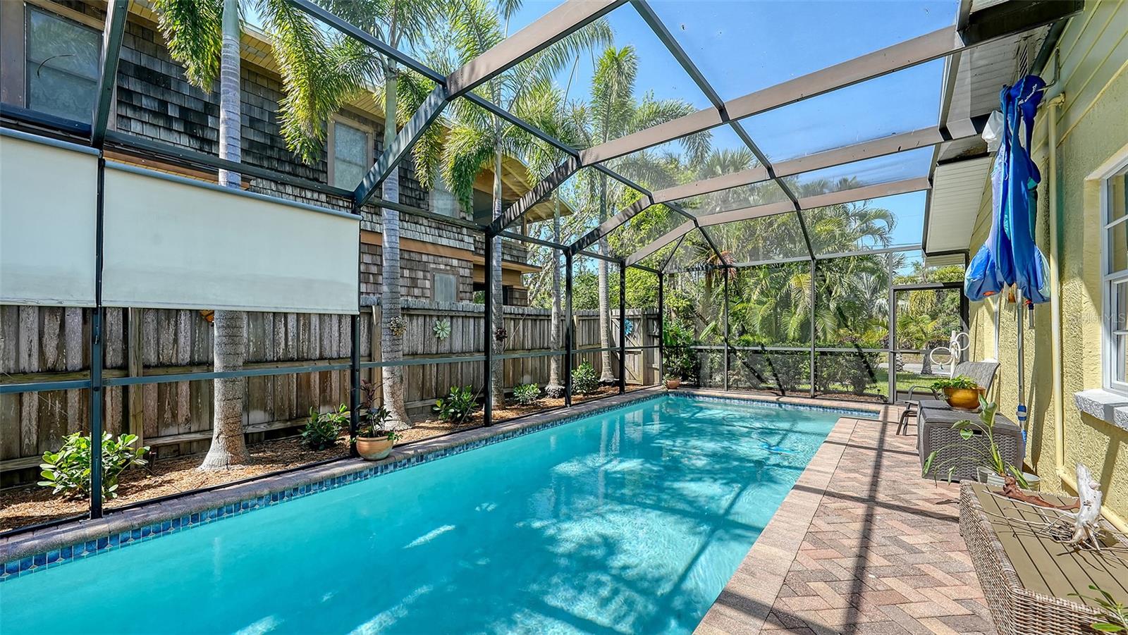 2332 Alameda Description - Broker owned & occupied immaculate pool home fully updated in best area of 'Indian Beach' with high and dry elevation. Large extra wide lot surrounded by trees with room to expand home. Front porch curb appeal, with metal roof and natural shell circular drive, leads into an open floorplan with split bedrooms. Windows and light throughout. Large eat-in kitchen with brand new Samsung Bespoke appliances, stone tile counters and solid wood cabinets. Open plan integrates the wood floor living room with tiled kitchen and a large sunroom dining area boasting wood ceiling where French doors lead to large screen porch and pool. Master suite has wood ceiling, bath with dual sinks/solid wood vanity and large walk-in shower plus French doors open to private outdoor sitting area. Large secondary bedrooms with built-ins, one with sliders opening on porch and pool. Large laundry room with wood ceilings. Back porch integrates with huge 12’x45’ screened party/lap pool that must be seen to appreciate. New pool pump and filtration plumbing. New porch roof 2023. Back yard has extensive decking with grilling/seating area and fully enclosed 4-season outdoor shower. Large 16’x12’ storage shed complete with electricity, lighting, peg board and built-in shelving. New A/C system with York 10-Year Warranty. Irrigation system with eco-friendly separate irrigation meter. New professional exterior paint. Plumbing updated through attic. An absolutely lovely setting in a home surrounded with oaks, palms and fruit-producing avocado tree. Walk to two bayfront parks. Five minutes to Publix, 10th Street Boat Ramp. Easy ride to airport, downtown, St. Armands and more.