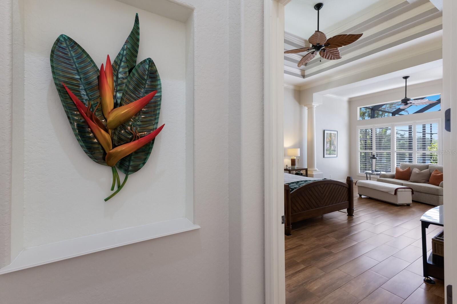 Serenity, sophistication, and sweeping lakefront views converge in this exceptional estate, located within the prestigious gated community of Red Hawk Reserve. Set on a premium homesite and thoughtfully crafted for both elegant living and effortless entertaining, this 3,586 sq. ft. residence offers four bedrooms, three bathrooms, a dedicated office, a flexible studio or fifth bedroom, and an expansive 400+ sq. ft. bonus room. From the moment you step inside, you're welcomed by soaring ceilings, abundant natural light, and timeless architectural details that create a sense of openness and grandeur. At the heart of the home lies a gourmet kitchen, beautifully appointed with designer cabinetry, a custom wood range hood, granite countertops, under-cabinet lighting, a center island with breakfast bar, and high-end stainless steel appliances. Adjacent to the kitchen, a cozy dinette framed by a sweeping aquarium window offers the perfect setting to enjoy your morning coffee while overlooking the pool and tranquil lake. The primary suite is a private retreat, complete with serene views, dual custom walk-in closets with upgraded built-ins, and a spa-inspired en-suite bath featuring a Roman shower, soaking tub, and separate vanities. Step outside to your resort-style oasis—an expansive wrap-around lanai with brick pavers, a heated pool and spa, and lush tropical landscaping, all set against the backdrop of shimmering lake views. An oversized three-car garage offers generous built-in storage and overhead racks. At the same time, the community provides added peace of mind with a virtual guard gate, high-resolution security, and reclaimed water irrigation. Located within an A-rated school district and just minutes from the world-renowned Siesta Key Beach, this remarkable residence embodies the essence of Florida luxury living.
