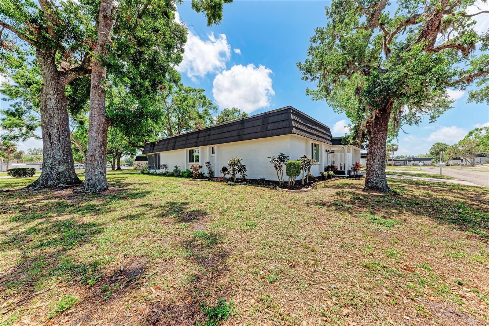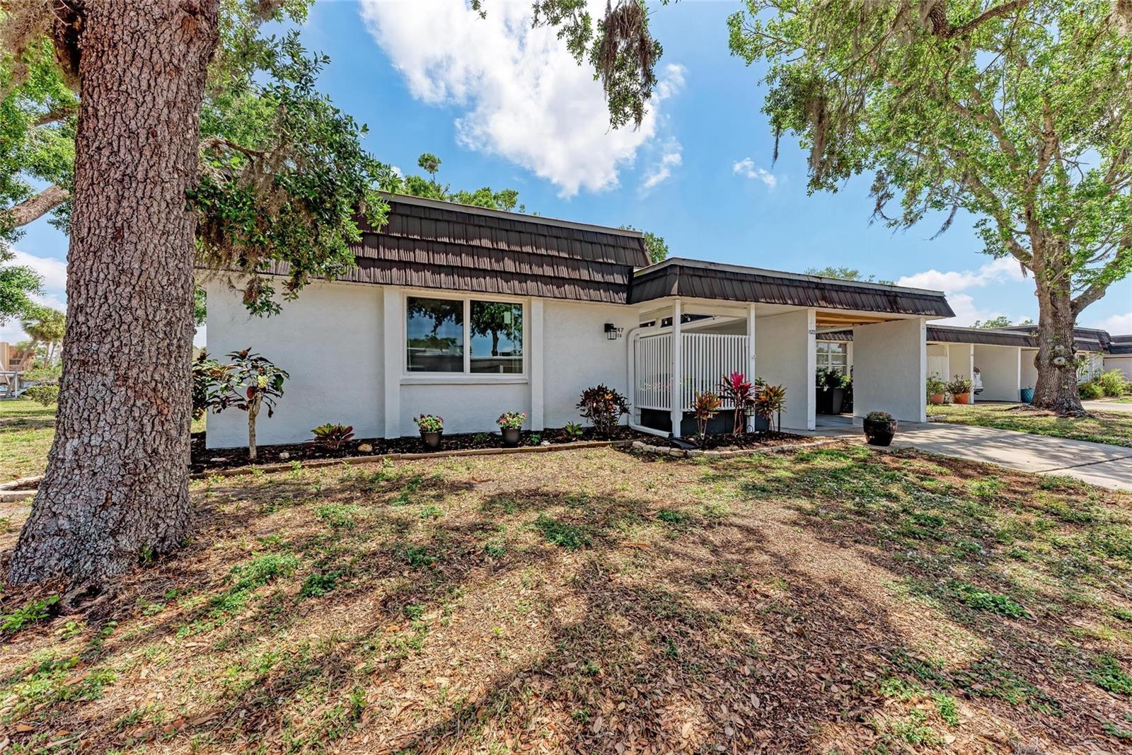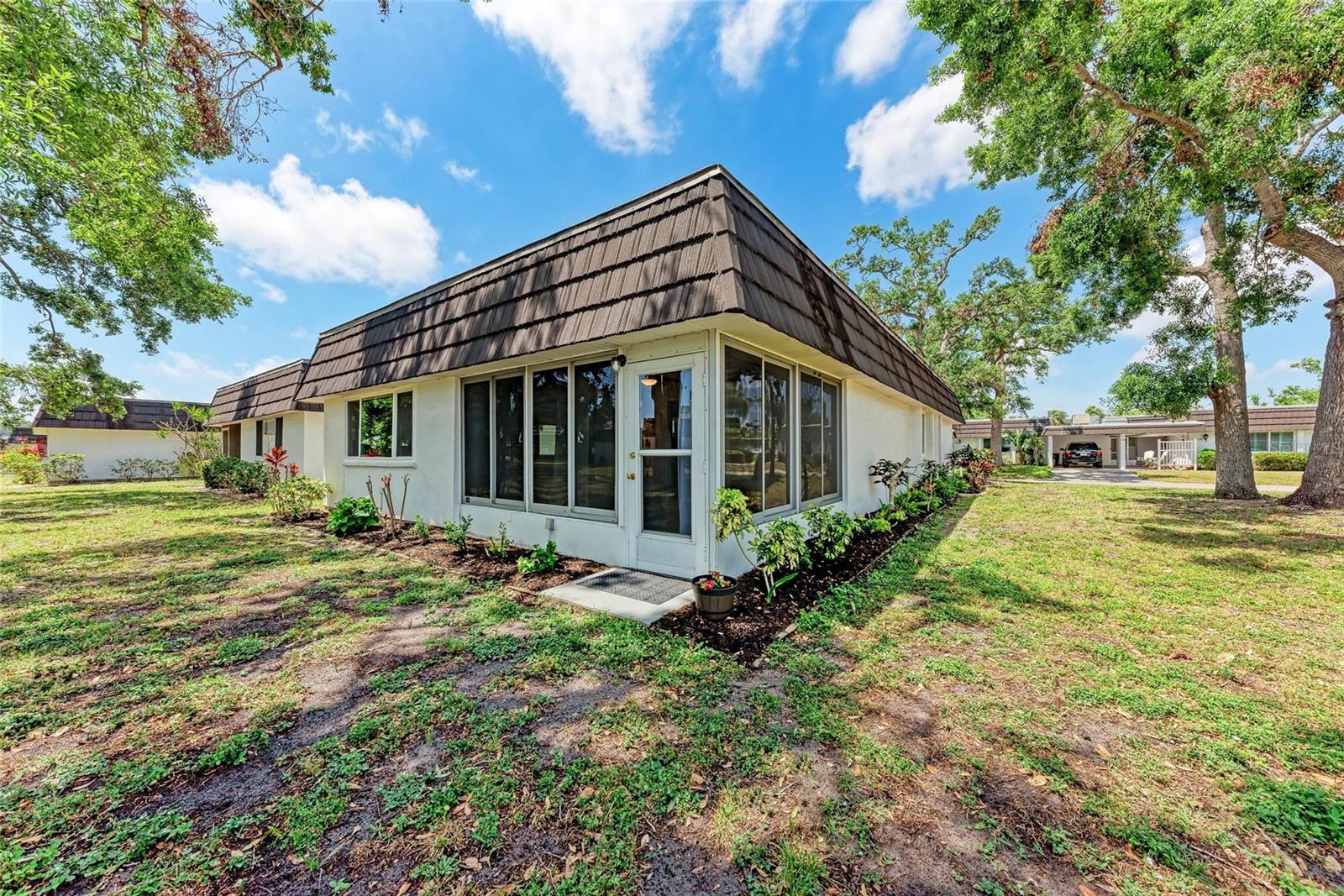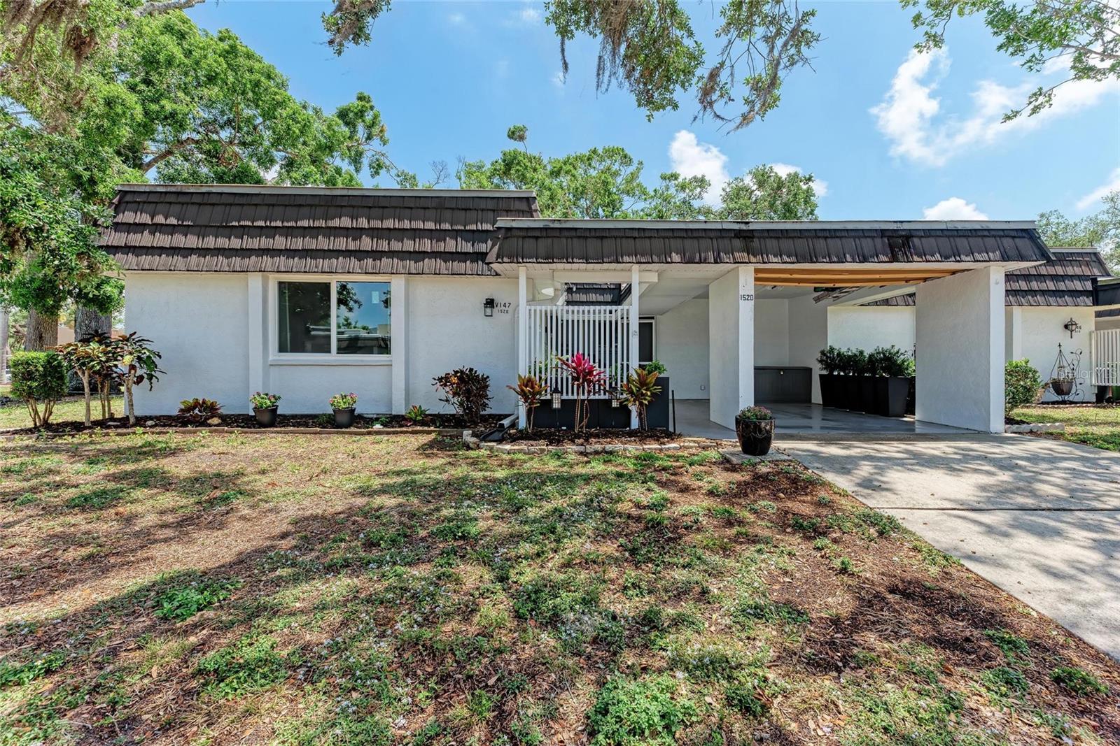 CLICK PICTURES TO SEE MORE! LOOKS LIKE A NEW MODEL HOME ON THE IN SIDE! Open floor plan with tons of light and picturesque views of the mature tropical landscaping across the back of the home!! Large sliding doors lead to the lanai! Updated END UNIT Villa in Glen Oaks Ridge - 55+ A French Provincial style home. Home has a NEW ROOF, Flood zone X the least minimal risk zone, NEW HURRICANE RATED WINDOWS for $13,000 in April 2025 and NEW WINDOW TREATMENTS, removed popcorn ceiling, NEW landscaping and had the home professionally painted including the walls, doors and trim! Kitchen cabinets were refinished, New light fixtures, Hot water heater is NEW in January 2024, and THE CLOSET REMODELED! This home has over 1,500 square feet that includes 2 bedrooms, 2 full bathrooms. Both bathrooms have been updated, Living room, dining room, den/study, Florida room plus a large laundry/utility room and it has a private driveway/carport not shared with others. Wait till you see this Beautifully updated kitchen that includes the removal of two walls to open it up, adding a breakfast bar, all new cabinetry, stone counters and back splash. No carpet here...tile floors throughout plus updated lighting and crown molding. Out front you have a newly screened front porch, a small courtyard, 1 car carport and a driveway for another car and plenty of guest parking across the street! Glen Oaks Ridge is a pet friendly and active community with a wonderful HEATED pool overlooking a large lake with a fountain, clubhouse with a library, fitness room, billiards and shuffleboard. LOCATION, LOCATION, LOCATION...walk to two parks, Bobby Jones golf course, short drive to plenty of shopping, UTC, downtown Sarasota, I-75, St. Armand's, Lido Beach, etc.