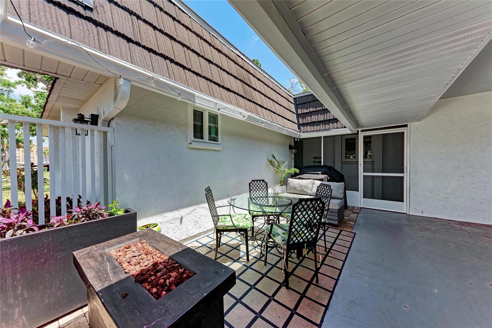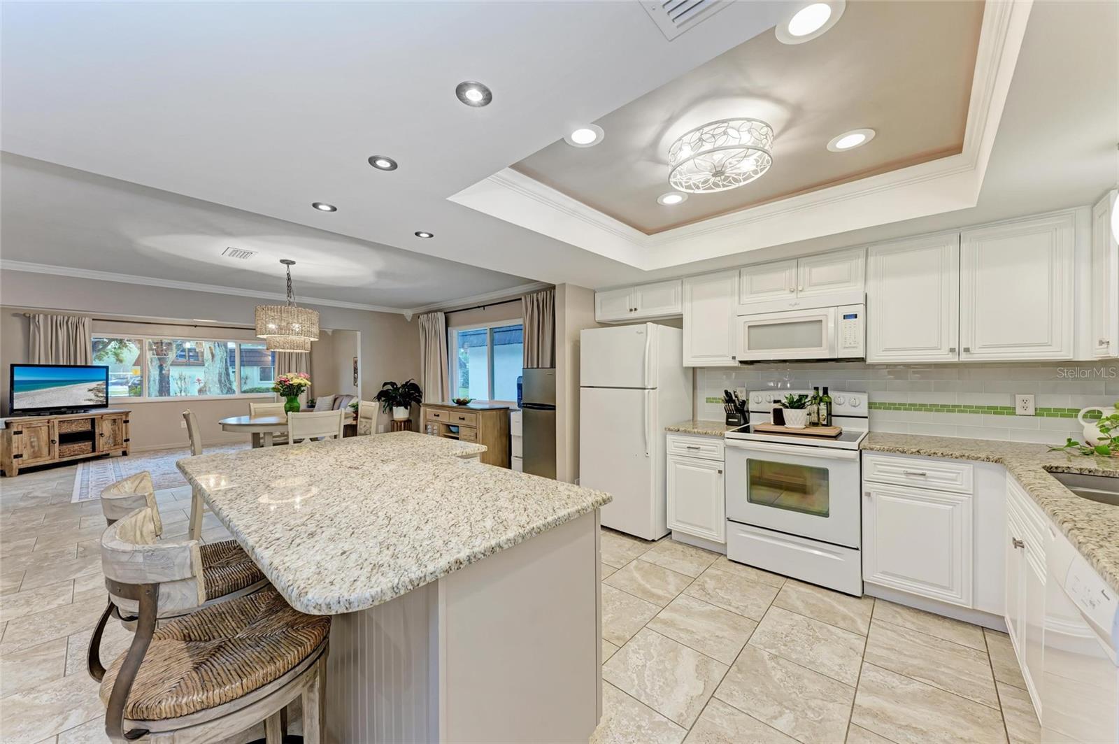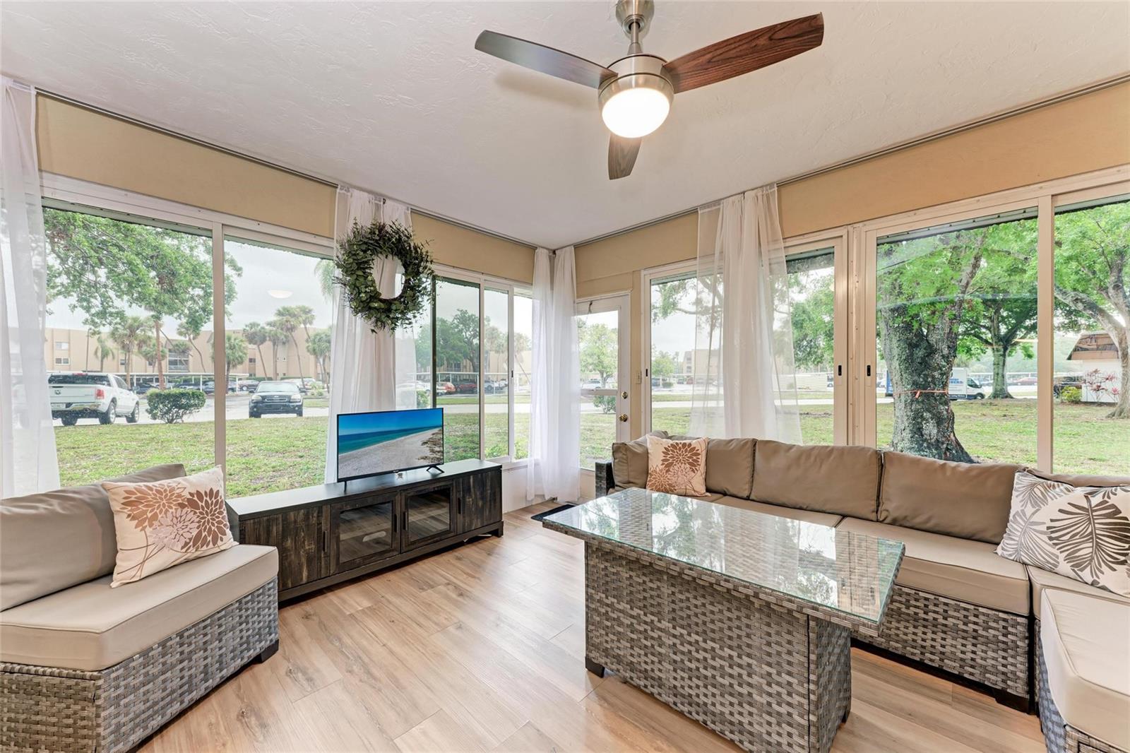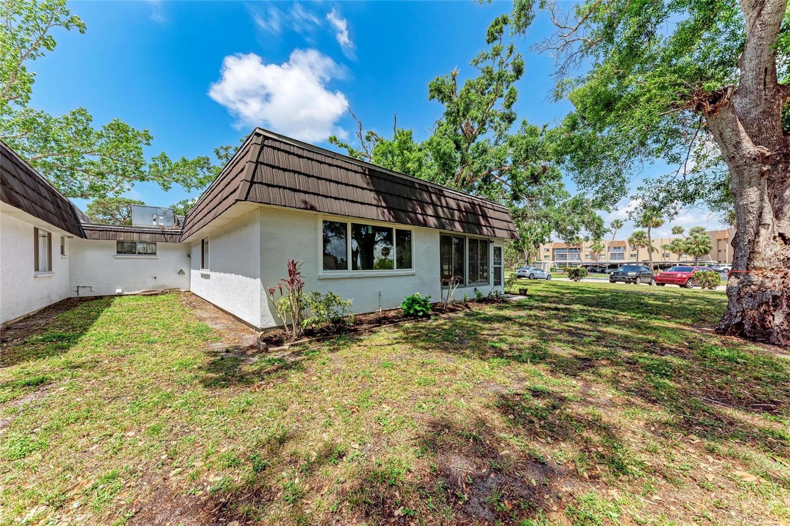CLICK PICTURES TO SEE MORE! LOOKS LIKE A NEW MODEL HOME ON THE IN SIDE! Open floor plan with tons of light and picturesque views of the mature tropical landscaping across the back of the home!! Large sliding doors lead to the lanai! Updated END UNIT Villa in Glen Oaks Ridge - 55+ A French Provincial style home. Home has a NEW ROOF, Flood zone X the least minimal risk zone, NEW HURRICANE RATED WINDOWS for $13,000 in April 2025 and NEW WINDOW TREATMENTS, removed popcorn ceiling, NEW landscaping and had the home professionally painted including the walls, doors and trim! Kitchen cabinets were refinished, New light fixtures, Hot water heater is NEW in January 2024, and THE CLOSET REMODELED! This home has over 1,500 square feet that includes 2 bedrooms, 2 full bathrooms. Both bathrooms have been updated, Living room, dining room, den/study, Florida room plus a large laundry/utility room and it has a private driveway/carport not shared with others. Wait till you see this Beautifully updated kitchen that includes the removal of two walls to open it up, adding a breakfast bar, all new cabinetry, stone counters and back splash. No carpet here...tile floors throughout plus updated lighting and crown molding. Out front you have a newly screened front porch, a small courtyard, 1 car carport and a driveway for another car and plenty of guest parking across the street! Glen Oaks Ridge is a pet friendly and active community with a wonderful HEATED pool overlooking a large lake with a fountain, clubhouse with a library, fitness room, billiards and shuffleboard. LOCATION, LOCATION, LOCATION...walk to two parks, Bobby Jones golf course, short drive to plenty of shopping, UTC, downtown Sarasota, I-75, St. Armand's, Lido Beach, etc.