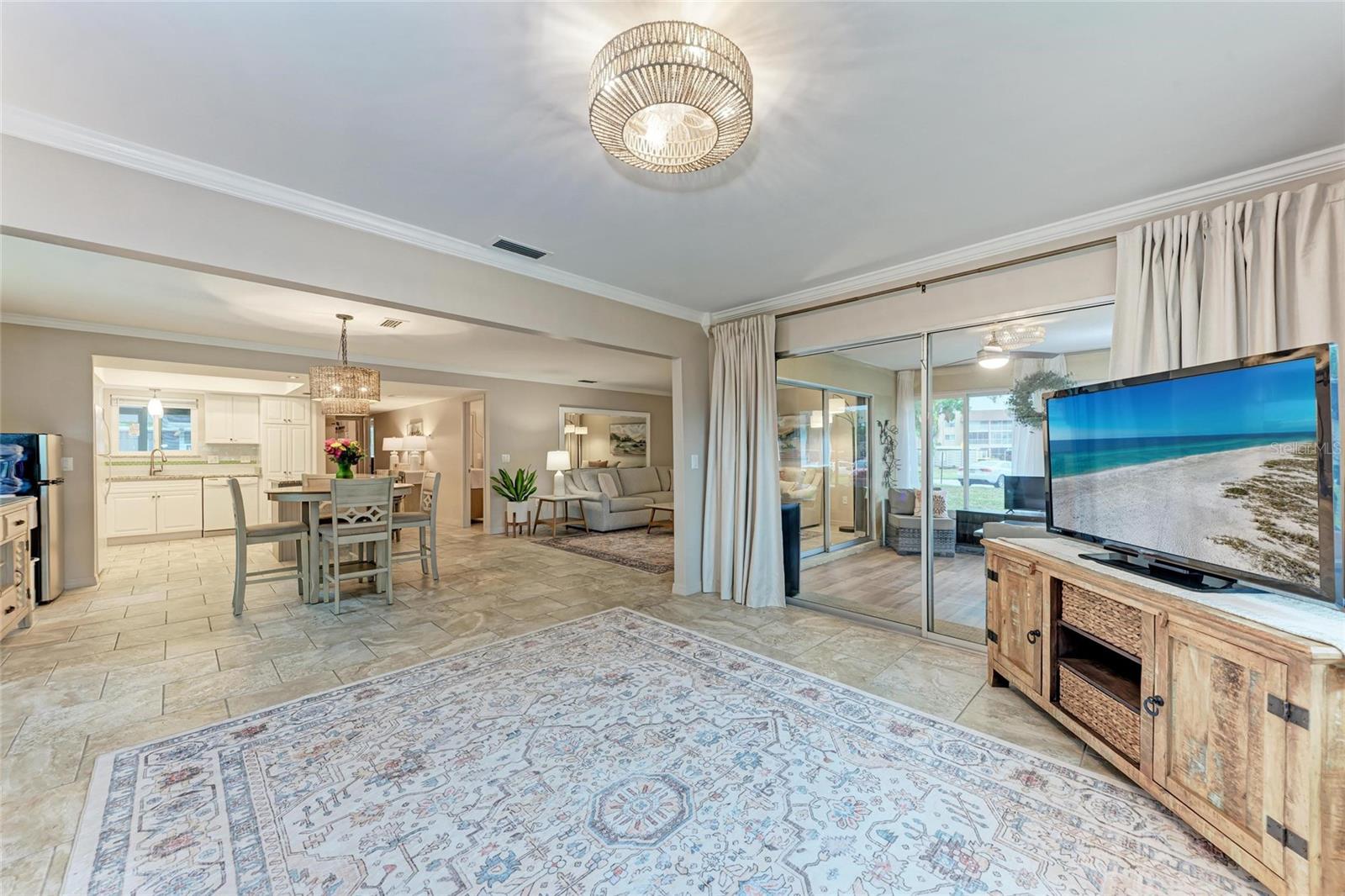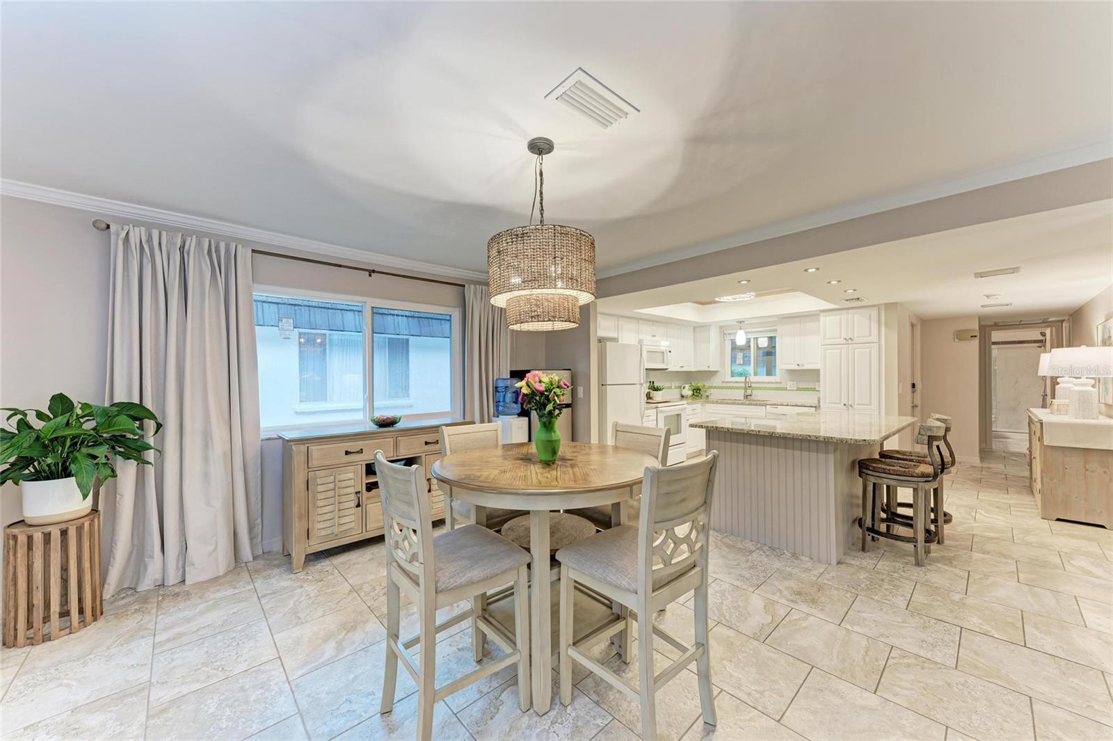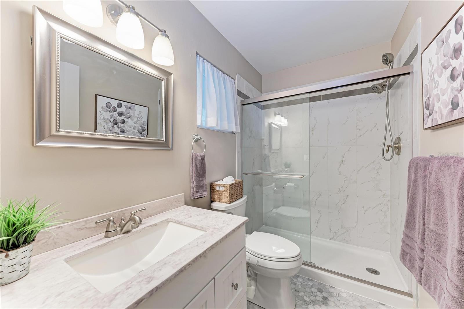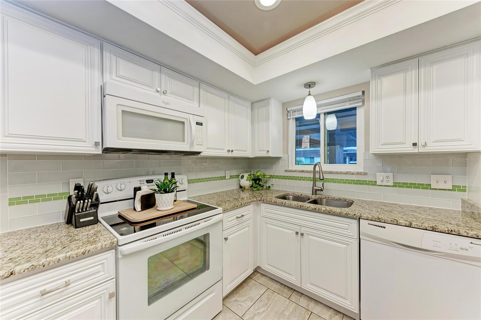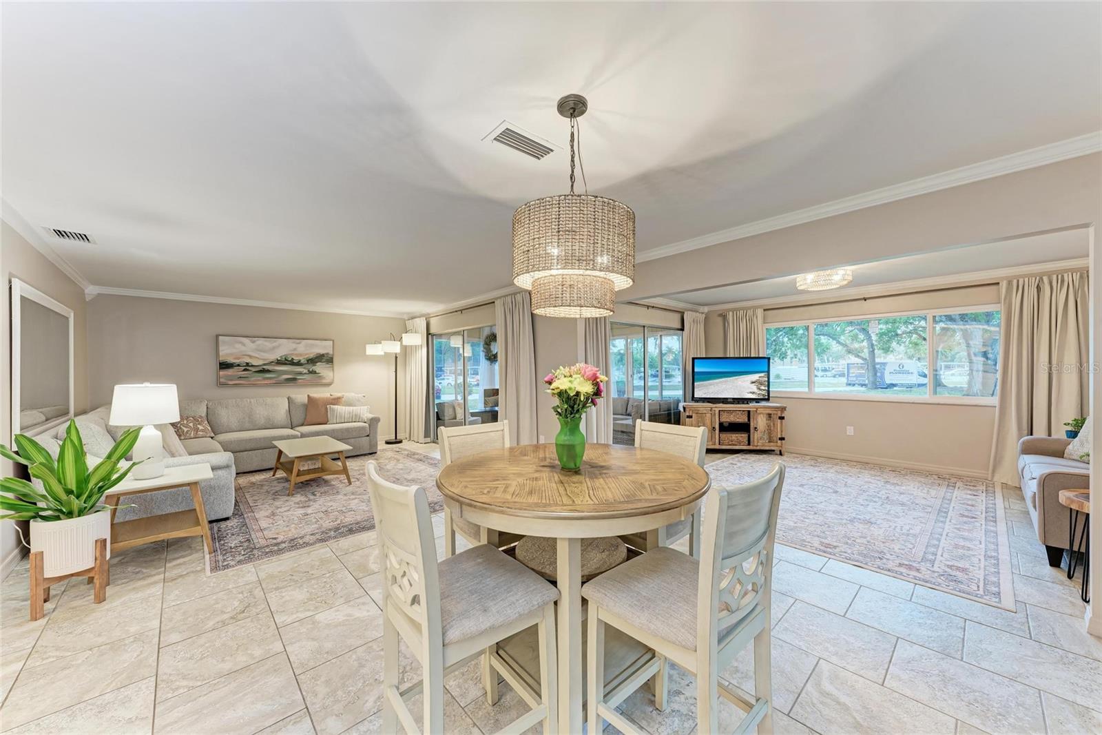 CLICK PICTURES TO SEE MORE! LOOKS LIKE A NEW MODEL HOME ON THE IN SIDE! Open floor plan with tons of light and picturesque views of the mature tropical landscaping across the back of the home!! Large sliding doors lead to the lanai! Updated END UNIT Villa in Glen Oaks Ridge - 55+ A French Provincial style home. Home has a NEW ROOF, Flood zone X the least minimal risk zone, NEW HURRICANE RATED WINDOWS for $13,000 in April 2025 and NEW WINDOW TREATMENTS, removed popcorn ceiling, NEW landscaping and had the home professionally painted including the walls, doors and trim! Kitchen cabinets were refinished, New light fixtures, Hot water heater is NEW in January 2024, and THE CLOSET REMODELED! This home has over 1,500 square feet that includes 2 bedrooms, 2 full bathrooms. Both bathrooms have been updated, Living room, dining room, den/study, Florida room plus a large laundry/utility room and it has a private driveway/carport not shared with others. Wait till you see this Beautifully updated kitchen that includes the removal of two walls to open it up, adding a breakfast bar, all new cabinetry, stone counters and back splash. No carpet here...tile floors throughout plus updated lighting and crown molding. Out front you have a newly screened front porch, a small courtyard, 1 car carport and a driveway for another car and plenty of guest parking across the street! Glen Oaks Ridge is a pet friendly and active community with a wonderful HEATED pool overlooking a large lake with a fountain, clubhouse with a library, fitness room, billiards and shuffleboard. LOCATION, LOCATION, LOCATION...walk to two parks, Bobby Jones golf course, short drive to plenty of shopping, UTC, downtown Sarasota, I-75, St. Armand's, Lido Beach, etc.