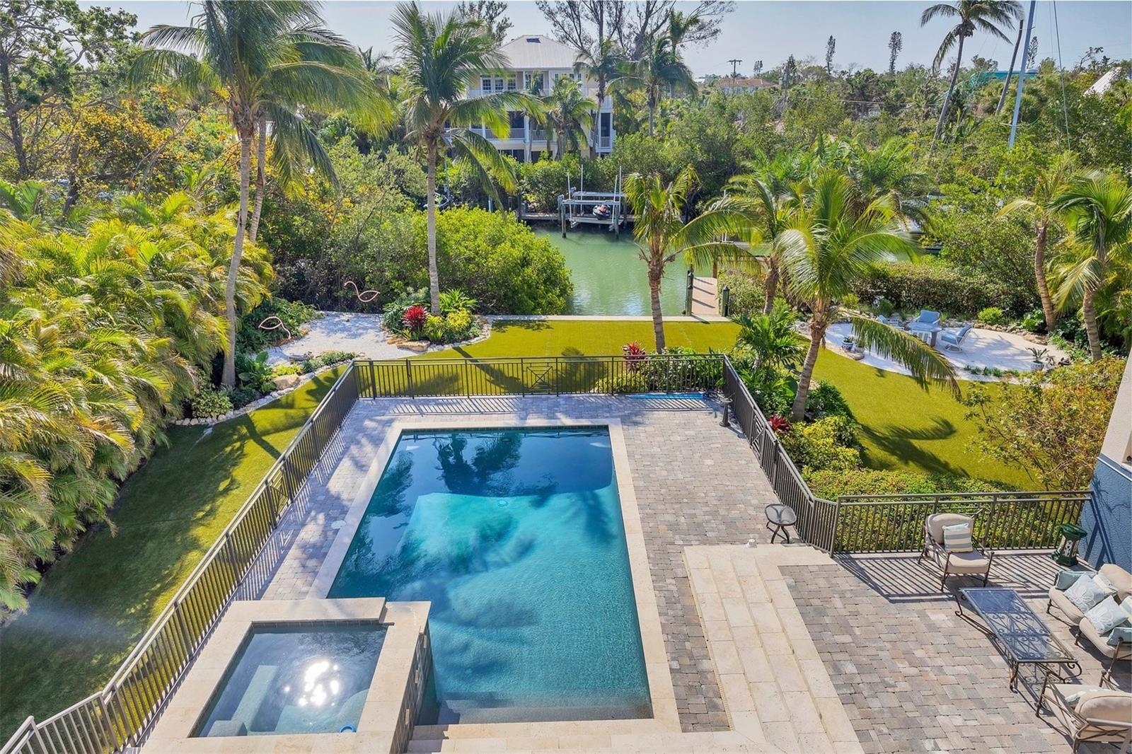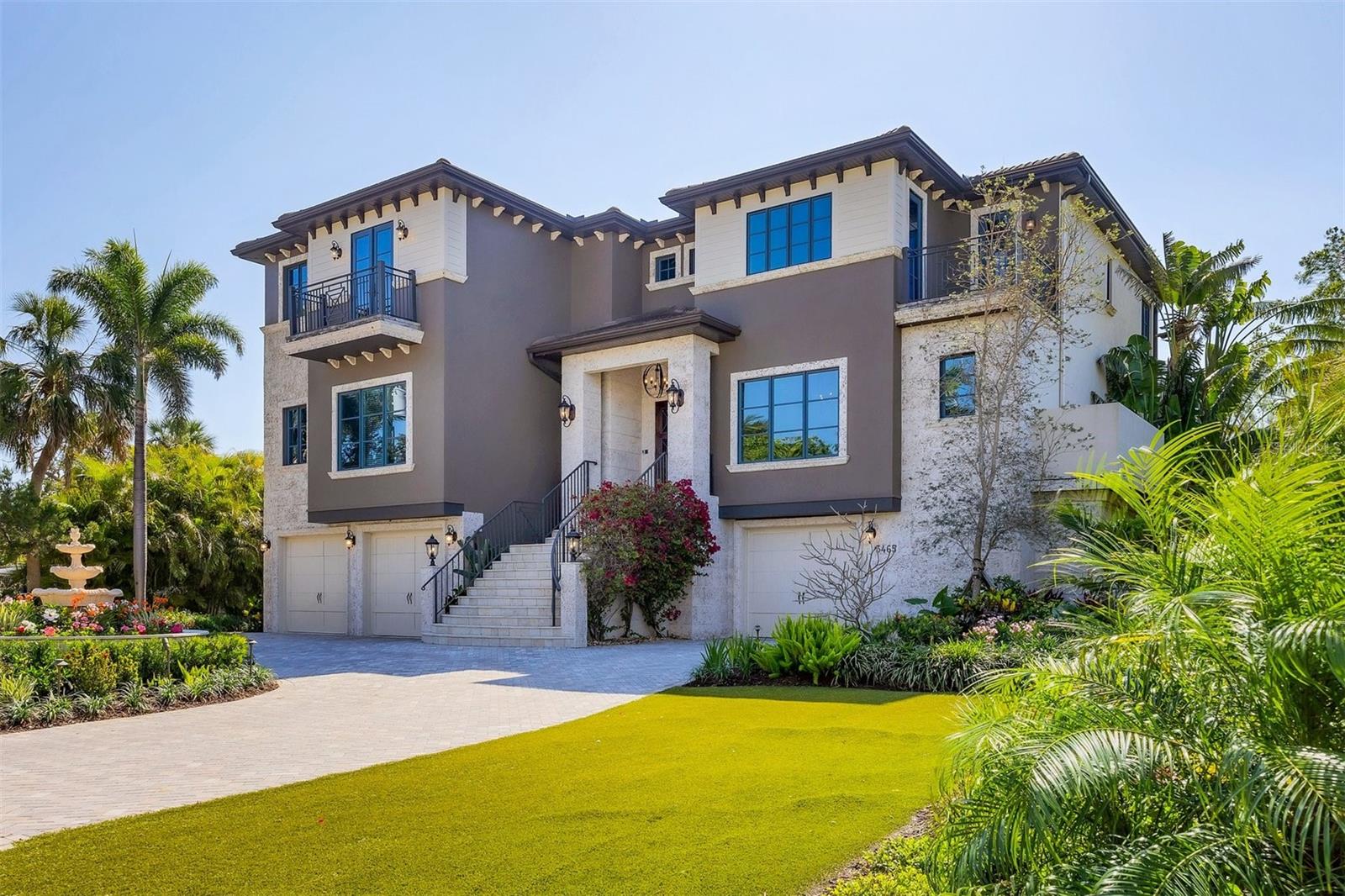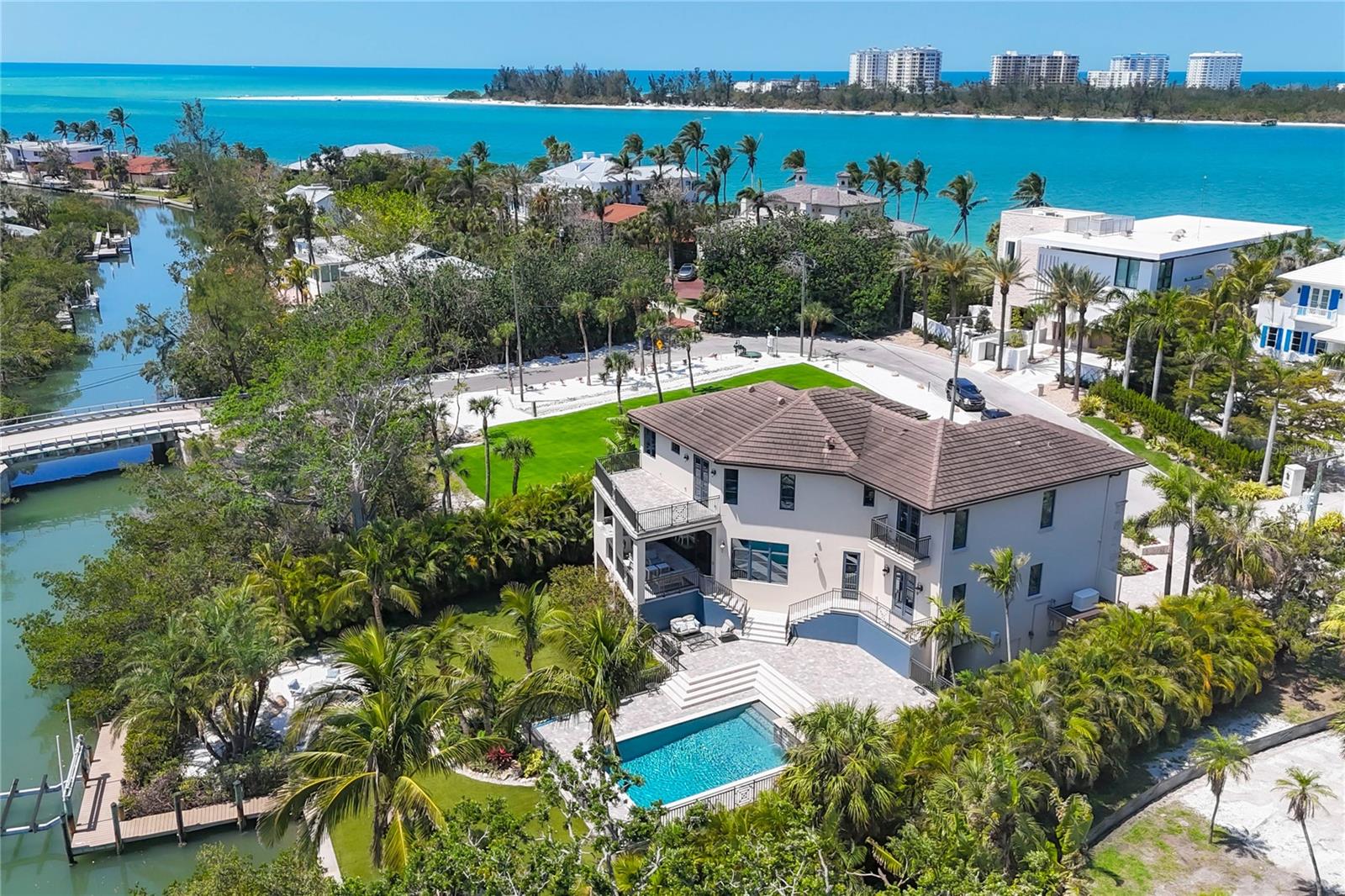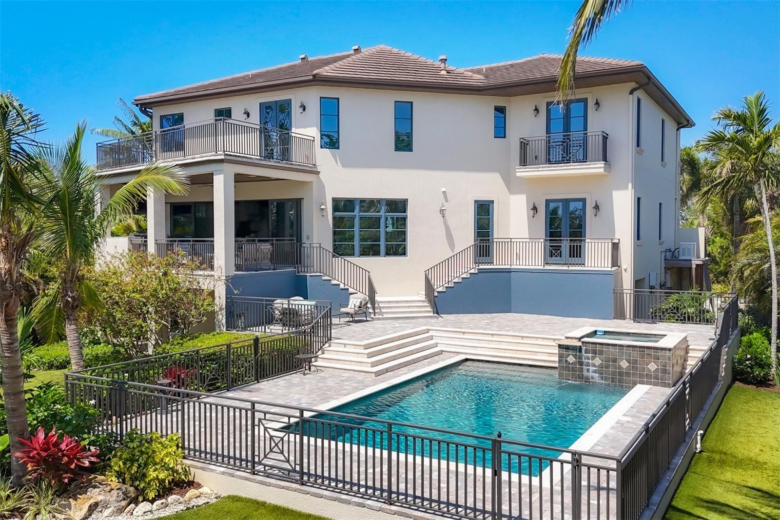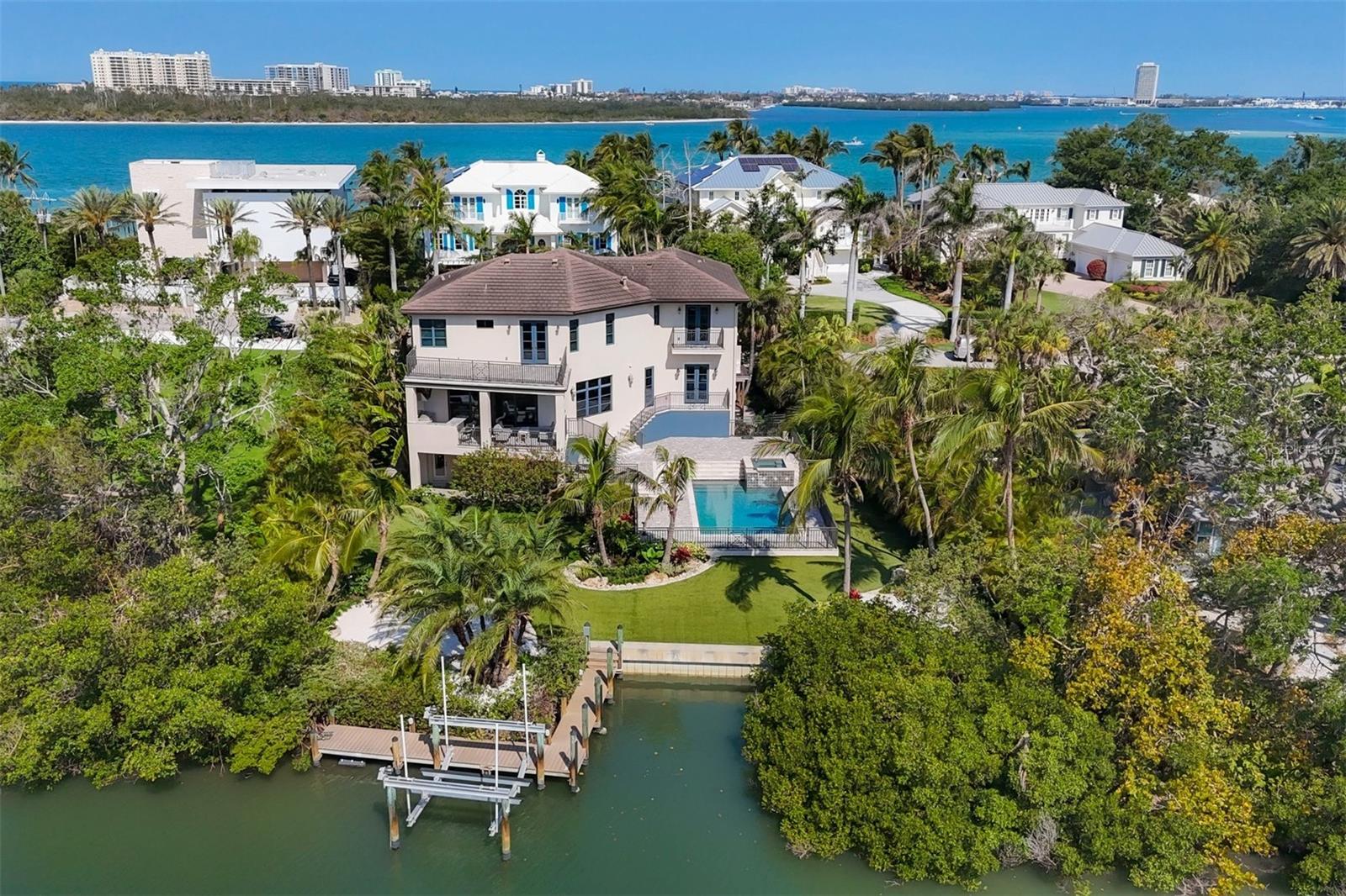 One or more photo(s) has been virtually staged. *Located on the north end of Siesta Key, this custom-built luxury waterfront home sits on a very private lot, surrounded by lush tropical landscaping and mature coconut palms. Perfectly positioned on a coastal playground just off Big Pass, it offers deep-water access, boating convenience, and serene natural beauty. The flexible layout includes 5 en-suite bedrooms, an elevator to all three levels, and a spacious main-level suite ideal for guests or multigenerational living. An engineer-approved option to remove a non-load-bearing wall allows for easy creation of a great room concept—a virtual rendering is included in the photo gallery to illustrate the potential. The chef’s kitchen features GE Monogram and Fisher & Paykel appliances, a butler’s pantry, beverage station, and pocketing glass doors opening to a full summer kitchen, PebbleTec saltwater pool and spa, and lush outdoor spaces. Hurricane-rated windows and doors, elevated construction, and a full-home generator protected the interior during recent storms—no water intrusion or damage occurred, with water reaching only the garage level. Extras include a 13,000 lb. lift, composite dock, 3-car garage with EV charger, whole-house water filtration, security system, and ample storage. A rare opportunity to own a private, resilient, and reimagined Siesta Key waterfront retreat.