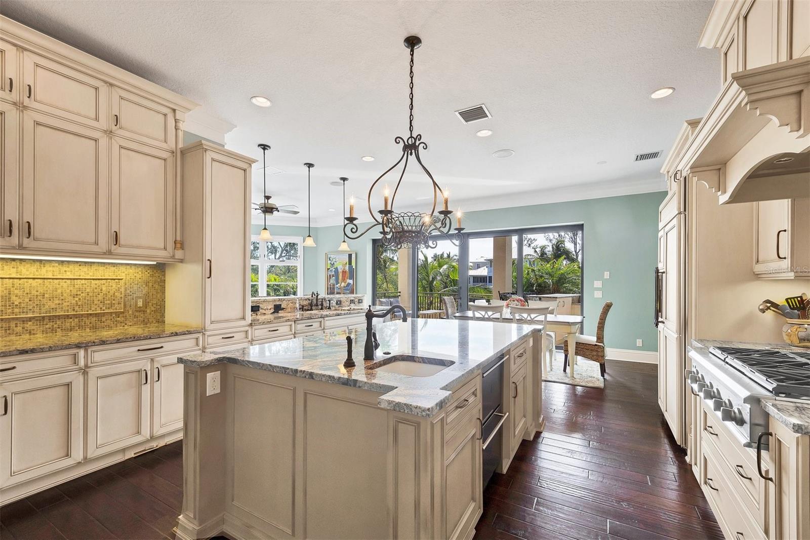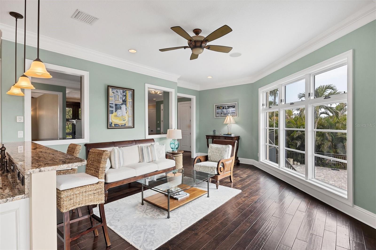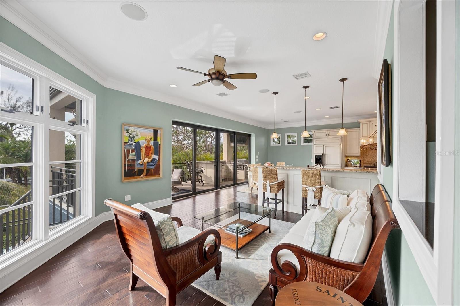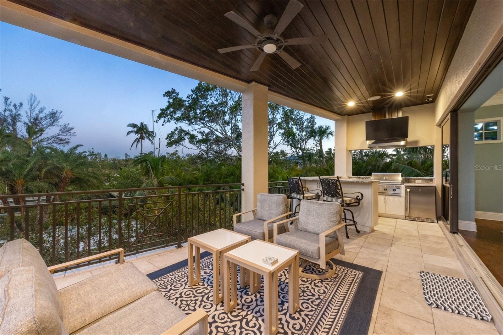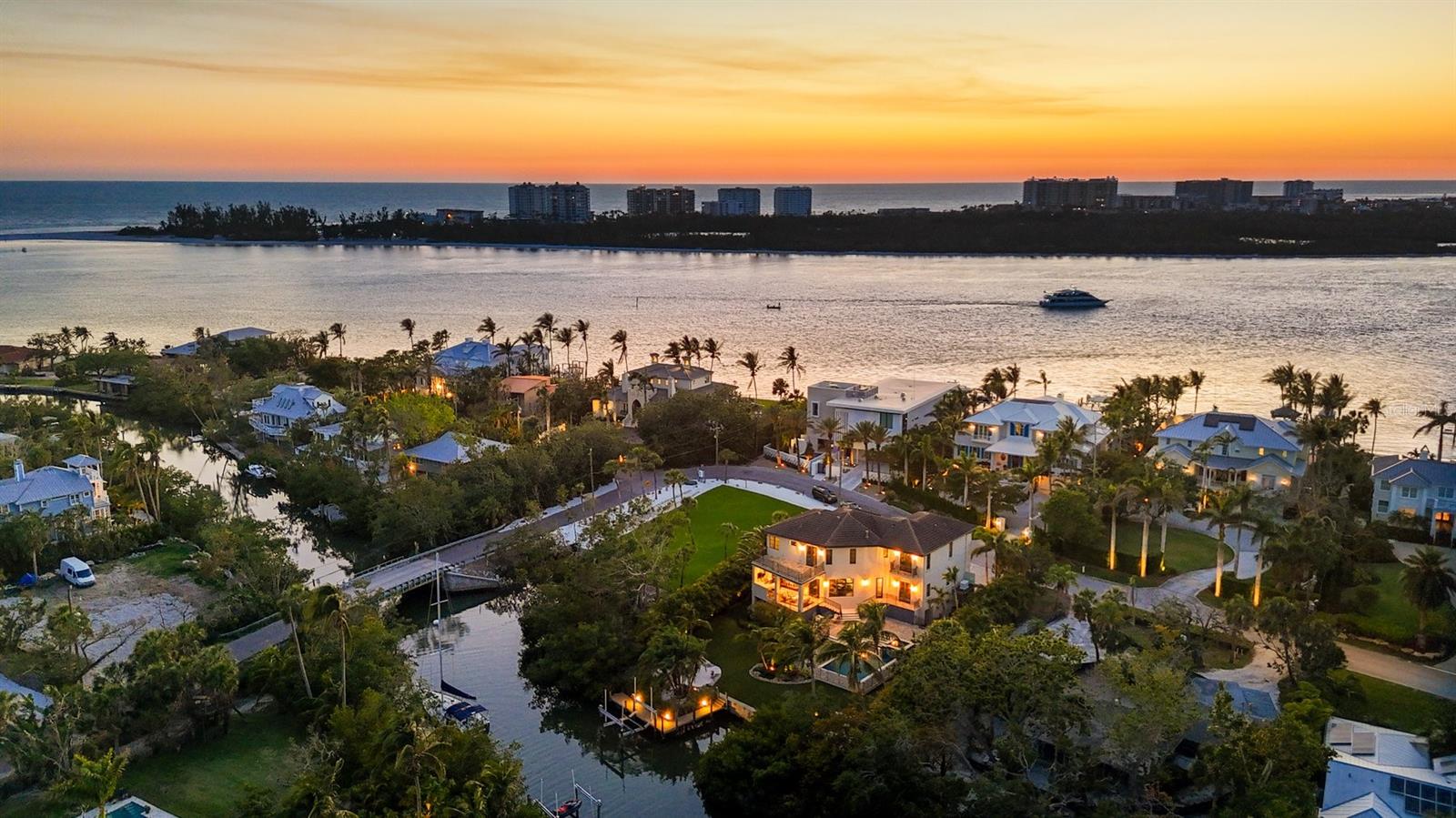 One or more photo(s) has been virtually staged. *Located on the north end of Siesta Key, this custom-built luxury waterfront home sits on a very private lot, surrounded by lush tropical landscaping and mature coconut palms. Perfectly positioned on a coastal playground just off Big Pass, it offers deep-water access, boating convenience, and serene natural beauty. The flexible layout includes 5 en-suite bedrooms, an elevator to all three levels, and a spacious main-level suite ideal for guests or multigenerational living. An engineer-approved option to remove a non-load-bearing wall allows for easy creation of a great room concept—a virtual rendering is included in the photo gallery to illustrate the potential. The chef’s kitchen features GE Monogram and Fisher & Paykel appliances, a butler’s pantry, beverage station, and pocketing glass doors opening to a full summer kitchen, PebbleTec saltwater pool and spa, and lush outdoor spaces. Hurricane-rated windows and doors, elevated construction, and a full-home generator protected the interior during recent storms—no water intrusion or damage occurred, with water reaching only the garage level. Extras include a 13,000 lb. lift, composite dock, 3-car garage with EV charger, whole-house water filtration, security system, and ample storage. A rare opportunity to own a private, resilient, and reimagined Siesta Key waterfront retreat.