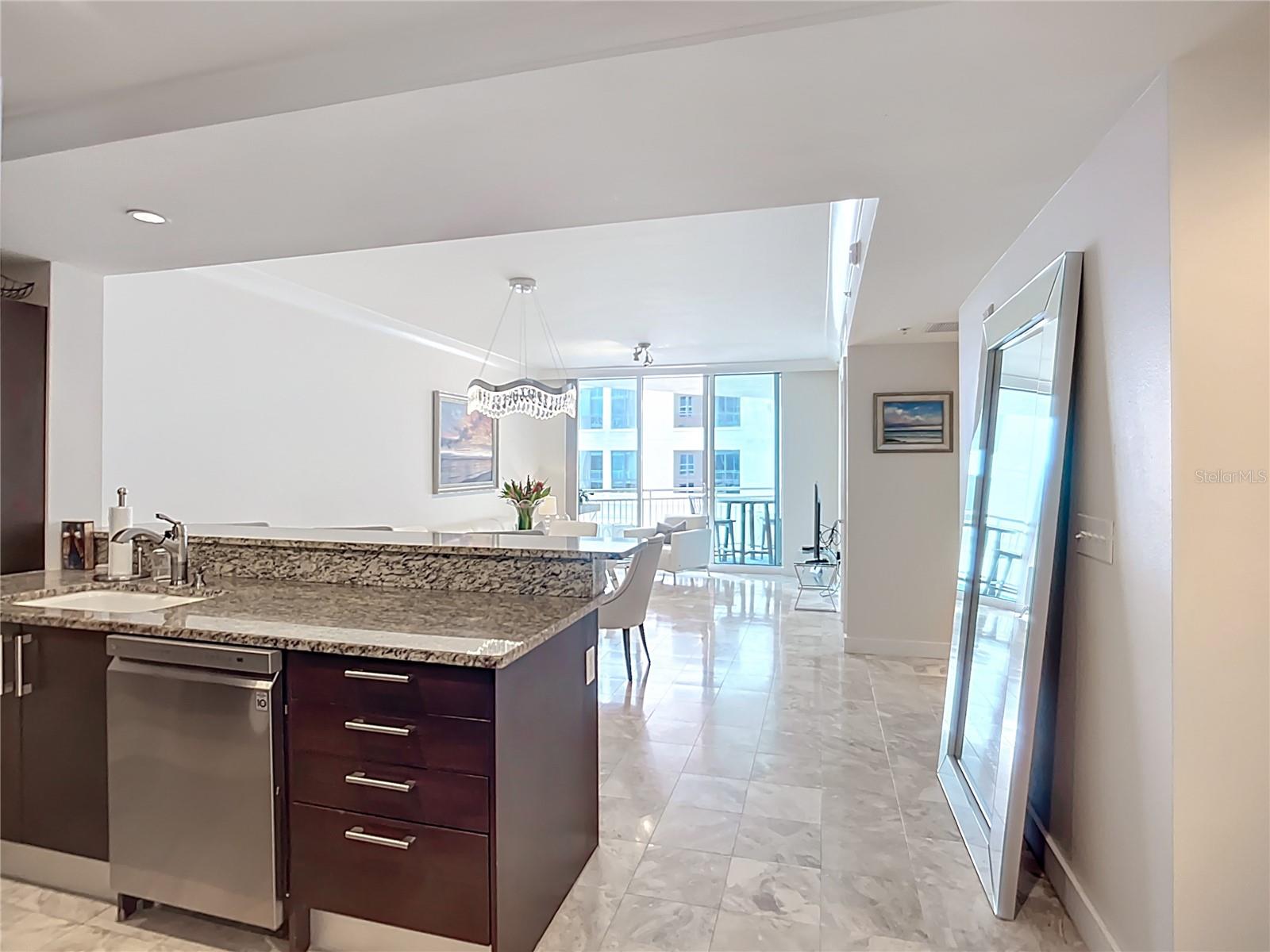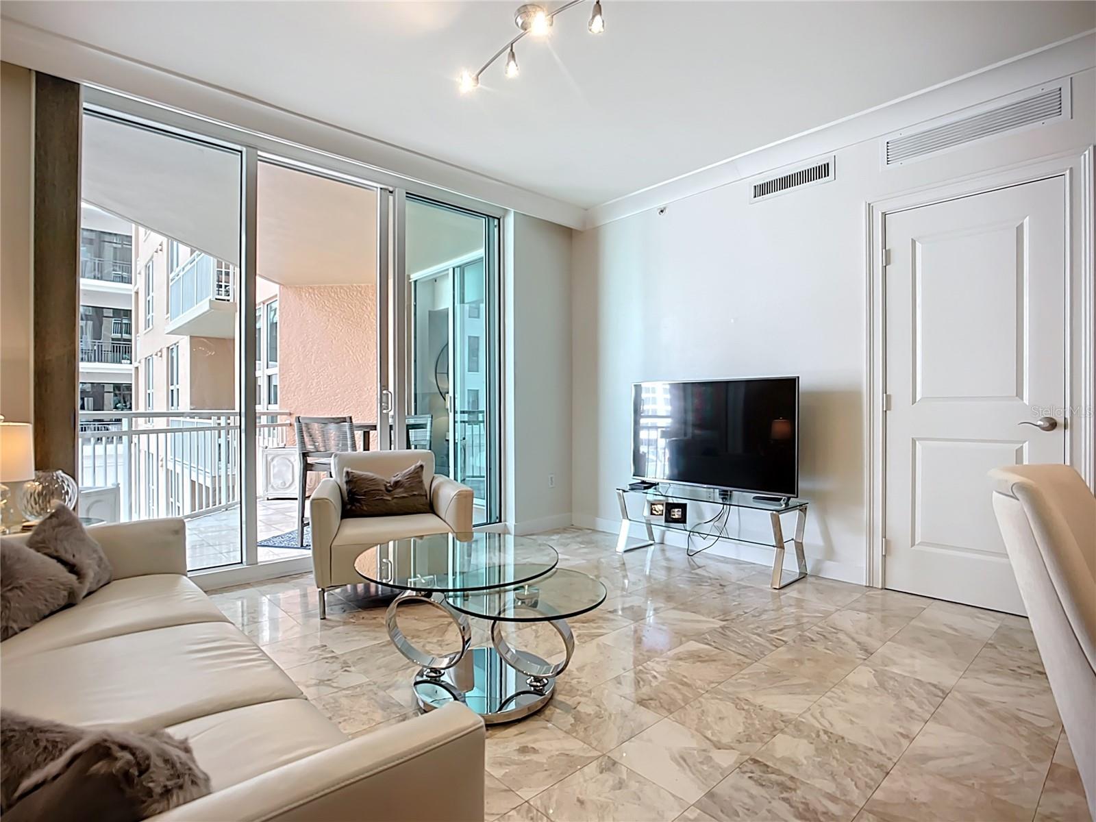 Welcome to 1350 Main, beautiful downtown Sarasota. This 1 bedroom, 1.5 bath condo with oversized balcony over looking the sparkling pool, and hot tub. There is access to the balcony from the master bedroom and living room, great for entertaining. This unit is light and bright, beautiful wood flooring in the bedroom and marble throughout the rest of the unit. This building offers so much, 24 hour concierge services, lap pool and spa, out door grill and fire pit, library, pool table, conference room, fitness, assigned garage covered parking, climate controlled storage space also a beautiful guest suite you can reserve for family and friends. Enjoy the energy living downtown, you're just steps away from top restaurants, art galleries, shopping, Opera House, Van Wezel, Burns Court Cinema, Selby Gardens. you can also hop on a trolly to go to St Armand's and Lido Beach. Schedule today to view!