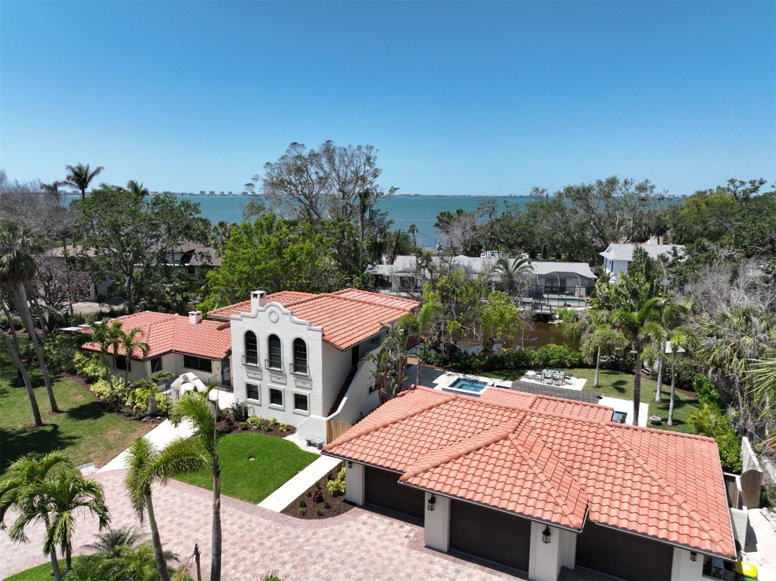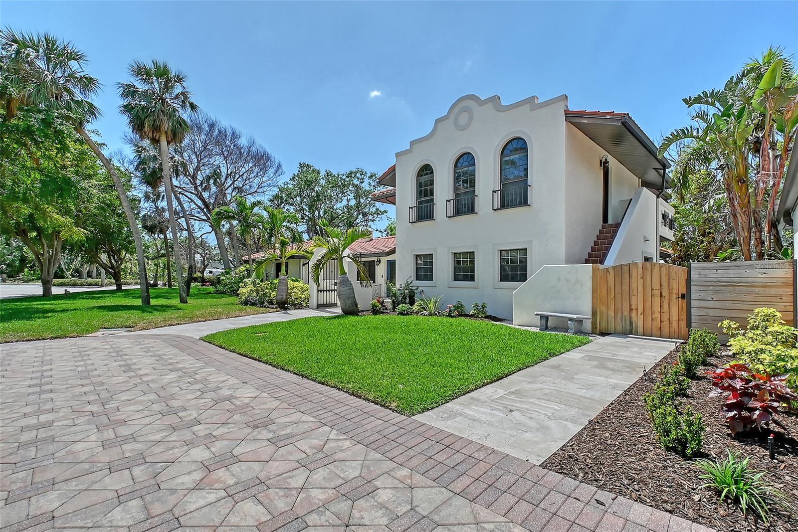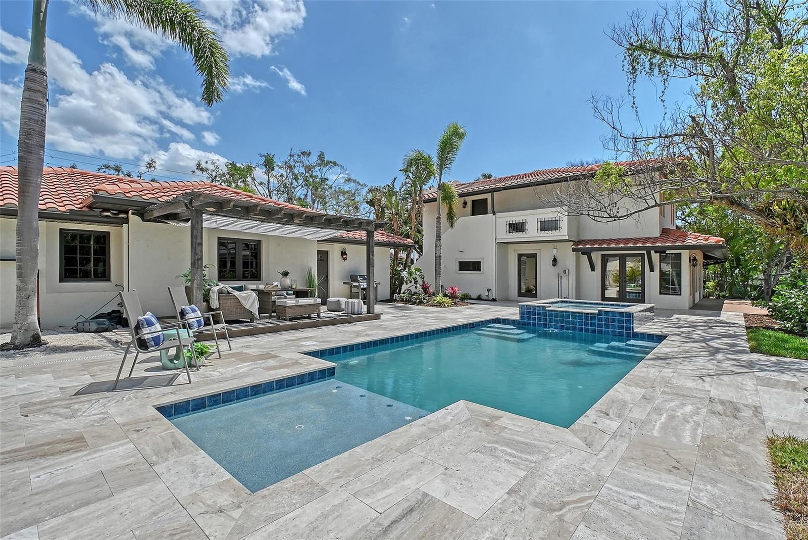 Welcome to this beautifully updated Indian Beach Sapphire Shores West of Trail residence, ideally located just steps from the Bay with quick access to downtown Sarasota, SRQ Airport, UTC Mall, and the white sands of Lido Beach. Nestled on a lushly landscaped half-acre lot, this smart home is a rare blend of comfort, elegance, and indoor-outdoor living. Offering 2,974 square feet of refined space, this 3-bedroom, 2.5-bath home features a spacious layout ideal for both everyday living and entertaining. The heart of the home is the expansive gourmet kitchen, appointed with Miele appliances, an oversized kitchen island with breakfast bar, wood-beam ceilings, and an open flow to flexible dining or family room space. The large living room is bathed in natural light from two large picture windows and a door to the back yard - perfect for seamless indoor-outdoor living. Bedroom 2 opens to a private screened porch through French doors — an inviting retreat for guests or family. Upstairs, the primary suite is a true sanctuary. Enjoy a cozy wood-burning fireplace, an open loft for a home office or den, and a private balcony with peek-a-boo views of Sarasota Bay sunsets. Step outside to discover an expansive shell stone pool deck with a heated pool, spa, and a shaded gazebo. Multiple areas for lounging and dining invite year-round entertaining in this private tropical haven. Additional features include an oversized, air-conditioned 3-car garage, brick paver circular drive with plenty of parking space, new interior paint, stylish plank tile flooring, and integrated smart home capabilities. This is a rare opportunity to own a thoughtfully designed and impeccably maintained home in one of Sarasota’s most desirable historic neighborhoods.