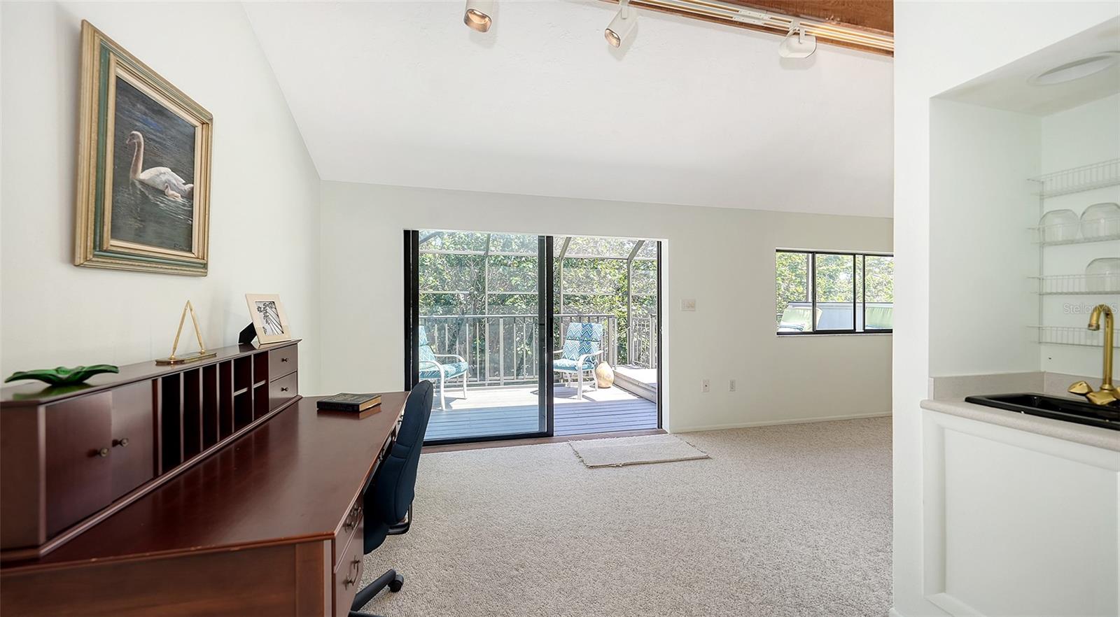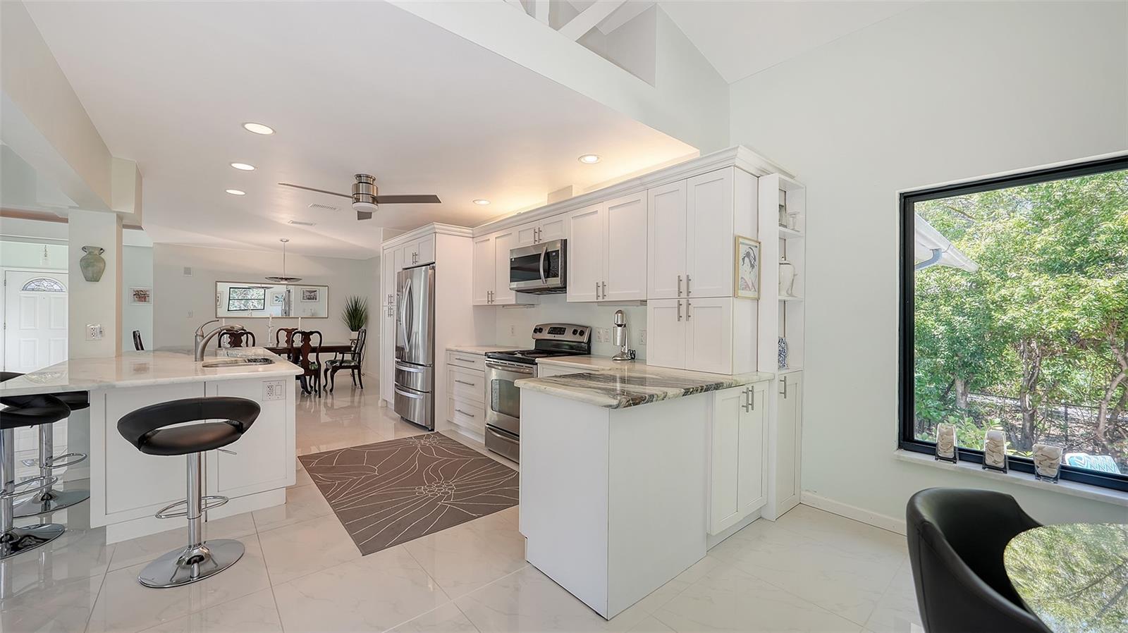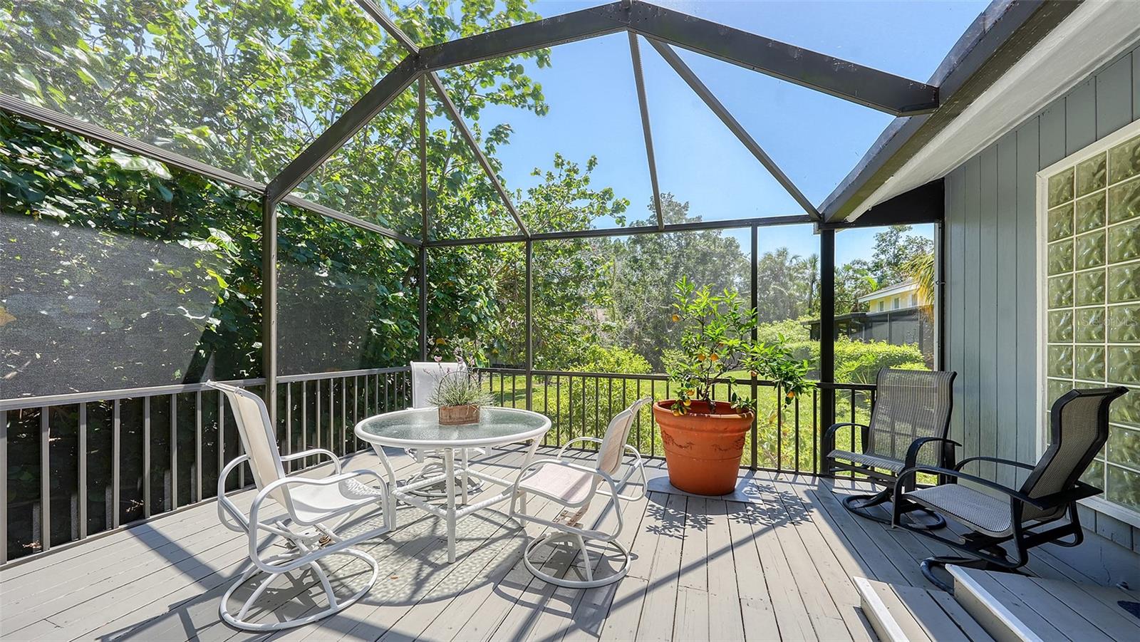 Welcome to this striking contemporary residence tucked away in the highly sought-after community of Siesta Cove—an established subdivision on Siesta Key. Located just moments from the powdery sands of Siesta Key Beach and Siesta Key Village. Built in 1980 and thoughtfully updated, this three-bedroom, four-bathroom home sits on a beautifully designed eco-friendly yard with tropical and native plants on a lot of over 1/4 of an acre. There has been NO HURRICANE DAMAGE OR FLOODING. From the moment you enter, you are greeted by soaring vaulted ceilings, abundant natural light, and a fluid open-concept floor plan designed for both everyday living and stylish entertaining. Rich porcelain tile and engineered hardwood flooring flow throughout the home, while large picture windows and sliding glass doors frame views of the lush exterior gardens and private lanai. The spacious living room features a cozy wood-burning fireplace and seamlessly transitions into the dining area and family room, creating an ideal gathering space. The well-appointed kitchen is equipped with stainless steel appliances, quartz countertops, built-in shelving, and a convenient wet bar, making it both functional, inviting and perfect for entertaining. The primary suite, located on the main floor, is a true retreat with engineered hardwood floors, a generous walk-in closet, a spa-inspired ensuite bath, and direct access to the lanai. Two additional bedrooms are also located on the main level, each served by their own full bathrooms. There is a den on the first floor that is currently used as a 4th bedroom. A versatile loft space on the second floor provides additional living flexibility—perfect for a home office, media room, playroom, or guest quarters. The rear of the home opens to a breathtaking two-story screened lanai—an architectural focal point that dramatically extends the living space outdoors. Surrounded by lush tropical landscaping, this impressive area includes multiple seating zones, a rear porch, patio, and an elevated deck—ideal for entertaining or simply enjoying the tranquil Sarasota evenings. Exterior highlights include garden lighting, sliding doors, rain gutters, and a welcoming front porch. Additional features of the home include a full-size laundry room with washer and dryer, an attic ventilator for improved airflow, ceiling fans in multiple rooms, window treatments throughout, and a programmable thermostat. The attached two-car garage provides ample storage and convenience. The home also benefits from underground utilities, street lighting, and is connected to public sewer and water.
