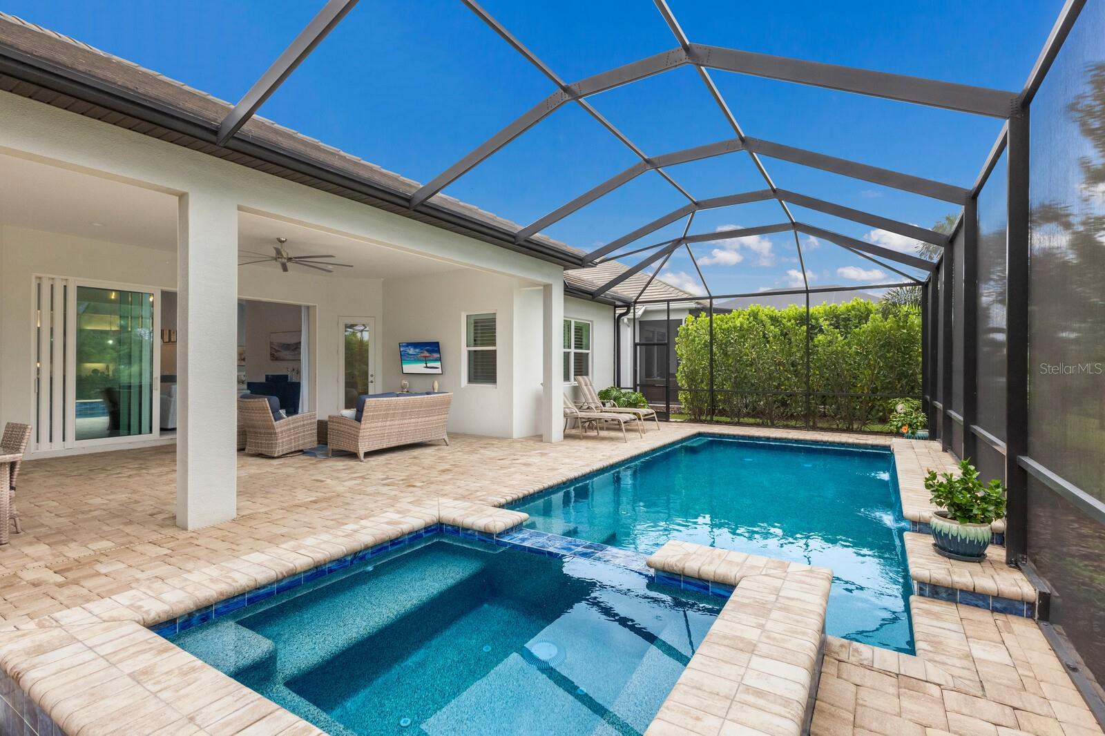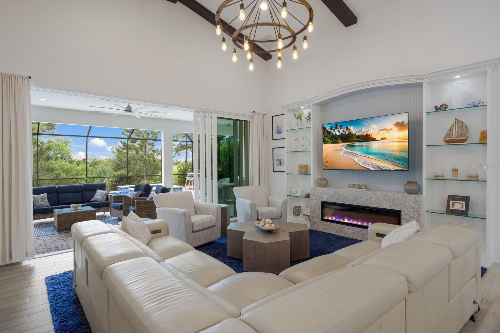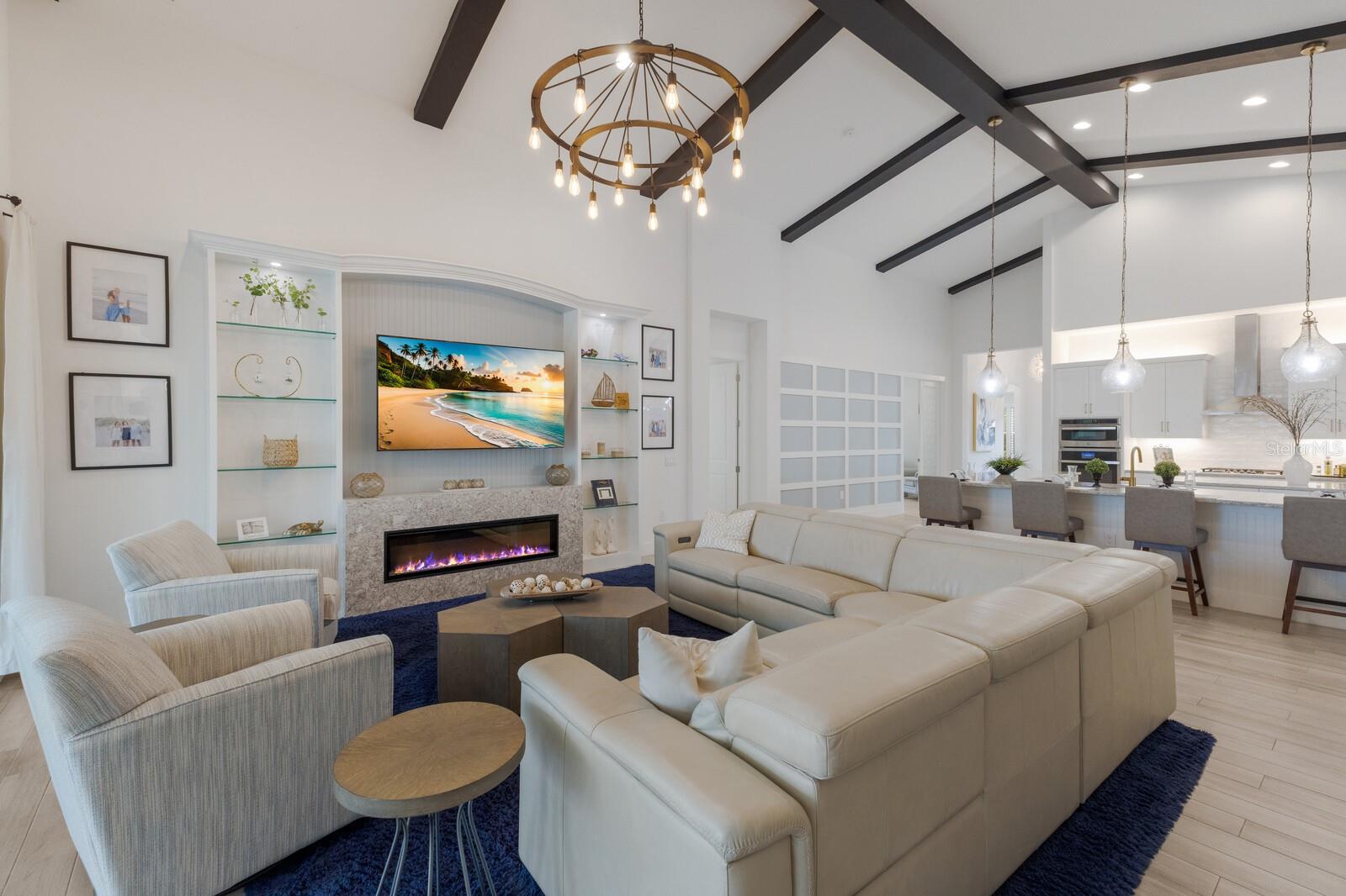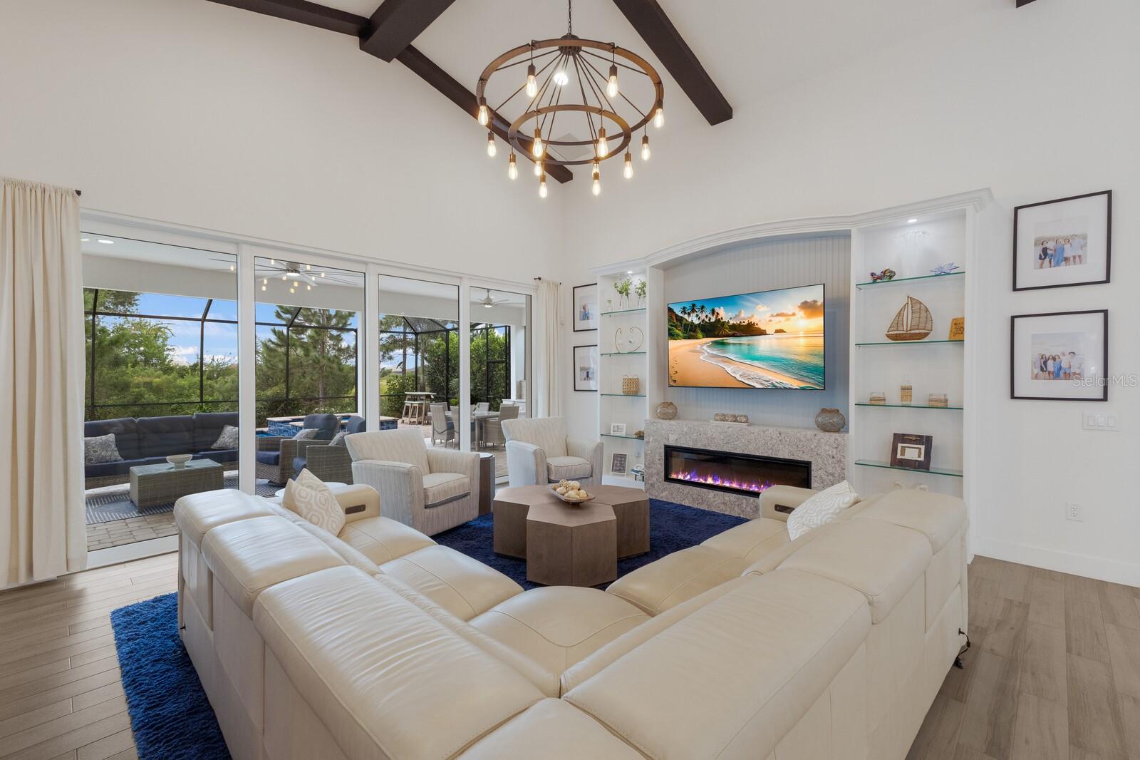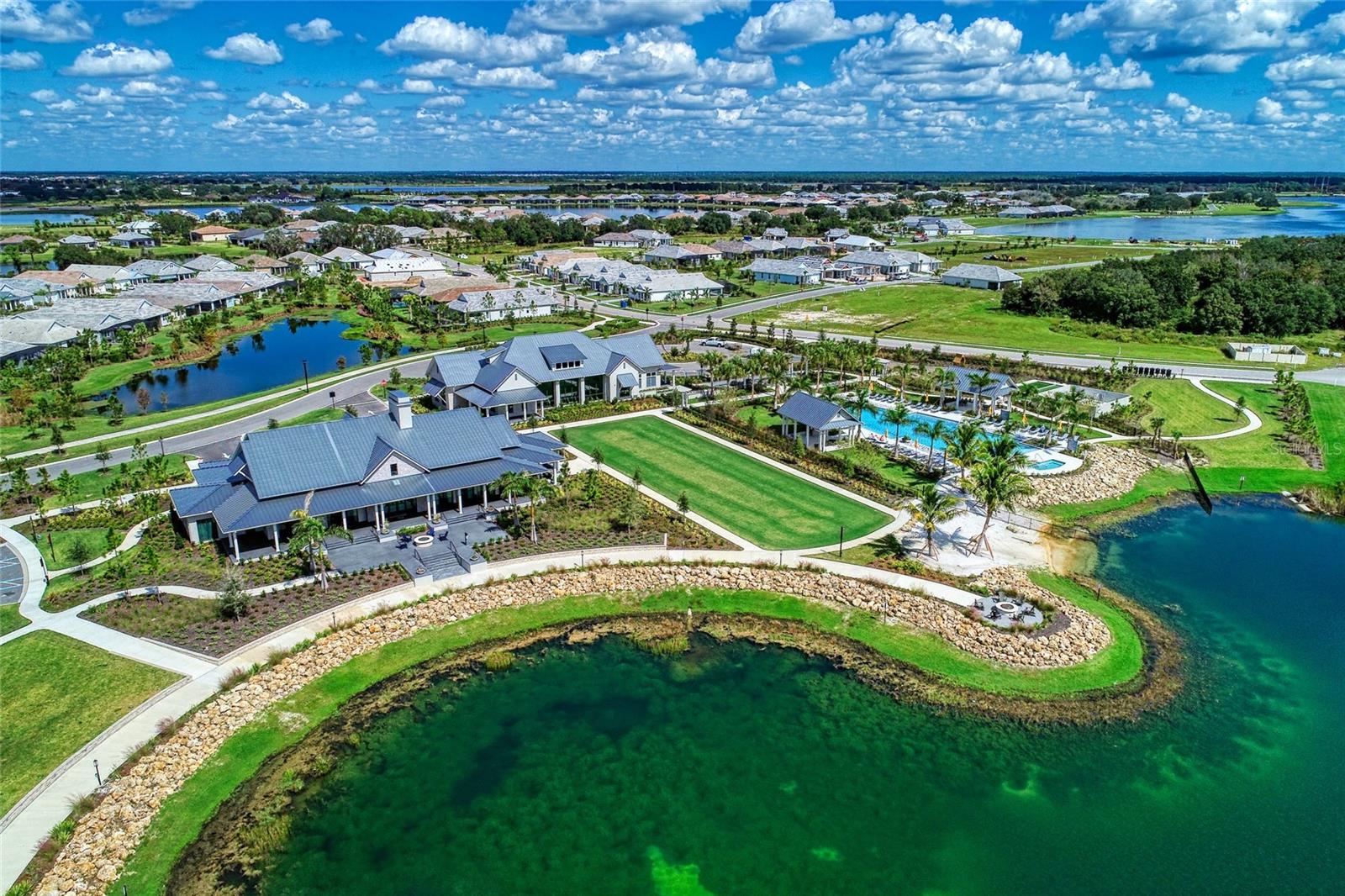 PRICE IMPROVEMENT and NEW PHOTOS! Welcome to the Weatherly floor plan by builder Homes by Towne. This one-story, four-bedroom, three bath, plus den home offers a great opportunity for those who love to entertain. Upon entering, you will be wowed by the vaulted ceiling, painted beams and open floor plan. The crown jewel of the home is the kitchen loaded with white custom cabinets, a double island, upgraded quartz tops and GE appliances. The outer island comfortably seats six, and inner island serves as a great workspace for all your baking and cooking creations. Want more space for all your kitchen tools and accessories? Enjoy the custom designed walk-in pantry with power for your coffee pot or toaster oven. Behind the kitchen, you will find a beverage bar for all your entertaining needs. Do you need extra storage space? No problem, the laundry room has a professionally designed double closet and a wall of cabinetry to store your overflow items, and the garage has custom built shelving for all your outdoor gear. Adjacent to the kitchen, there is a custom designed accent wall that can showcase 8x8 frames for artwork and photos or it can be freestanding. The light and bright great room offers a warm and cozy ambiance to sit back and watch your favorite tv shows or movie within the custom built in, lighted, glass shelves and quartz faced fireplace. Need to enjoy the FL sunshine? Head out to the lanai and watch a tv program, enjoy a meal prepared at the outdoor kitchen; cool off in the saltwater pool heated pool or relax and unwind in the hot tub all while watching the amazing sunsets over the preserve. Landscape maintenance is included in the HOA along with the fitness center, dog park, pickleball courts as well as a full-time director who offers all sorts of functions and activities so you can meet the neighbors and make new friends. Other notable features include a whole house Koehler generator, epoxy floors in the 3-car tandem garage, plantation shutters, custom closets in all four bedrooms, a security system, bead board and wainscoting woodwork, hurricane impact windows and professionally installed workstations in the den. Lakehouse Cove offers easy convenience to Waterside Place, the latest entertainment hub offering dining, shopping, an award-winning weekly farmers market, Ranch Night with food trucks and weekly corn hole tournaments.