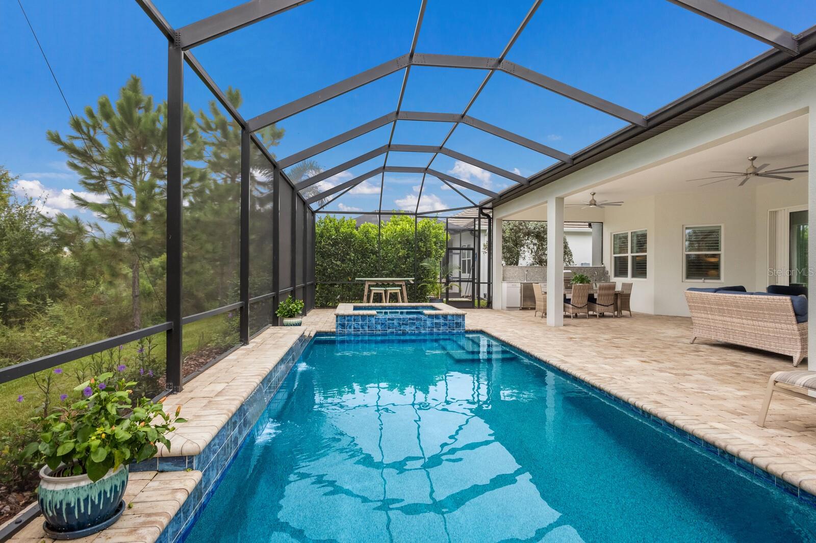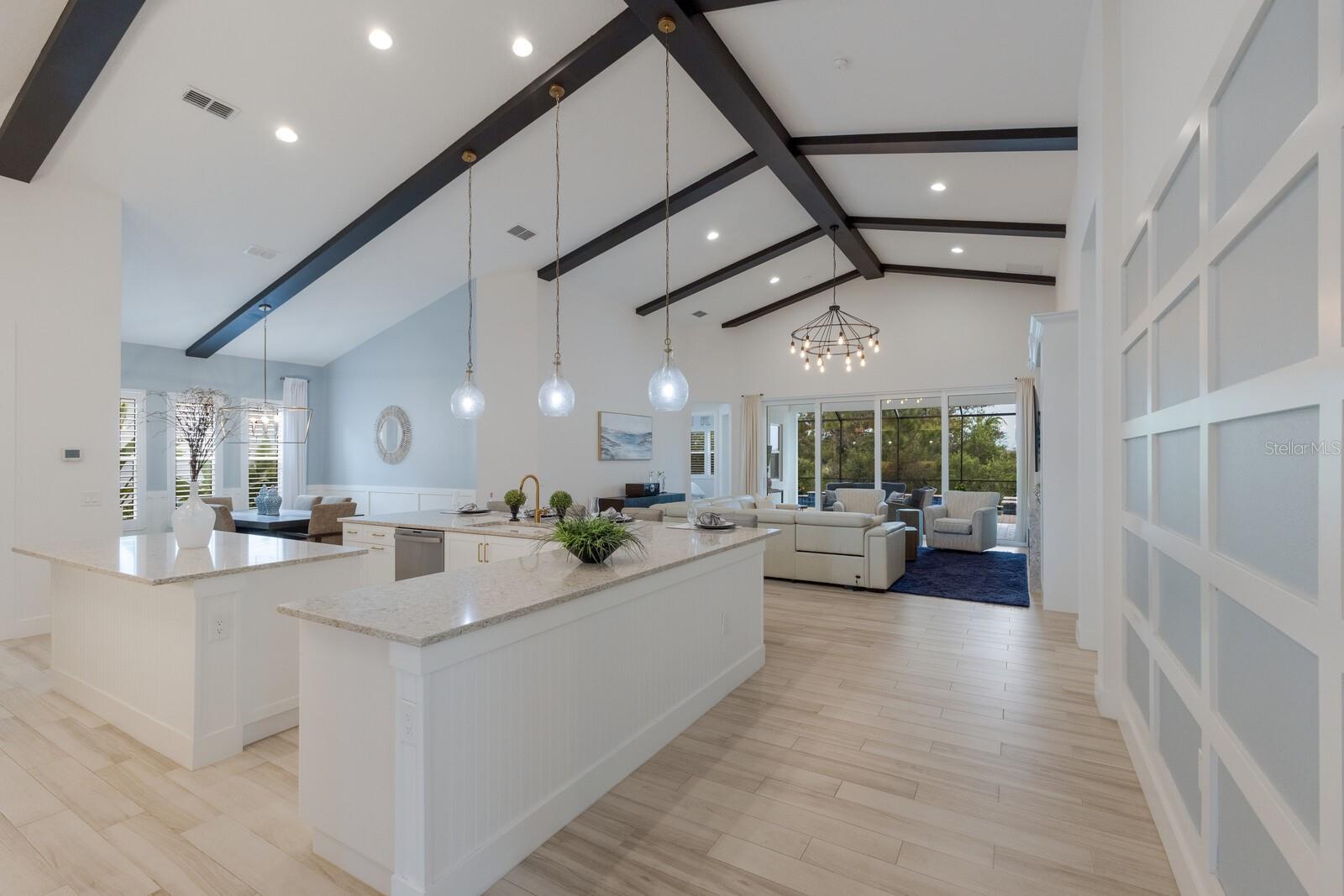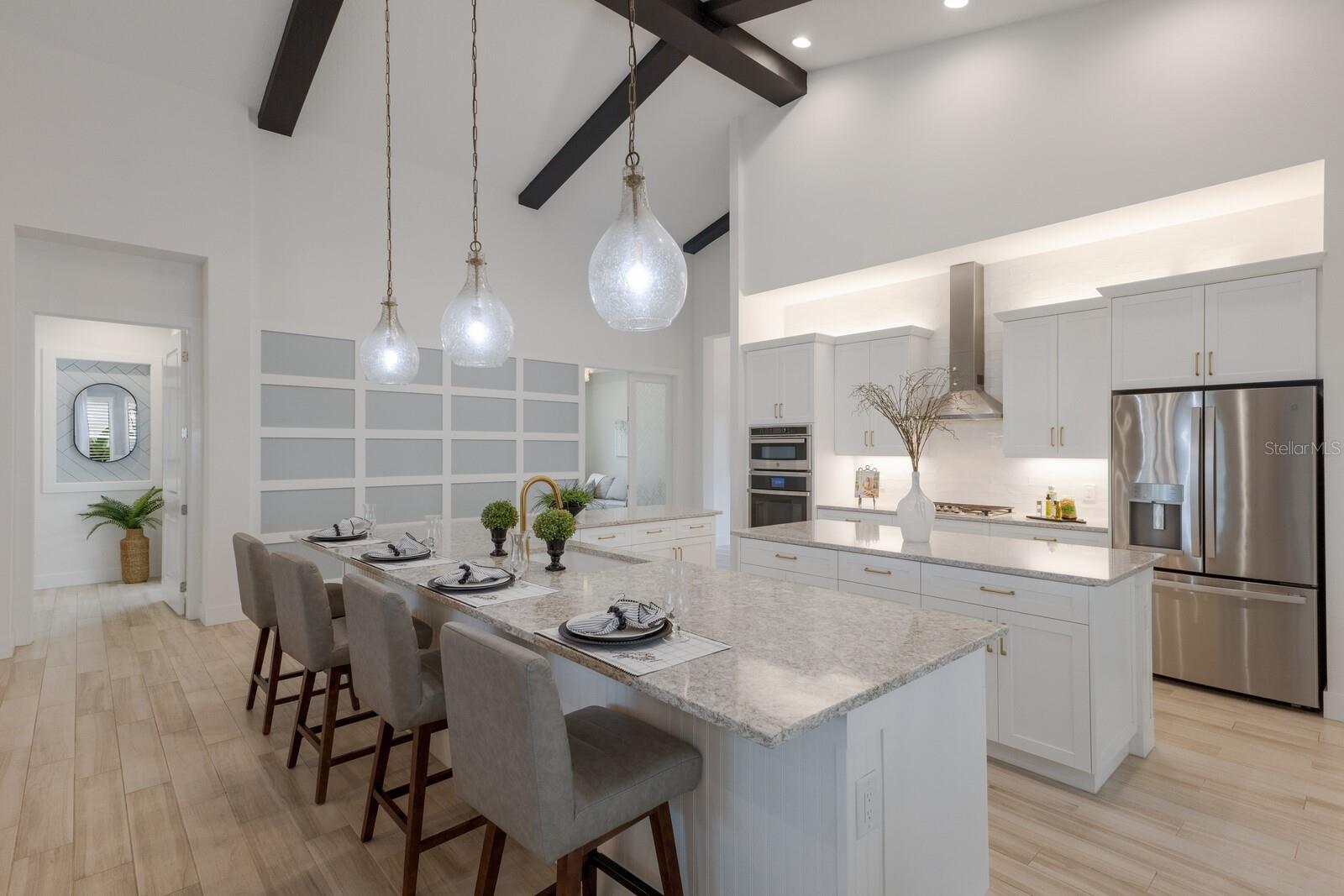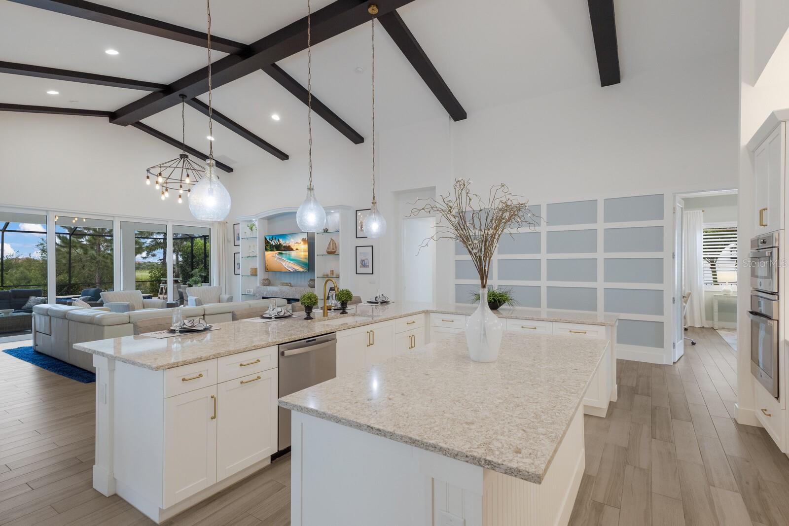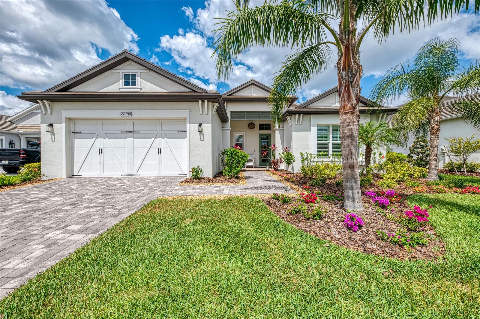 PRICE IMPROVEMENT and NEW PHOTOS! Welcome to the Weatherly floor plan by builder Homes by Towne. This one-story, four-bedroom, three bath, plus den home offers a great opportunity for those who love to entertain. Upon entering, you will be wowed by the vaulted ceiling, painted beams and open floor plan. The crown jewel of the home is the kitchen loaded with white custom cabinets, a double island, upgraded quartz tops and GE appliances. The outer island comfortably seats six, and inner island serves as a great workspace for all your baking and cooking creations. Want more space for all your kitchen tools and accessories? Enjoy the custom designed walk-in pantry with power for your coffee pot or toaster oven. Behind the kitchen, you will find a beverage bar for all your entertaining needs. Do you need extra storage space? No problem, the laundry room has a professionally designed double closet and a wall of cabinetry to store your overflow items, and the garage has custom built shelving for all your outdoor gear. Adjacent to the kitchen, there is a custom designed accent wall that can showcase 8x8 frames for artwork and photos or it can be freestanding. The light and bright great room offers a warm and cozy ambiance to sit back and watch your favorite tv shows or movie within the custom built in, lighted, glass shelves and quartz faced fireplace. Need to enjoy the FL sunshine? Head out to the lanai and watch a tv program, enjoy a meal prepared at the outdoor kitchen; cool off in the saltwater pool heated pool or relax and unwind in the hot tub all while watching the amazing sunsets over the preserve. Landscape maintenance is included in the HOA along with the fitness center, dog park, pickleball courts as well as a full-time director who offers all sorts of functions and activities so you can meet the neighbors and make new friends. Other notable features include a whole house Koehler generator, epoxy floors in the 3-car tandem garage, plantation shutters, custom closets in all four bedrooms, a security system, bead board and wainscoting woodwork, hurricane impact windows and professionally installed workstations in the den. Lakehouse Cove offers easy convenience to Waterside Place, the latest entertainment hub offering dining, shopping, an award-winning weekly farmers market, Ranch Night with food trucks and weekly corn hole tournaments.