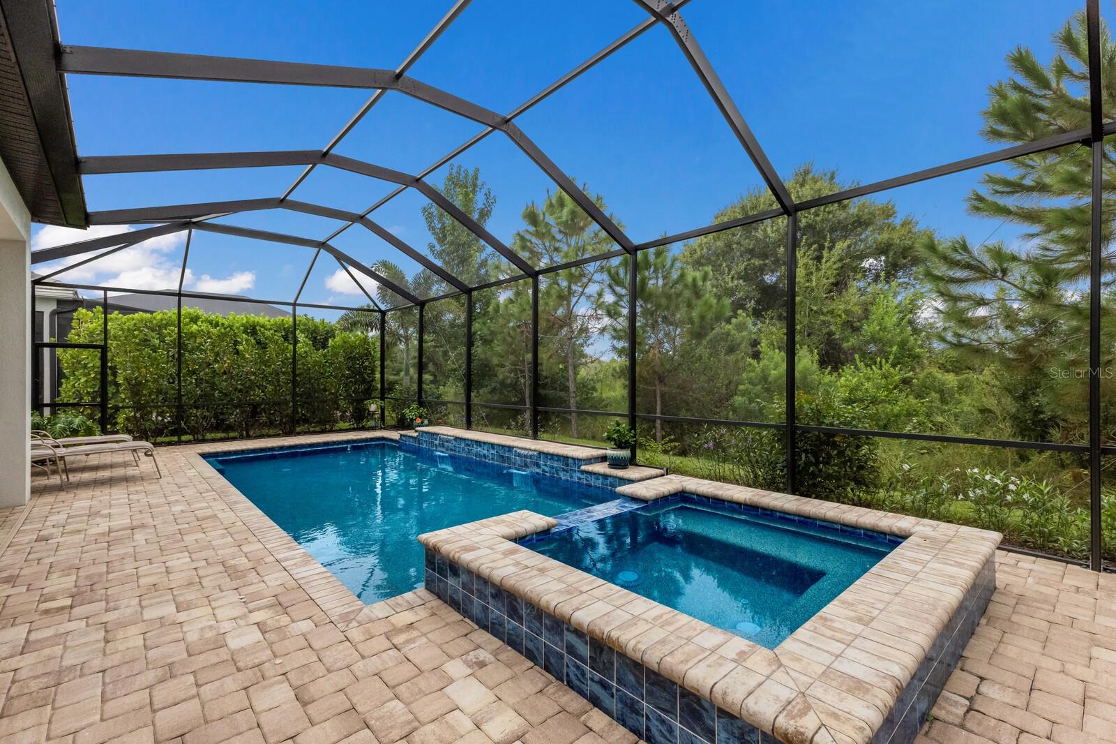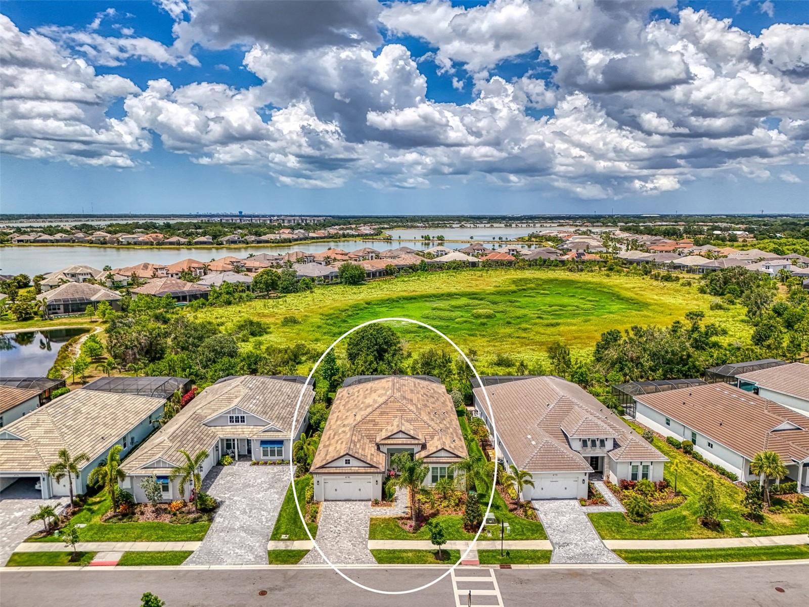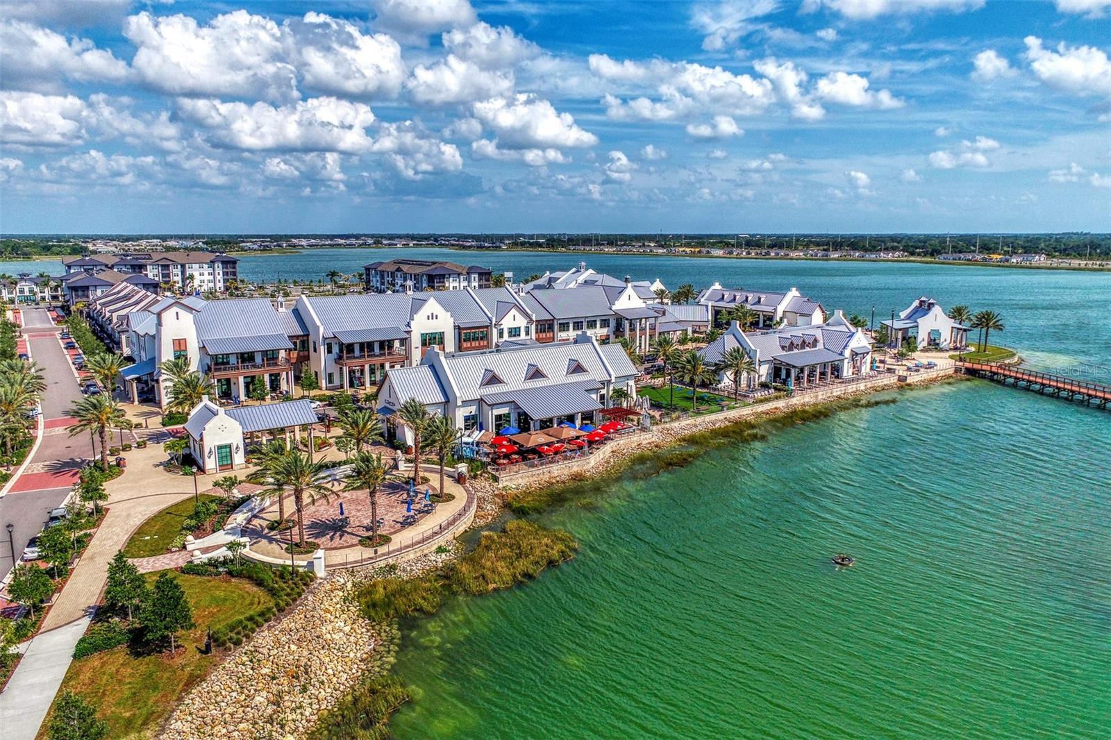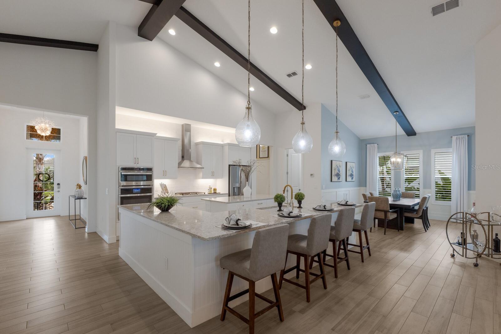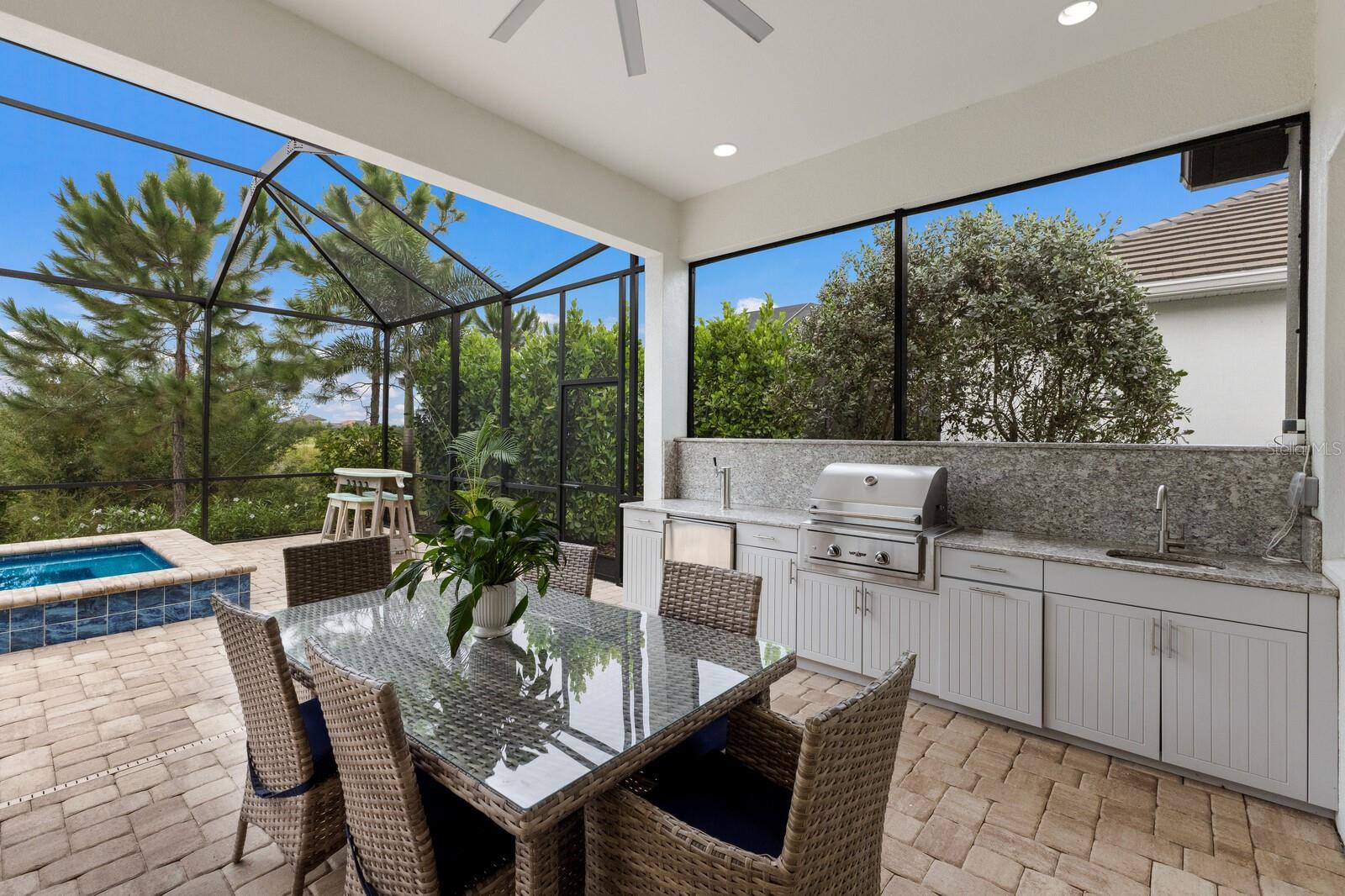 PRICE IMPROVEMENT and NEW PHOTOS! Welcome to the Weatherly floor plan by builder Homes by Towne. This one-story, four-bedroom, three bath, plus den home offers a great opportunity for those who love to entertain. Upon entering, you will be wowed by the vaulted ceiling, painted beams and open floor plan. The crown jewel of the home is the kitchen loaded with white custom cabinets, a double island, upgraded quartz tops and GE appliances. The outer island comfortably seats six, and inner island serves as a great workspace for all your baking and cooking creations. Want more space for all your kitchen tools and accessories? Enjoy the custom designed walk-in pantry with power for your coffee pot or toaster oven. Behind the kitchen, you will find a beverage bar for all your entertaining needs. Do you need extra storage space? No problem, the laundry room has a professionally designed double closet and a wall of cabinetry to store your overflow items, and the garage has custom built shelving for all your outdoor gear. Adjacent to the kitchen, there is a custom designed accent wall that can showcase 8x8 frames for artwork and photos or it can be freestanding. The light and bright great room offers a warm and cozy ambiance to sit back and watch your favorite tv shows or movie within the custom built in, lighted, glass shelves and quartz faced fireplace. Need to enjoy the FL sunshine? Head out to the lanai and watch a tv program, enjoy a meal prepared at the outdoor kitchen; cool off in the saltwater pool heated pool or relax and unwind in the hot tub all while watching the amazing sunsets over the preserve. Landscape maintenance is included in the HOA along with the fitness center, dog park, pickleball courts as well as a full-time director who offers all sorts of functions and activities so you can meet the neighbors and make new friends. Other notable features include a whole house Koehler generator, epoxy floors in the 3-car tandem garage, plantation shutters, custom closets in all four bedrooms, a security system, bead board and wainscoting woodwork, hurricane impact windows and professionally installed workstations in the den. Lakehouse Cove offers easy convenience to Waterside Place, the latest entertainment hub offering dining, shopping, an award-winning weekly farmers market, Ranch Night with food trucks and weekly corn hole tournaments.