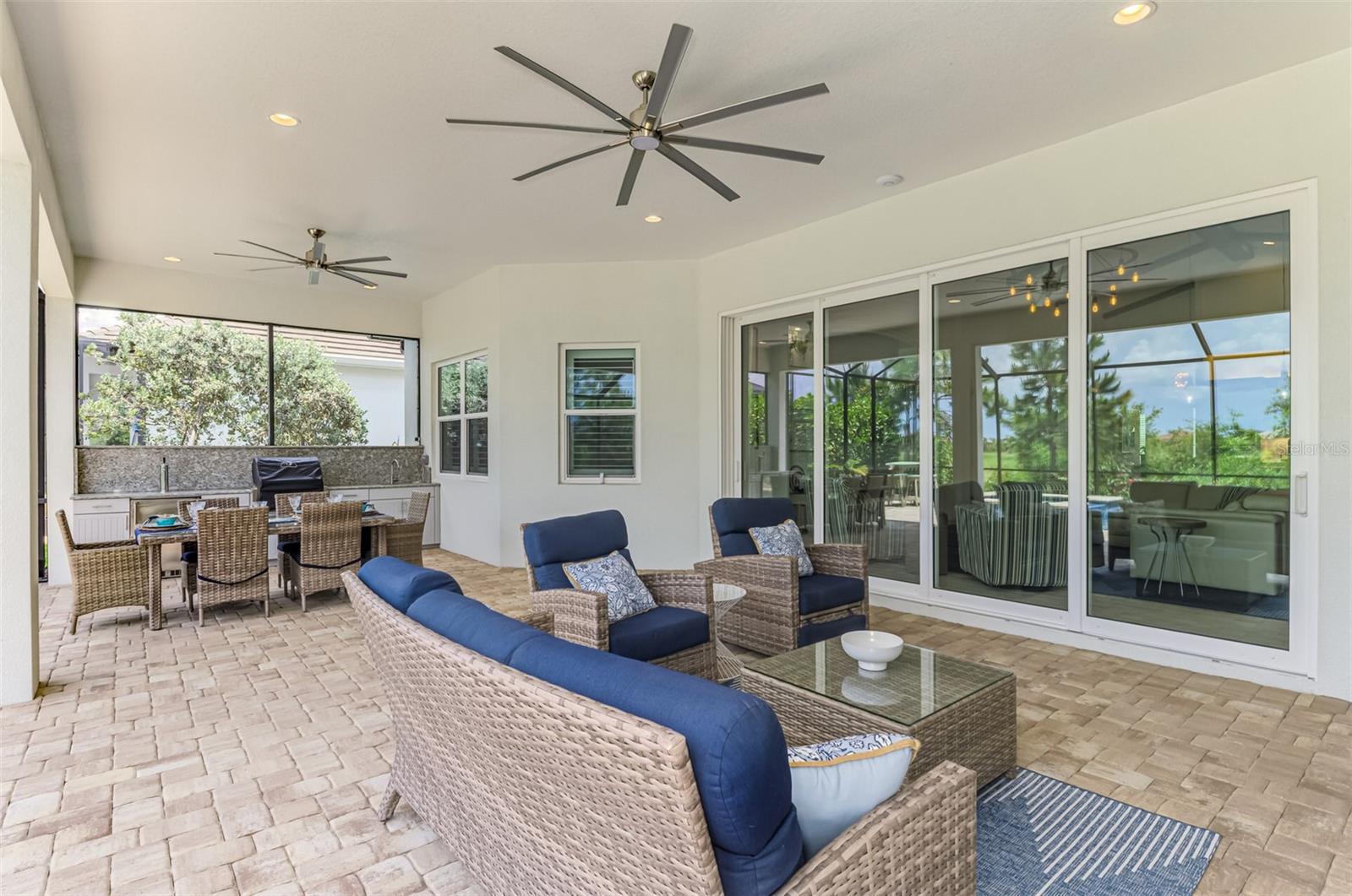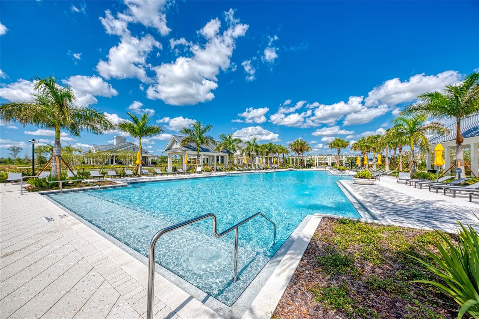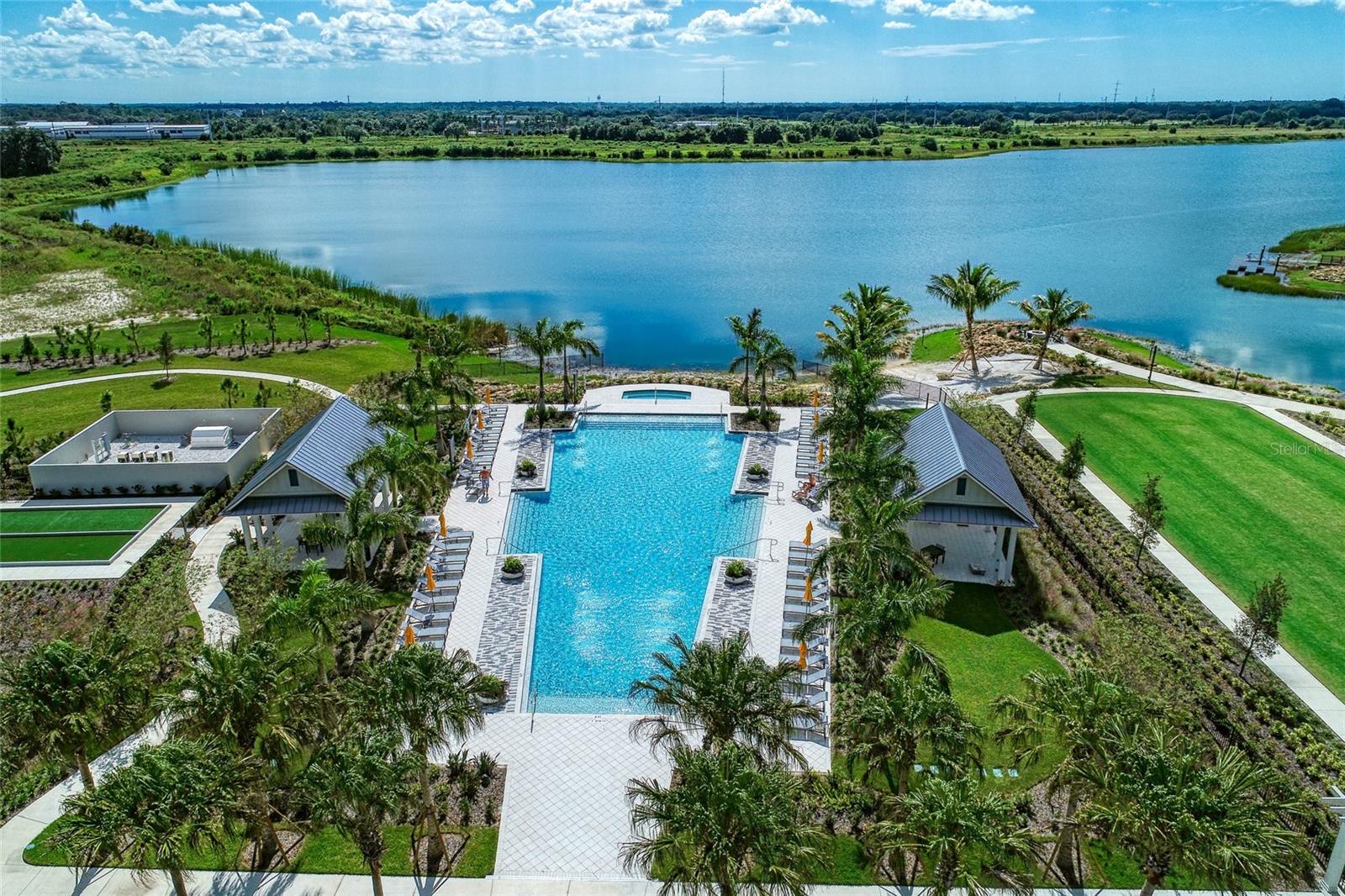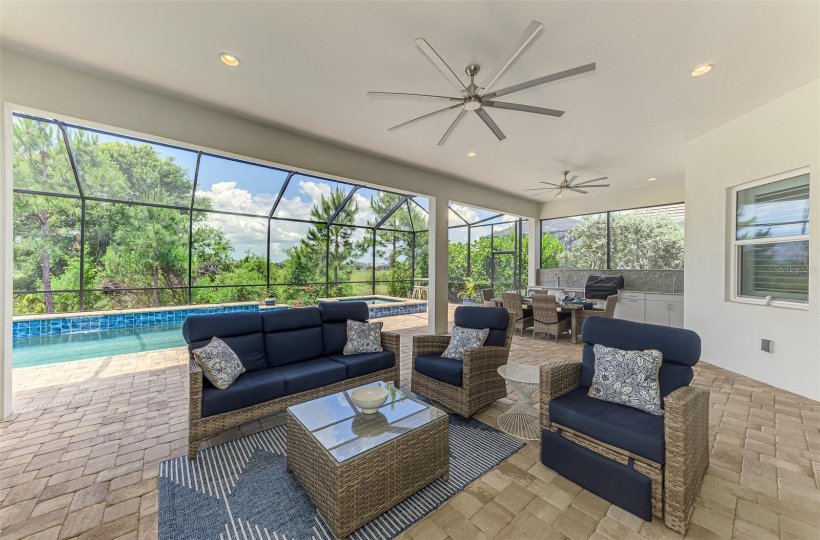 PRICE IMPROVEMENT and NEW PHOTOS! Welcome to the Weatherly floor plan by builder Homes by Towne. This one-story, four-bedroom, three bath, plus den home offers a great opportunity for those who love to entertain. Upon entering, you will be wowed by the vaulted ceiling, painted beams and open floor plan. The crown jewel of the home is the kitchen loaded with white custom cabinets, a double island, upgraded quartz tops and GE appliances. The outer island comfortably seats six, and inner island serves as a great workspace for all your baking and cooking creations. Want more space for all your kitchen tools and accessories? Enjoy the custom designed walk-in pantry with power for your coffee pot or toaster oven. Behind the kitchen, you will find a beverage bar for all your entertaining needs. Do you need extra storage space? No problem, the laundry room has a professionally designed double closet and a wall of cabinetry to store your overflow items, and the garage has custom built shelving for all your outdoor gear. Adjacent to the kitchen, there is a custom designed accent wall that can showcase 8x8 frames for artwork and photos or it can be freestanding. The light and bright great room offers a warm and cozy ambiance to sit back and watch your favorite tv shows or movie within the custom built in, lighted, glass shelves and quartz faced fireplace. Need to enjoy the FL sunshine? Head out to the lanai and watch a tv program, enjoy a meal prepared at the outdoor kitchen; cool off in the saltwater pool heated pool or relax and unwind in the hot tub all while watching the amazing sunsets over the preserve. Landscape maintenance is included in the HOA along with the fitness center, dog park, pickleball courts as well as a full-time director who offers all sorts of functions and activities so you can meet the neighbors and make new friends. Other notable features include a whole house Koehler generator, epoxy floors in the 3-car tandem garage, plantation shutters, custom closets in all four bedrooms, a security system, bead board and wainscoting woodwork, hurricane impact windows and professionally installed workstations in the den. Lakehouse Cove offers easy convenience to Waterside Place, the latest entertainment hub offering dining, shopping, an award-winning weekly farmers market, Ranch Night with food trucks and weekly corn hole tournaments.