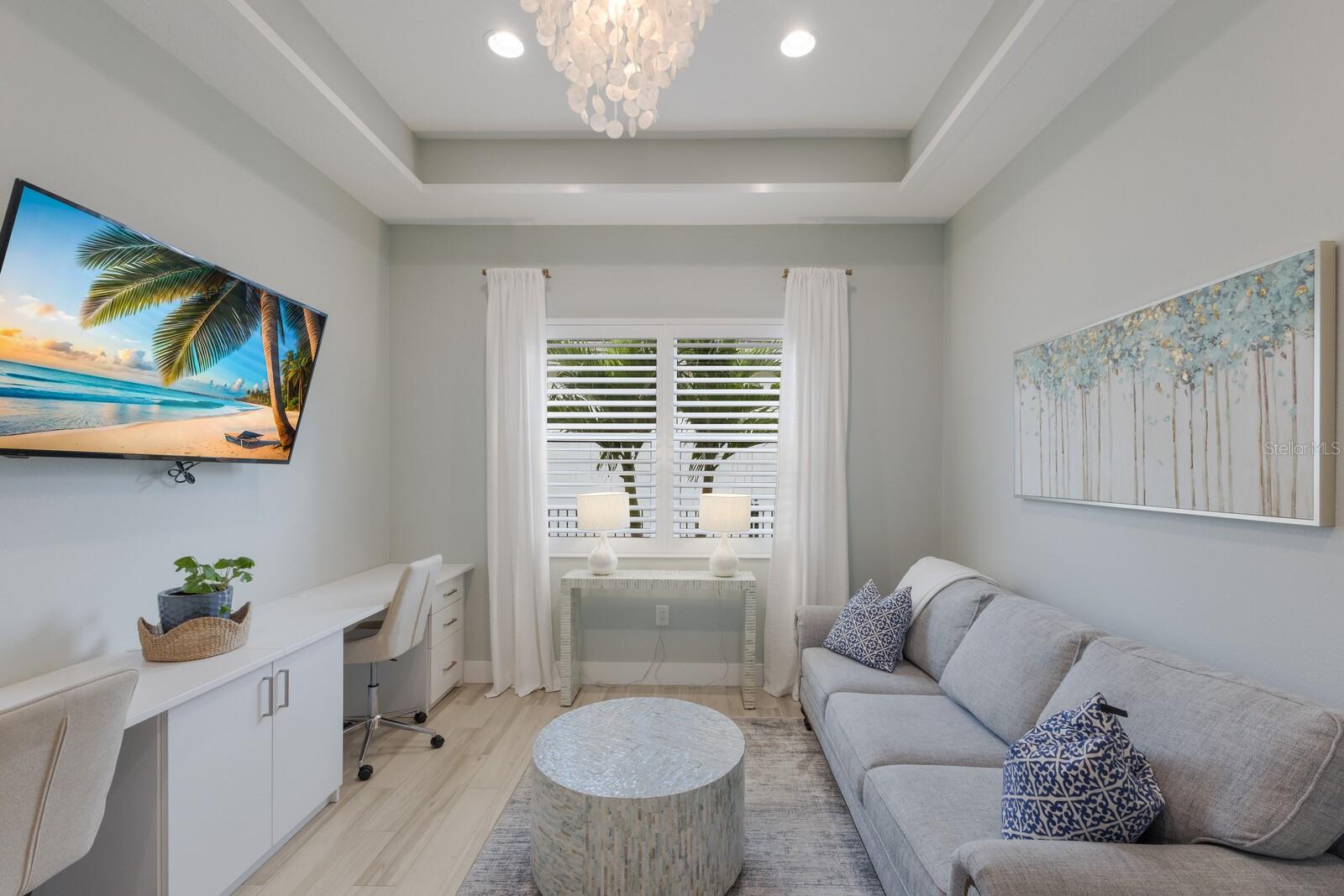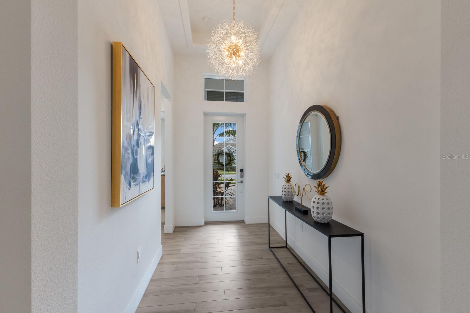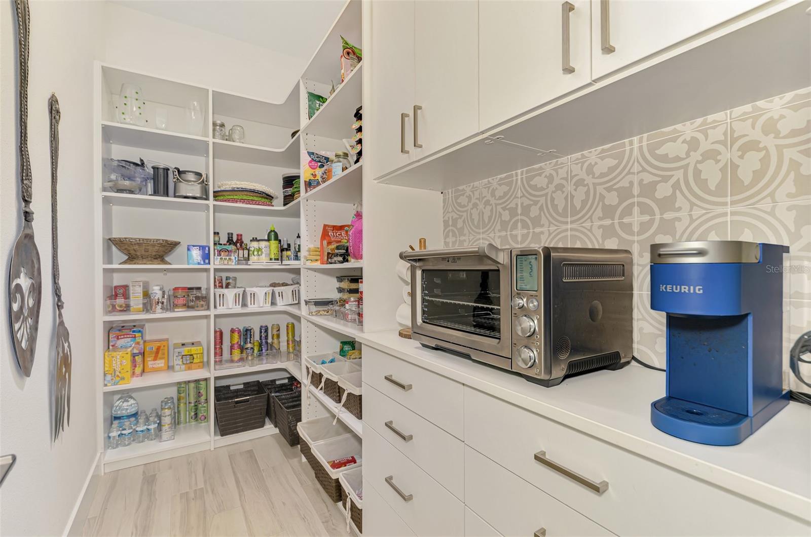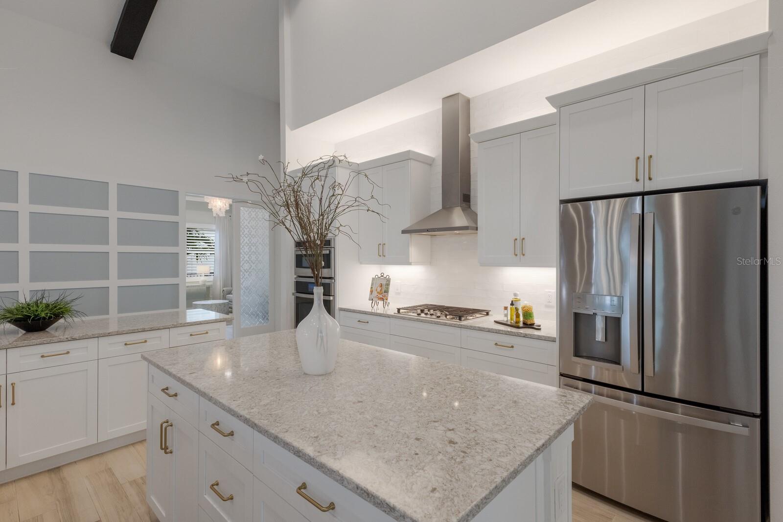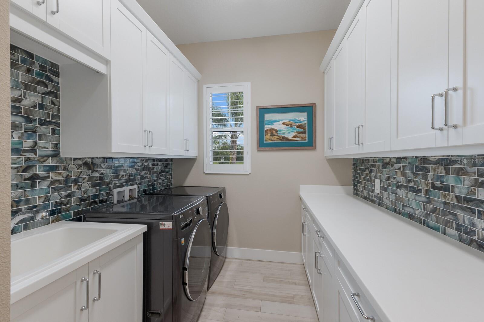 PRICE IMPROVEMENT and NEW PHOTOS! Welcome to the Weatherly floor plan by builder Homes by Towne. This one-story, four-bedroom, three bath, plus den home offers a great opportunity for those who love to entertain. Upon entering, you will be wowed by the vaulted ceiling, painted beams and open floor plan. The crown jewel of the home is the kitchen loaded with white custom cabinets, a double island, upgraded quartz tops and GE appliances. The outer island comfortably seats six, and inner island serves as a great workspace for all your baking and cooking creations. Want more space for all your kitchen tools and accessories? Enjoy the custom designed walk-in pantry with power for your coffee pot or toaster oven. Behind the kitchen, you will find a beverage bar for all your entertaining needs. Do you need extra storage space? No problem, the laundry room has a professionally designed double closet and a wall of cabinetry to store your overflow items, and the garage has custom built shelving for all your outdoor gear. Adjacent to the kitchen, there is a custom designed accent wall that can showcase 8x8 frames for artwork and photos or it can be freestanding. The light and bright great room offers a warm and cozy ambiance to sit back and watch your favorite tv shows or movie within the custom built in, lighted, glass shelves and quartz faced fireplace. Need to enjoy the FL sunshine? Head out to the lanai and watch a tv program, enjoy a meal prepared at the outdoor kitchen; cool off in the saltwater pool heated pool or relax and unwind in the hot tub all while watching the amazing sunsets over the preserve. Landscape maintenance is included in the HOA along with the fitness center, dog park, pickleball courts as well as a full-time director who offers all sorts of functions and activities so you can meet the neighbors and make new friends. Other notable features include a whole house Koehler generator, epoxy floors in the 3-car tandem garage, plantation shutters, custom closets in all four bedrooms, a security system, bead board and wainscoting woodwork, hurricane impact windows and professionally installed workstations in the den. Lakehouse Cove offers easy convenience to Waterside Place, the latest entertainment hub offering dining, shopping, an award-winning weekly farmers market, Ranch Night with food trucks and weekly corn hole tournaments.