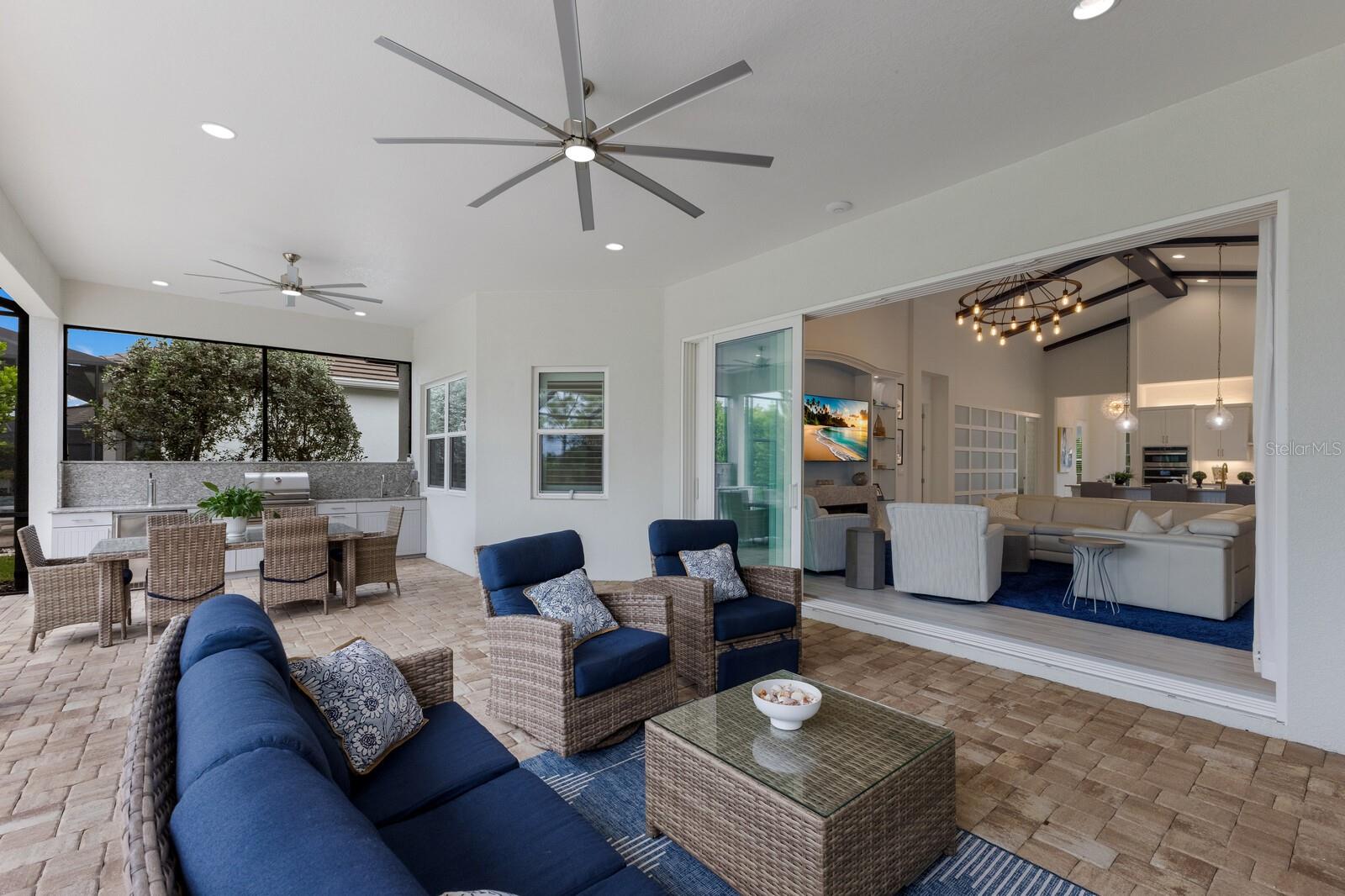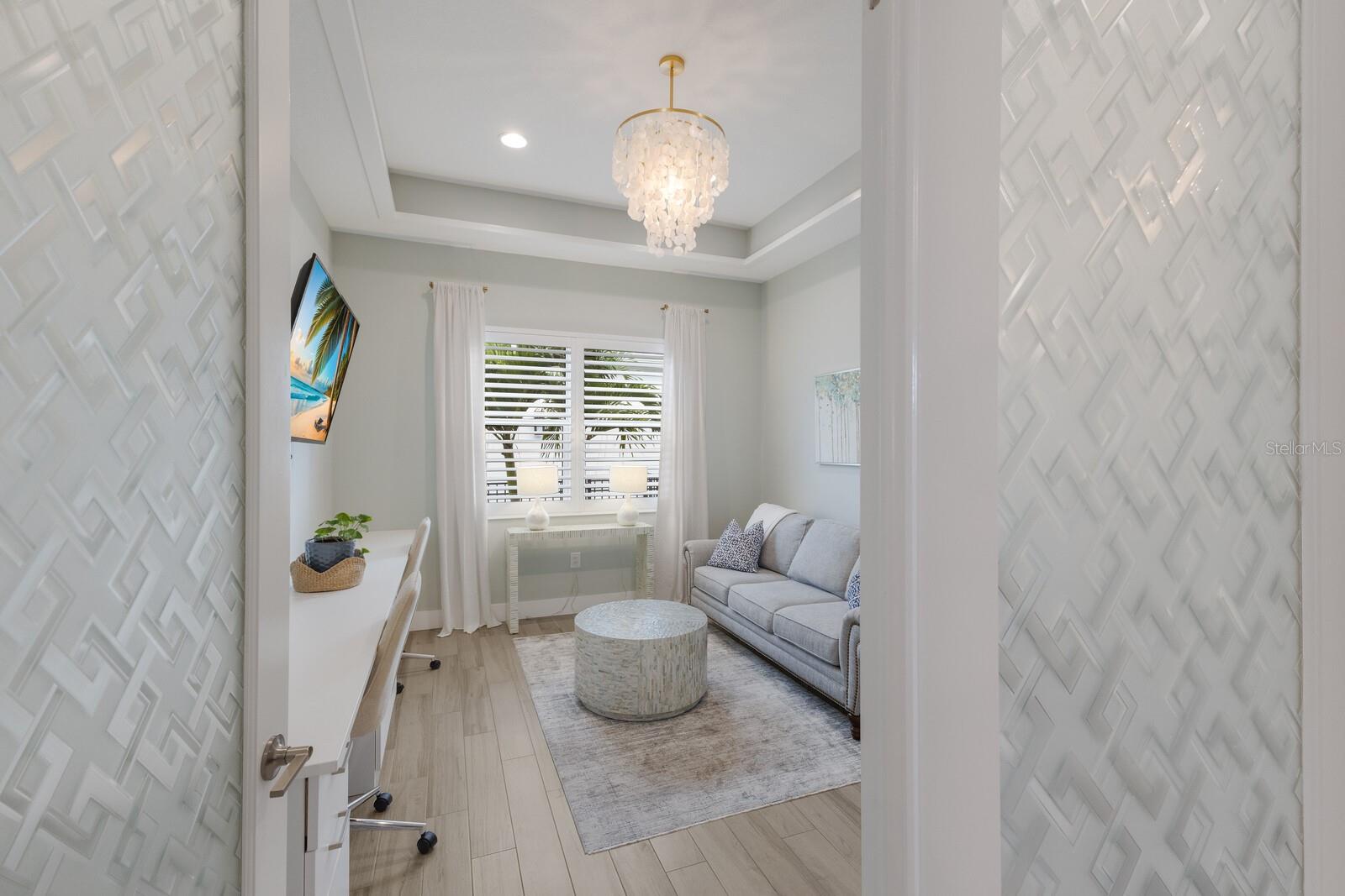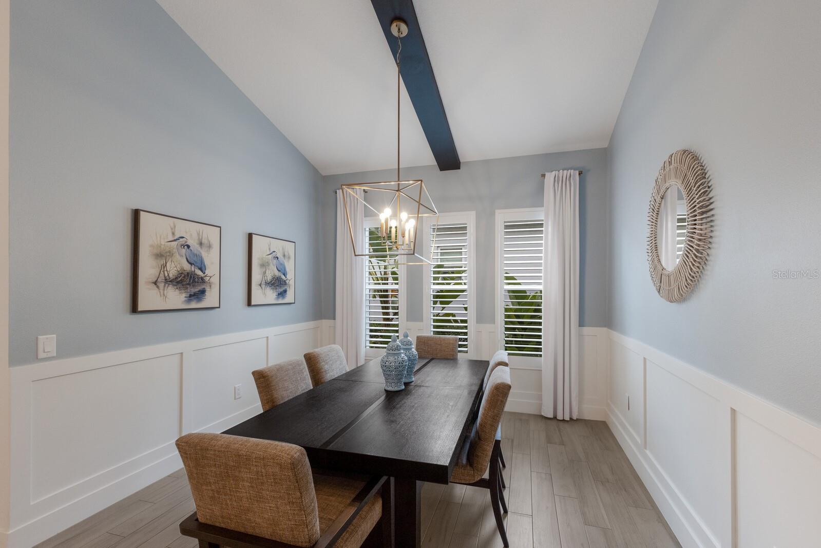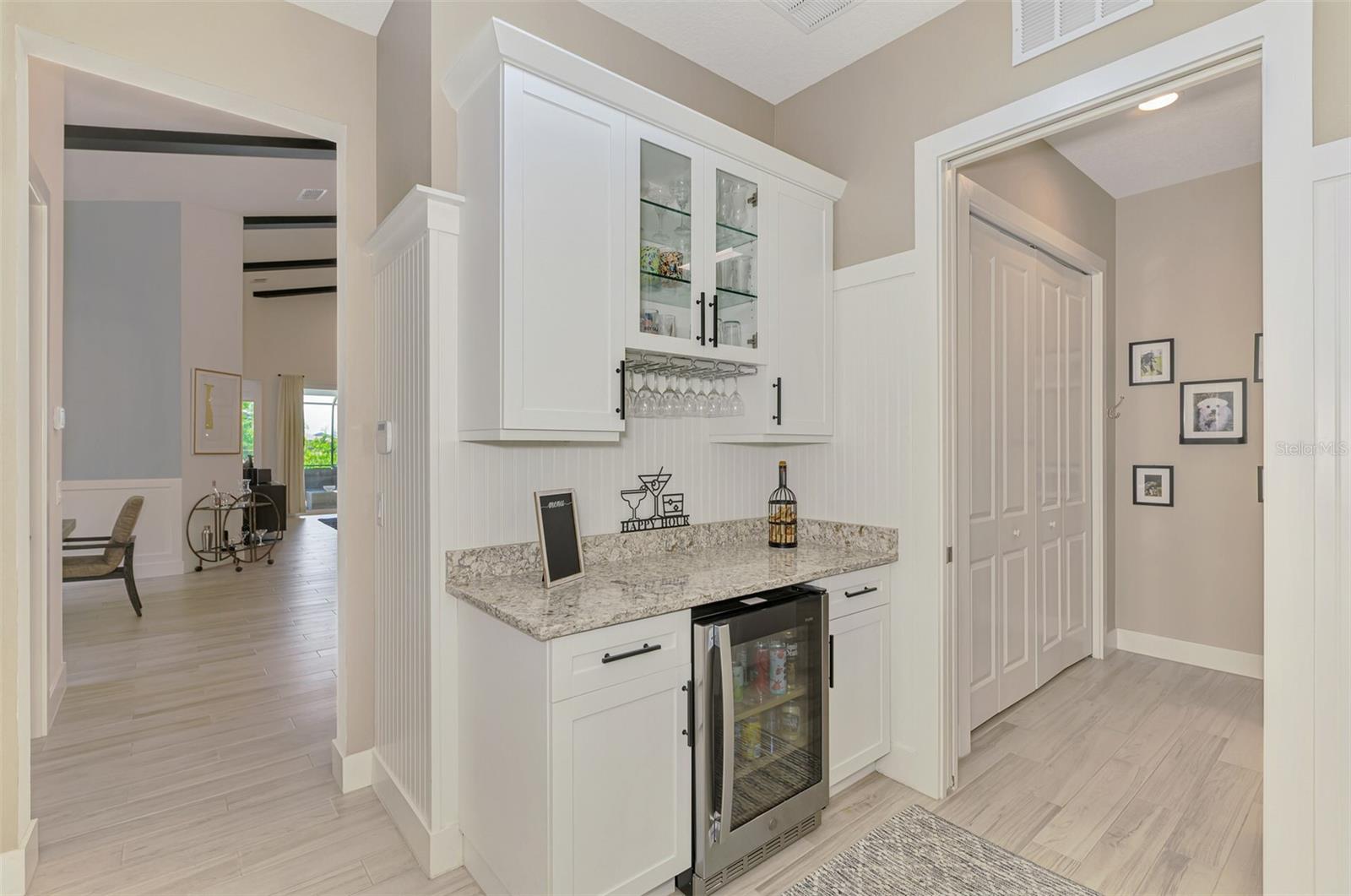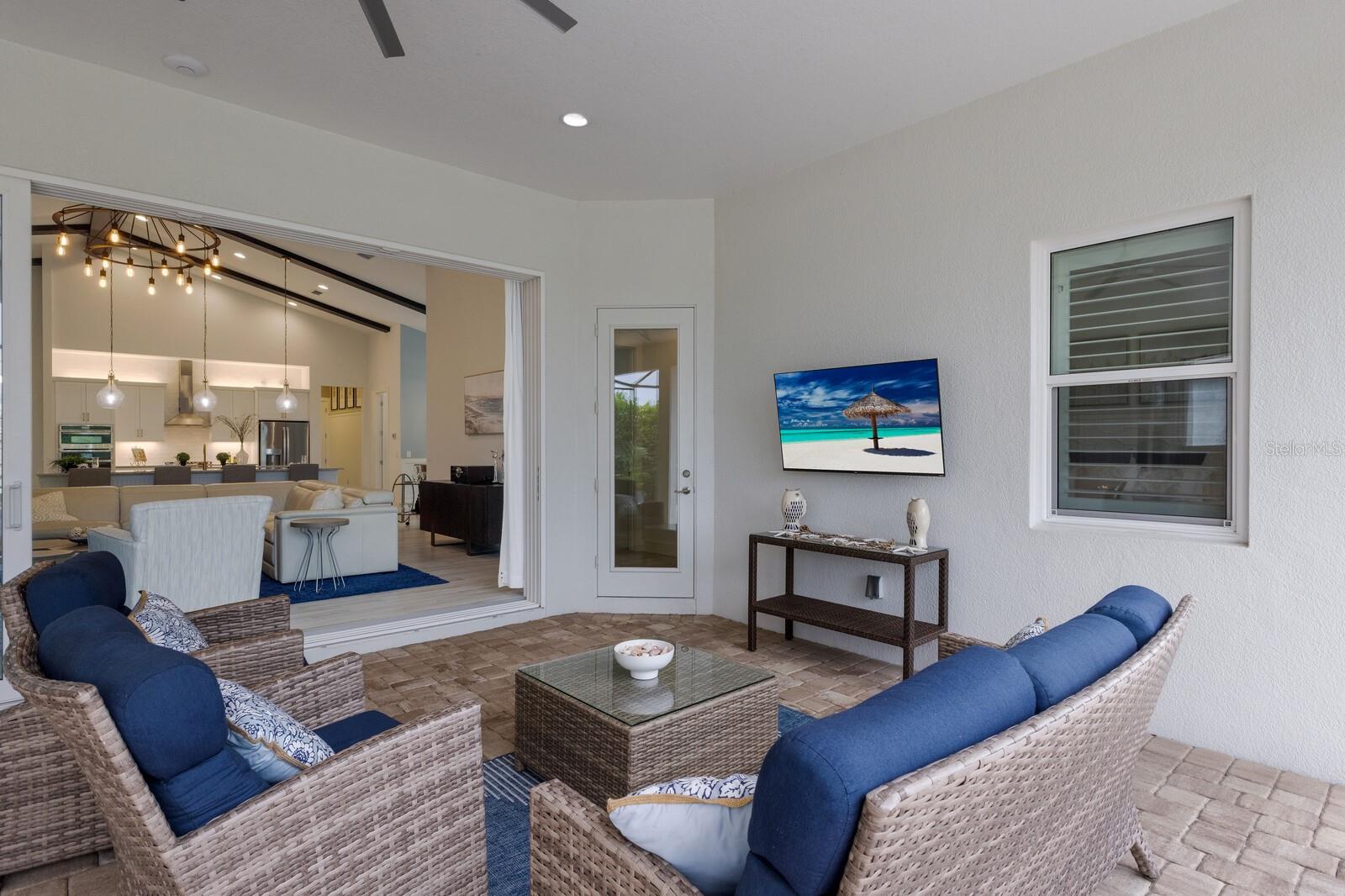 PRICE IMPROVEMENT and NEW PHOTOS! Welcome to the Weatherly floor plan by builder Homes by Towne. This one-story, four-bedroom, three bath, plus den home offers a great opportunity for those who love to entertain. Upon entering, you will be wowed by the vaulted ceiling, painted beams and open floor plan. The crown jewel of the home is the kitchen loaded with white custom cabinets, a double island, upgraded quartz tops and GE appliances. The outer island comfortably seats six, and inner island serves as a great workspace for all your baking and cooking creations. Want more space for all your kitchen tools and accessories? Enjoy the custom designed walk-in pantry with power for your coffee pot or toaster oven. Behind the kitchen, you will find a beverage bar for all your entertaining needs. Do you need extra storage space? No problem, the laundry room has a professionally designed double closet and a wall of cabinetry to store your overflow items, and the garage has custom built shelving for all your outdoor gear. Adjacent to the kitchen, there is a custom designed accent wall that can showcase 8x8 frames for artwork and photos or it can be freestanding. The light and bright great room offers a warm and cozy ambiance to sit back and watch your favorite tv shows or movie within the custom built in, lighted, glass shelves and quartz faced fireplace. Need to enjoy the FL sunshine? Head out to the lanai and watch a tv program, enjoy a meal prepared at the outdoor kitchen; cool off in the saltwater pool heated pool or relax and unwind in the hot tub all while watching the amazing sunsets over the preserve. Landscape maintenance is included in the HOA along with the fitness center, dog park, pickleball courts as well as a full-time director who offers all sorts of functions and activities so you can meet the neighbors and make new friends. Other notable features include a whole house Koehler generator, epoxy floors in the 3-car tandem garage, plantation shutters, custom closets in all four bedrooms, a security system, bead board and wainscoting woodwork, hurricane impact windows and professionally installed workstations in the den. Lakehouse Cove offers easy convenience to Waterside Place, the latest entertainment hub offering dining, shopping, an award-winning weekly farmers market, Ranch Night with food trucks and weekly corn hole tournaments.