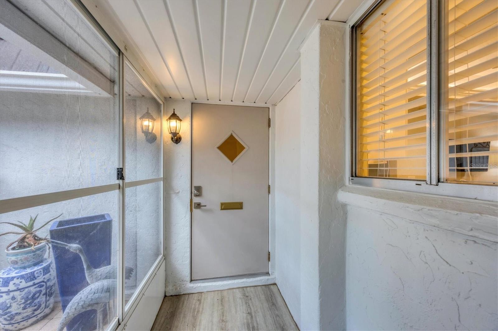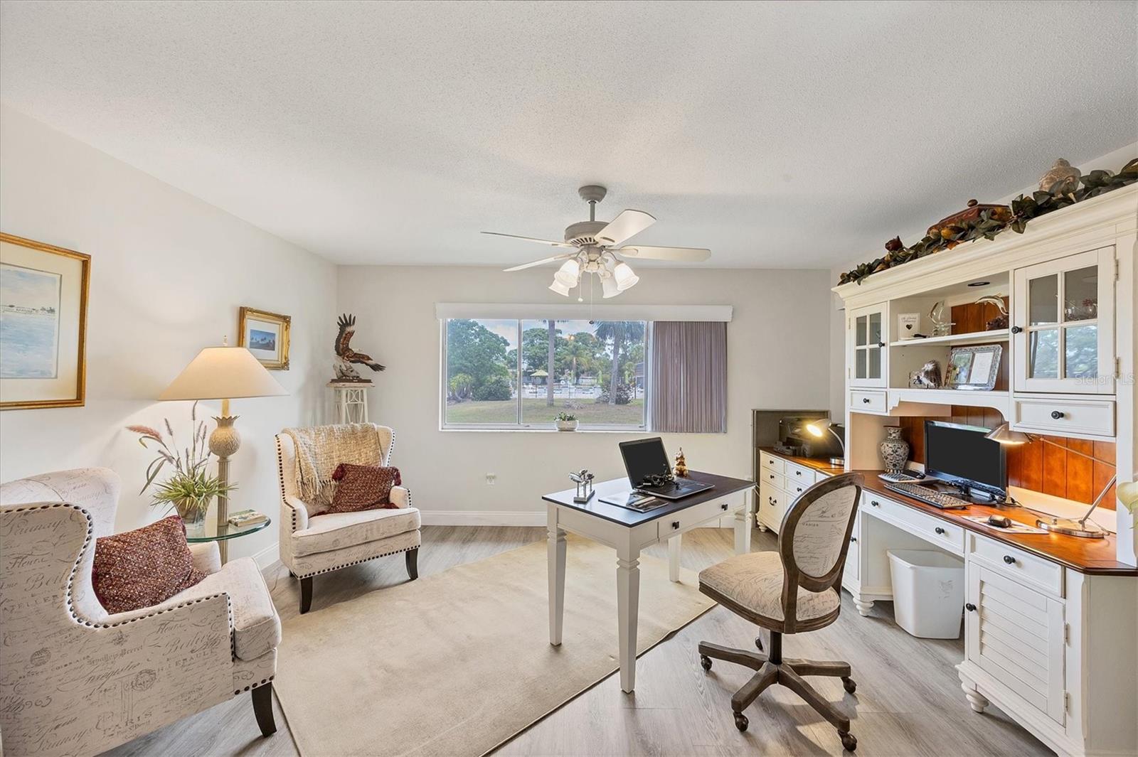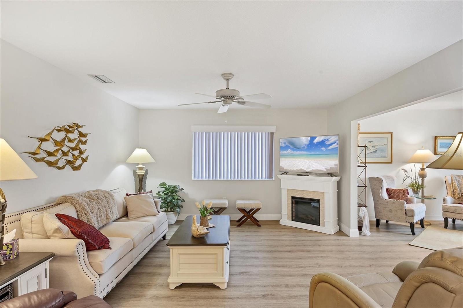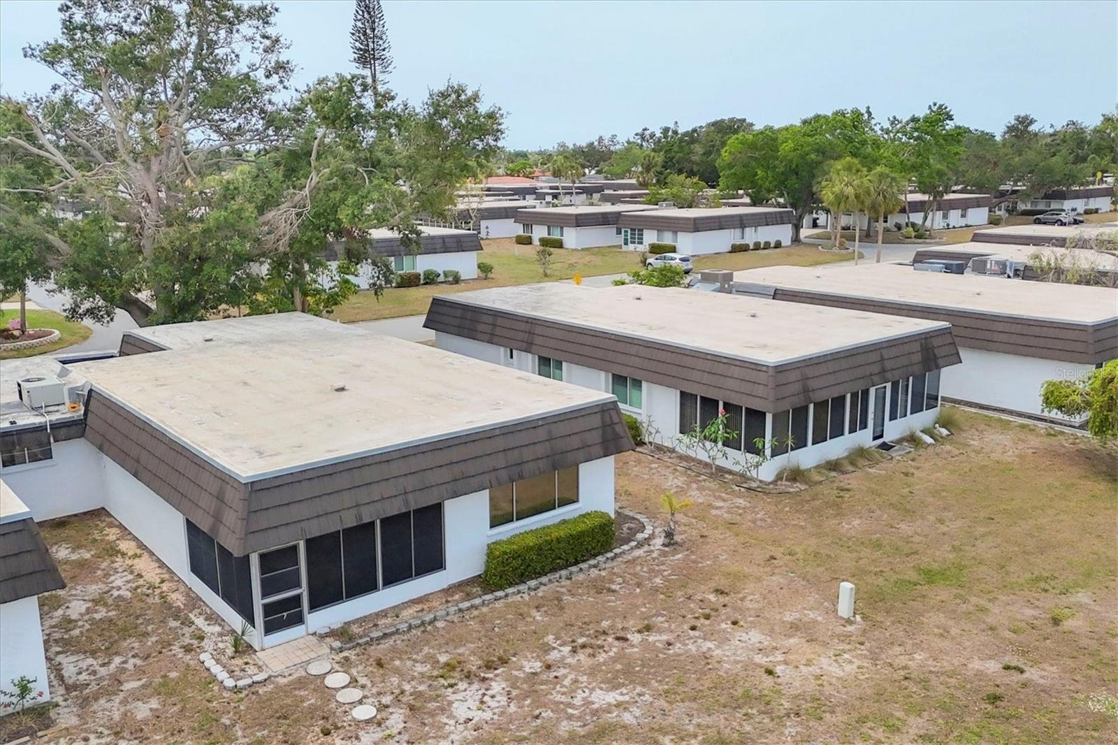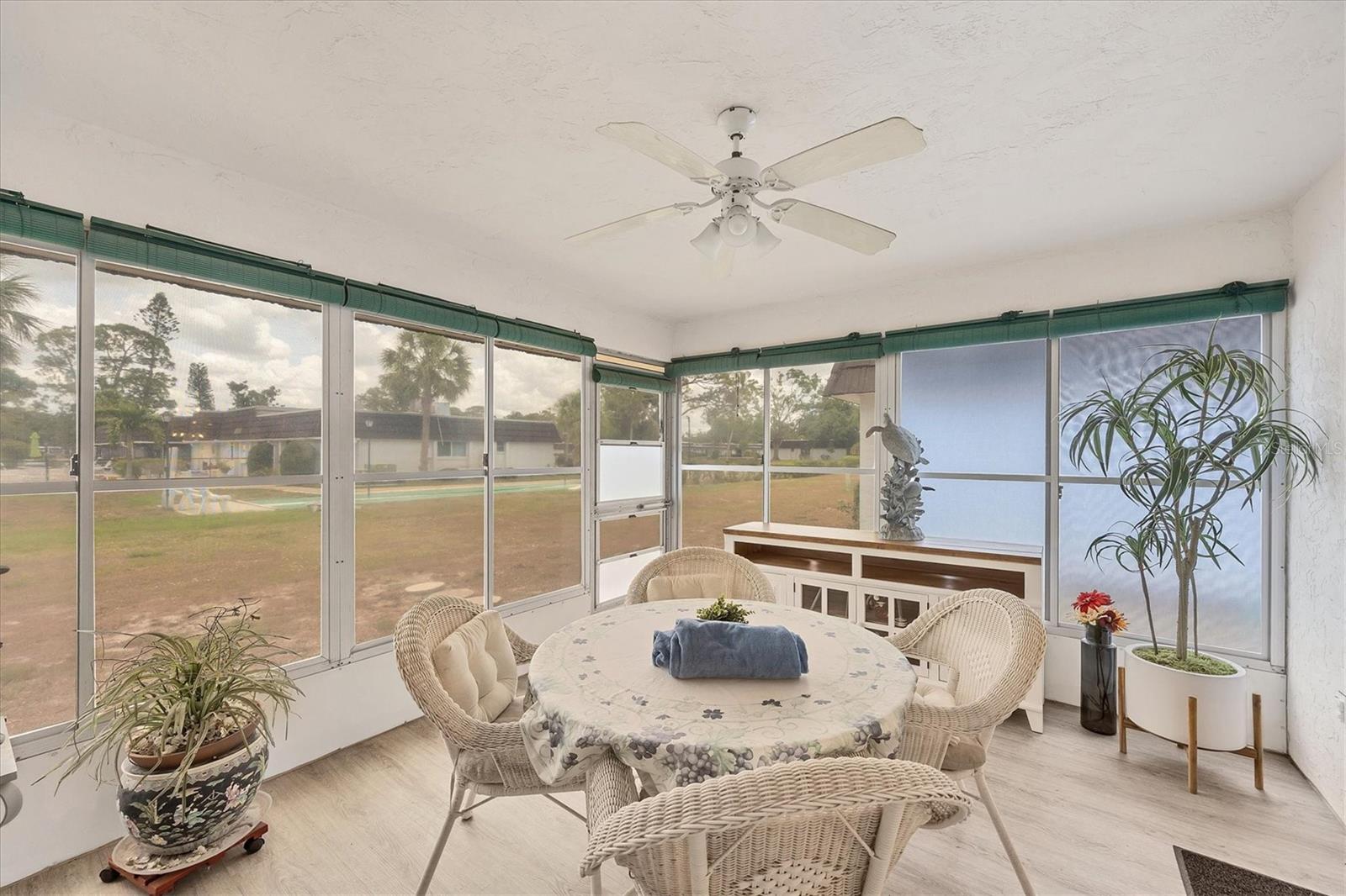 LAKE VIEW & POOL VIEW Villa in Glen Oaks Ridge, a 55+ community located between UTC MALL and Downtown Sarasota. Check out this two bedroom, 2 bath one story (no stairs) 1350 square foot END UNIT villa with a dedicated den/study/office, a 12x12 four season FLORIDA ROOM and an attached one car PRIVATE carport AND private driveway PLUS an indoor, Laundry Room/Utility Room/Storage Area & Pantry! Most all of the flooring has been updated with LVF in recent years along with new baseboards, The kitchen was updated to include newer cabinetry that includes PULL OUT SHELVING, Granite counters, backsplash, updated lighting/ceiling fan, plus the kitchen was opened up to the dining room adding a breakfast bar. More updates include the Primary bedroom bathroom, Newer gutters, Brand new washer & dryer AND a NEW hot water tank. The Condo association previously replumbed the fresh water pipes and on 03/2025 owner had ALL plumbing valves replaced to washer/dishwasher/wash tub/commodes/vanities & kitchen sink. This villa has the "third nail" for better insurance rates. Enjoy the LAKE views & the FOUNTAIN in the LAKE and the POOL. $239,900.