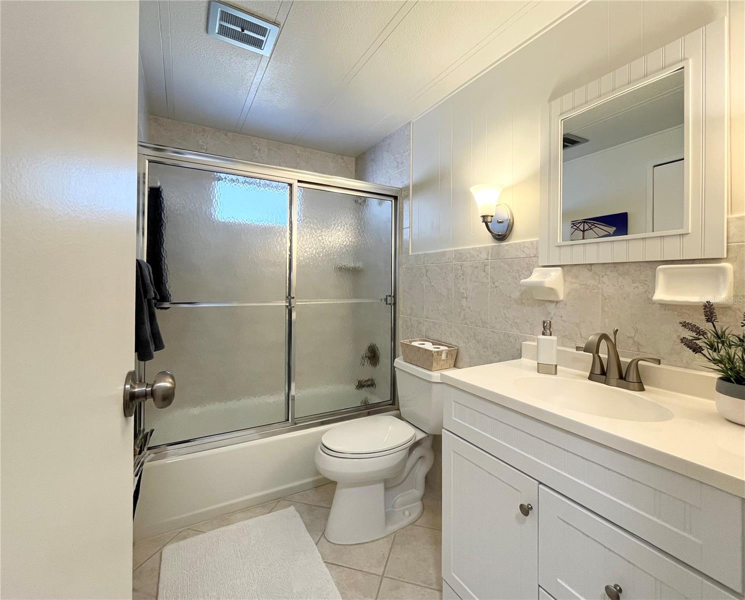 WATERFRONT home with fantastic views of the fountains and sunrise in the ONLY Resident Owned Park in the City limits of Sarasota!! Welcome to this charming coastal themed UPDATED 2 bed 2 bath home with 1,160sf of living space plus a 236sf Florida room with AC (wall unit) that can be used year round. The open floor plan has a living area off the kitchen and a great room for dining and additional seating space that overlooks the water views. The open concept kitchen has a large island with a separate service sink with a reverse osmosis system and plenty of room for extra seating and entertaining guest. The cabinets allow for ample counter and storage space and the tile backsplash is a beautiful accent to the appliance package which includes a GE French door refrigerator 2024, Samsung self-cleaning range 2015, Samsung built in microwave 2015 and Samsung Smart dishwasher 2024. The primary suite has plantation shutters a large walk in closet and an updated bath with a 4ft walk in shower. The guest bedroom also has plantation shutters and is located just off the hall to the updated guest bath with a full size tub/shower. Florida room has a tiki bar complete with a service counter, lighting and bamboo décor. The Bahama awnings around the outside of the home really dress up the coastal look, provide privacy without impeding the views and natural light. The awnings can be dropped to help give protection from storm debris. The washer is a 2023 and is located in the kitchen (which does have room to put a stackable in), the dryer is a 2015 and housed in the shed. More Updates and notes: Main home metal roof over with 4" insulation installed 2018, Fl room rebuilt late 2024 to latest hurricane codes including the roof, windows, exterior door and lighting requirements. Water heater is 2015, Sewer line replaced, water lines are pvc with shut offs. Main living area floors are laminate, bedrooms have carpet, bath tile. All subfloors have been replaced. Home is being sold with some furnishings (some furnishings pictured do not convey with the home). The gated 90 acre community boasts a low maintenance fee with its vast amenities starting with the spacious Clubhouse outfitted with a full commercial cook kitchen, event stage, audio/visual, dance floor, state of the art fitness room, activities hall, library with books/movies/puzzles and a pool table. Outside recreation includes an extra large heated pool with a handicap ramp, a spacious kidney shaped hot tub, ample umbrella tables and lounge chairs and updated shower rooms. Oak trees shade the beautiful park area, picnic tables and a community grill. Additional amenities to enjoy are the community putt putt course, bocce ball, ping pong, horseshoes and corn hole. Oakwood Manor is a vibrant community with numerous social events and activities. Conveniently located adjacent to Legacy Trail and 12 newer pickle ball courts. Just a short drive to our crystal sand beaches, downtown area, the marina, fishing pier, local golf courses, shopping, variety of restaurants, the museum, SRQ airport, SMH and Doctors hospitals. Please note that Oakwood is a 55+, no pet, no motorcycle Park.