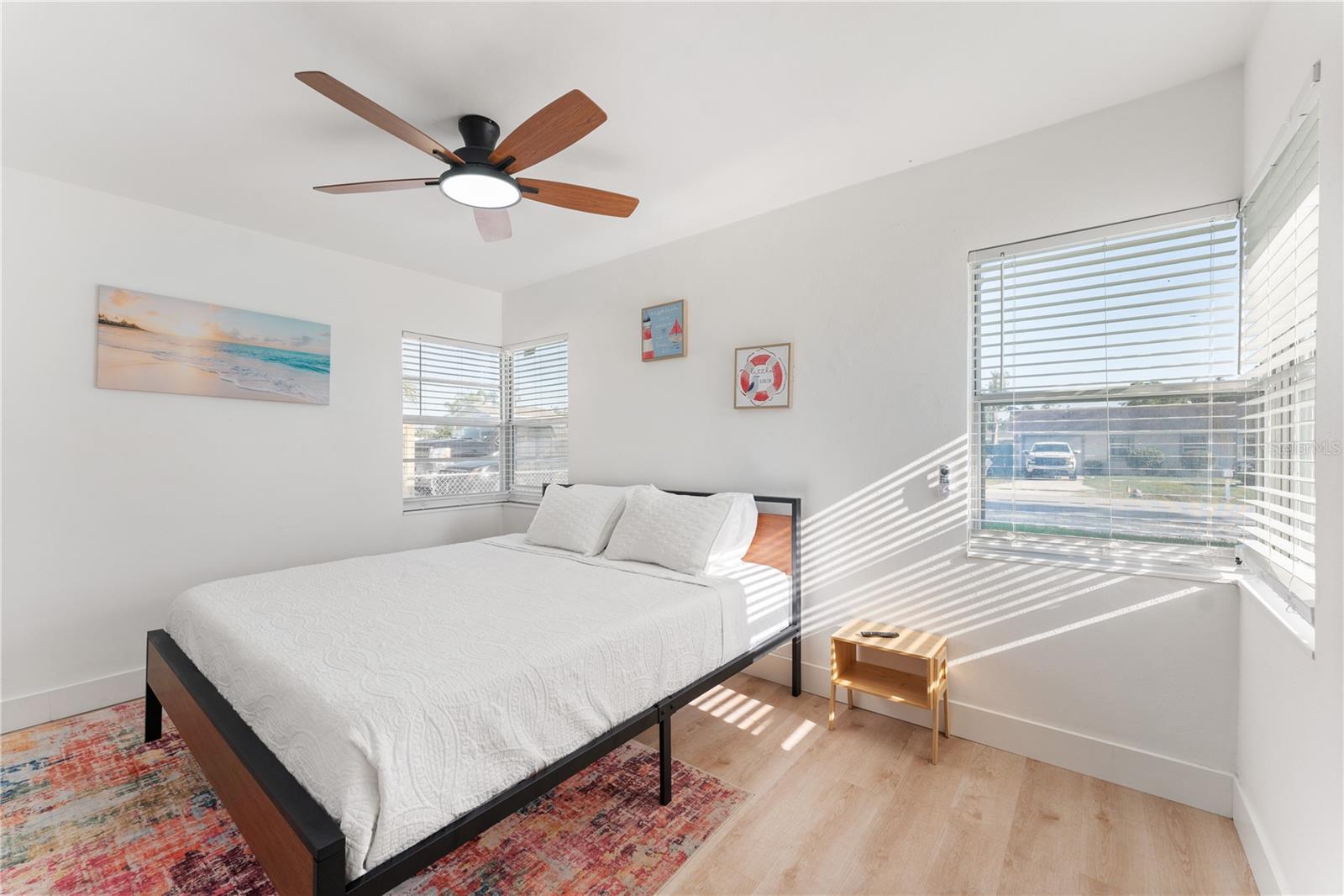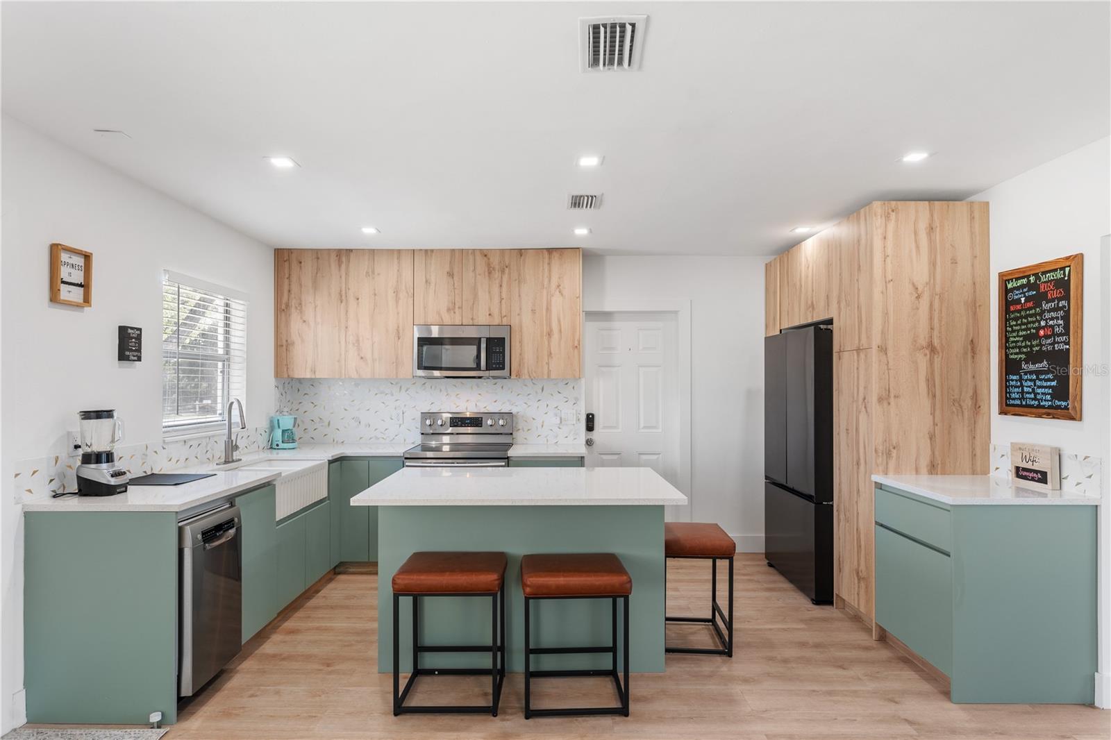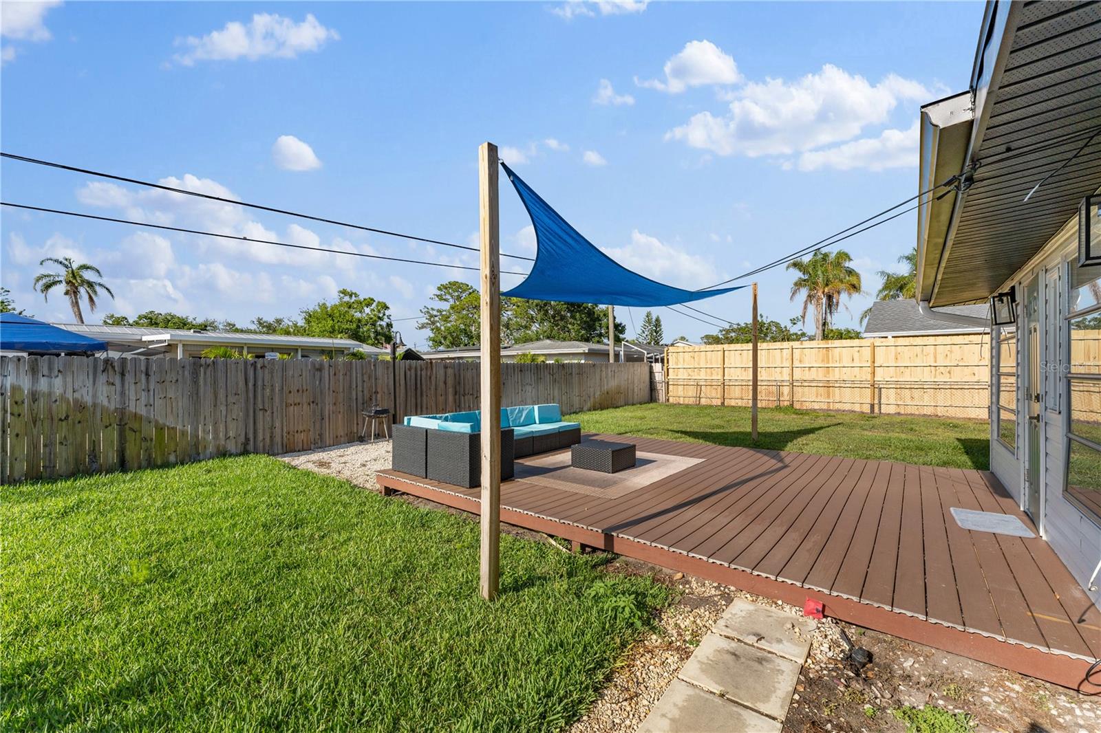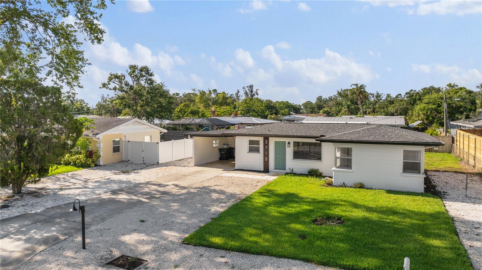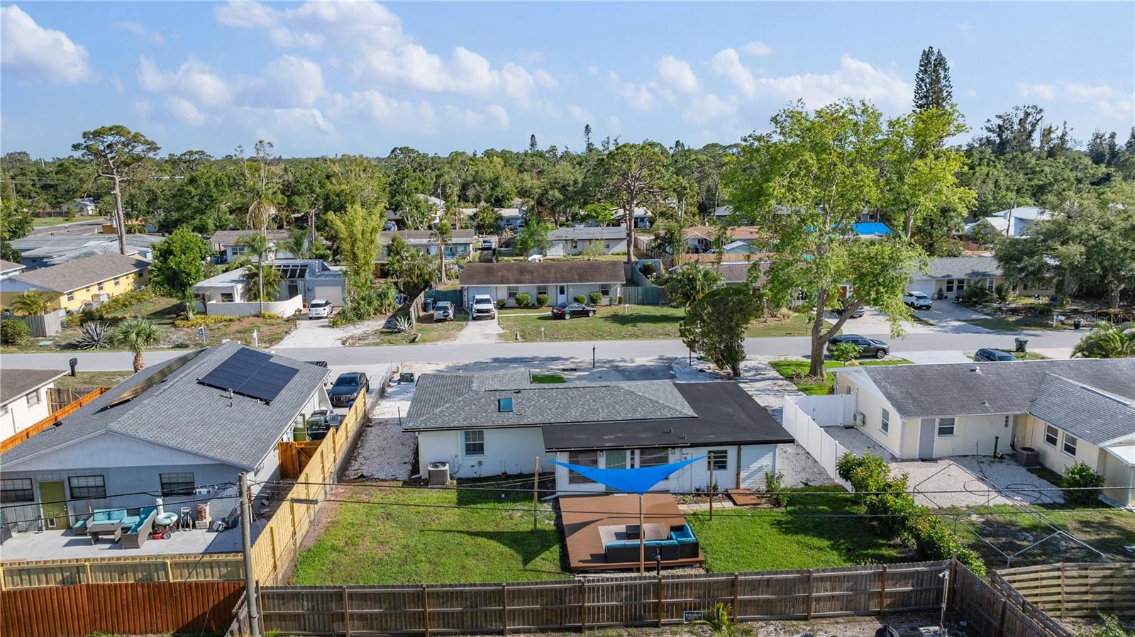 This is a cozy home with modern touch upgrades. The open concept with minimalist modern style makes this home a blend of comfort and convenience. The kitchen brightens with a vibrant cabinet color, quartz countertops, and natural light. There is a master bedroom with an ensuite bathroom, a second bedroom, and a guest bathroom. The patio is fully fenced for privacy, with an open deck for gathering. For your peace of mind, the roof is 1 year old. In flood zone X, no flood insurance is required, no flooding from past hurricanes, no CDD, no HOA, and no deed restrictions. This is a beautiful home for a family looking for a place to live or a vacation home. Offered fully furnished at full price. For investors looking for passive income property, this home has been a rental vacation home with great results and is located just 10 minutes from the fabulous Siesta Key Beach. Don't miss this opportunity, priced to sell! Come to see it, make it yours!