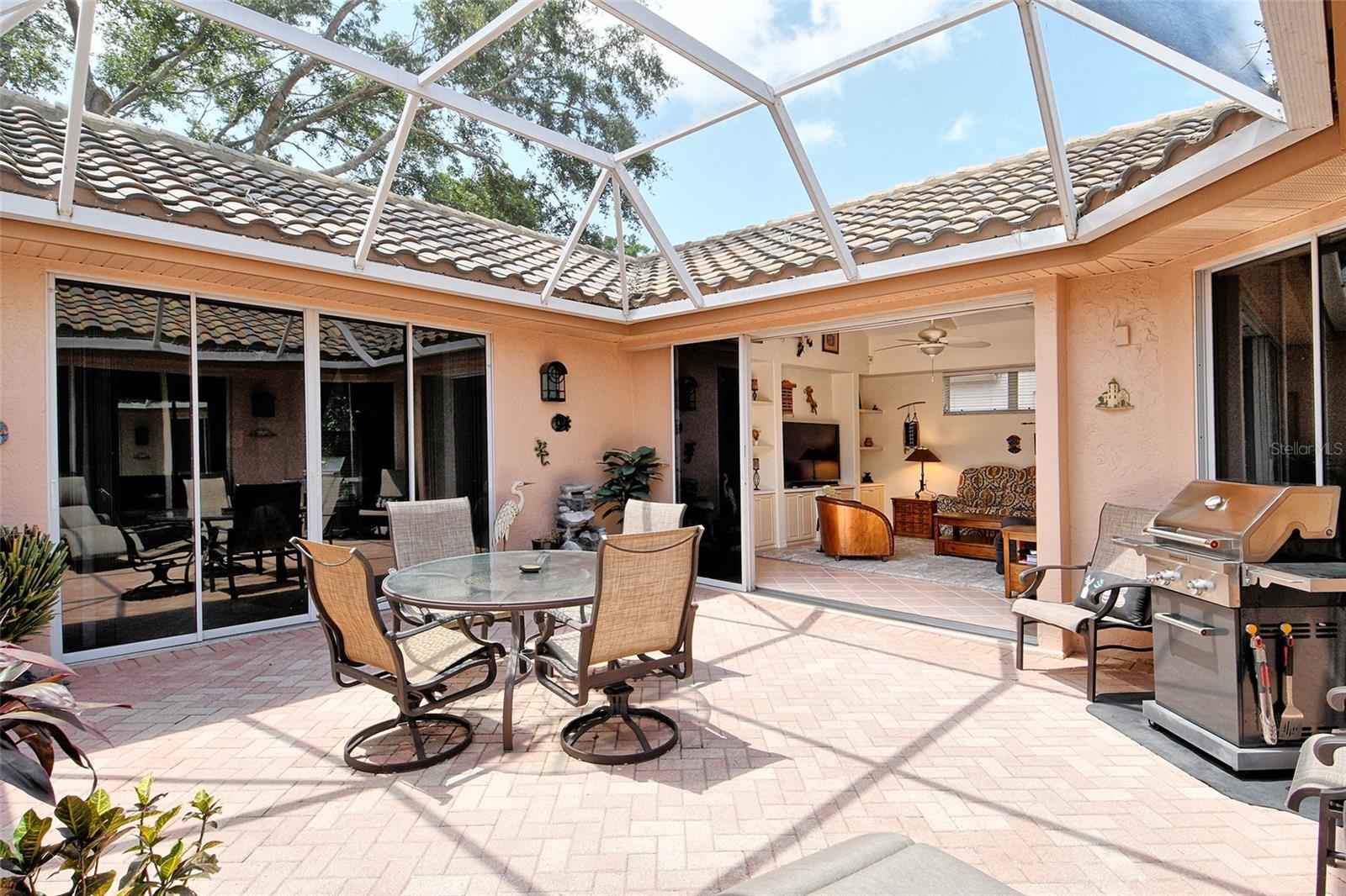 An exceptional opportunity awaits you in the gated, maintenance-free community of Mira Lago on Palmer Ranch—a private sanctuary designed for easy living. Enjoy a low-maintenance lifestyle with affordable HOA fees in this rarely available Plaza Verde model, thoughtfully designed around a central, screened courtyard that offers complete privacy and serves as the heart of the home. Inspired by Latin-style living, this unique layout brings natural light and warmth into every key room—including the formal living room, family room, kitchen, and primary suite—all centered around the serene courtyard. If you're seeking expansive lake views, this may not be the home for you. But if you value intimate, light-filled spaces and total privacy, this home is the ideal match. The barrel tile roof was replaced in 2020, and major systems have been recently updated, including a new air-conditioning system and water heater in 2024. The kitchen features newer appliances and stylish granite countertops. Leave the lawnmower and hedge trimmers behind—your HOA covers lawn care, mulching, irrigation, pruning and even pressure-washing the roof, sidewalks and driveway. Exterior home painting is included every seven years, and best of all—no pet restrictions! Mira Lago offers residents a heated pool and spa, three lakes teeming with wildlife and vibrant birdlife, sidewalks for scenic strolls and benches to rest along the way. Just minutes from world-famous beaches of Siesta Key and the Legacy Trail, this home combines comfort, convenience and a lifestyle of ease.