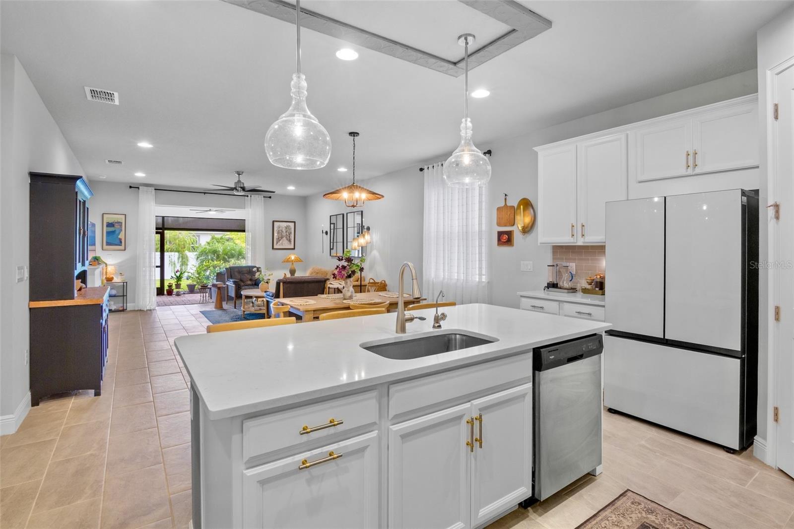 Opportunity at Sunrise! This two-year-old home is better than new, featuring functional and stylish upgrades throughout. All lighting and fans have been thoughtfully upgraded. The chef's dream kitchen boasts a Samsung glass-front refrigerator, custom cabinet pulls, and a beautiful quartz island with ample space for culinary creations. The open floor plan and generously sized rooms provide comfortable areas for gathering, as well as privacy. A light-filled den/study at the front of the home, complete with French doors, is perfect for a home office or music lessons. The expansive primary bedroom offers a peaceful retreat with an ensuite bath, walk-in shower, and an extensive walk-in closet. Step outside to a screened lanai, ideal for a casual happy hour. The lanai features SunSolution privacy motorized screens that, when lowered, create an additional outdoor air-conditioned room. The landscaped yard is fully fenced, perfect for your family and furry best friends. Additional functional upgrades include a whole-home reverse osmosis water system, a tankless gas hot water heater, and an extended garage with an epoxy floor. Sunrise Preserve is a resort-style gated community located in the prime Palmer Ranch area of Sarasota. The beautiful clubhouse is the heart of the community, available for activities and rentals, and includes a self-catering kitchen with a coffee bar. Homeowners also have access to a fully equipped gym. Outdoor amenities include a zero-entry pool, hot tub, tennis, pickleball, and bocce courts. Enjoy your new resort lifestyle with lounge chairs, umbrellas, and covered outdoor spaces at Sunrise Preserve. This home sits high and dry and does not require flood insurance. There are no CDD fees, and low HOA fees include irrigation and ground maintenance. The community is close to the Legacy Bike trail, zoned for top schools, minutes from the best beaches, and offers easy access to downtown Sarasota and Venice.