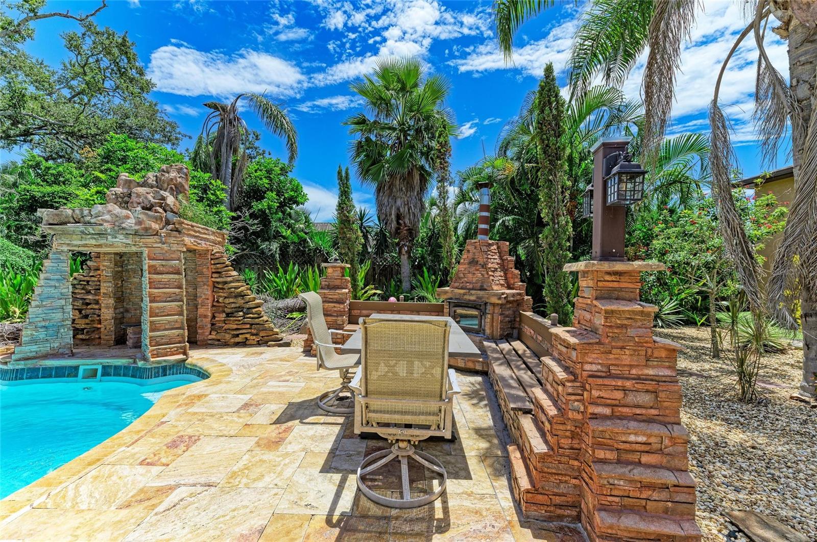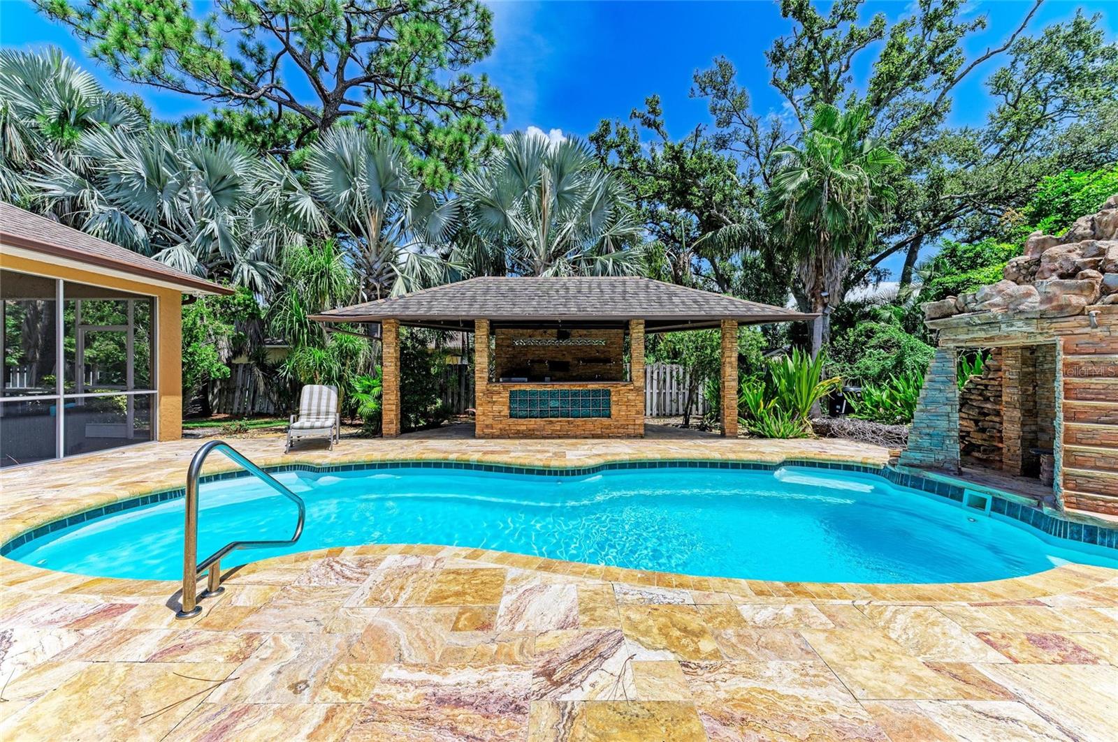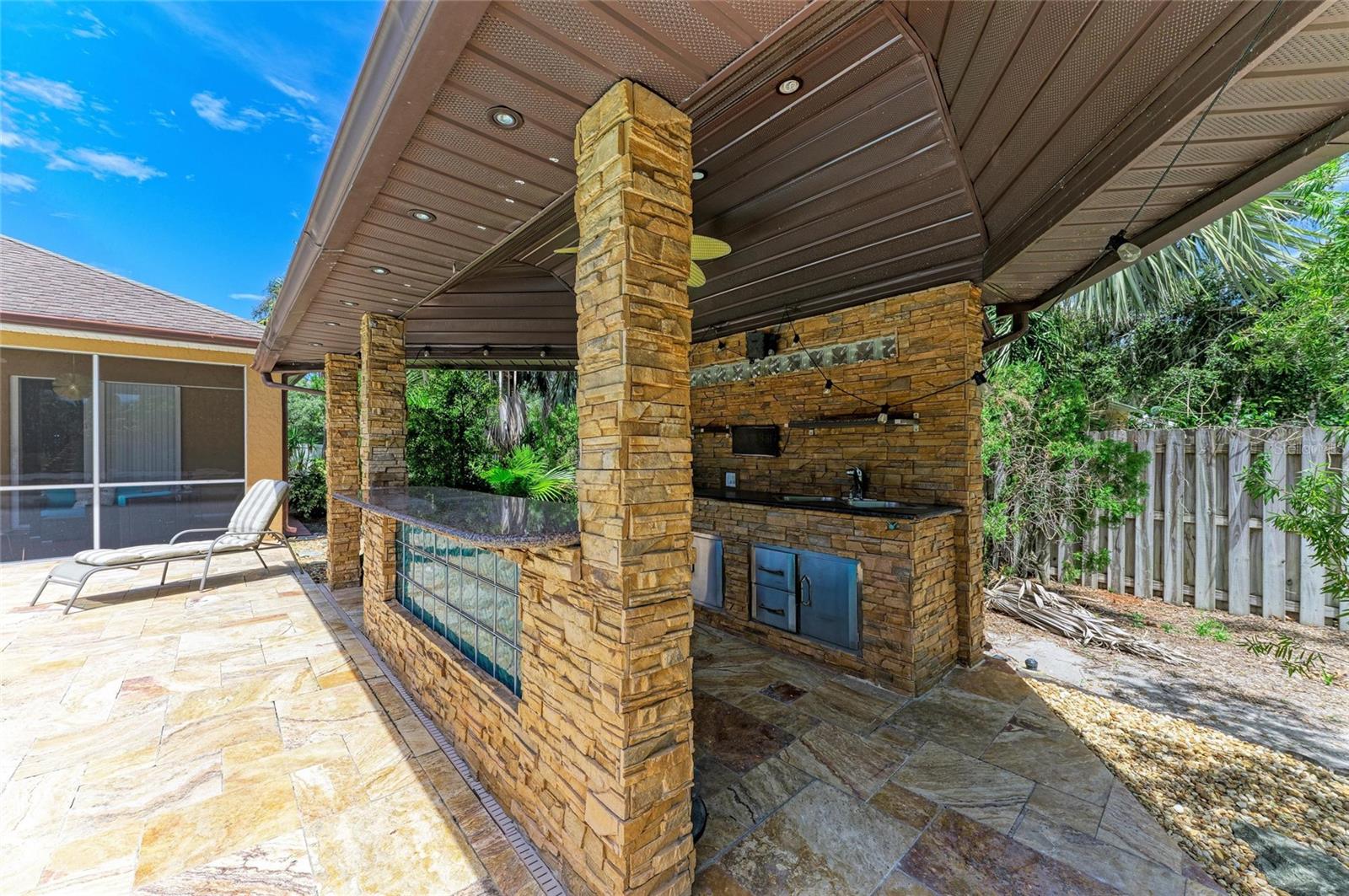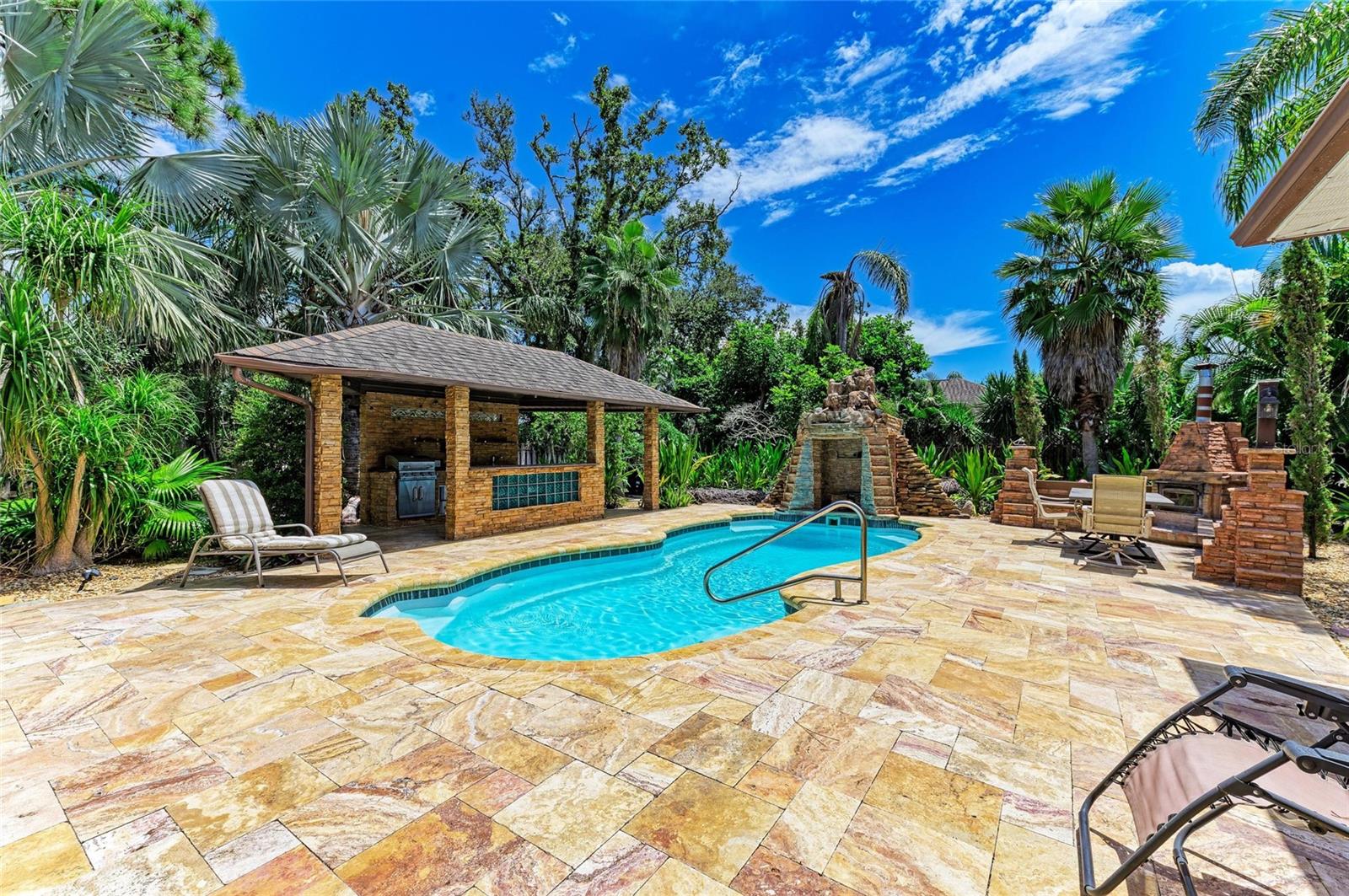 Why go on vacation when you live in this tropical retreat? This spacious home is an entertainer’s paradise with luxurious living both inside and out. As you enter, you'll immediately notice the modern finishes, from the sleek kitchen cabinets to the stylish light fixtures. The kitchen is a chef’s dream with stone countertops and stainless steel appliances. Just off the kitchen, you'll find an indoor laundry room with a newer LG washer and dryer set. The home is designed for comfort and efficiency, with a new HVAC and water heater both installed in 2022. The main living area features tall tray ceilings, and the abundance of natural light streaming through the sliding doors creates a bright, open atmosphere. The primary bedroom is a true retreat, offering walk-in closets and a beautifully renovated ensuite bathroom with a soaking tub, a separate standing shower, and dual vanities—the perfect place to unwind. For added privacy, the opposite side of the home offers three guest bedrooms with newer carpet, and a guest bathroom that also serves as a convenient pool bath, with direct access to the pool deck. Outdoors, this home truly shines with a saltwater heated pool featuring a waterfall, an outdoor kitchen, and a cozy fireplace for those cooler evenings. The travertine deck and outdoor shower complete this private oasis, while the dual carports for jet skis (or other recreational vehicles) and a separate RV garage offer ample space for all your toys. The home even has a separate well for irrigation, ensuring your lush tropical landscaping thrives year-round. Whether you're relaxing in the serene pool area, cooking up a meal in the outdoor kitchen, or enjoying the modern comforts of the interior, this home has everything you need and more! All of this in a prime location on a private road near shopping and award-winning beaches. Home warranty for the first year for added peace of mind.